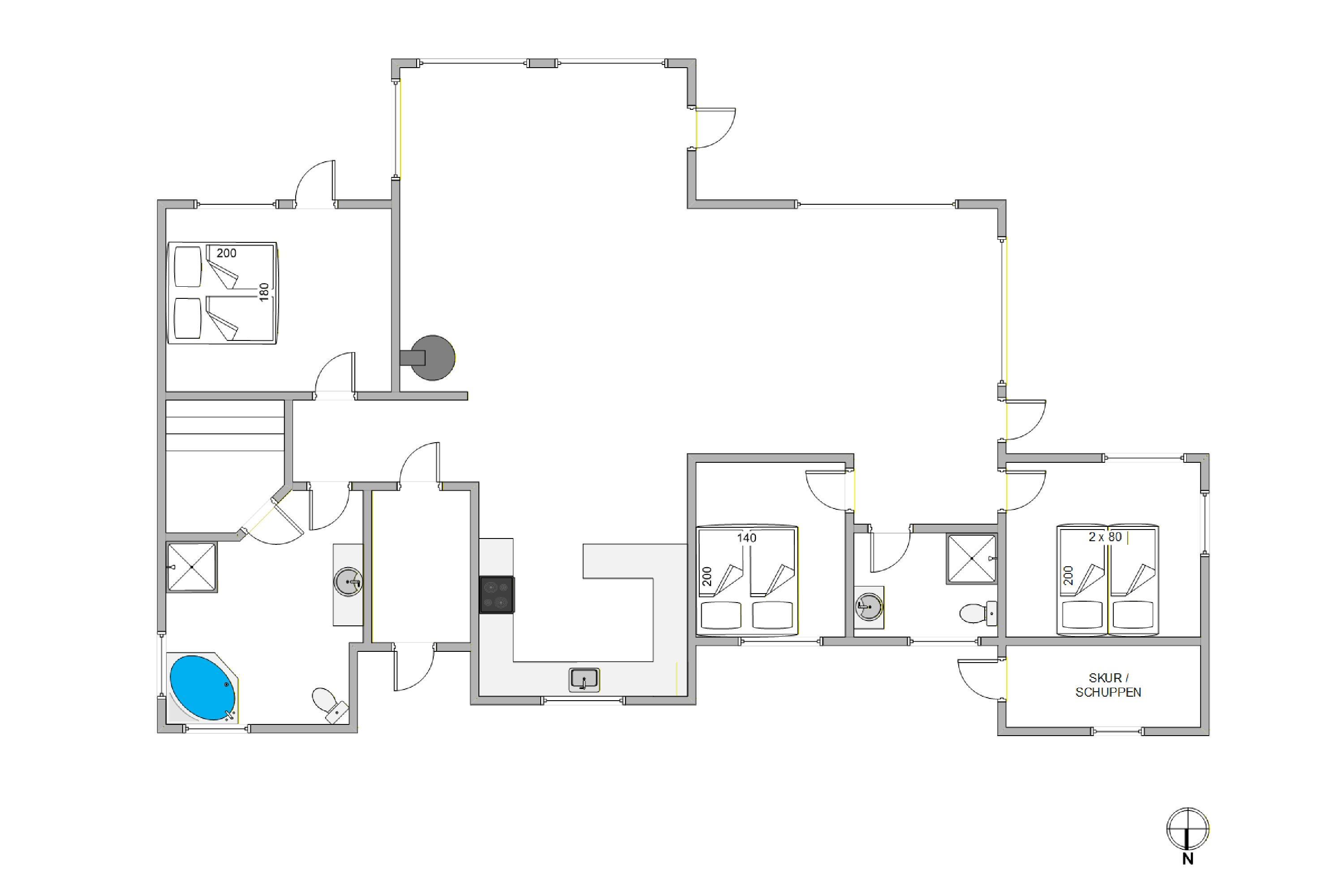 Dette hyggelige feriehus har tre rummelige soverum, hvilket sikrer, at I alle kan finde jer godt til rette. Takket være de to badeværelser vil der aldrig være kø om morgenen. Gulvvarme i badeværelset giver ekstra komfort på kolde dage, og saunaen samt tømmespaen tilbyder den ultimative afslapning efter en lang dag med eventyr.