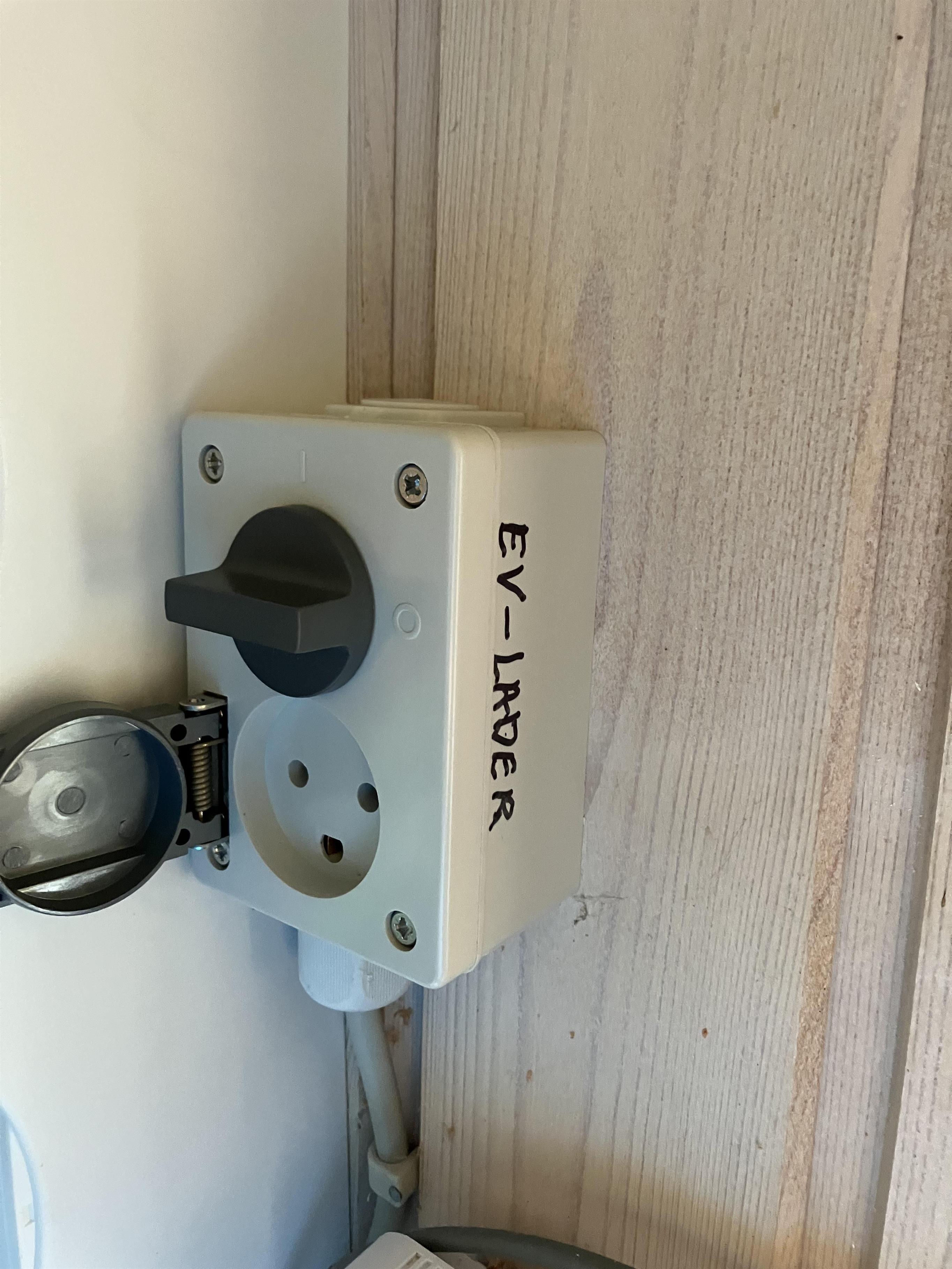 Hvis I kører elbil, er der et kraftstik i skuret, som I kan bruge. Jeres medbragte kabel skal gå igennem vinduet i skuret.