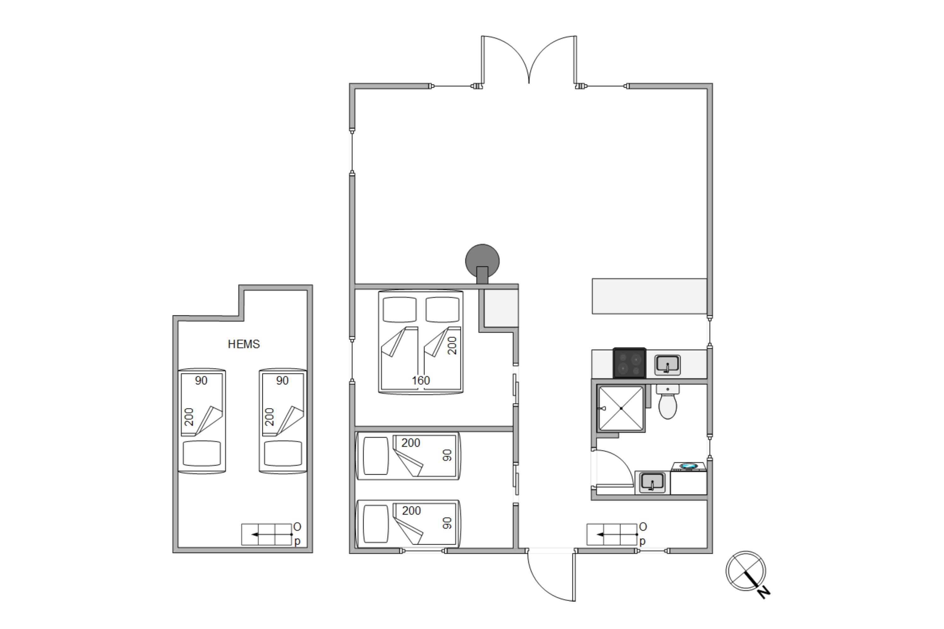 Sommerhuset er blevet renoveret i 2021 og har en hyggelig og lys indretning med hvide træpaneler og bjælkelofter, der går op til kip. Det store vinduesparti tillader en masse sollys at slippe ind, og brændeovnen i midten af stuen er med til at sprede hygge i hele huset. Huset er ydermere udstyret med en varmepumpe, som derfor gør feriehuset mere energivenligt. Her har I mulighed for at varme sommerhuset op på en billig måde. Sommerhuset er fordelt på 2 soverum, hvoraf det ene har en dobbeltseng, og der er også en ekstra hems med plads til en eller flere personer. Køkken og stue er integreret med spisestuen i ét stort rum.