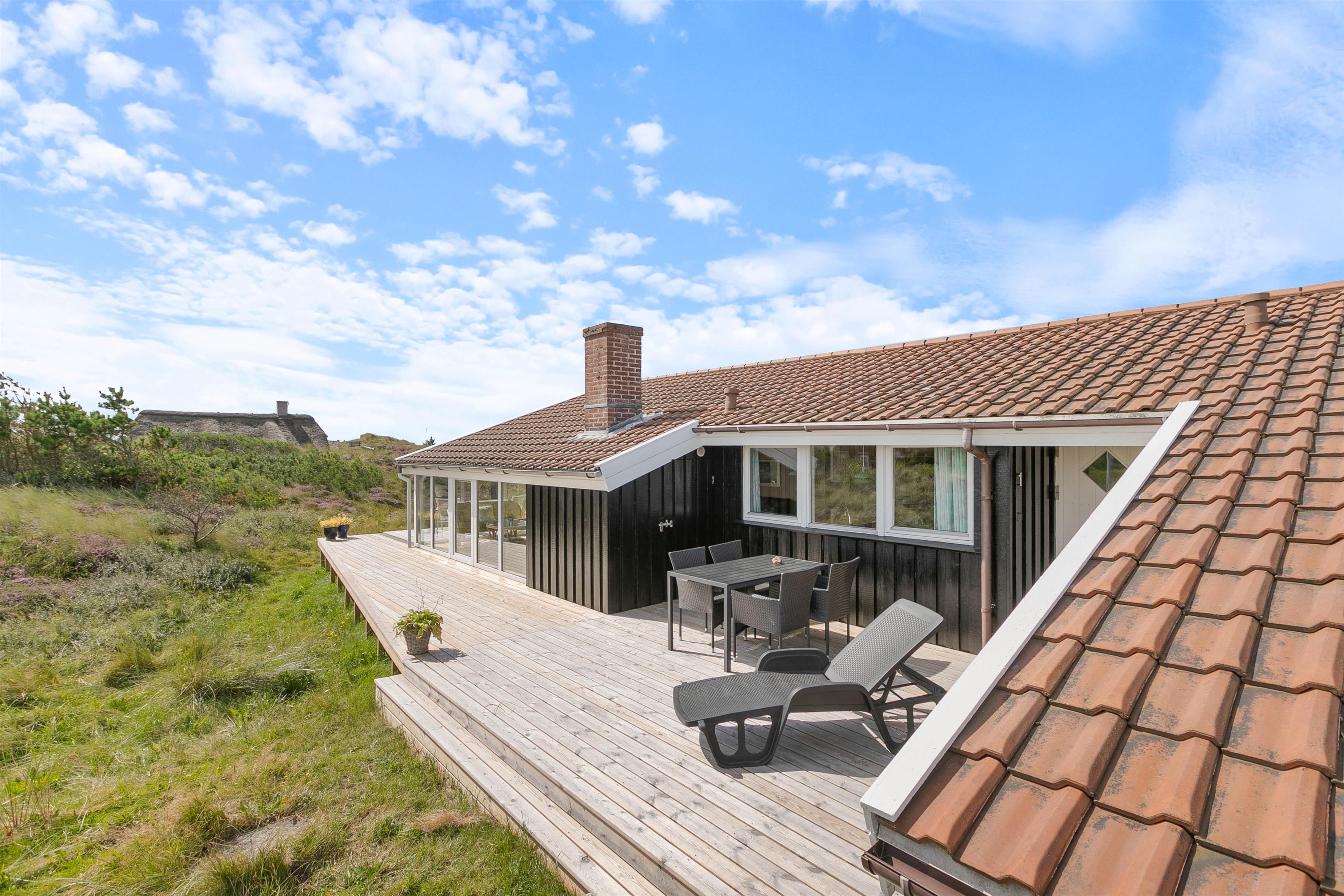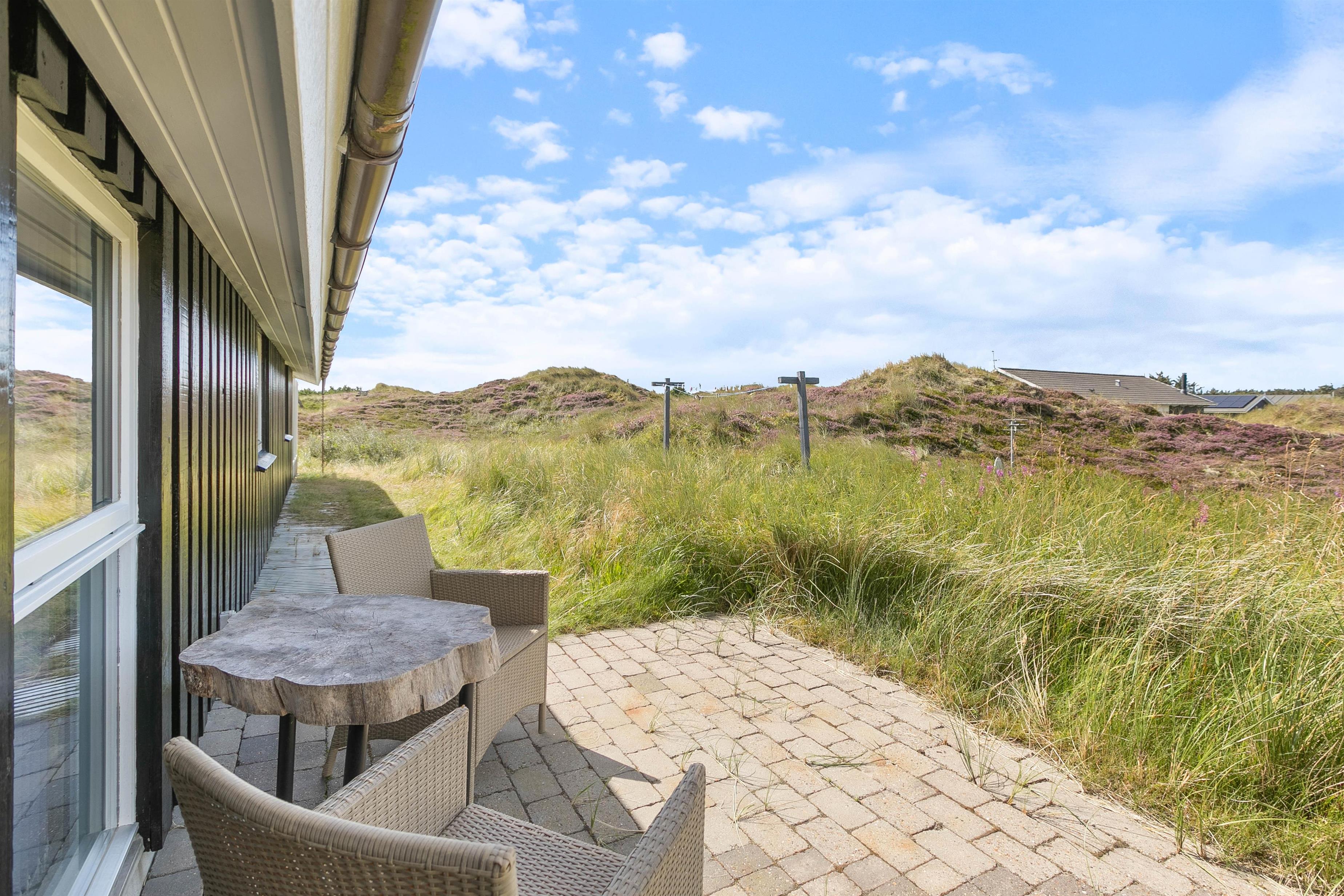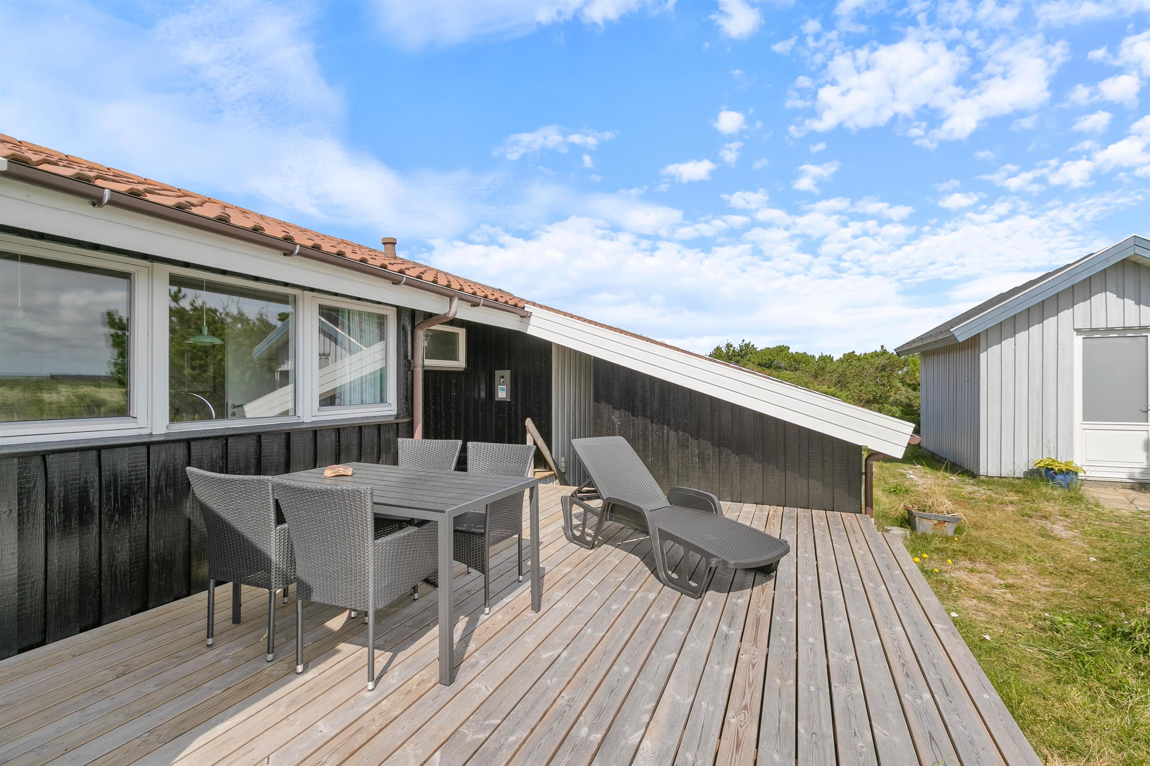 På sommerhusets terrasse er der også mulighed for at komme i vaskeægte feriestemning. Terrassen er hævet, så den ligger i niveau med huset. Her er masser af plads til at boltre sig på, uanset om den står på tilberedning af middagsmad på grillen eller solbadning. På terrassen kan I også sidde og nyde den fantastiske udsigt over det grønne landskab og den vestjyske natur.