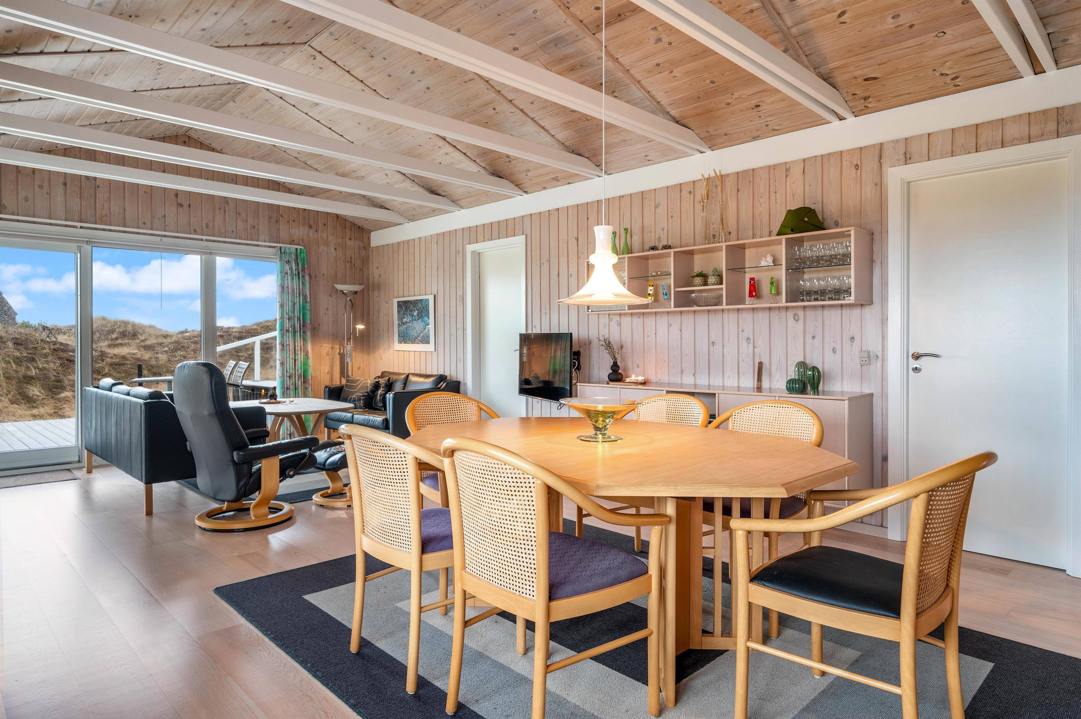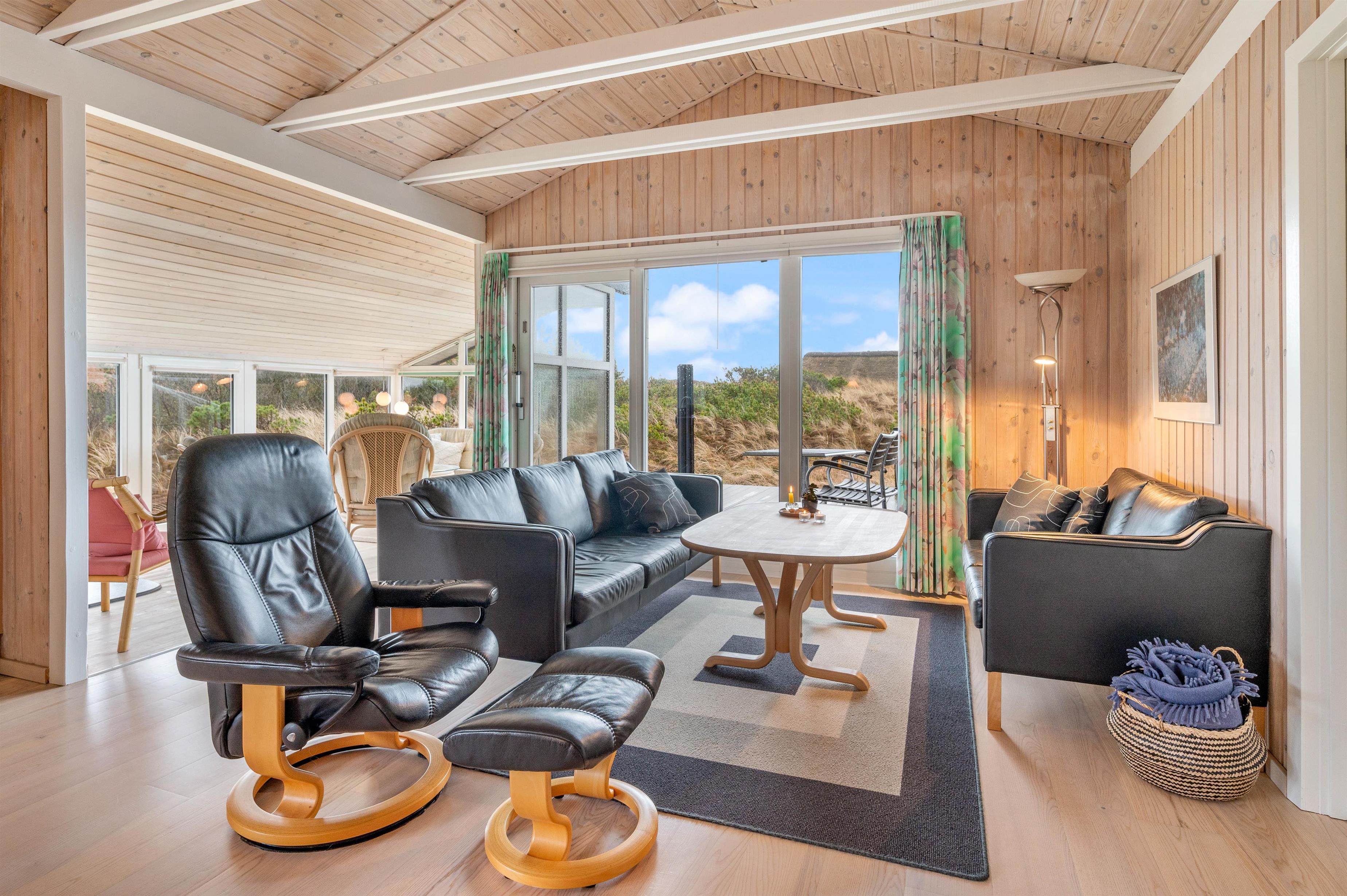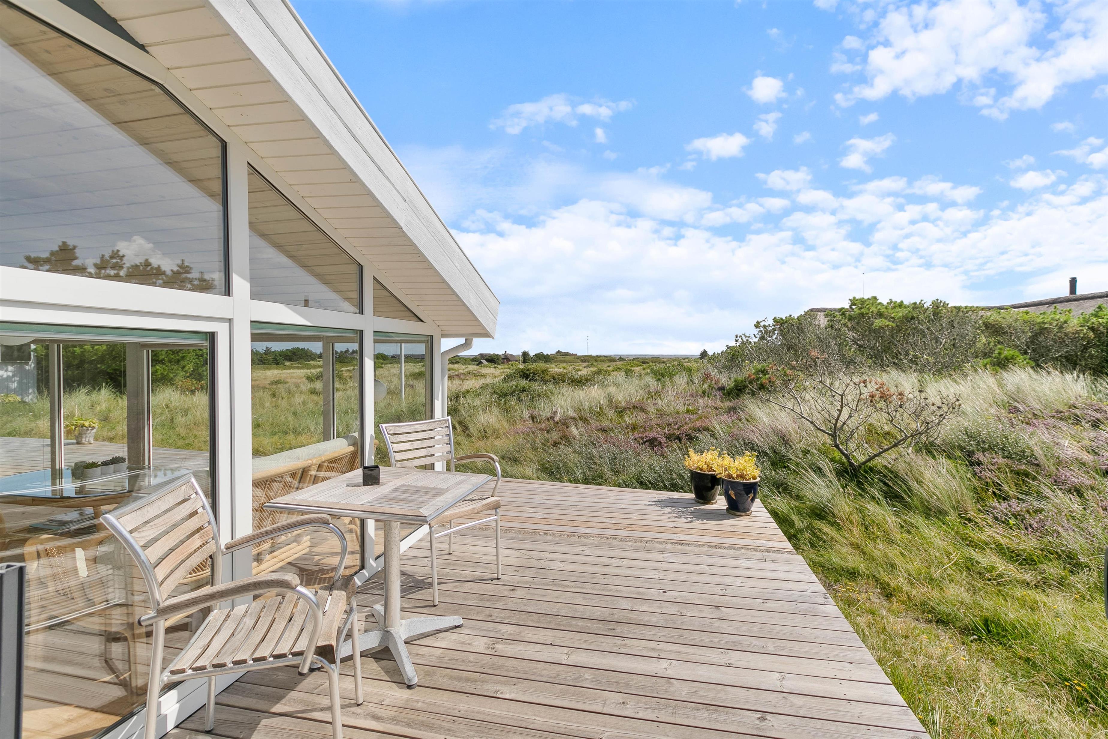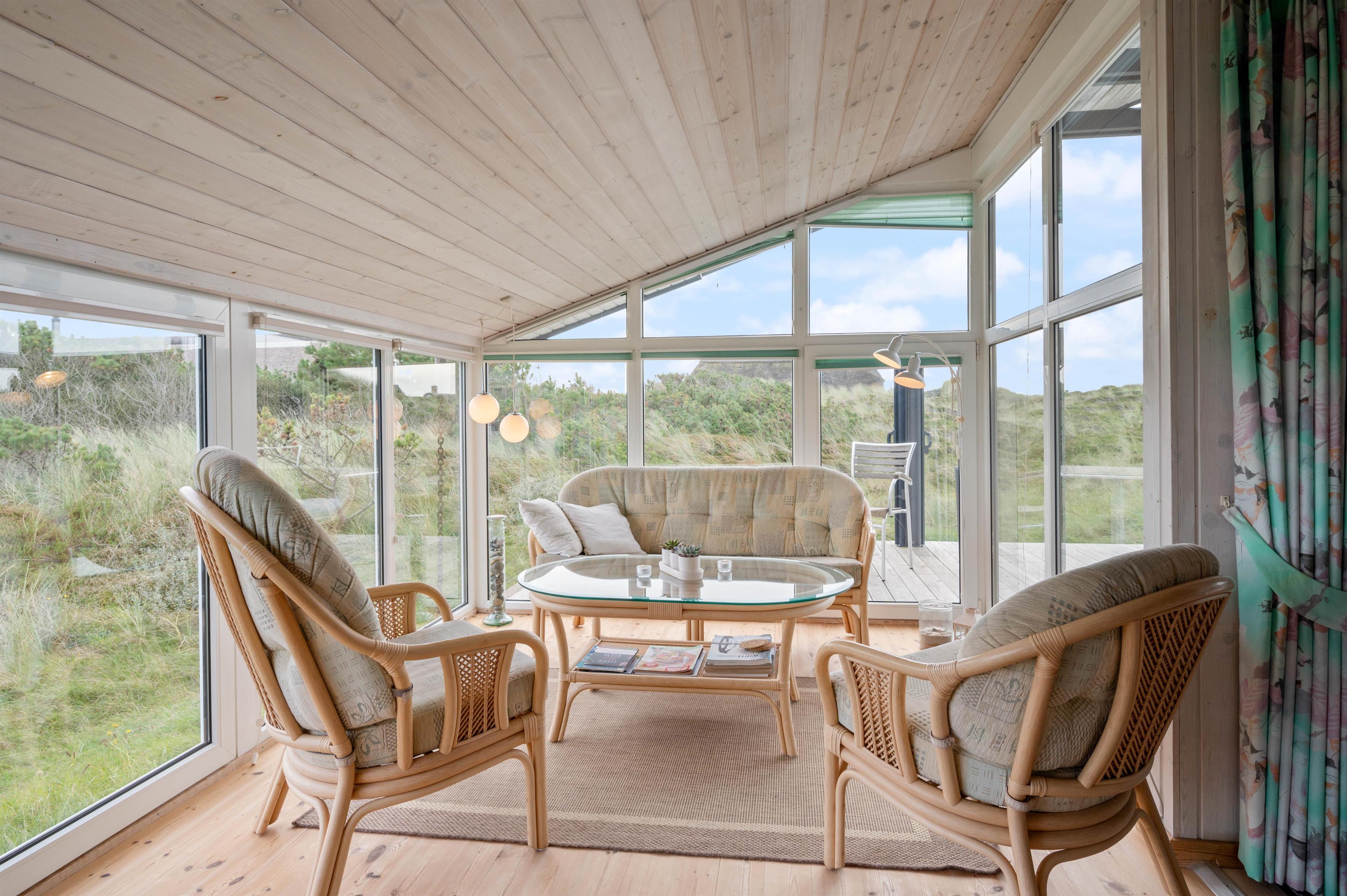 Men I behøver ikke bevæge jer udenfor for at nyde naturen helt tæt på. Sommerhuset er udstyret med en fantastisk udestue, der ovenikøbet er opvarmet med brændeovn. Udestuen består af store vinduer, hvorfra lyset strømmer ind i rummet. I vil uden tvivl føle, at I på det nærmeste kan række ud og mærke sandet mellem fingrene.
