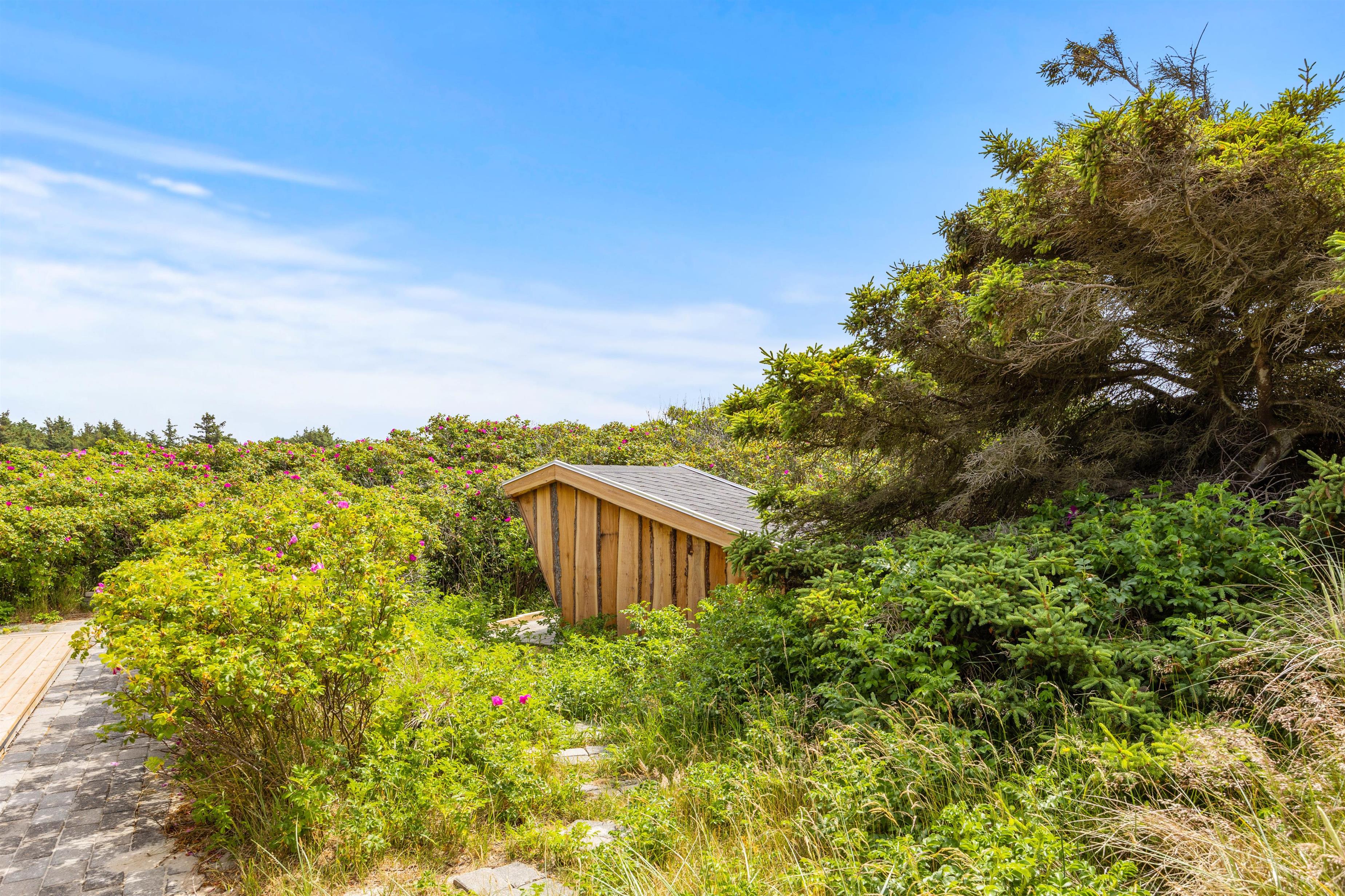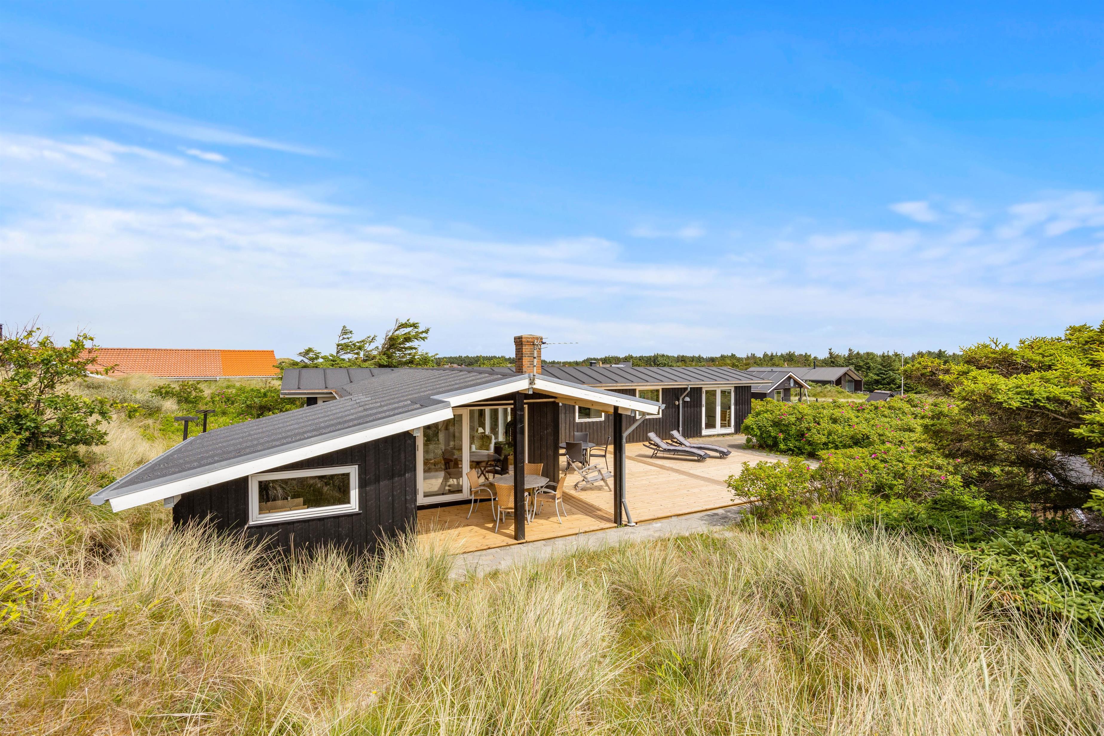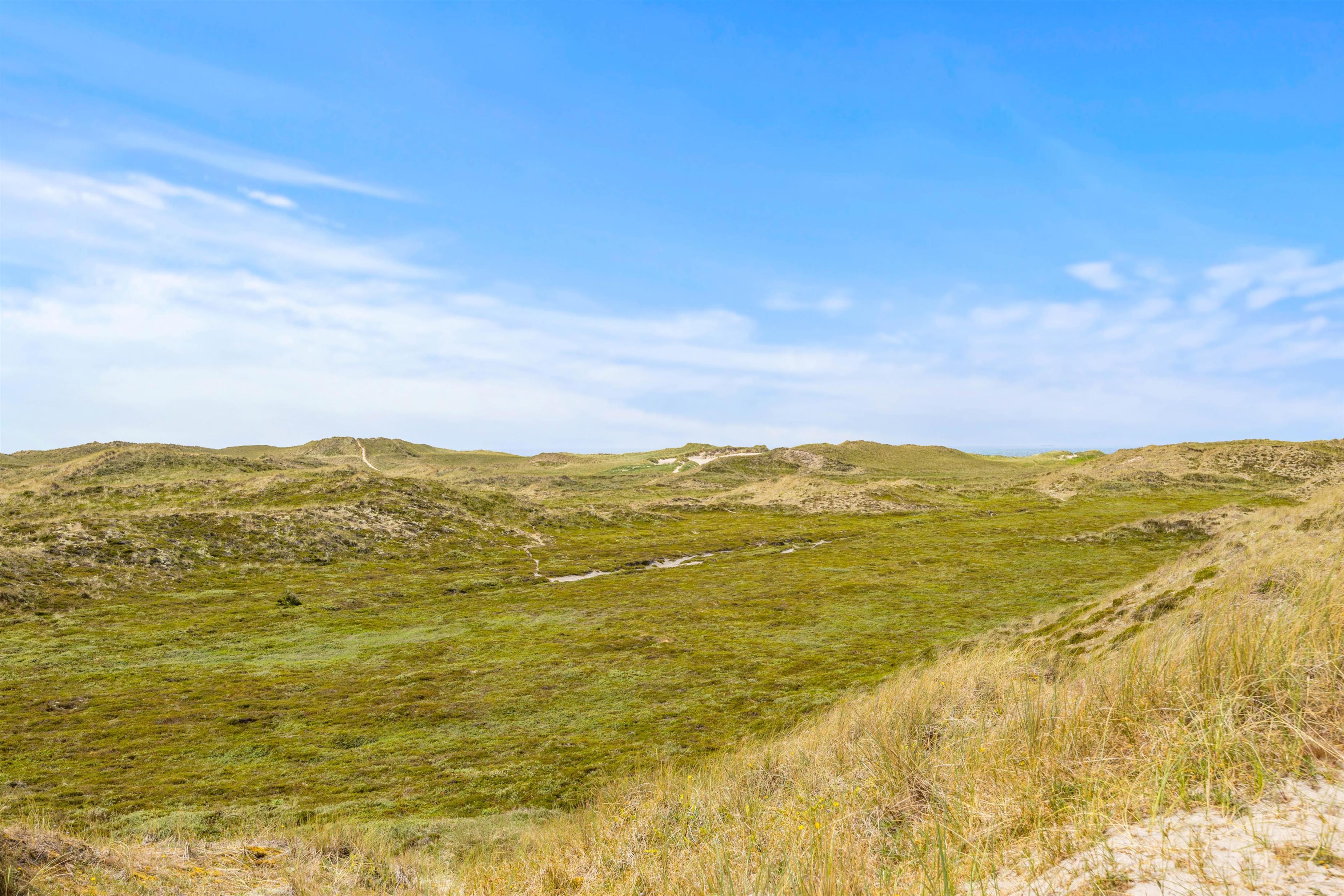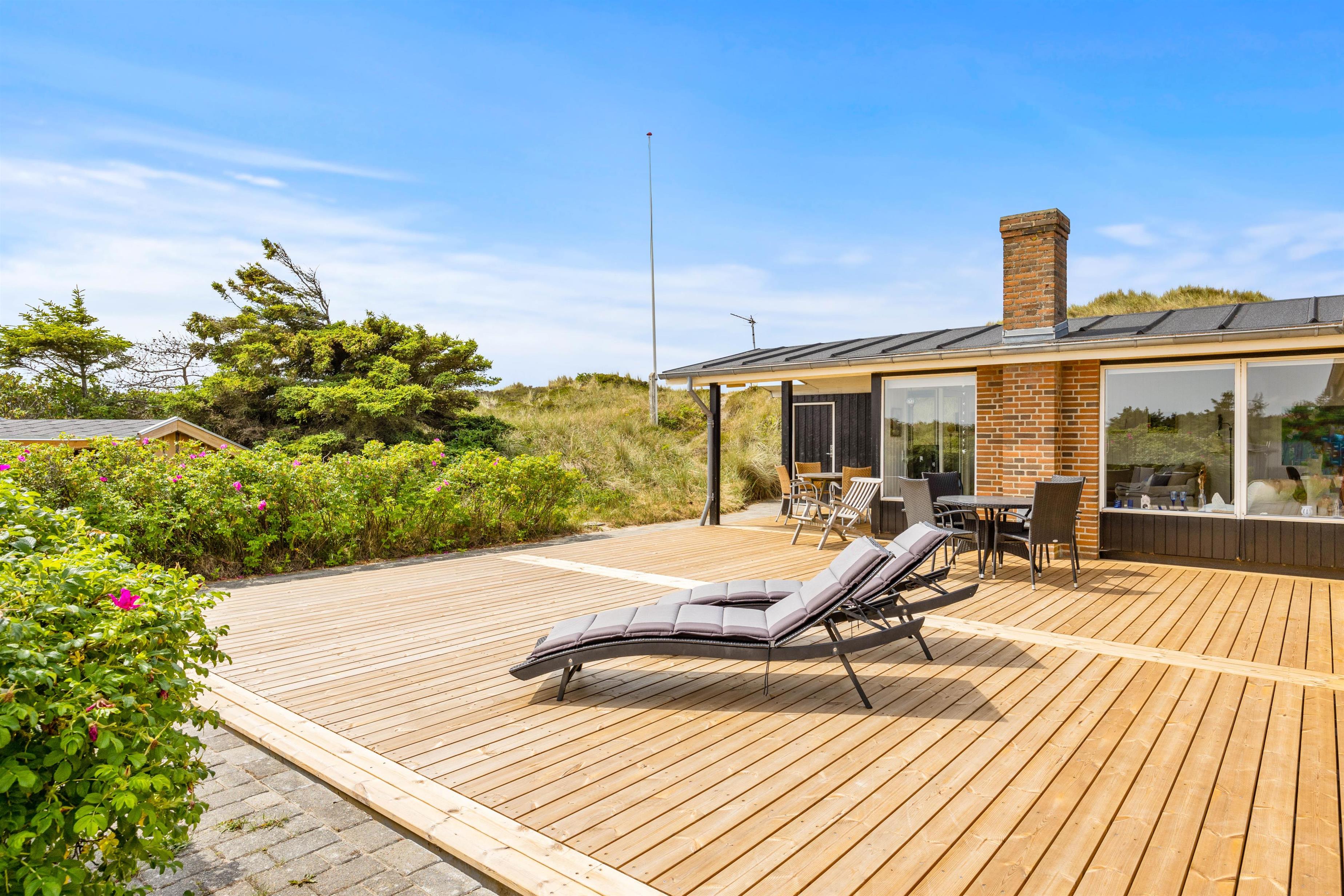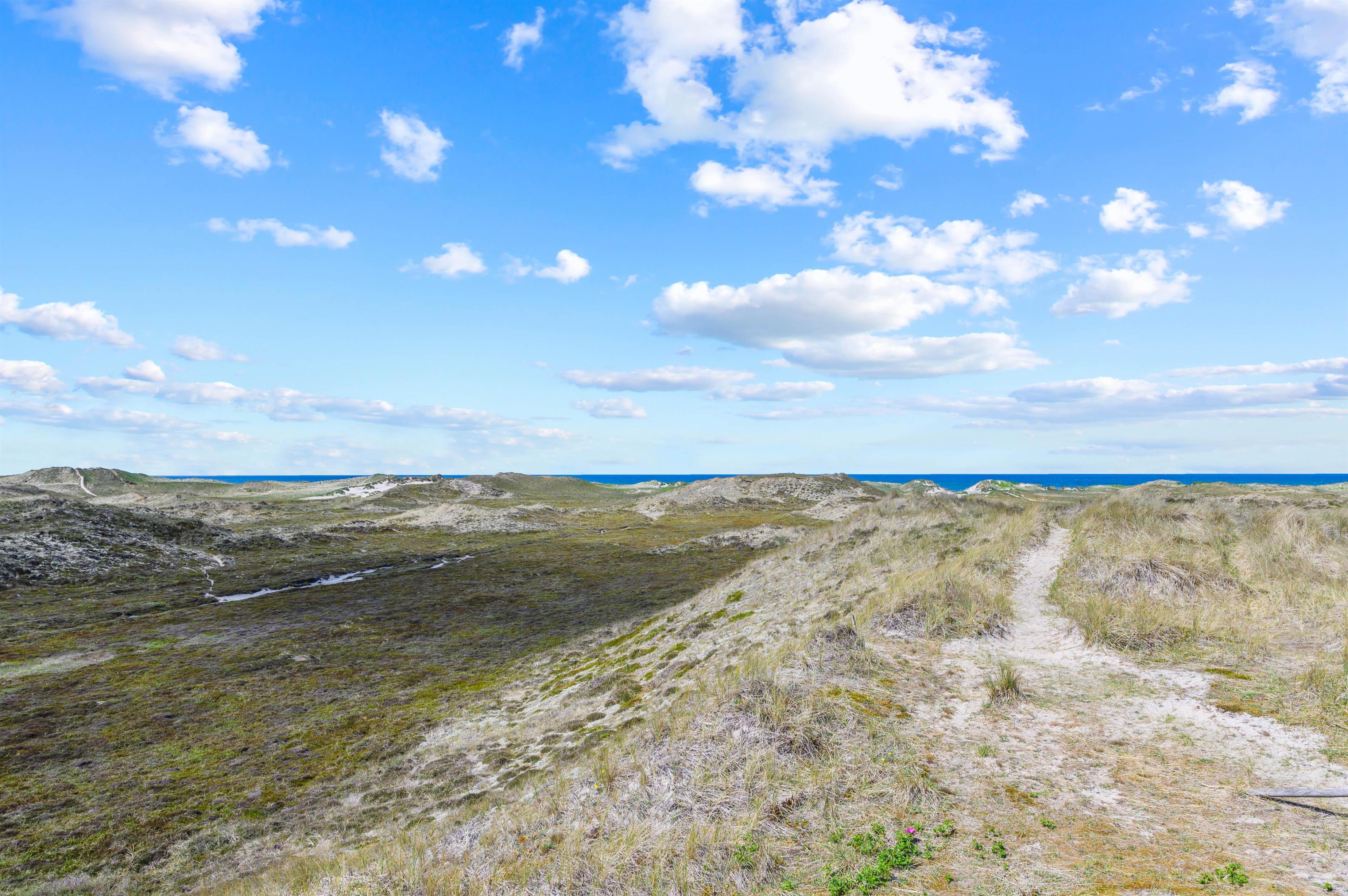 Sommerhuset er placeret kun 450 meter fra stranden, så det kræver ikke mange minutter på gåben, og så har I nærmest fødderne dybt begravet i den bløde sandstrand. Ydermere er sommerhuset placeret ved første klitrække, så fra sommerhusets terrasse har I en helt fantastisk udsigt over det skønne naturområde og det omkringliggende klitlandskab. Selv ikke nabo-sommerhusene kan ødelægge denne udsigt. Så lav en kop morgenkaffe og nyd den til solopgangen på terrassen, mens familiens sovetryner sover længe.