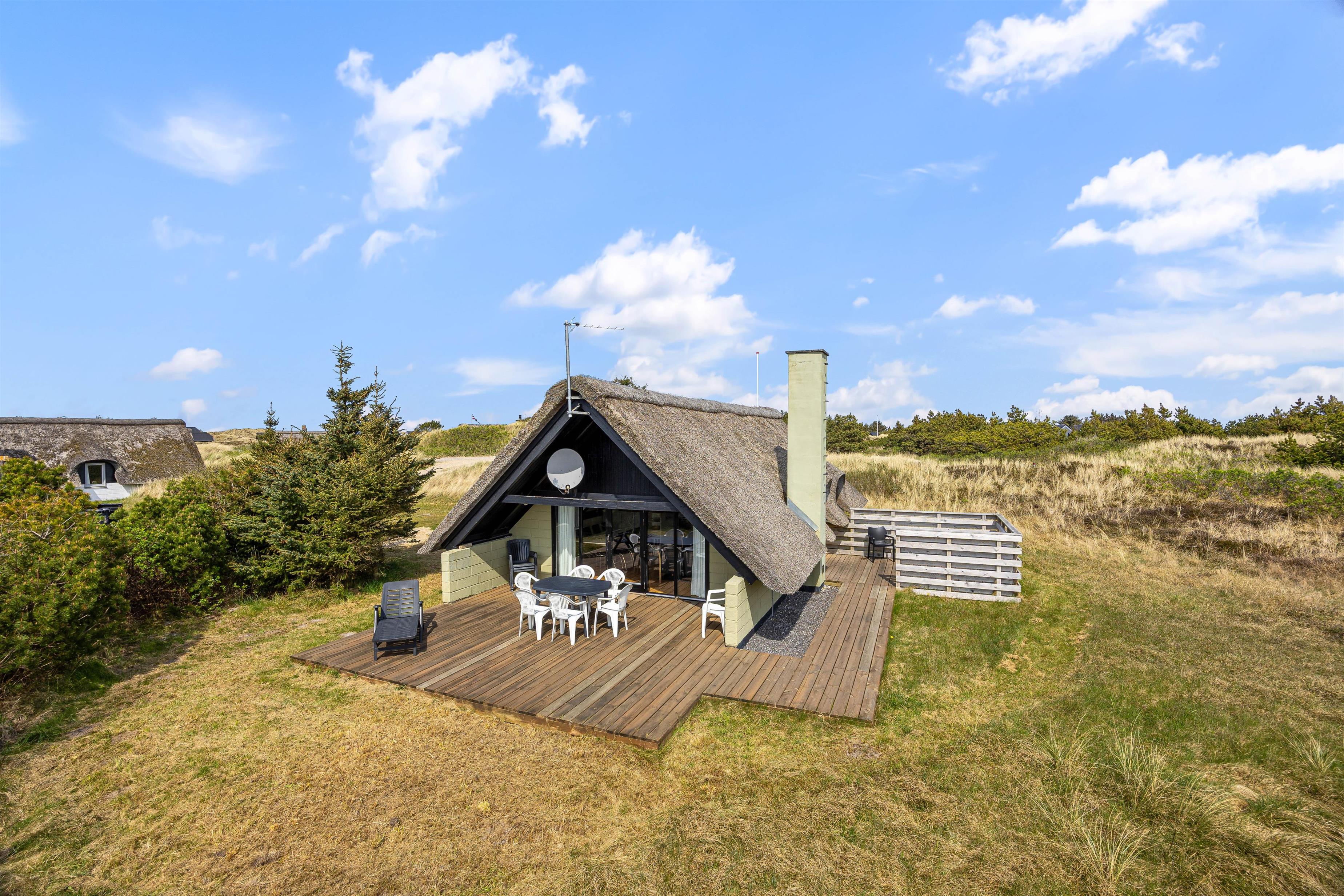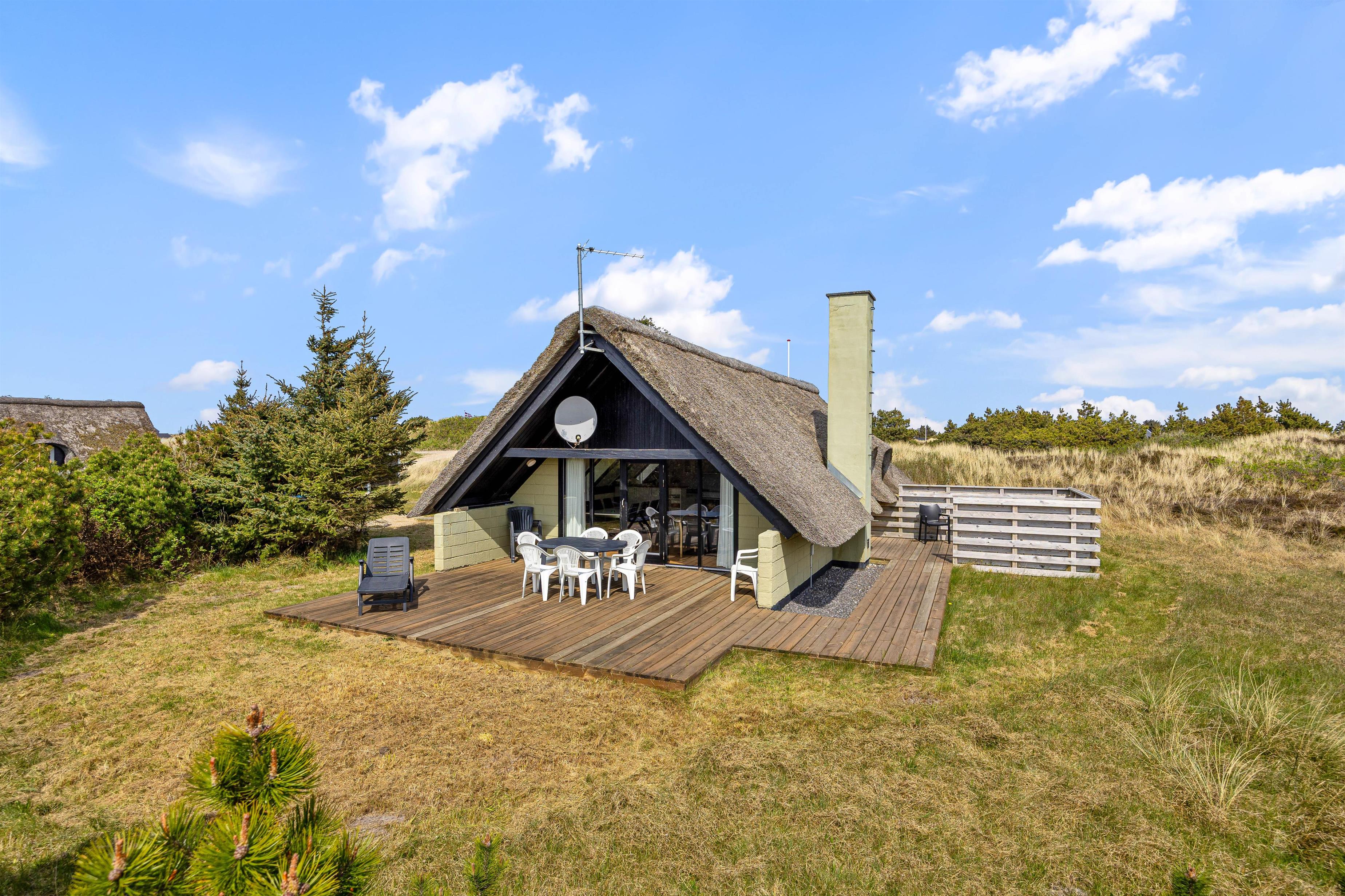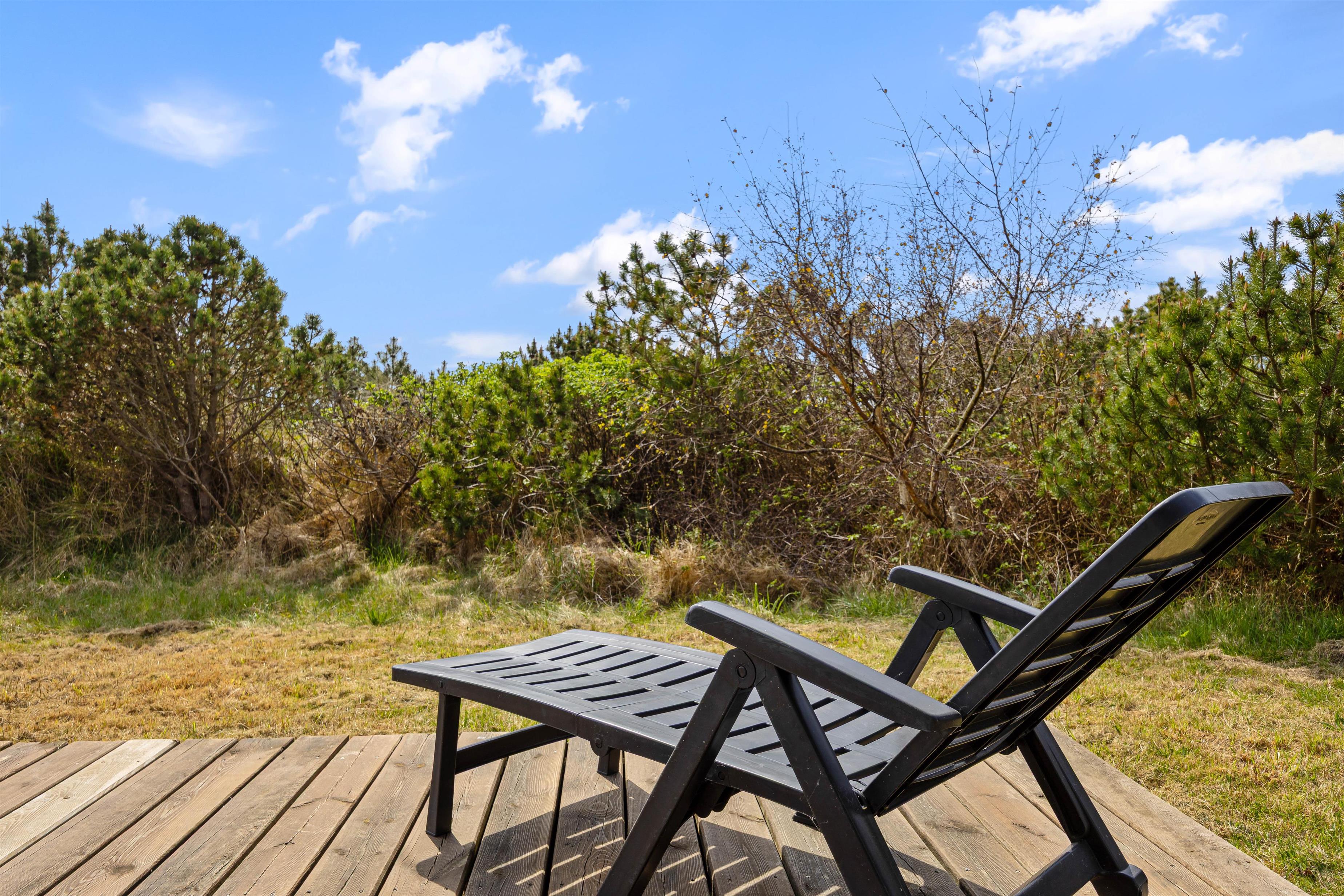 Udenfor venter en dejlig naturgrund med plads til leg og afslapning. På sommerhusets terrasse kan I læne jer tilbage i havemøblerne og nyde solen. På de lune sommeraftener kan I tænde op i grillen og spise aftensmad på terrassen, mens I nyder den skønne vesterhavsluft.