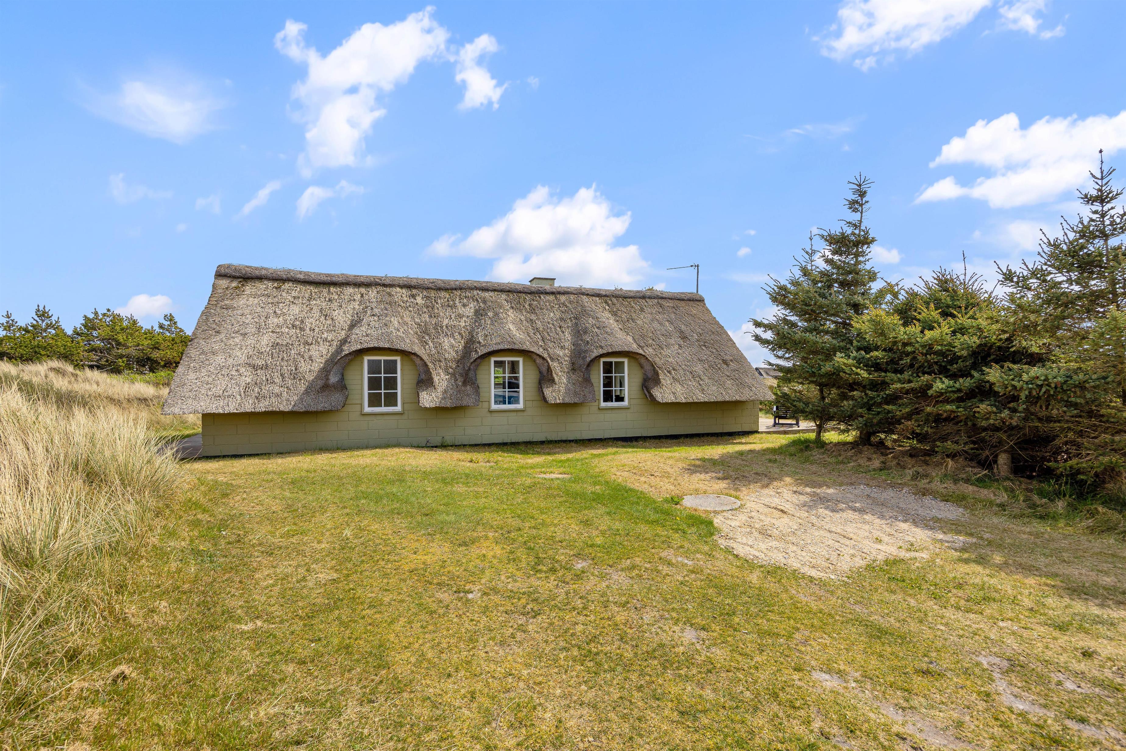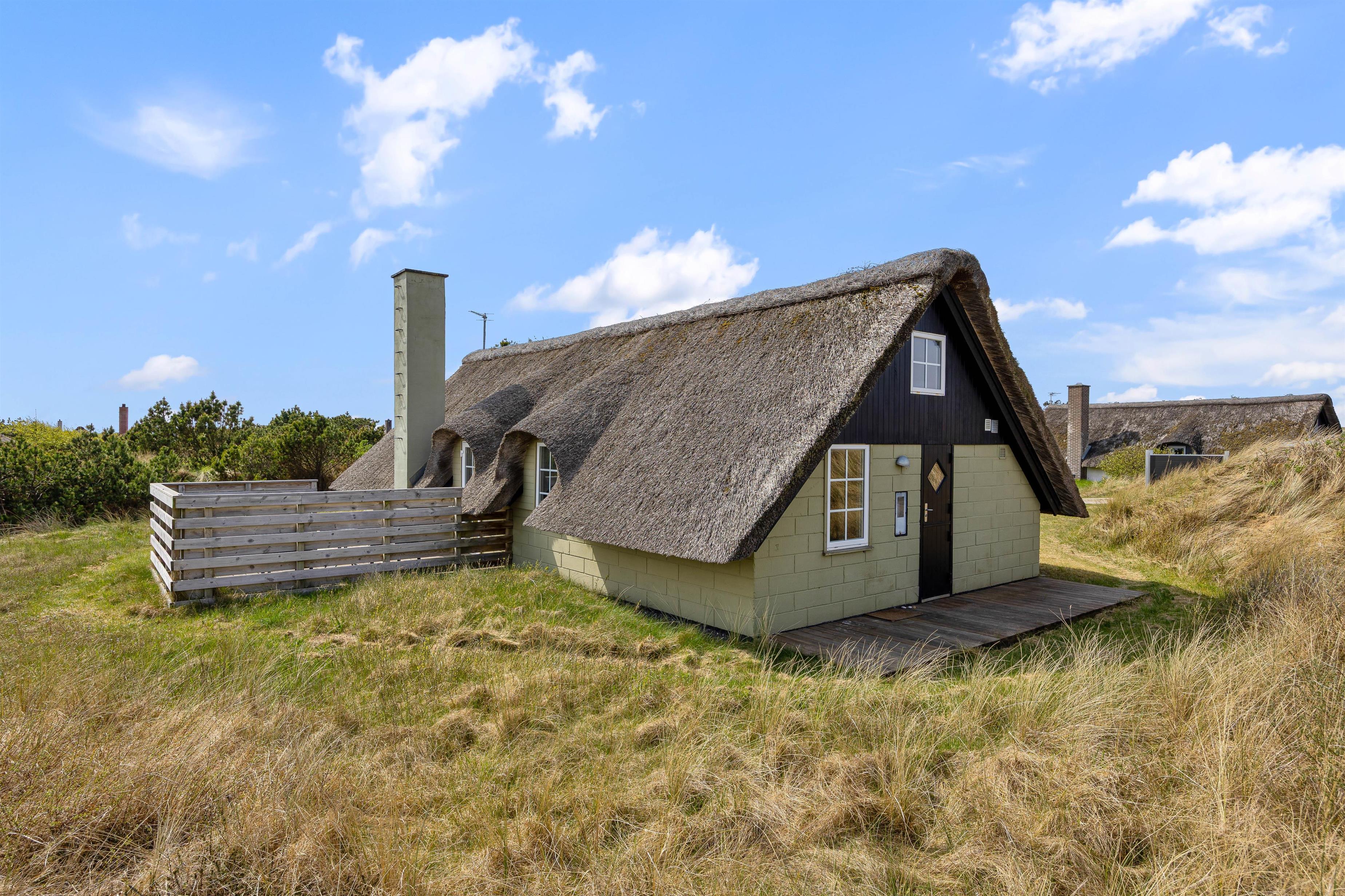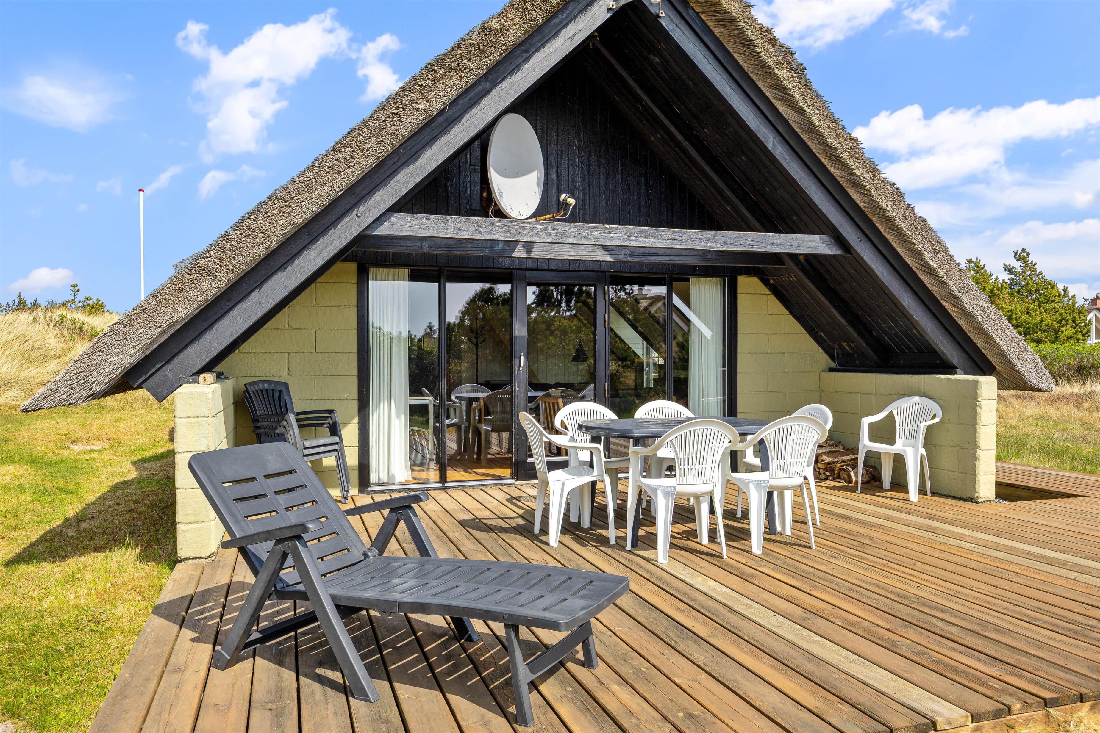 Udenfor venter en dejlig naturgrund med plads til leg og afslapning. På sommerhusets terrasse kan I læne jer tilbage i havemøblerne og nyde solen. På de lune sommeraftener kan I tænde op i grillen og spise aftensmad på terrassen, mens I nyder den skønne vesterhavsluft.
