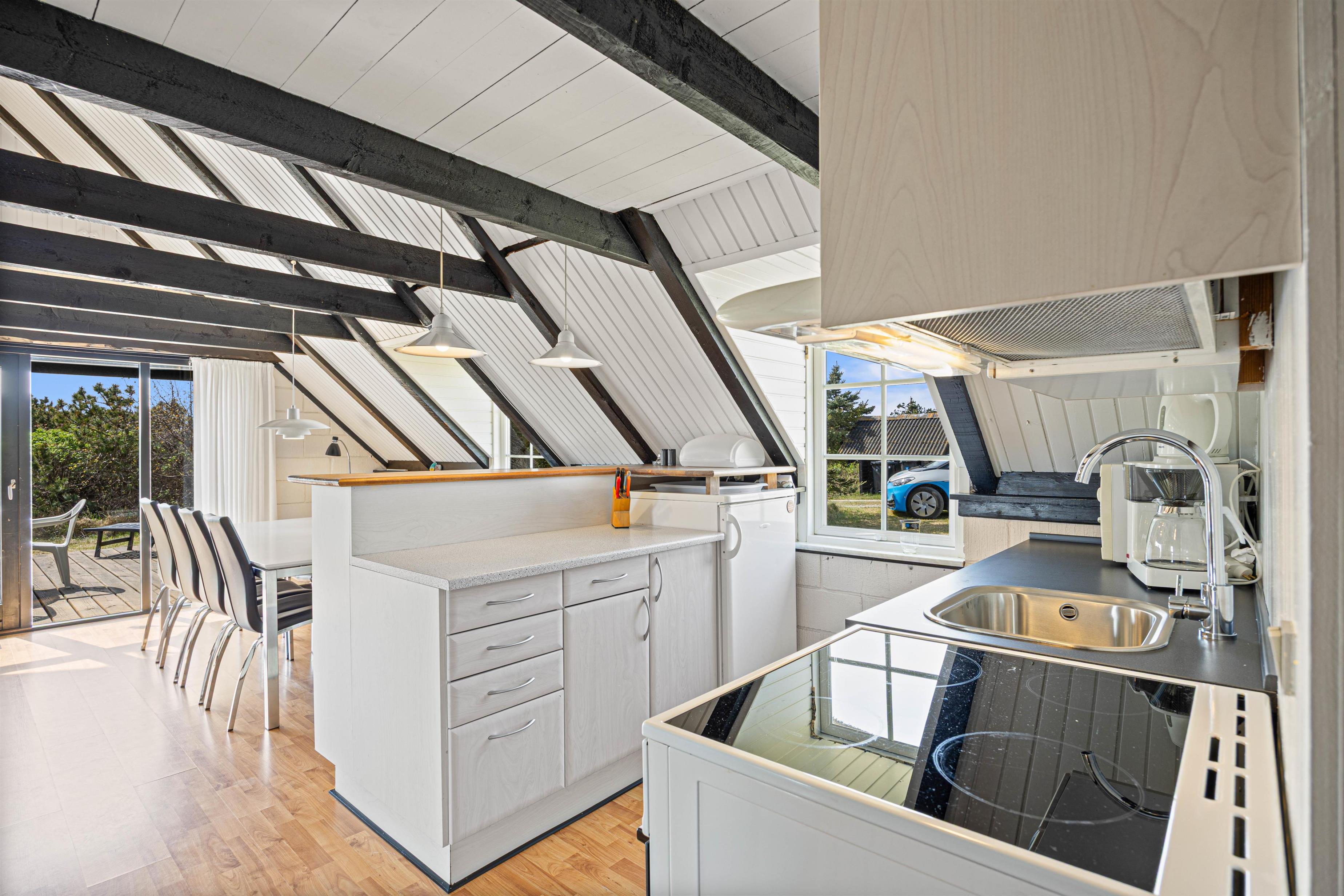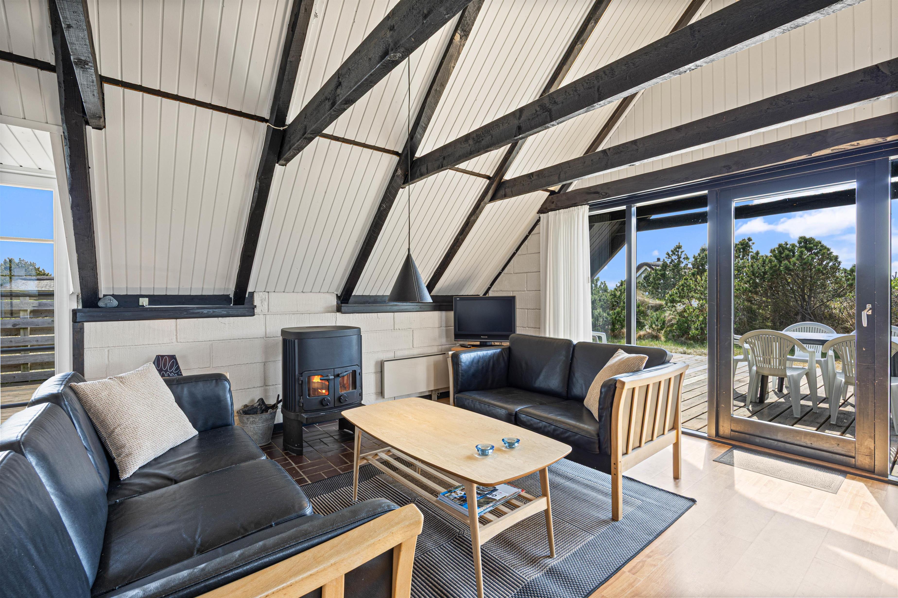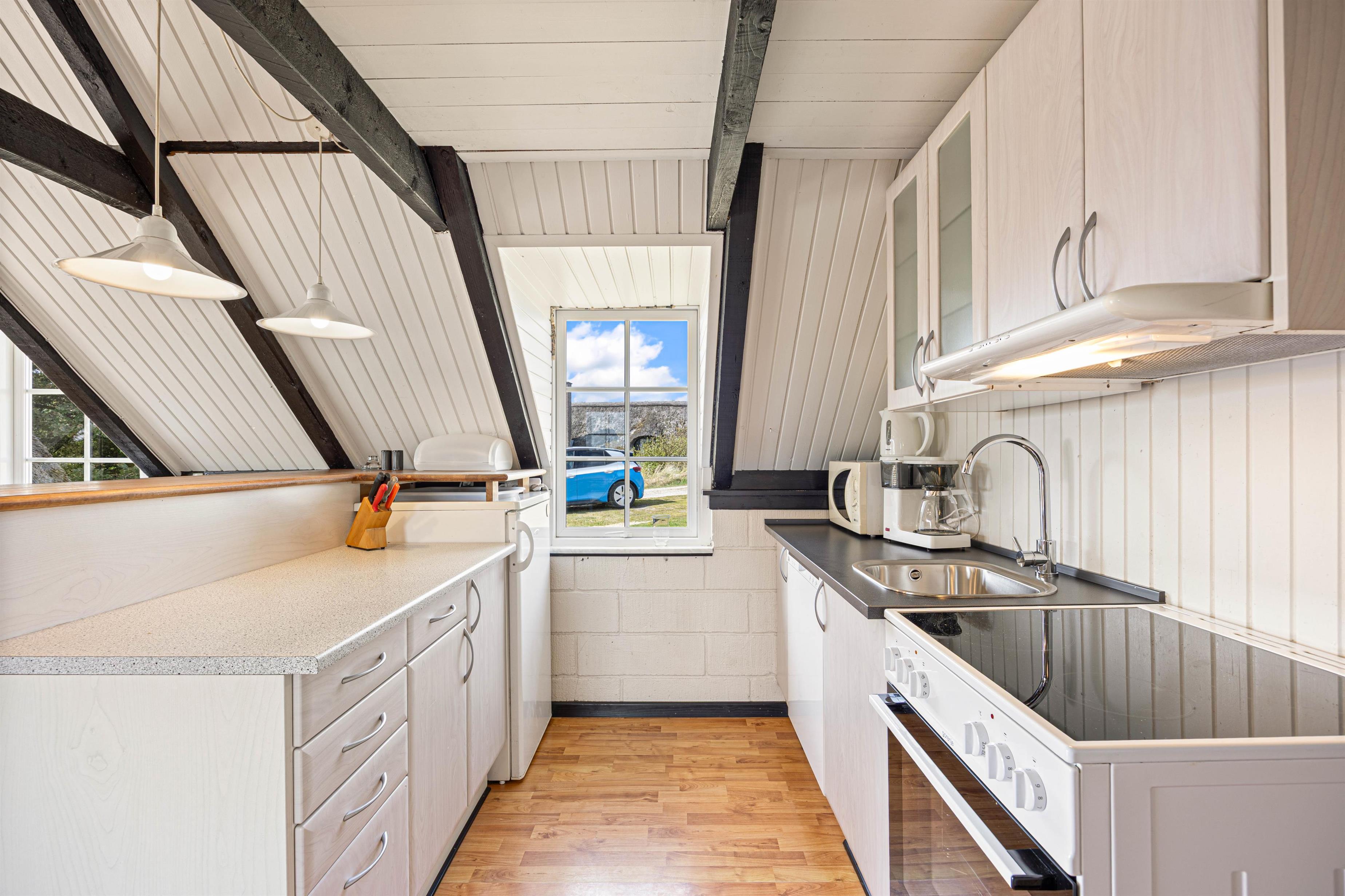 Brændeovnen i stuen spreder en dejlig varme og skaber en hyggelig stemning, når vinden rusker udenfor. Køkkenet er veludstyret med bl.a. opvaskemaskine, så I slipper for opvasken og kan bruge tiden på at slappe af og nyde ferien.