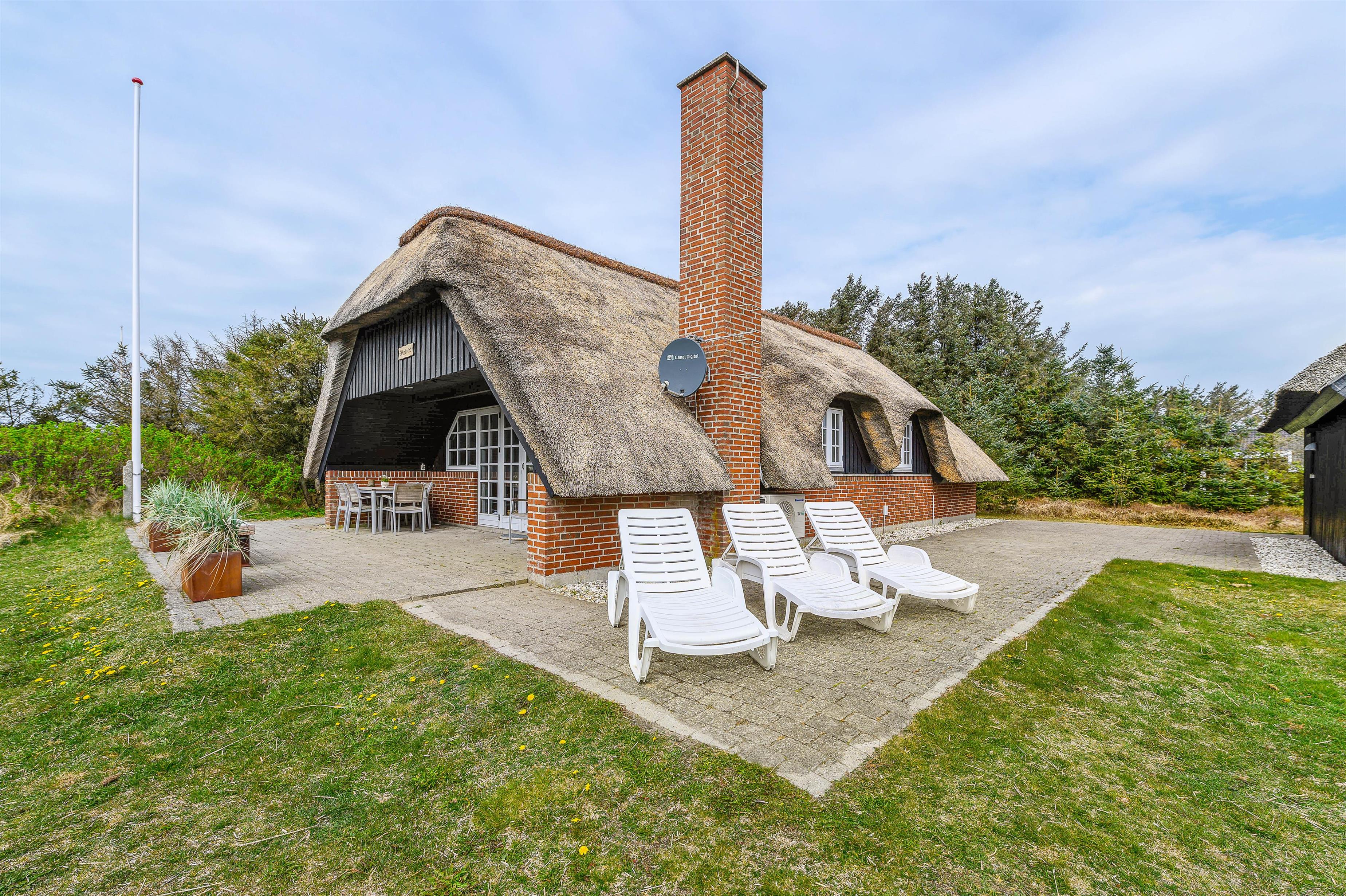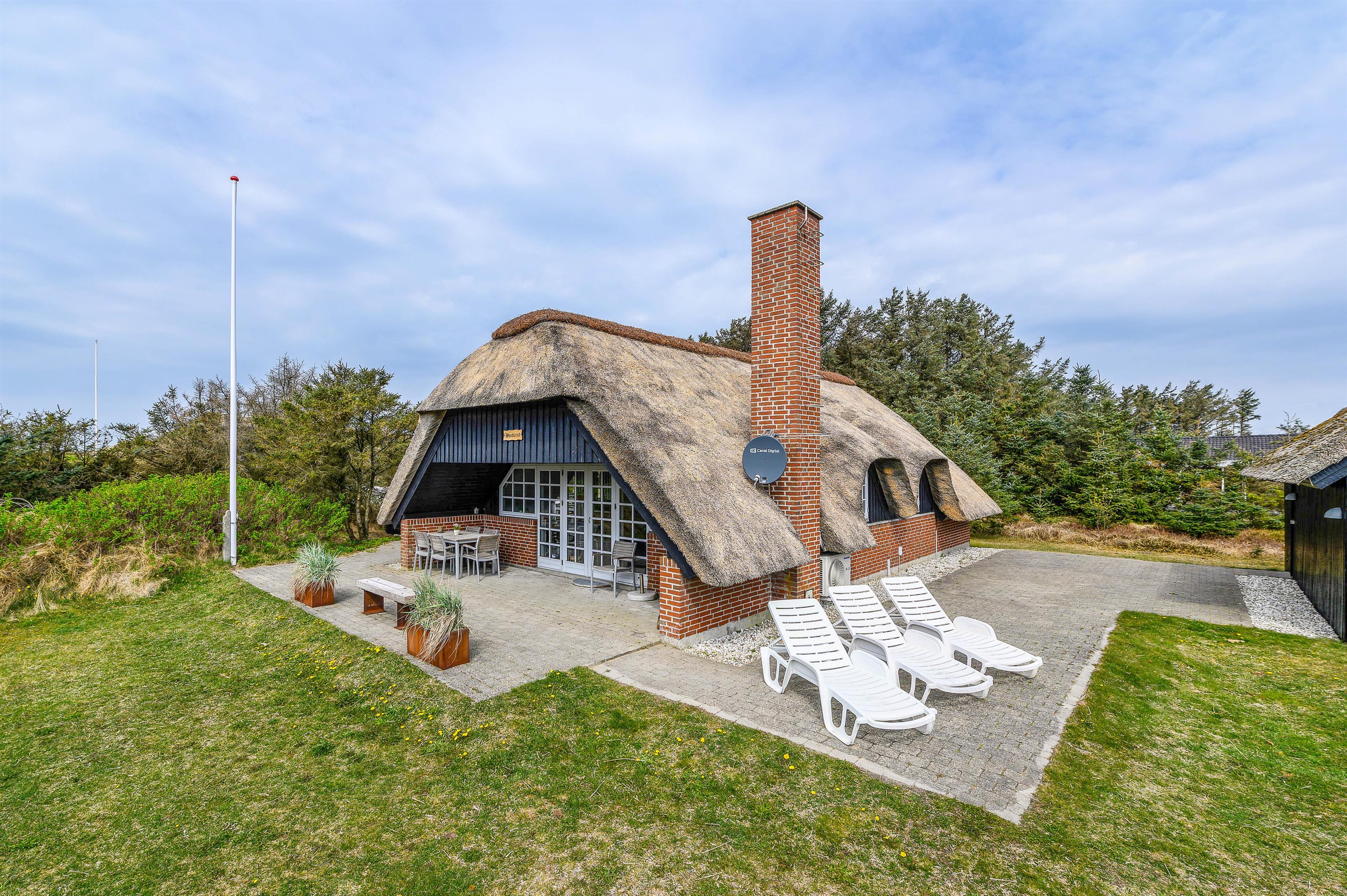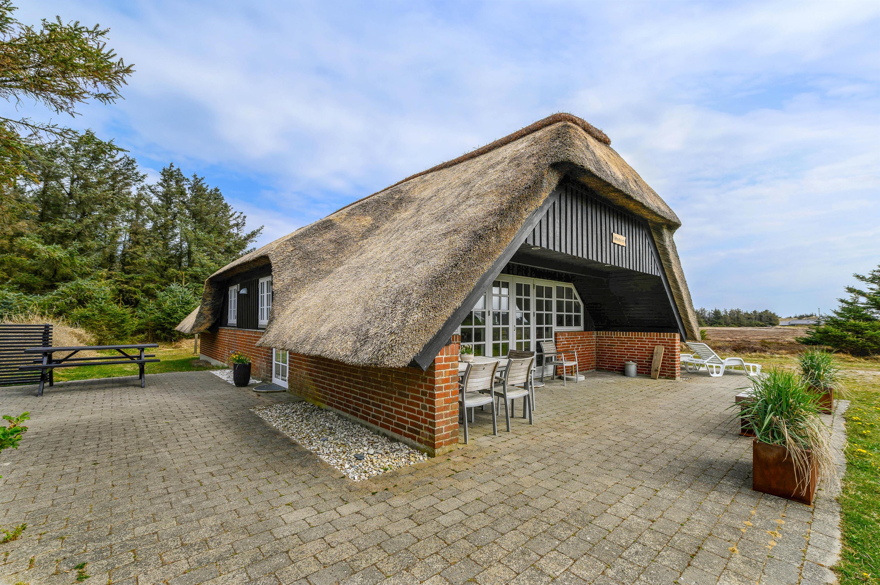 Et meget velholdt murstenshus med stråtag, hvor der er masser af charme og hygge – perfekt til en dejlig familieferie. Huset fremstår lyst og indbydende overalt og fra stuen kan du slå dobbeltdørene op til den delvist overdækkede terrasse, hvor I kan nyde den flotte og naturligt afskærmede grund.