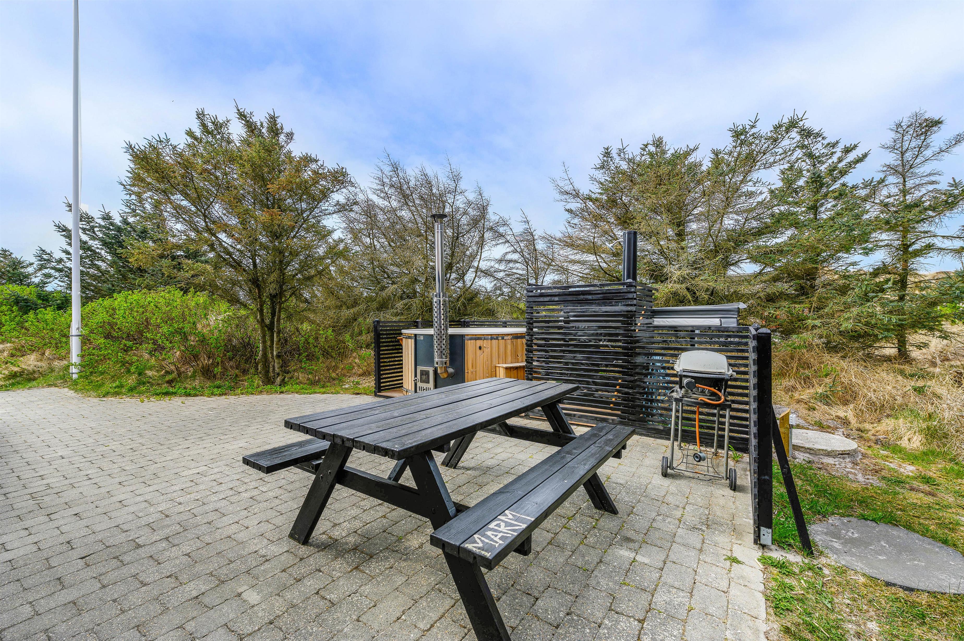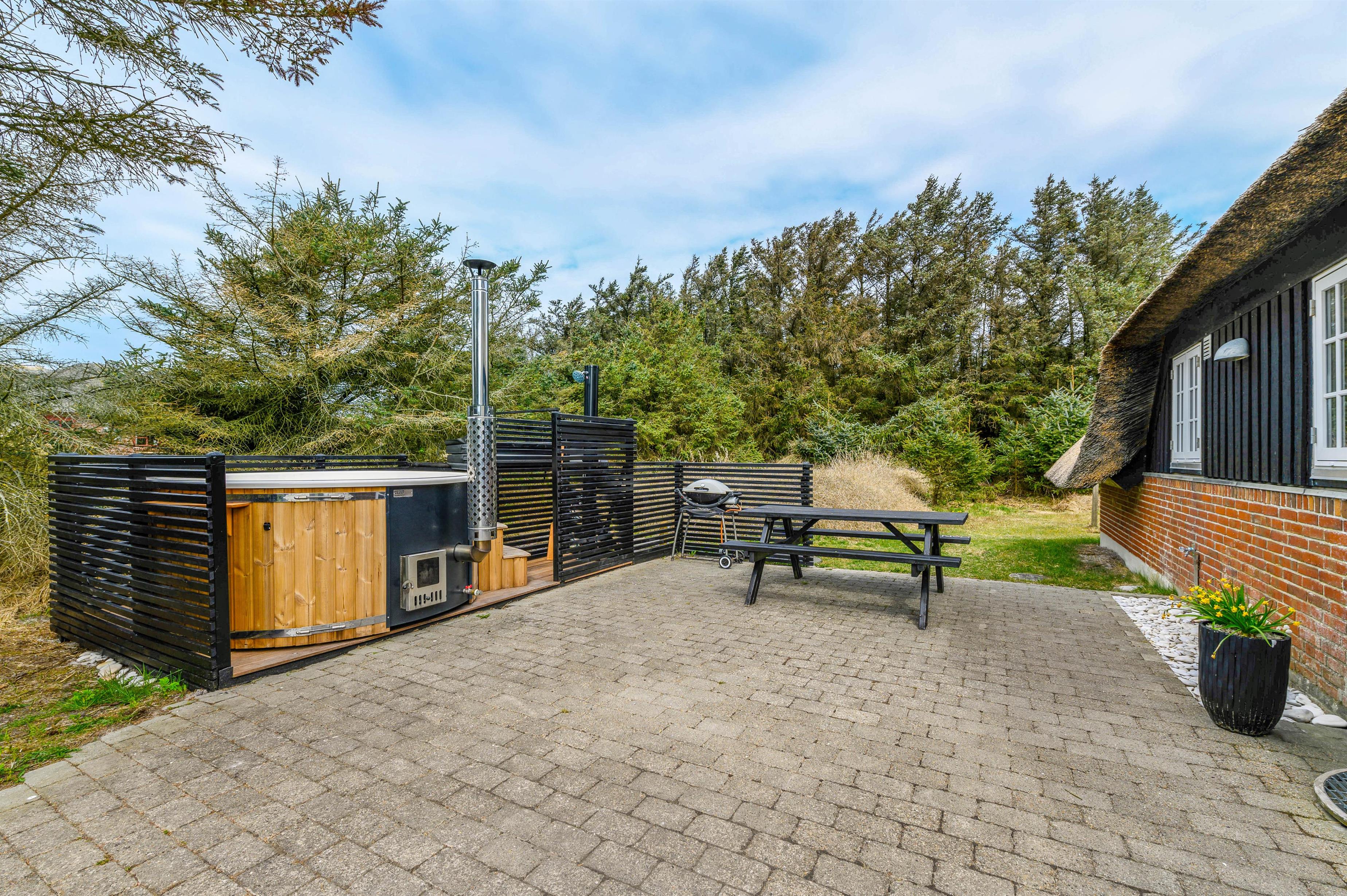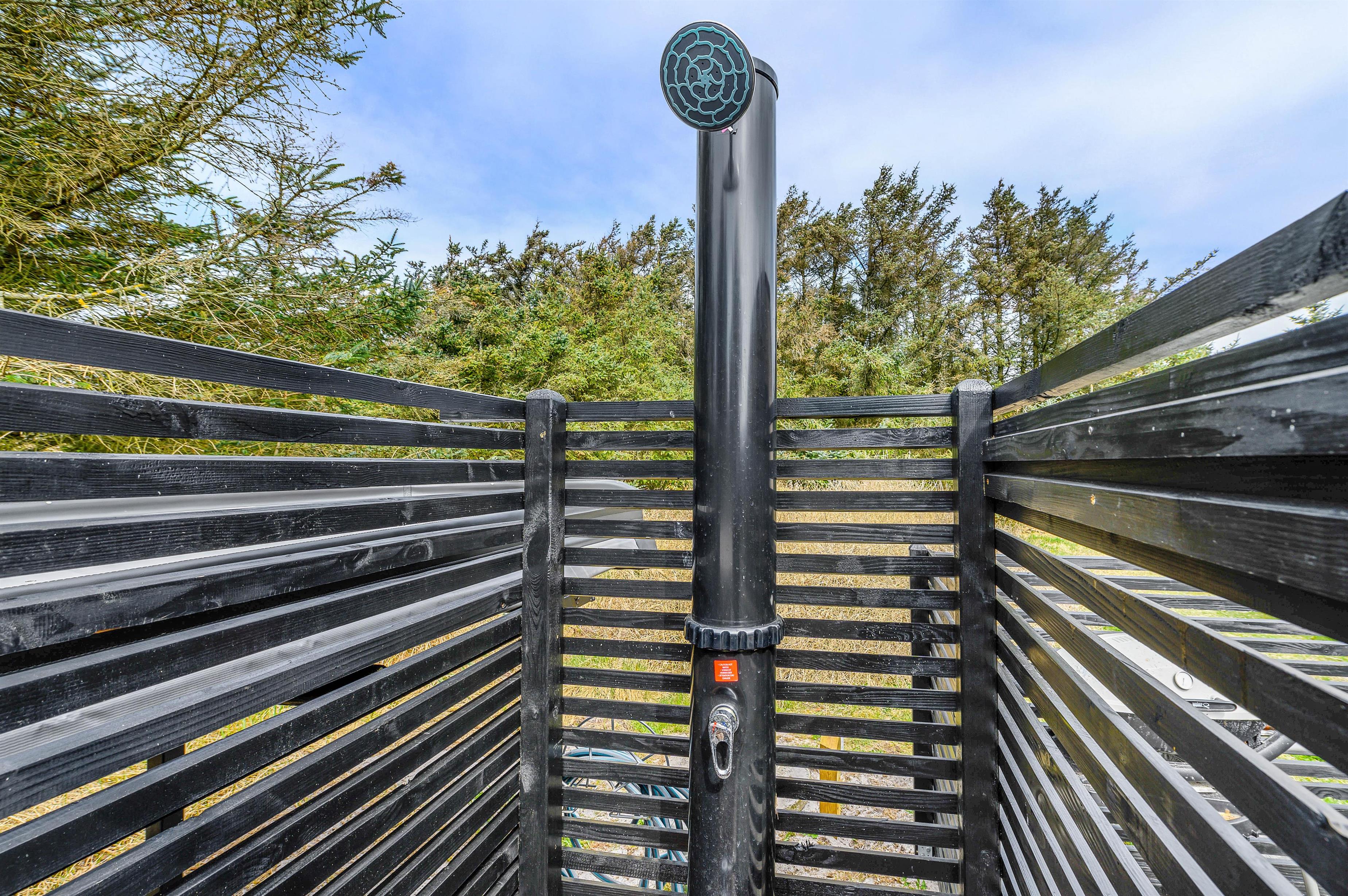 Samtidigt er feriehuset placeret på en grund som er godt beskyttet af træer mod vest og mod nord, som både skaber læ og privatliv. Der er gode terrasser både mod syd og mellem hus og udhus. Fra april til november er der mulighed for at tage et dejligt bad under udebruseren.