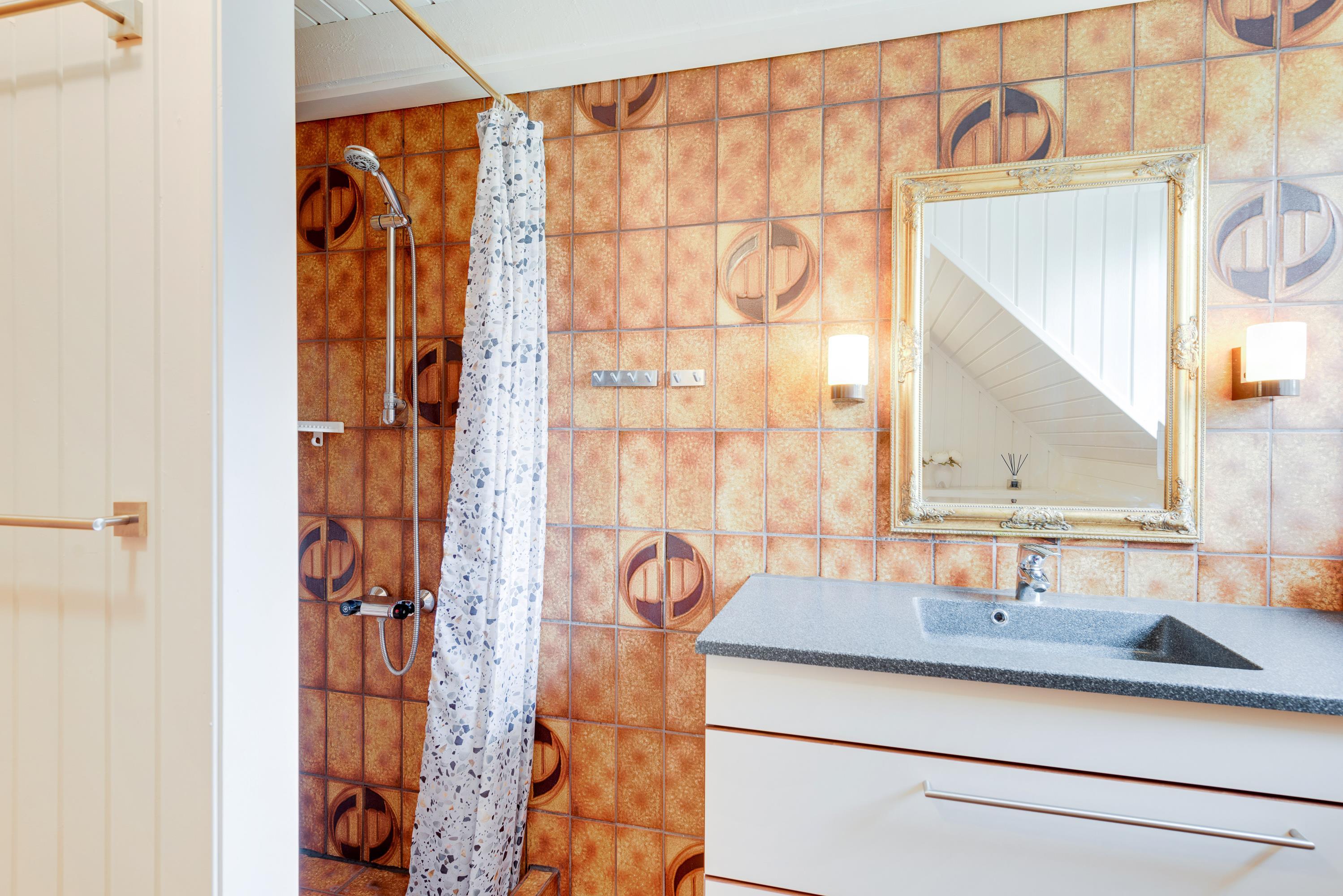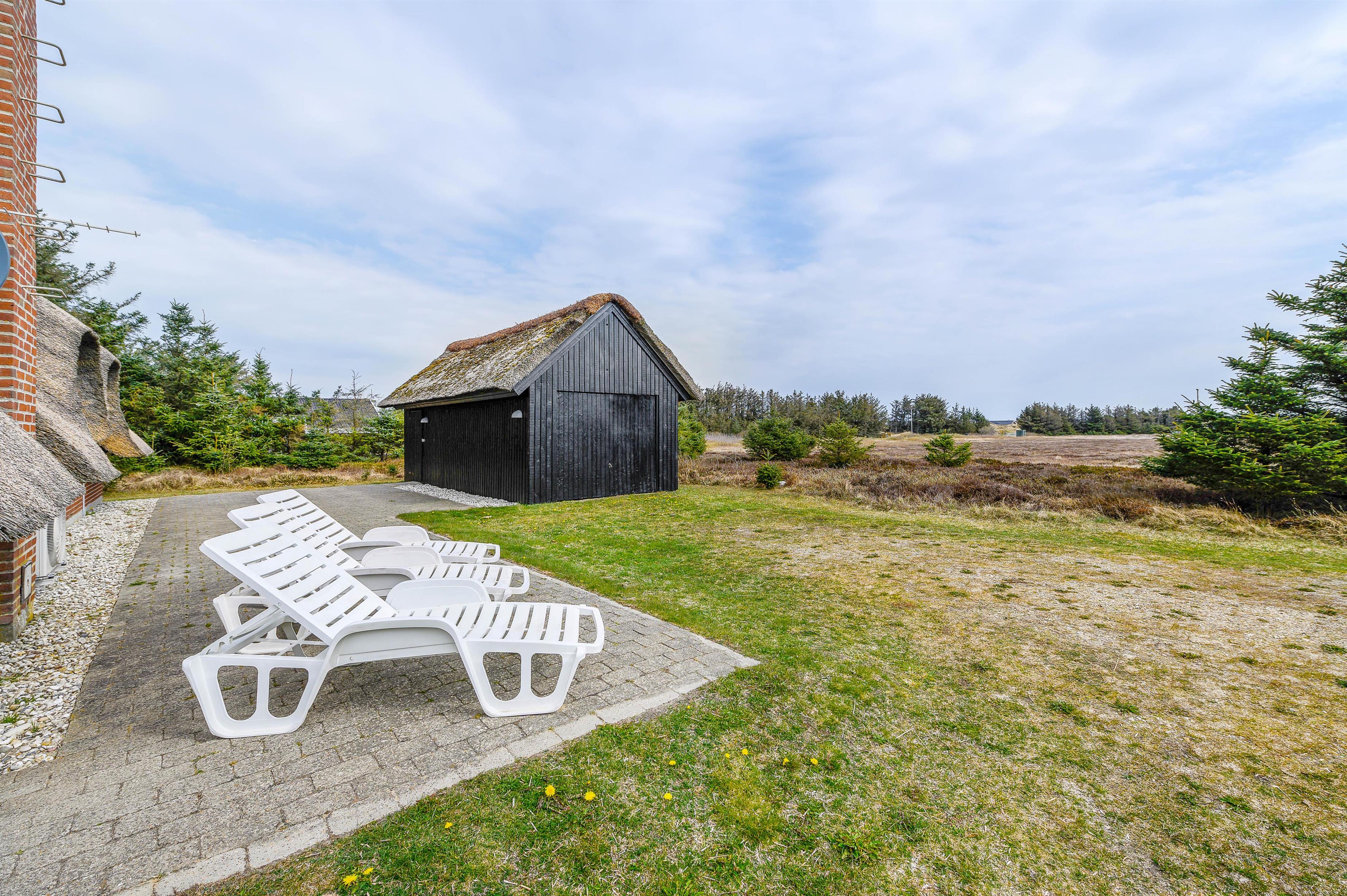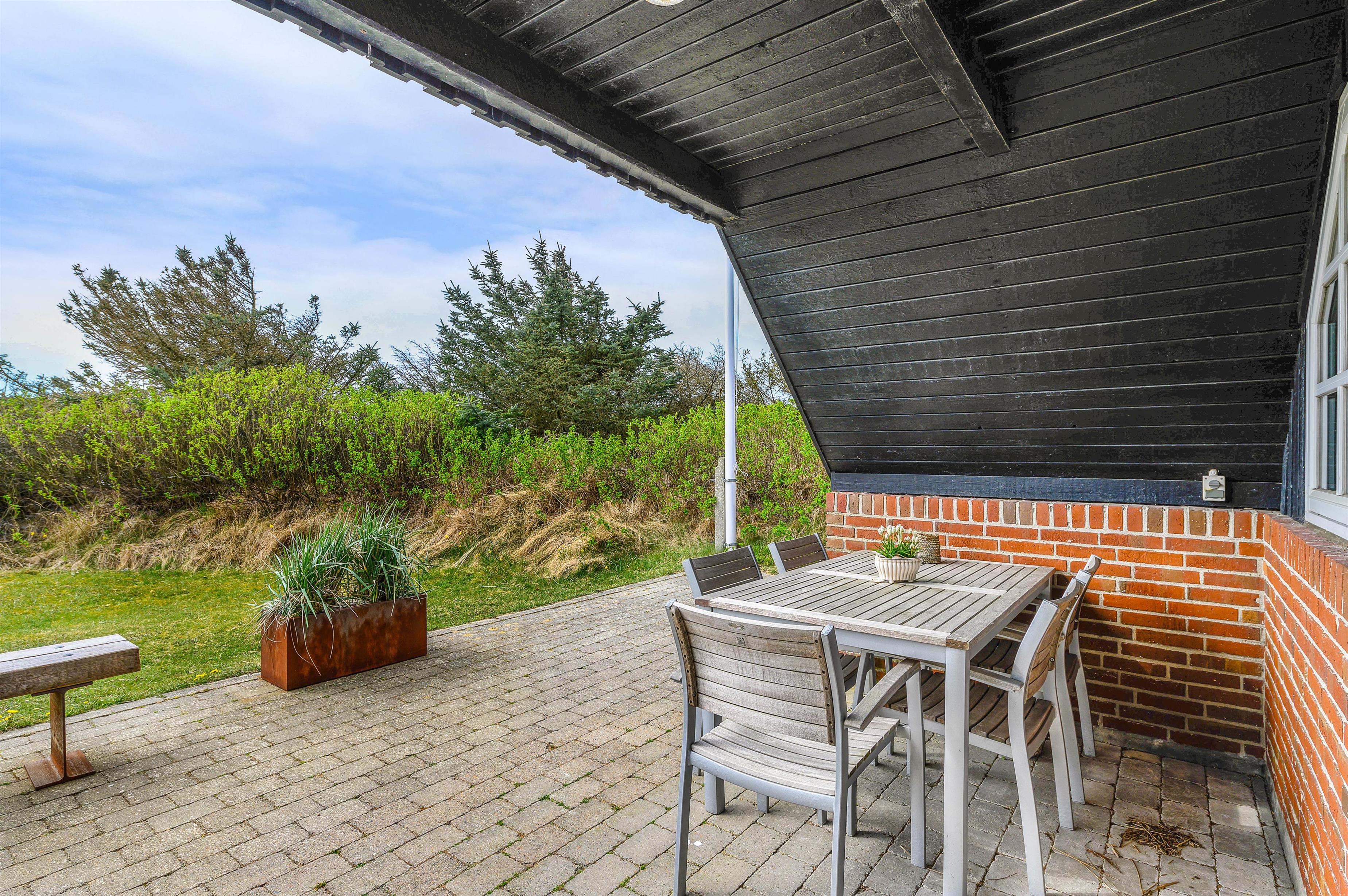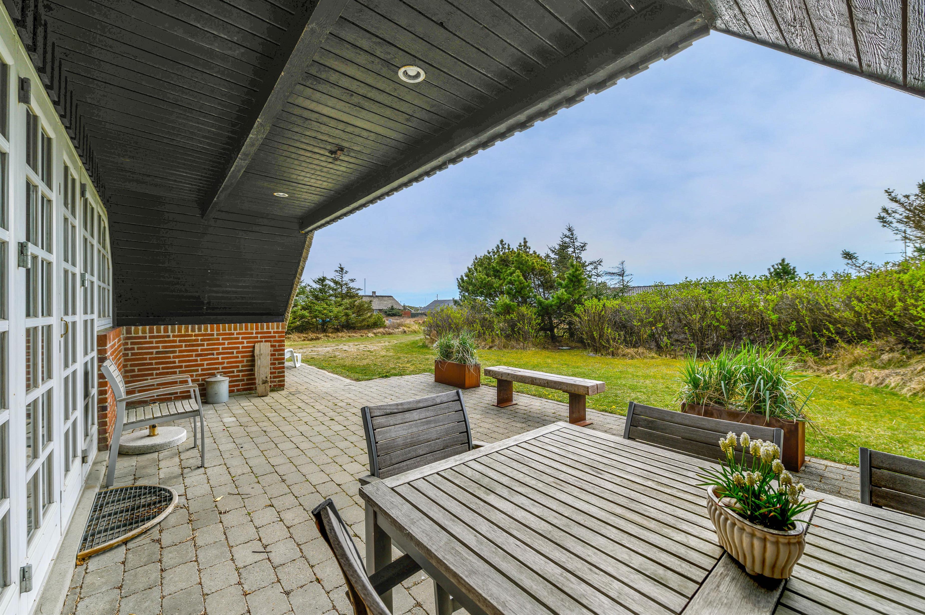 Samtidigt er feriehuset placeret på en grund som er godt beskyttet af træer mod vest og mod nord, som både skaber læ og privatliv. Der er gode terrasser både mod syd og mellem hus og udhus. Fra april til november er der mulighed for at tage et dejligt bad under udebruseren.