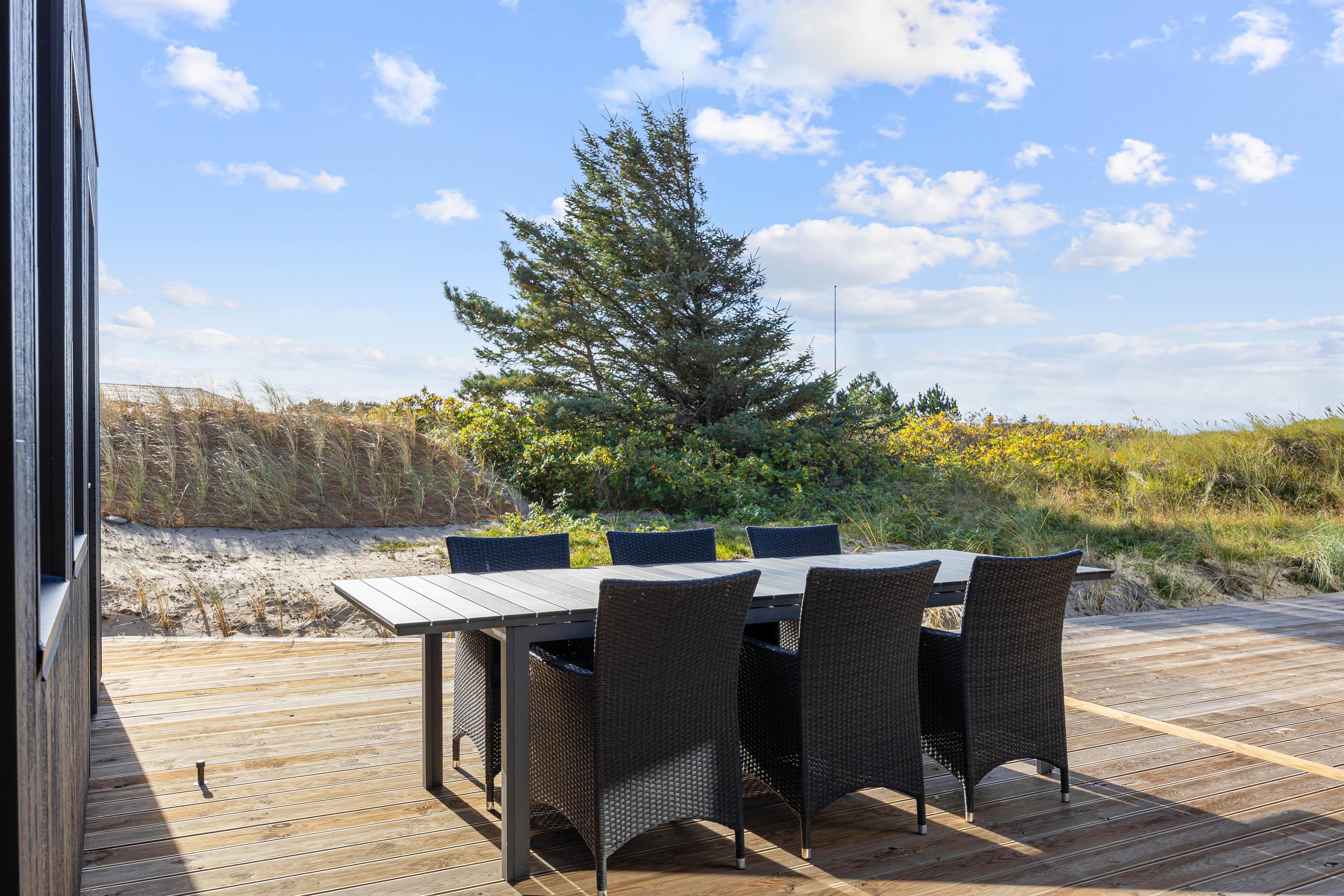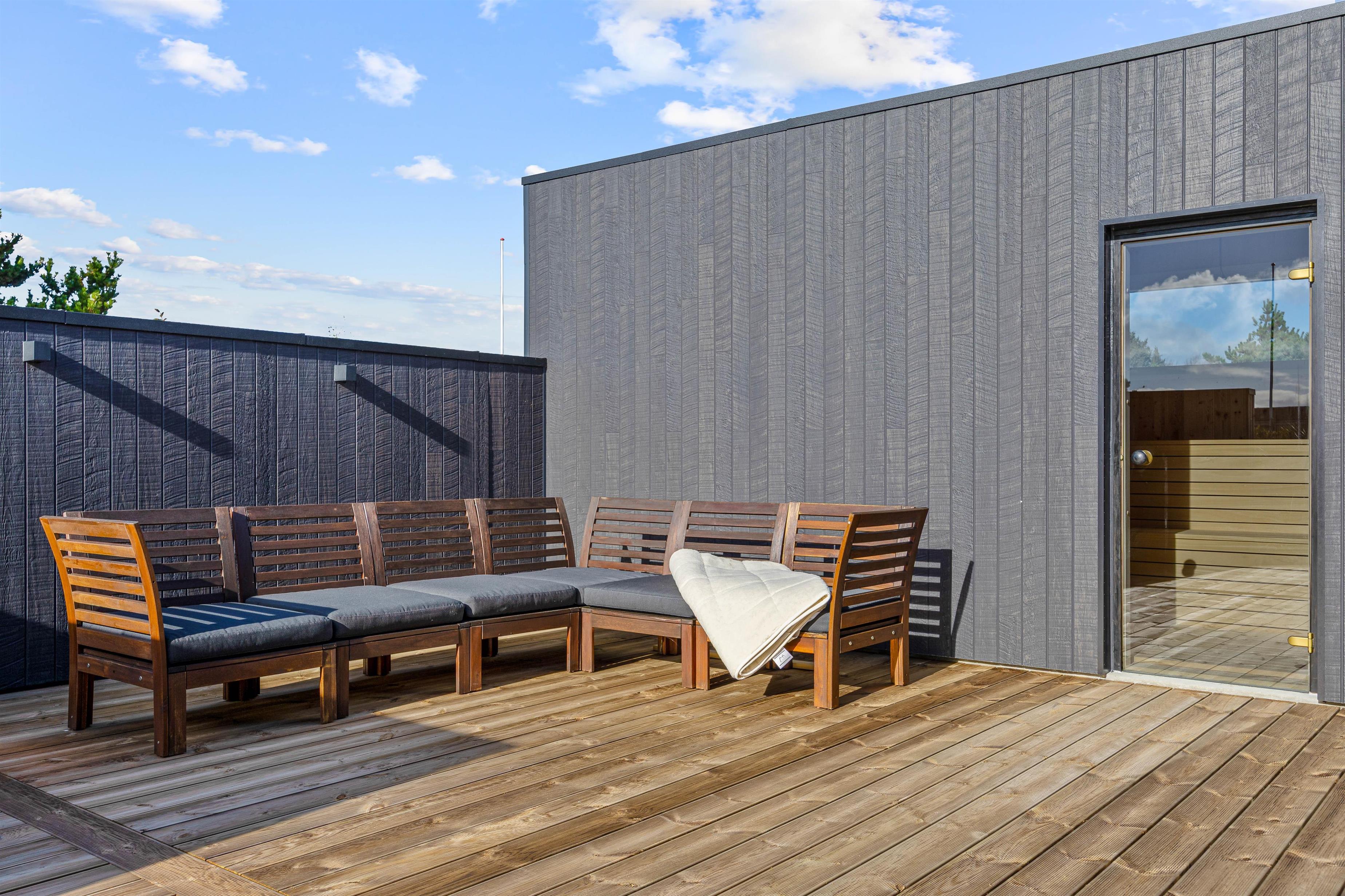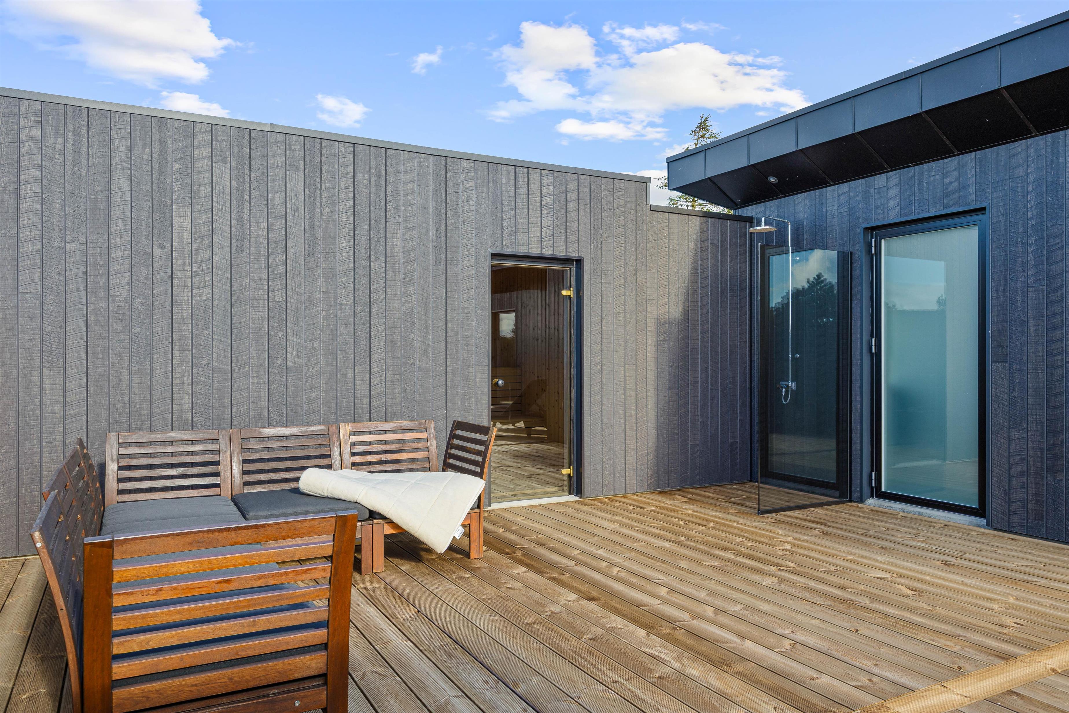 Med flere terrassemuligheder er der masser af plads til at slappe af og nyde de udendørs omgivelser. I kan også benytte den overdækkede terrasse, hvis man søger ly for regn og vind. Sommerhuset tilbyder en gasgrill, så I kan tilberede skønne måltider i det fri, og den åbne samt afskærmede terrasse indbyder til mange gode stunder uanset vejret. Fra april og frem til november findes der endnu en bonus, nemlig udebruseren, der er perfekt efter en dag ved havet, som blot ligger 800 meter væk.