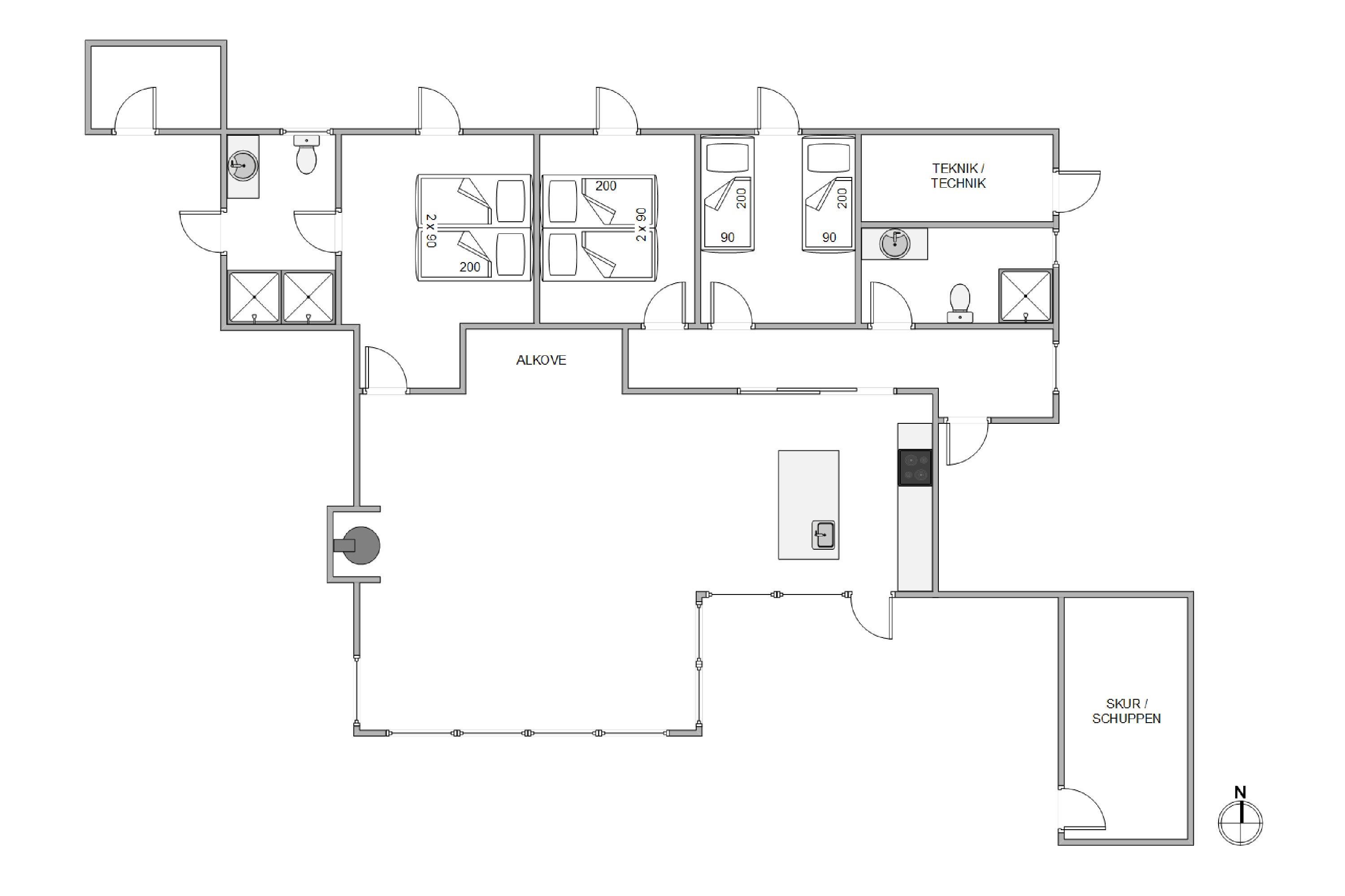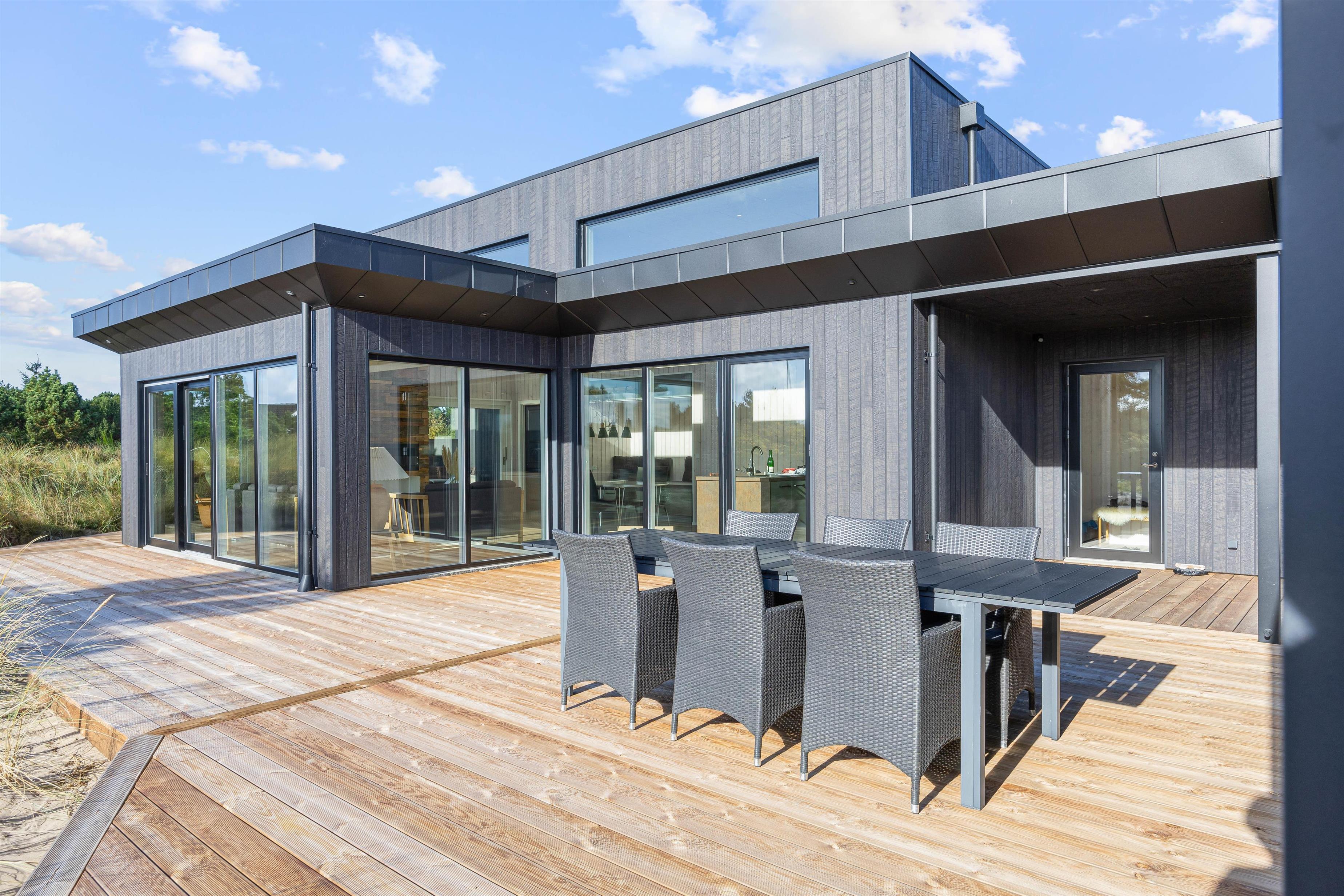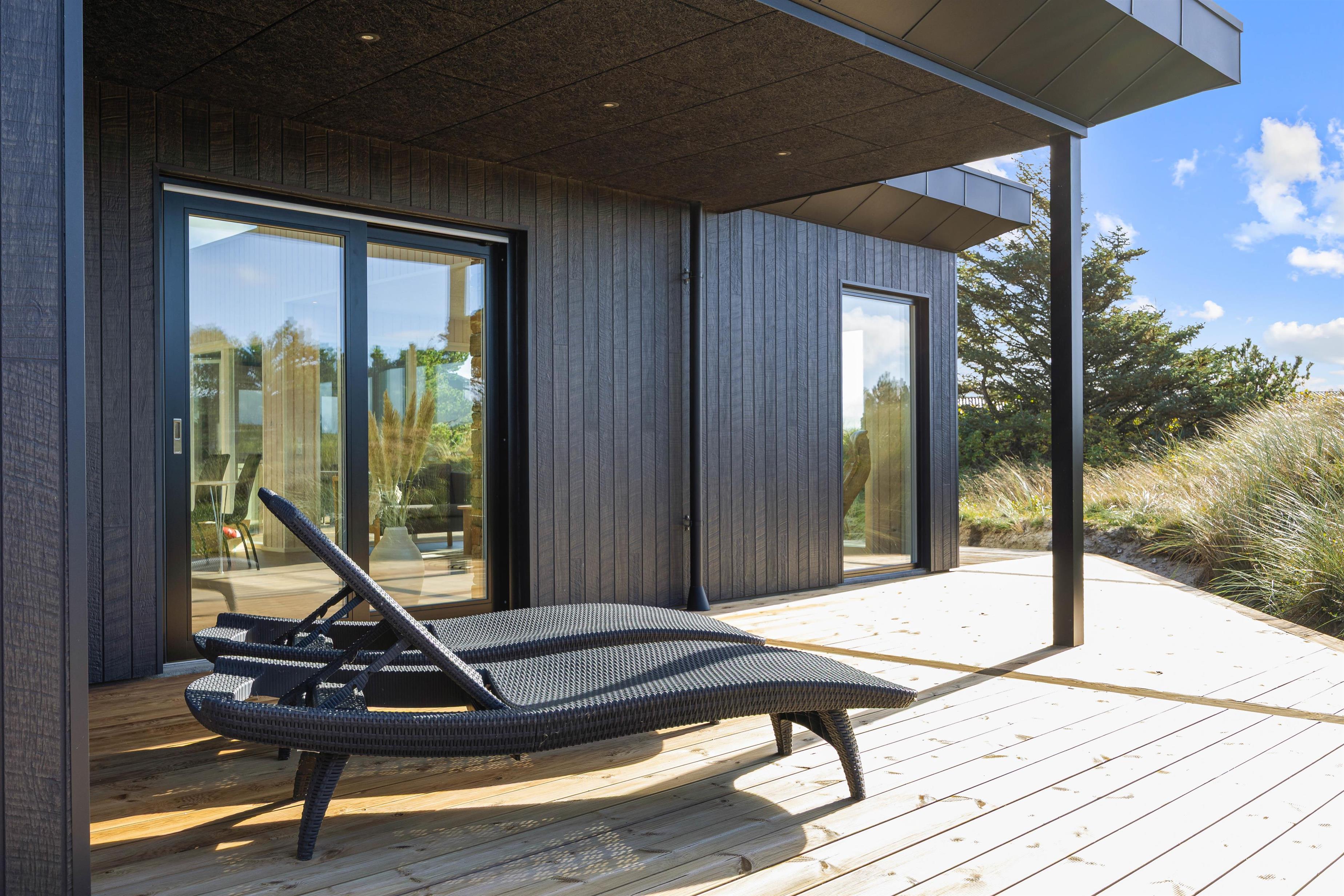 Med flere terrassemuligheder er der masser af plads til at slappe af og nyde de udendørs omgivelser. I kan også benytte den overdækkede terrasse, hvis man søger ly for regn og vind. Sommerhuset tilbyder en gasgrill, så I kan tilberede skønne måltider i det fri, og den åbne samt afskærmede terrasse indbyder til mange gode stunder uanset vejret. Fra april og frem til november findes der endnu en bonus, nemlig udebruseren, der er perfekt efter en dag ved havet, som blot ligger 800 meter væk.