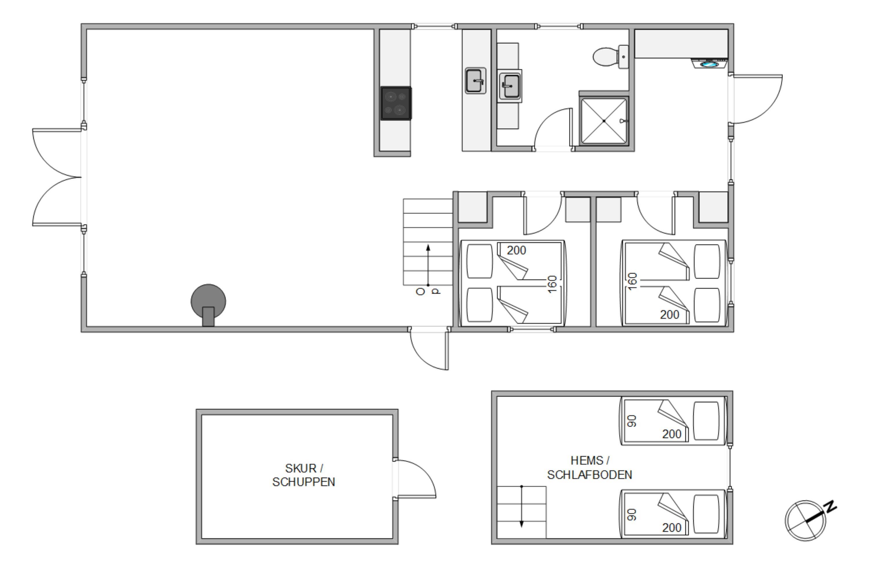 De 6 sovepladser er fordelt på 2 soverum med dobbeltsenge og en hems, hvor der er 2 enkeltsenge. Derudover finder I også et badeværelse med gulvvarme i sommerhuset. I forhold til de praktiske gøremål, kan de hurtigt klares, da der både er vaskemaskine og opvaskemaskine.