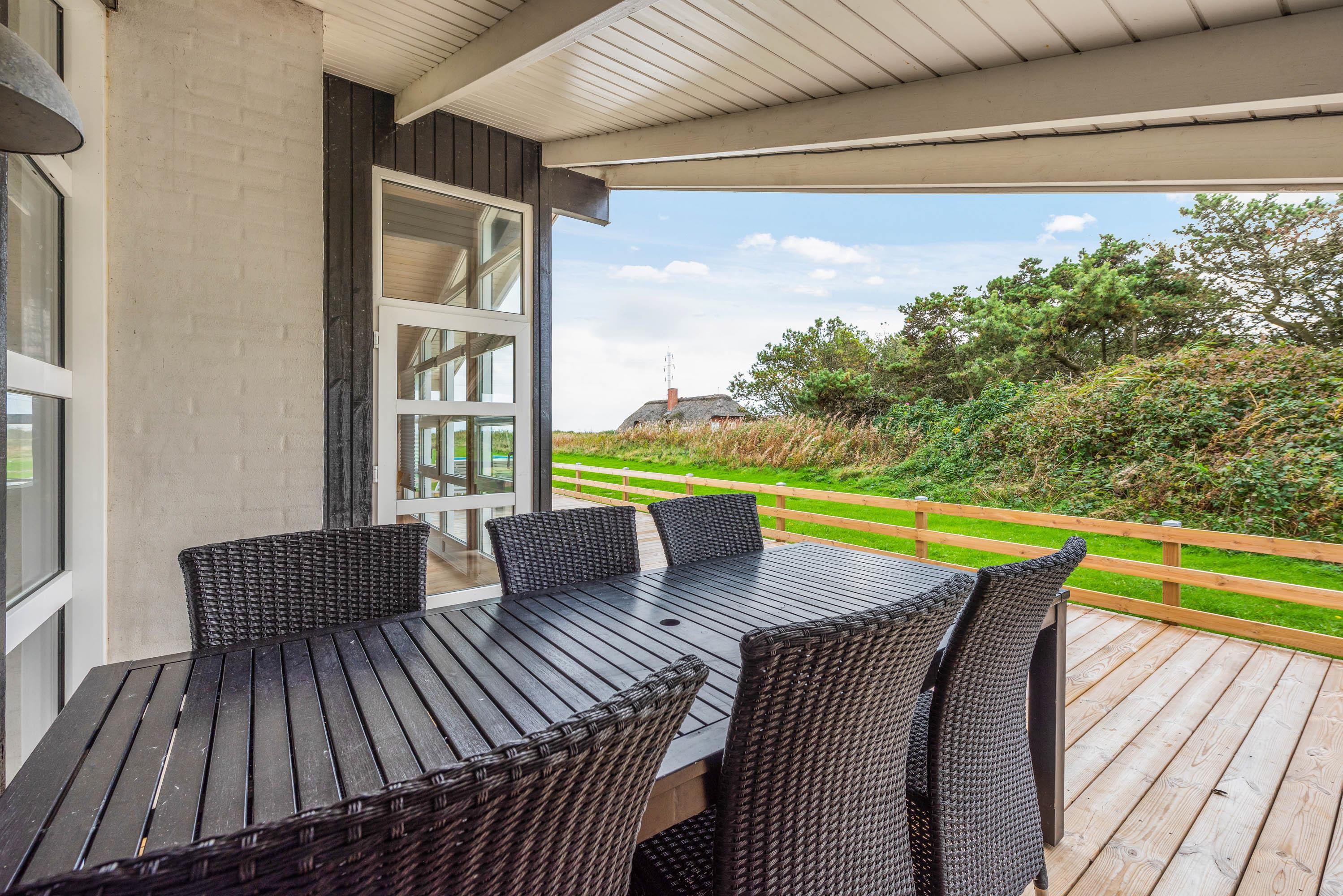 Sommerhuset er omgivet af en store dejlig træterrasse med plads til hygge, alt imens du har mulighed for at se børn og hunde nyde leg på den store græs grund. For børnene er der en endvidere en gynge. Nyd ferie i en af liggestolene og tilbered evt. nogle af måltiderne på huset grill, der er rigelig med plads til den store familie.