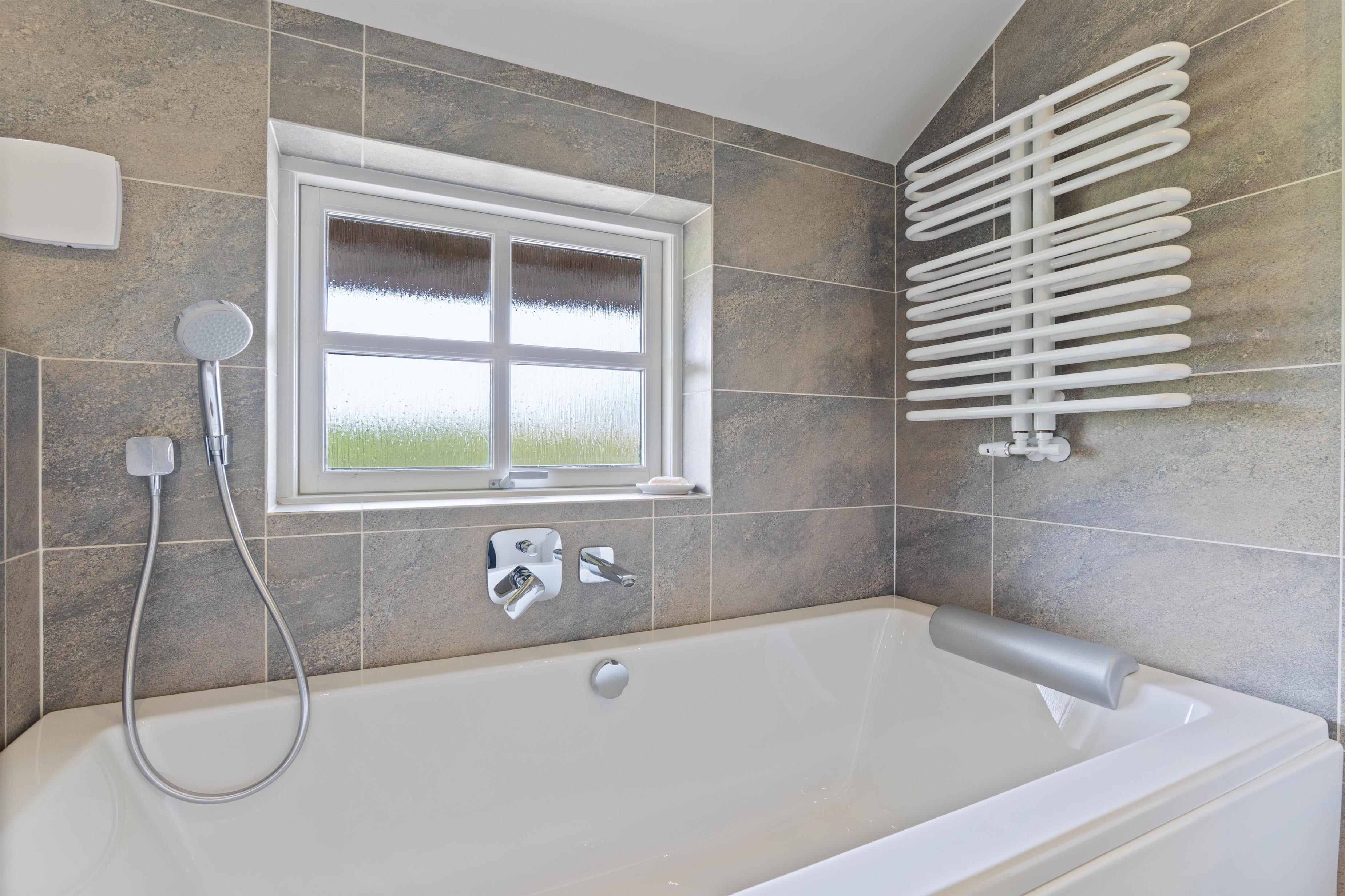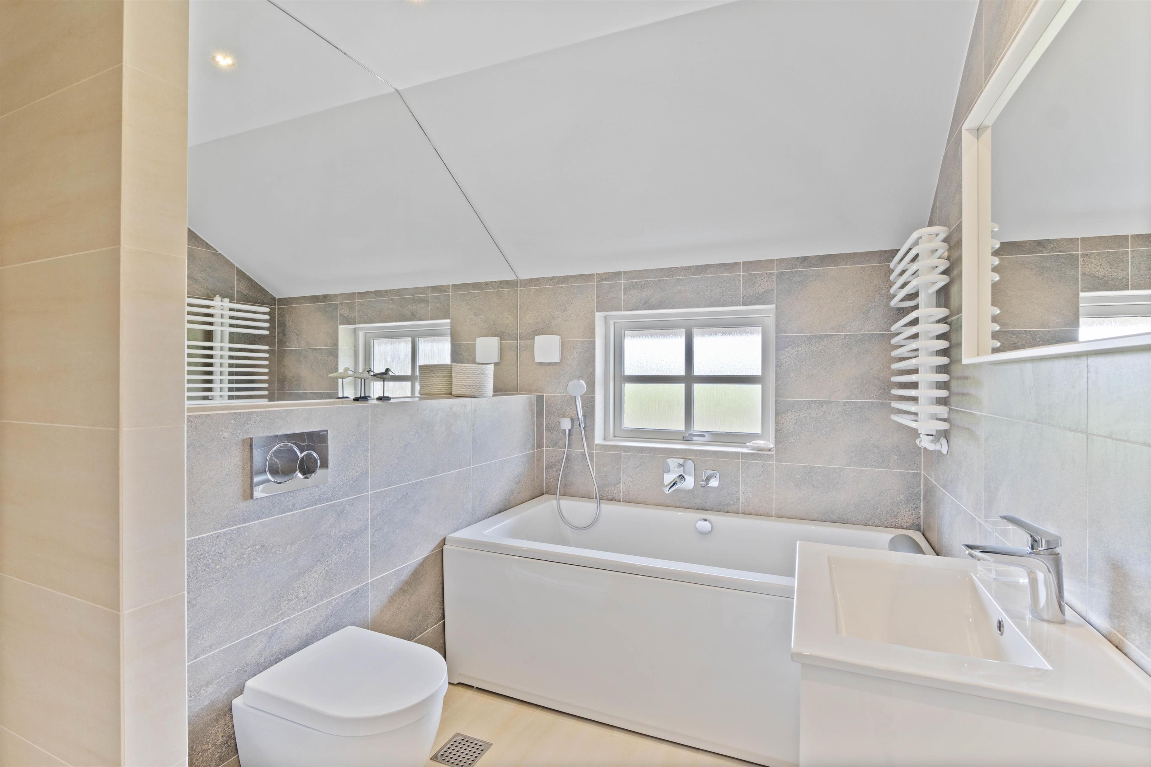 Hvis I hellere vil nyde en rolig og afslappende stund, kan I søge mod sommerhusets 2 badeværelser. Udover at badeværelserne byder på dejlig gulvvarme, så er der også et badekar på det ene badeværelse, som I kan læne jer tilbage i og slappe helt af.
