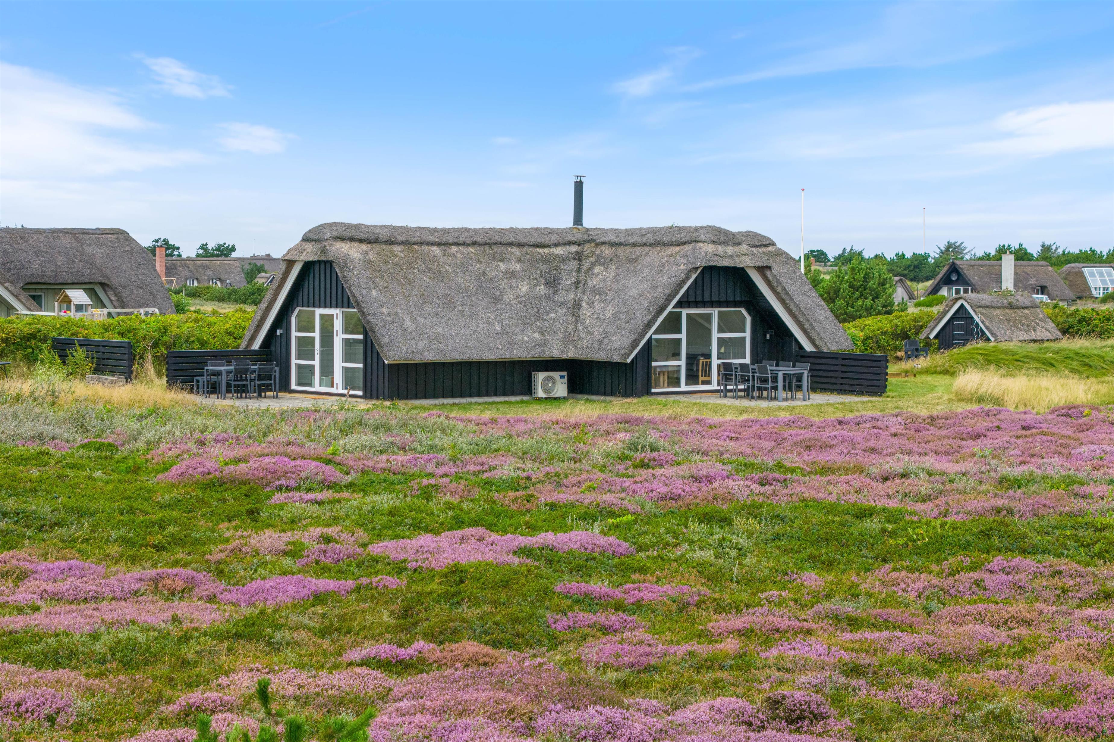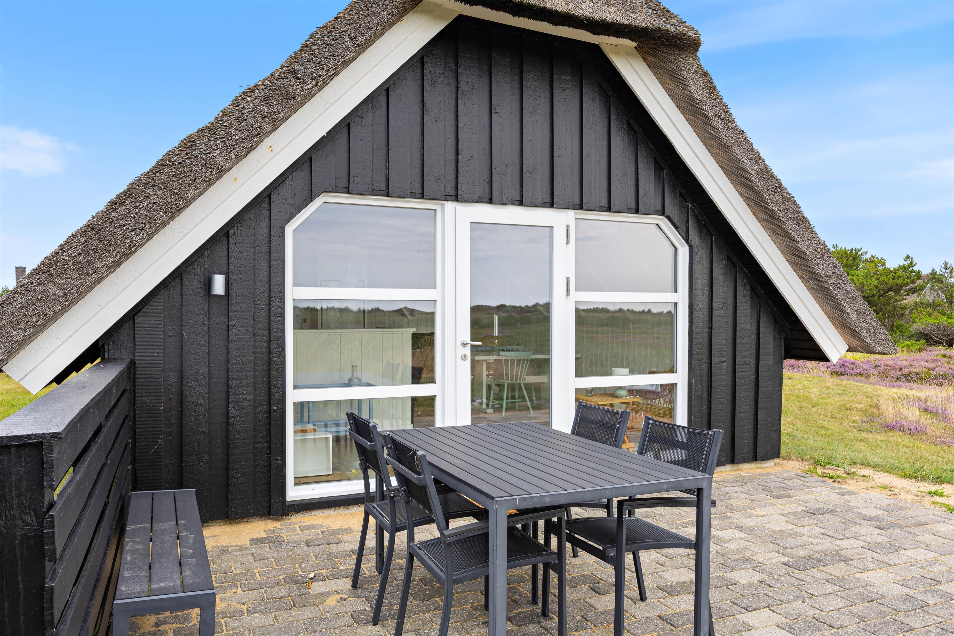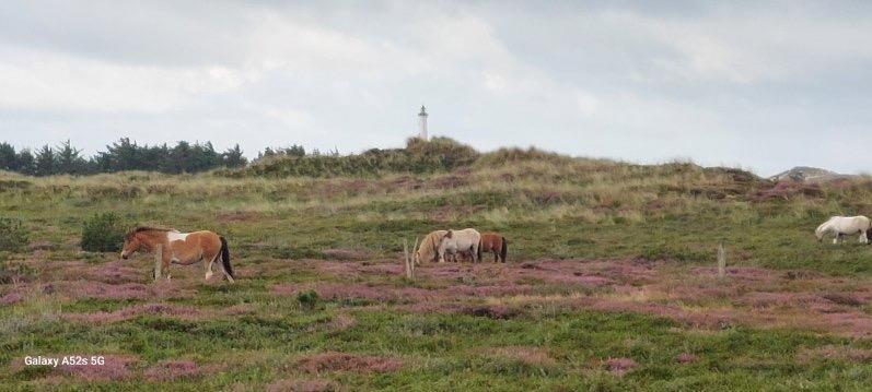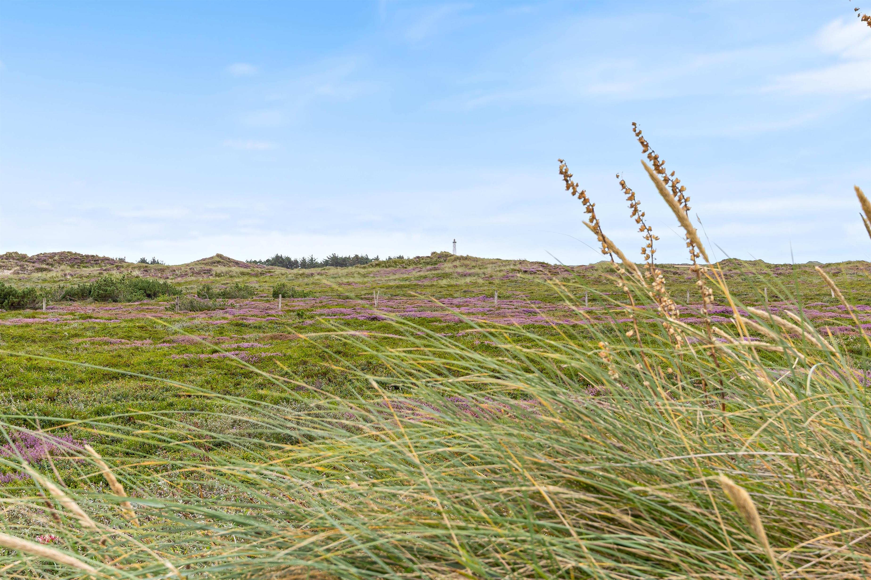 Sommerhuset ligger på en dejlig naturgrund omgivet af lyngklædte arealer, hvor I kan nyde roen og den friske havluft. Fra terrassen er der en skøn udsigt til Nr. Lyngvig Fyr. Den åbne terrasse er udstyret med havemøbler, så I kan nyde feriens måltider under åben himmel eller bare slappe af med en god bog. På grunden er der også et ladestik til el-bil, så I nemt kan lade bilen op, mens I holder ferie.