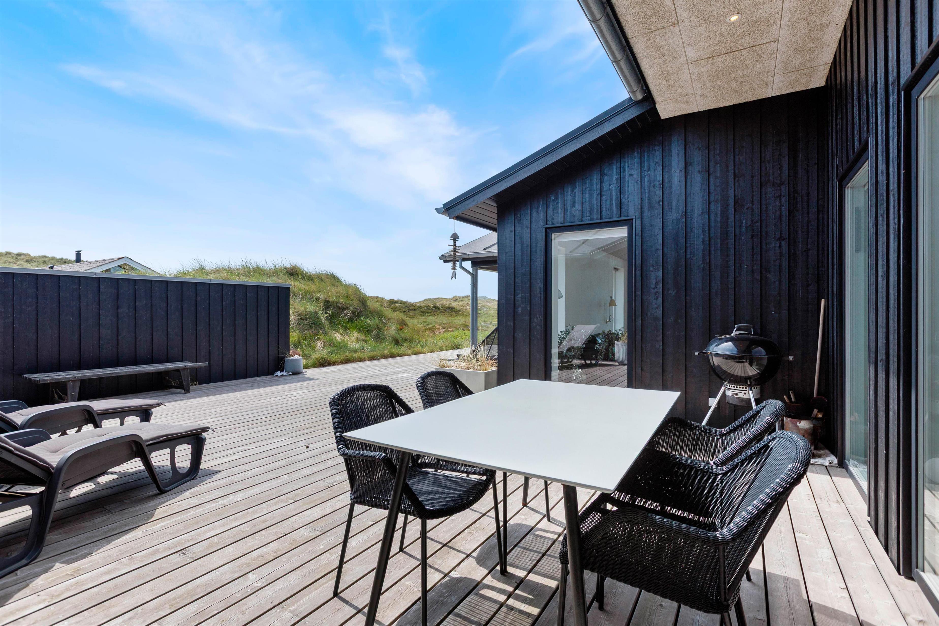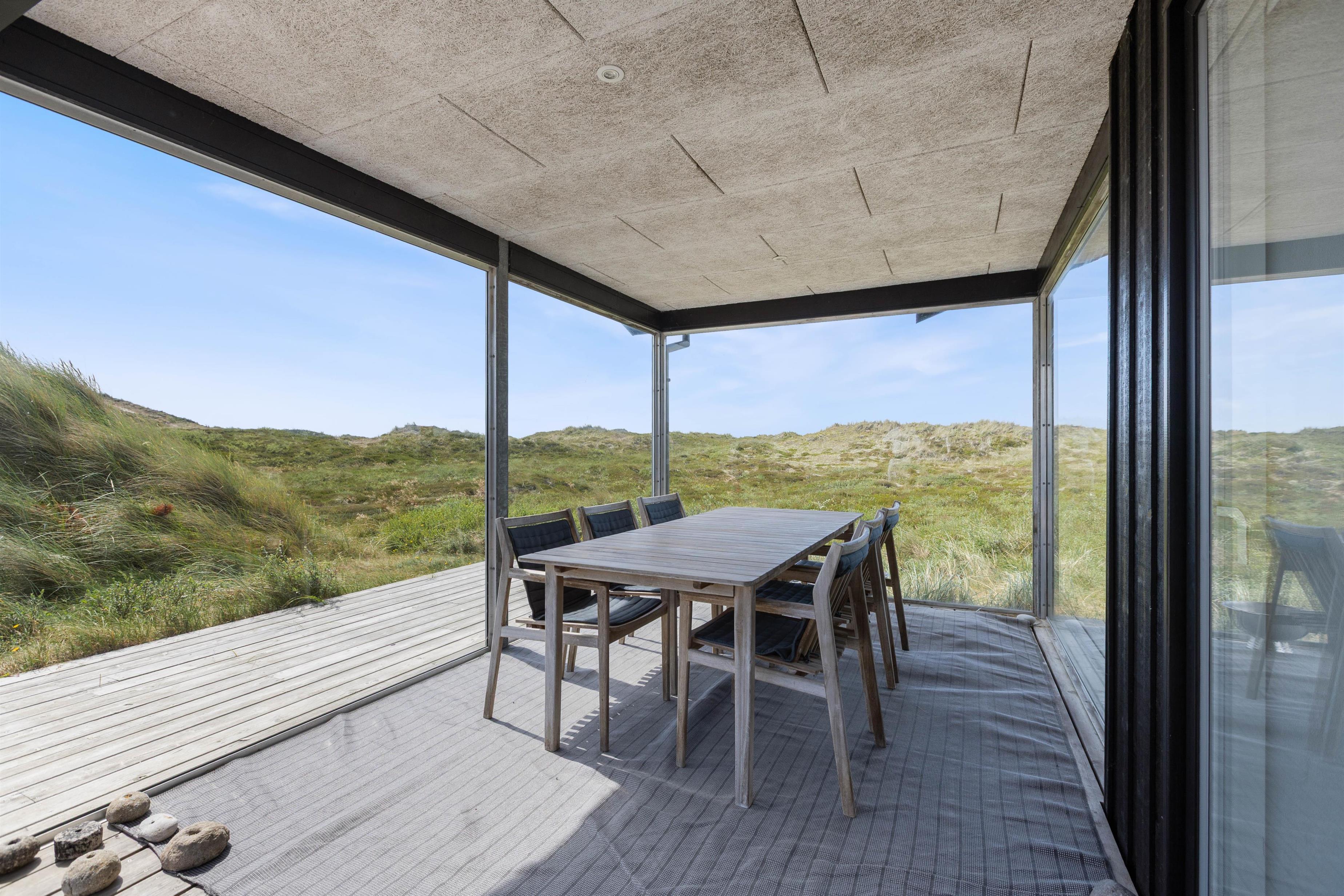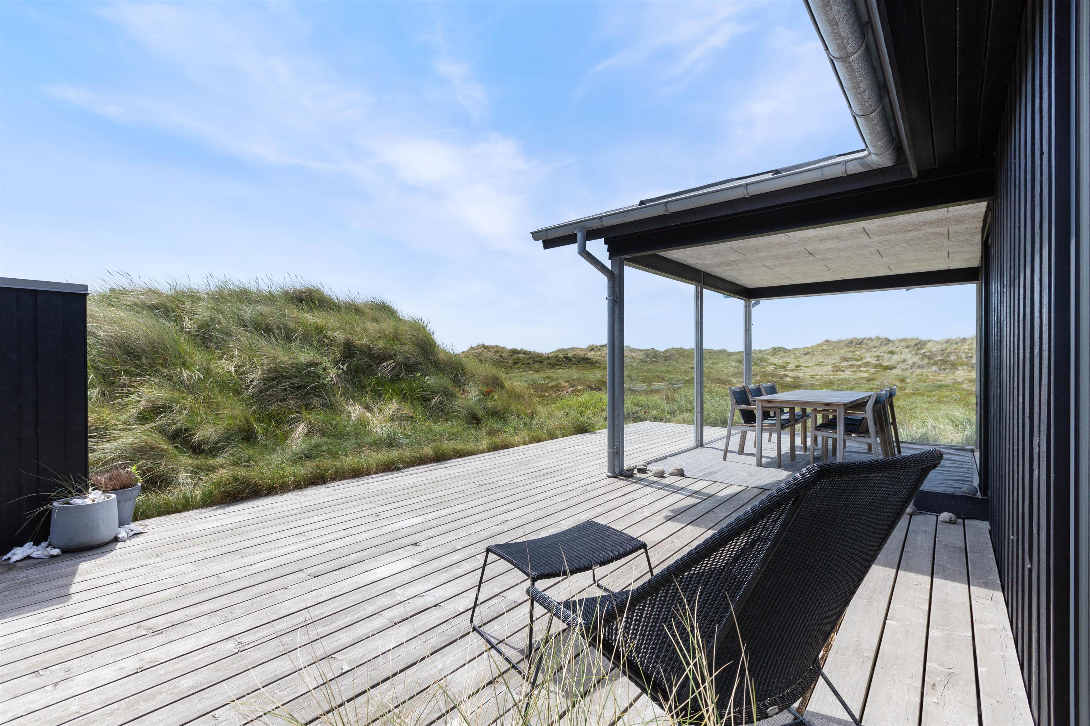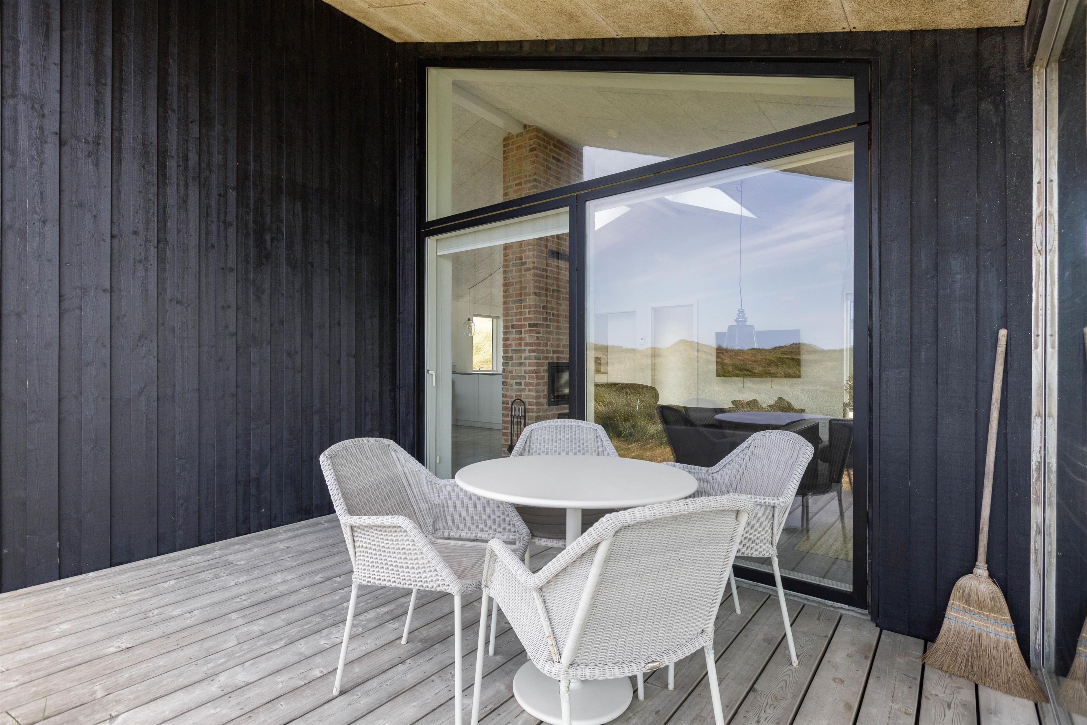 Hele vejen rundt om sommerhuset på Havklitvej 95 i Klegod er der hyggelige terrasser, så man har rig mulighed for at nyde solens stråler og den storslåede natur, som I har panoramaudsigt til. De afskærmede og overdækkede terrasser er med til at forlænge ”ude-tiden”. En hyggelig grillaften på terrassen, med solnedgangen og havets brusen i baggrunden, må være den ultimative nydelse og afslapning.