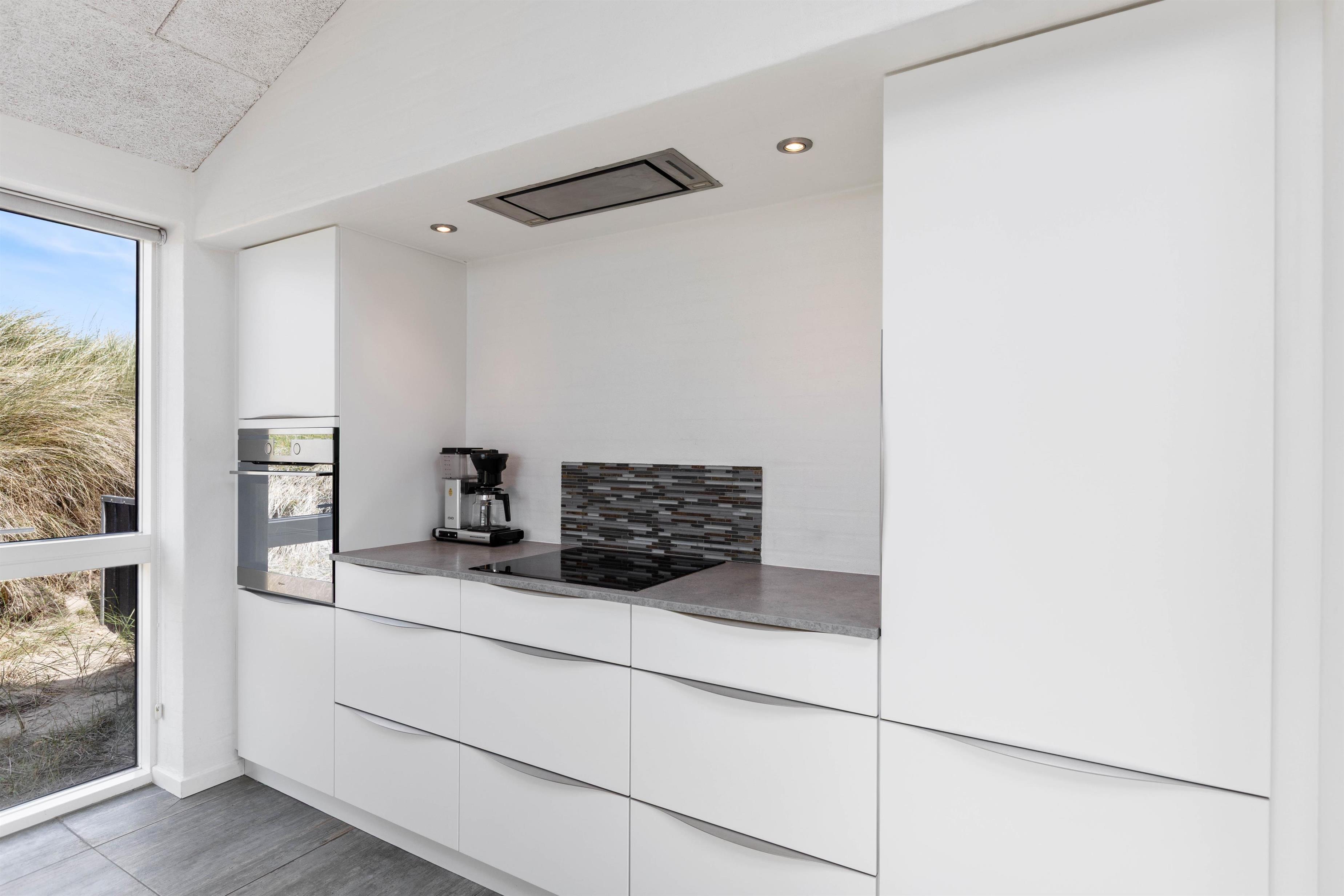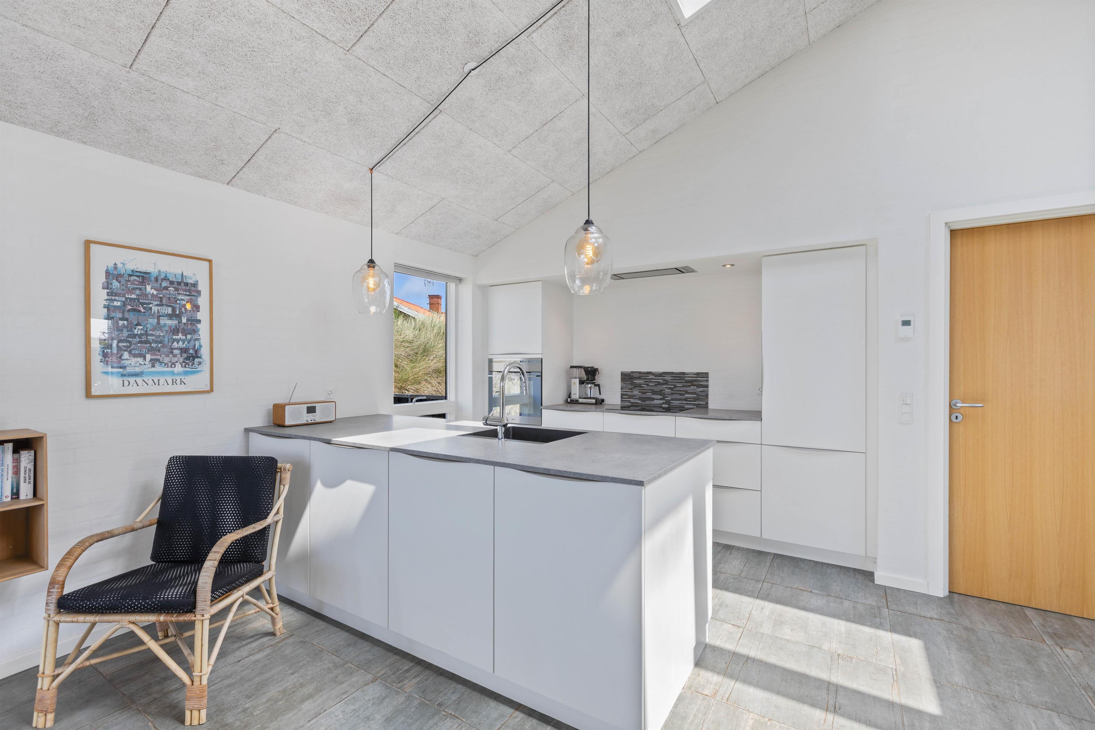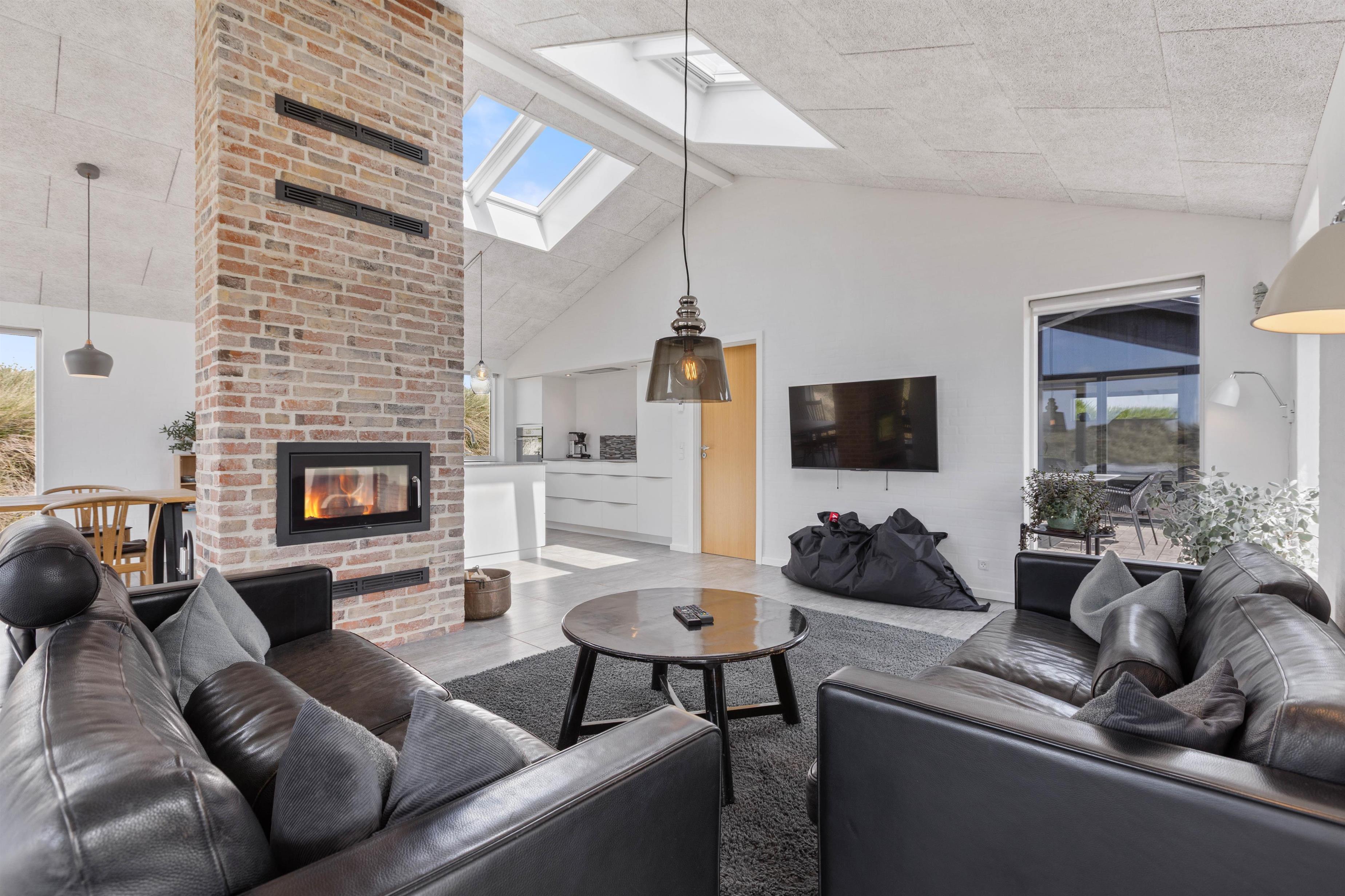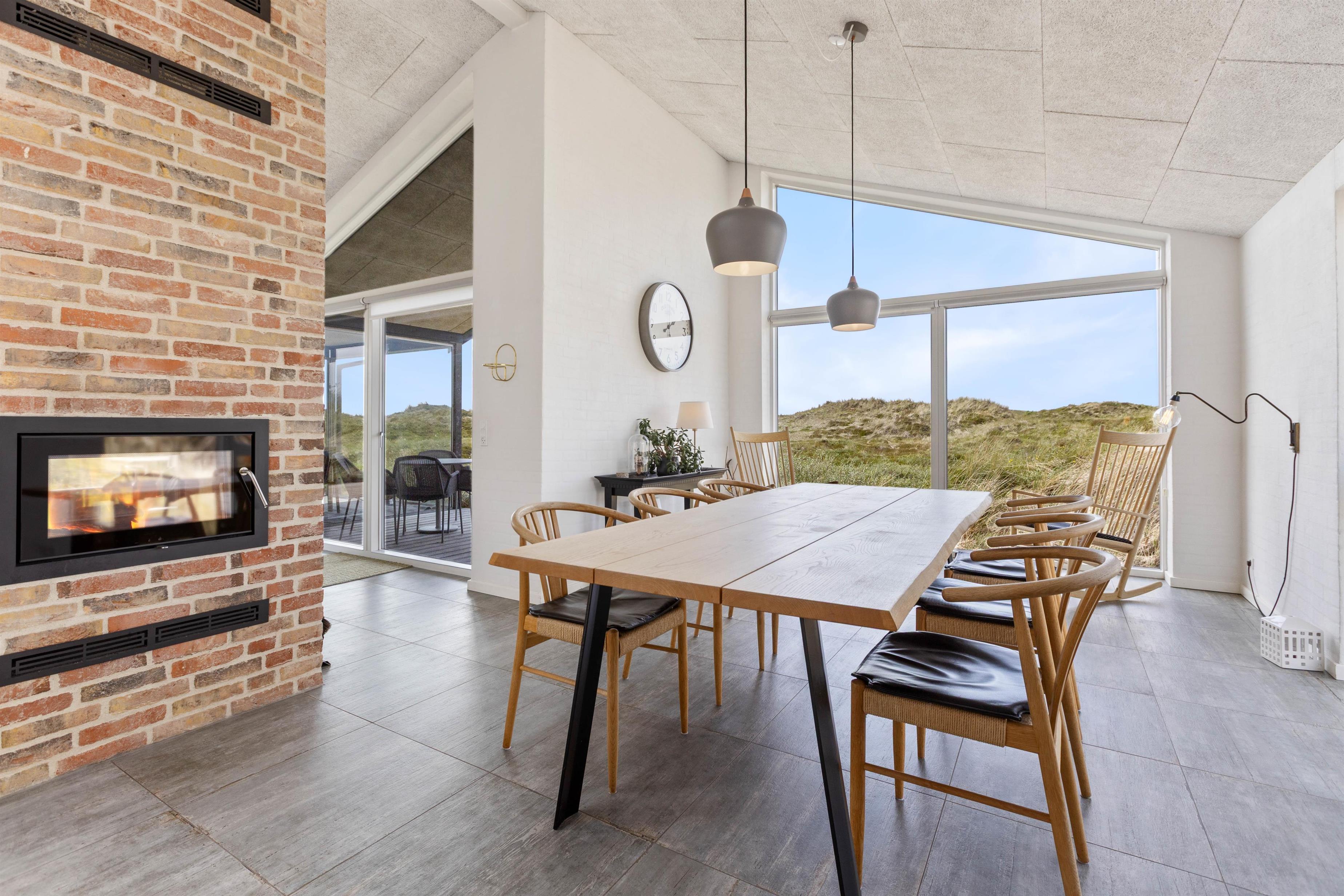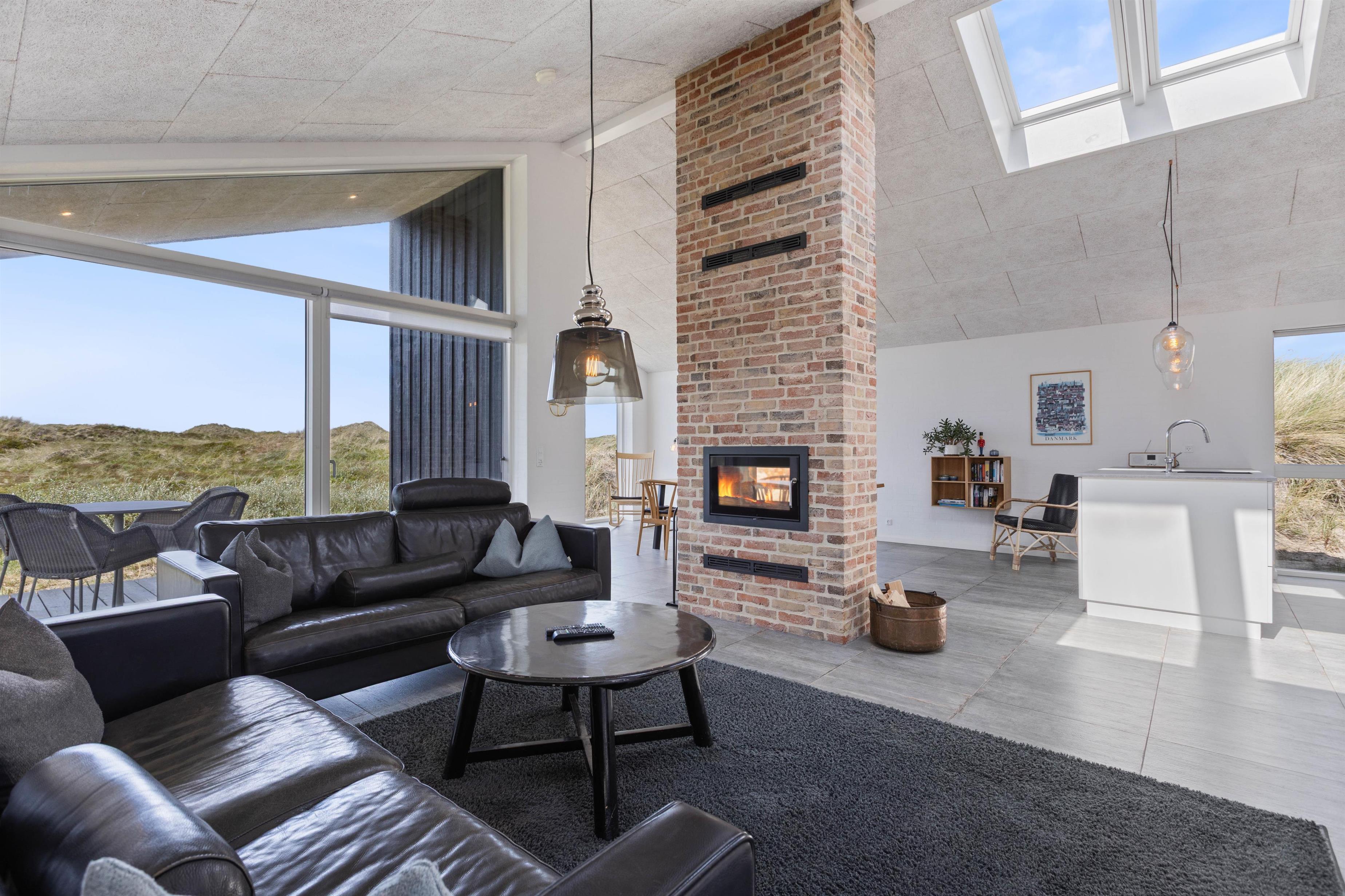 Køkkenafdelingen, som bl.a. er med opvaskemaskine, er rigtig praktisk indrettet, så man hele tiden er en del af selskabet i stuen. Opholdsrummet er gennemgående i sommerhuset og i midten delt af en flot muret skorsten, hvor brændeovnen kan nydes fra begge sider. I den ene side af rummet er der et sofa-hygge-hjørne med flotte og praktiske lædermøbler – i den anden side, i direkte forbindelses med køkkenafdelingen, er spiseafdelingen med flotte spisebordsmøbler, i skandinavisk stil. Overalt i det smukke opholdsrum er der panoramaudsigt til det betagende klitlandskab.