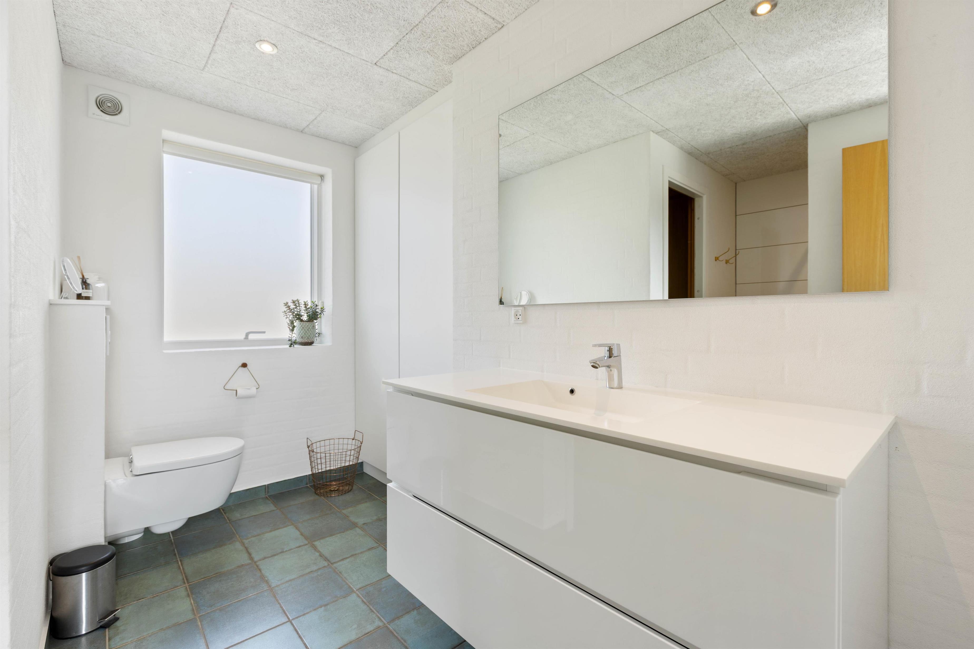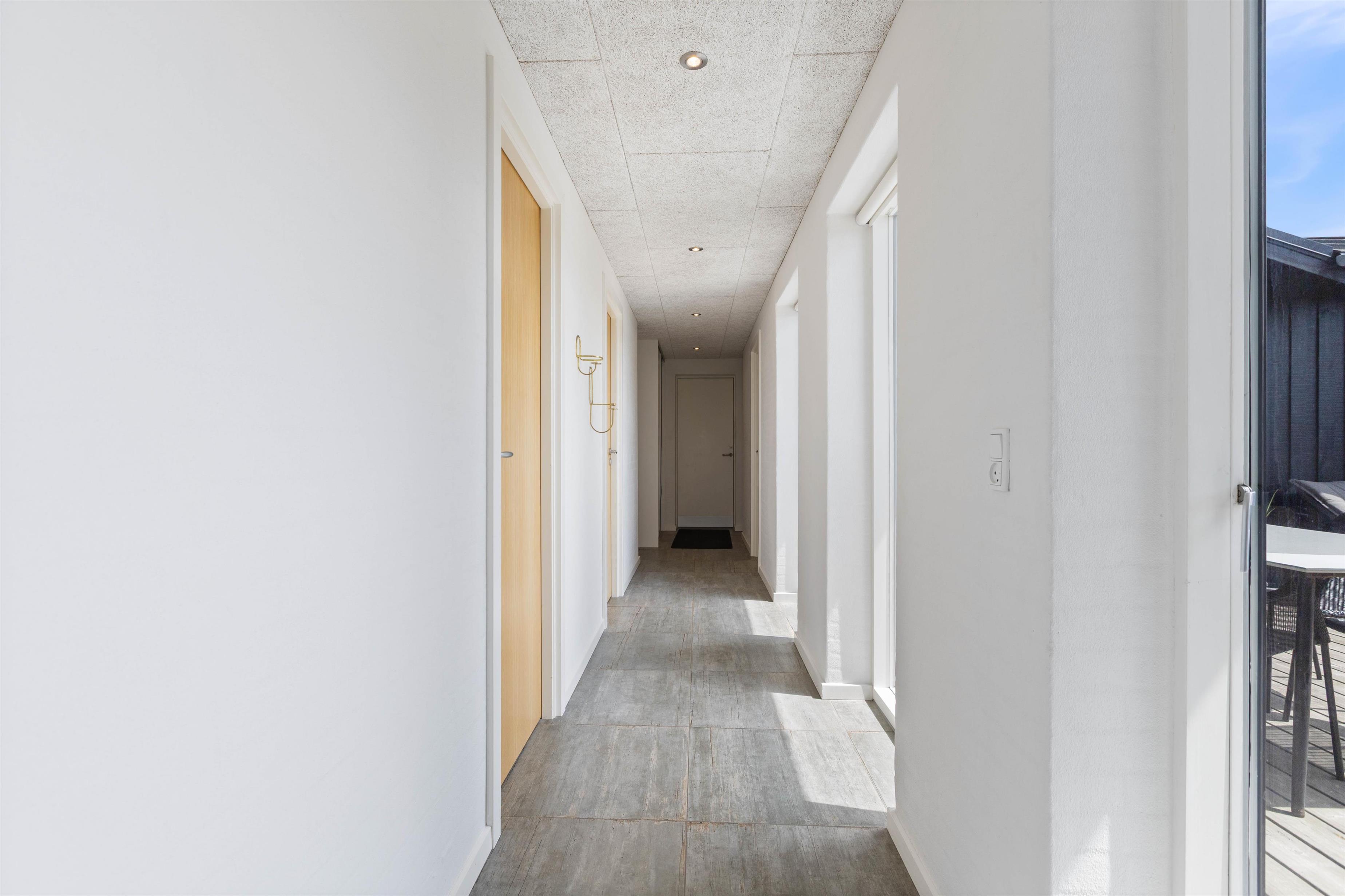 Feriehuset er overalt lyst og smagfuldt indrettet i hyggelig skandinavisk stil, med bl.a. gulvvarme og flotte grå klinkegulve.