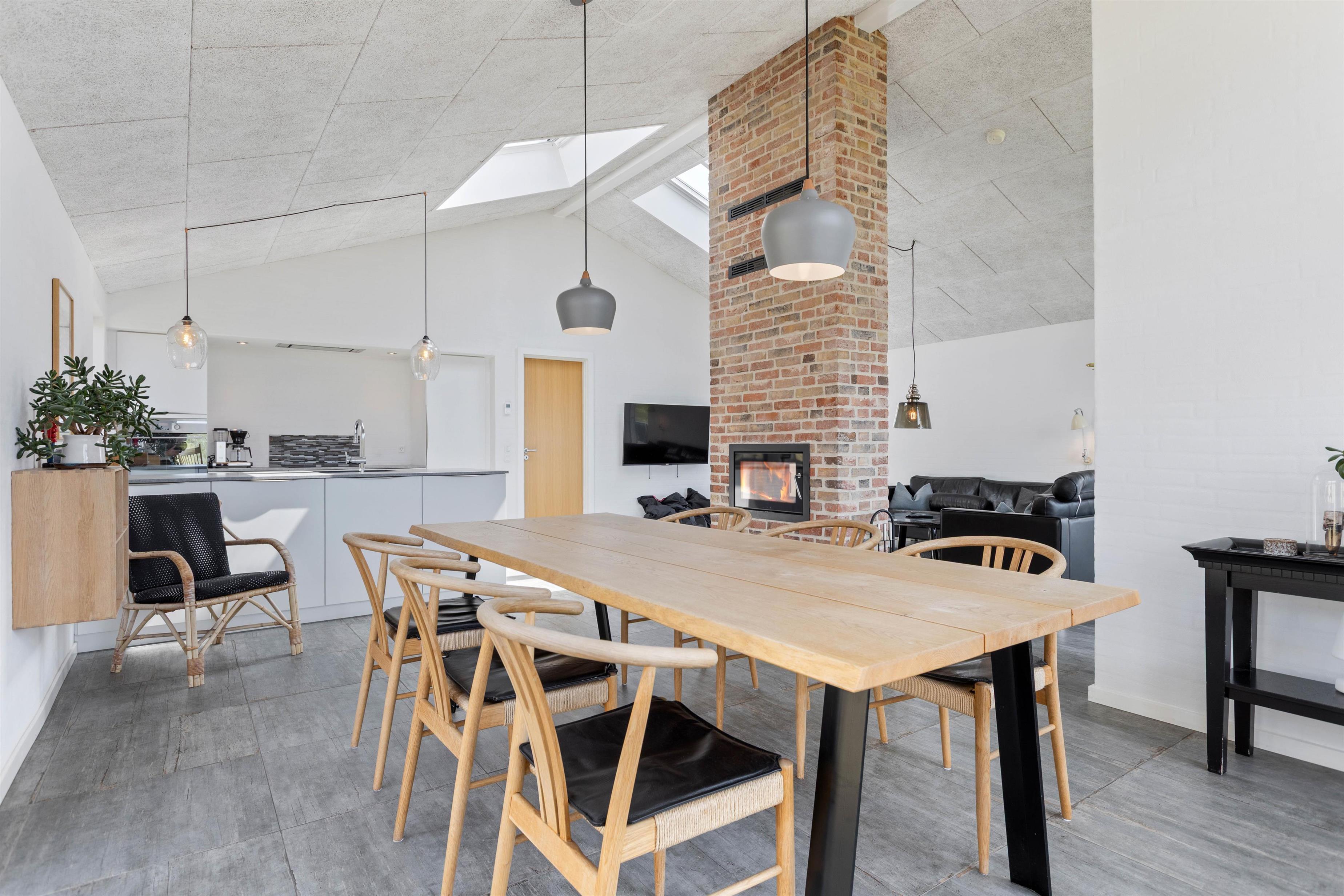 Dette pragtfulde sommerhus er smagfuldt og velindrettet i skandinavisk stil. Husets hjerte er det lyse og åbne køkken-opholdsrum, hvor der er åbent helt op i kip og masser af lysindfald igennem de store vinduespartier og ovenlysvinduer.