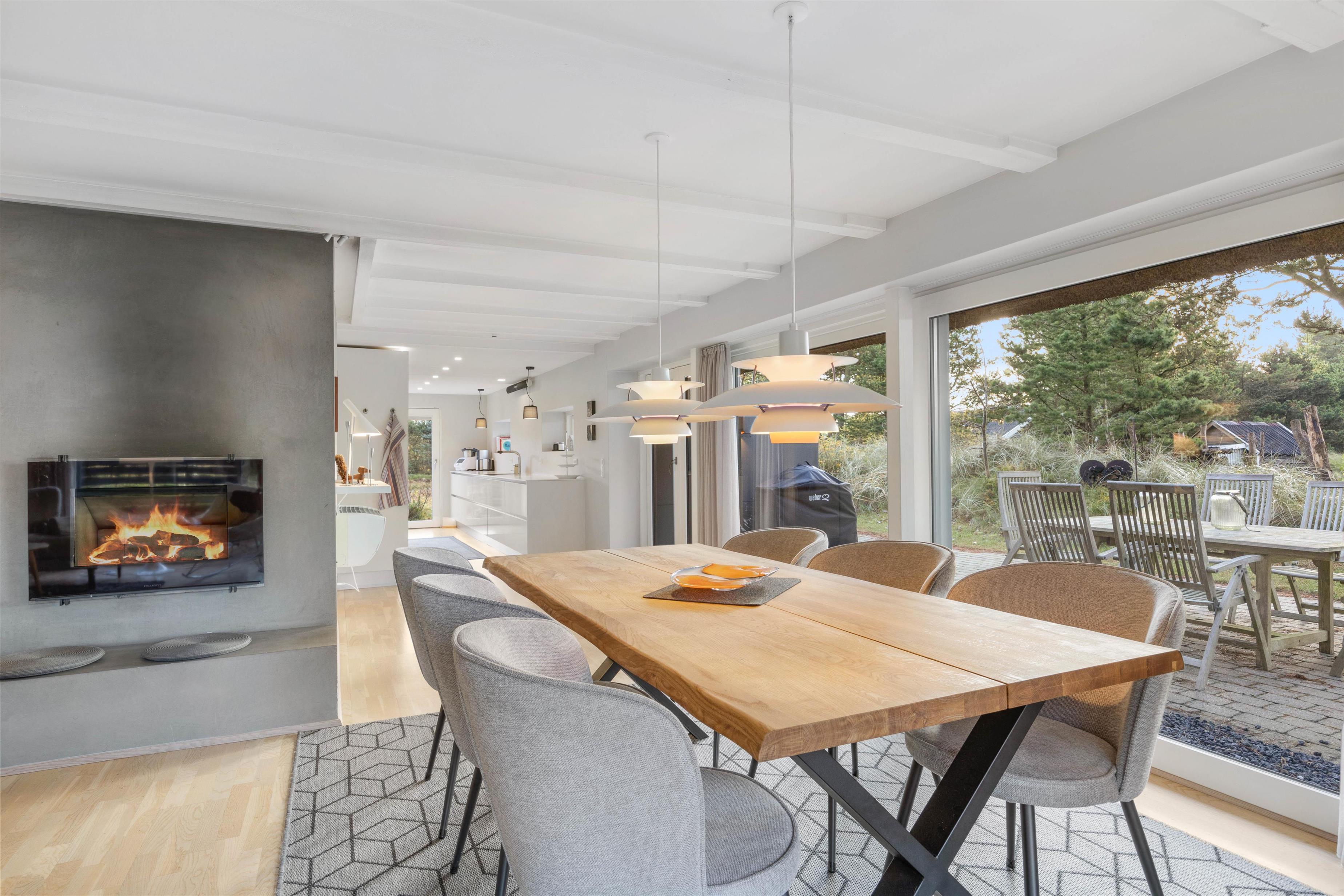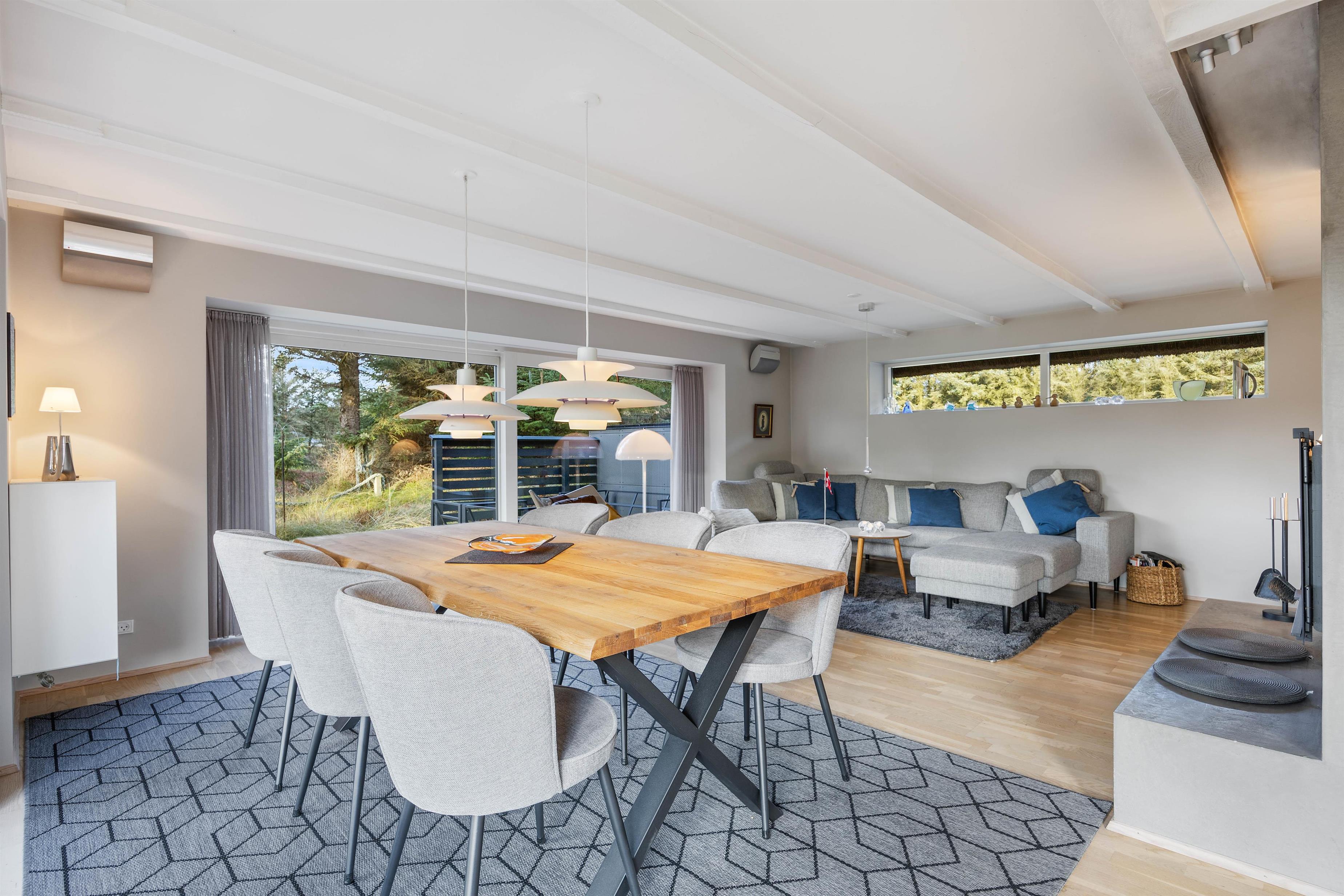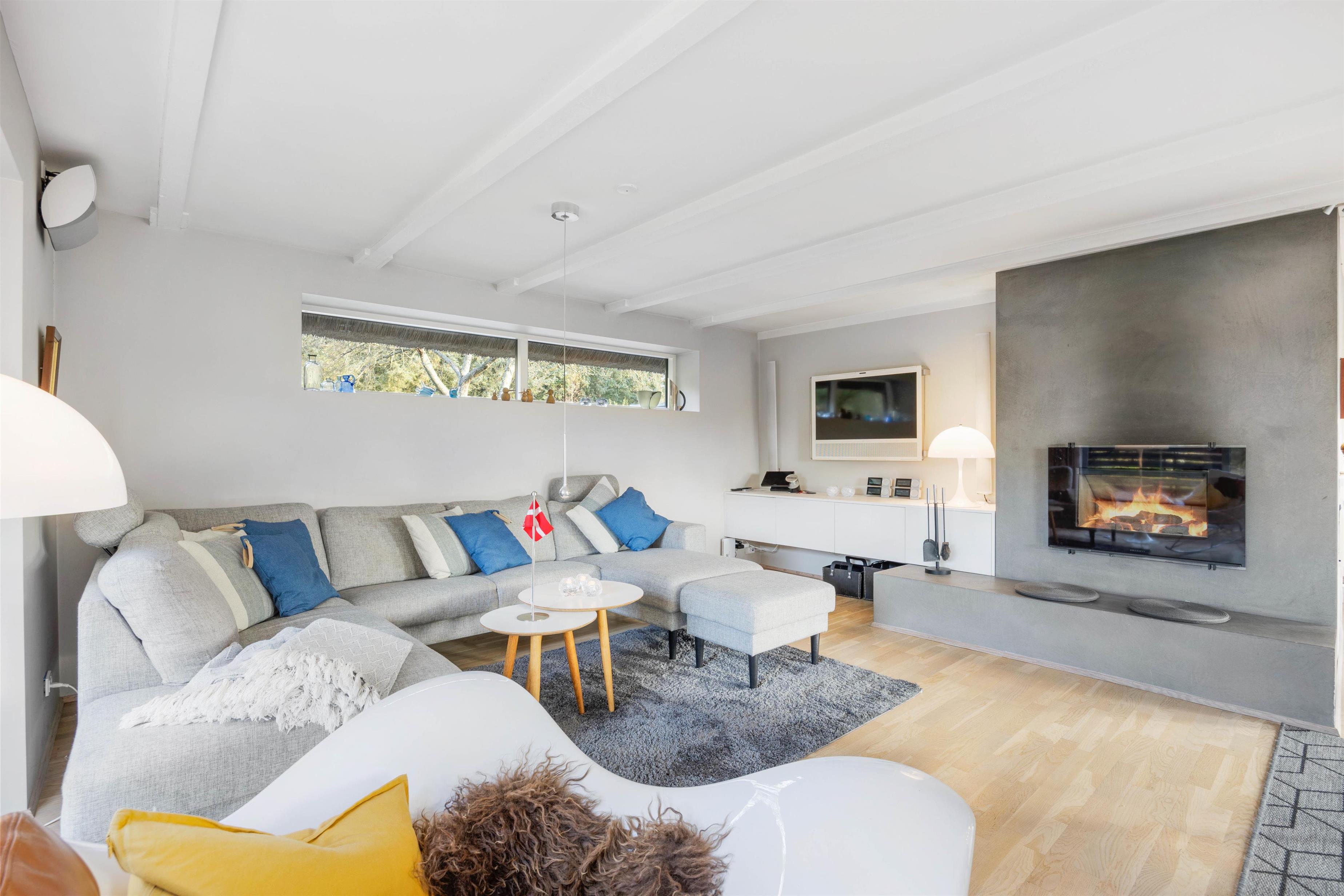 Indenfor byder sommerhuset på en moderne og stilfuld indretning med en rummelig stue med pejseindsats - perfekt til hyggelige aftener. De store vinduer giver et fantastisk lysindfald og en skøn udsigt til den omkringliggende natur.
