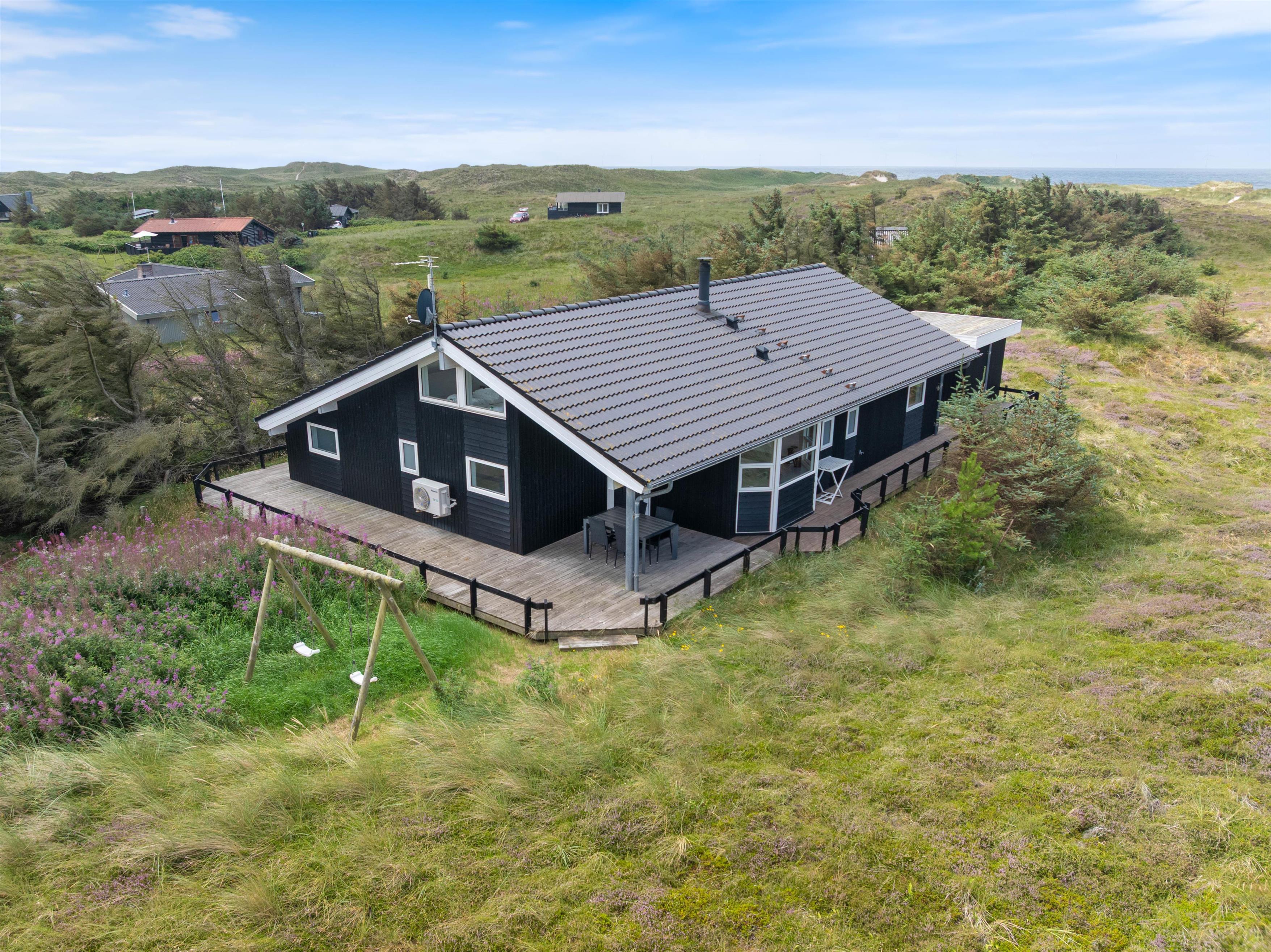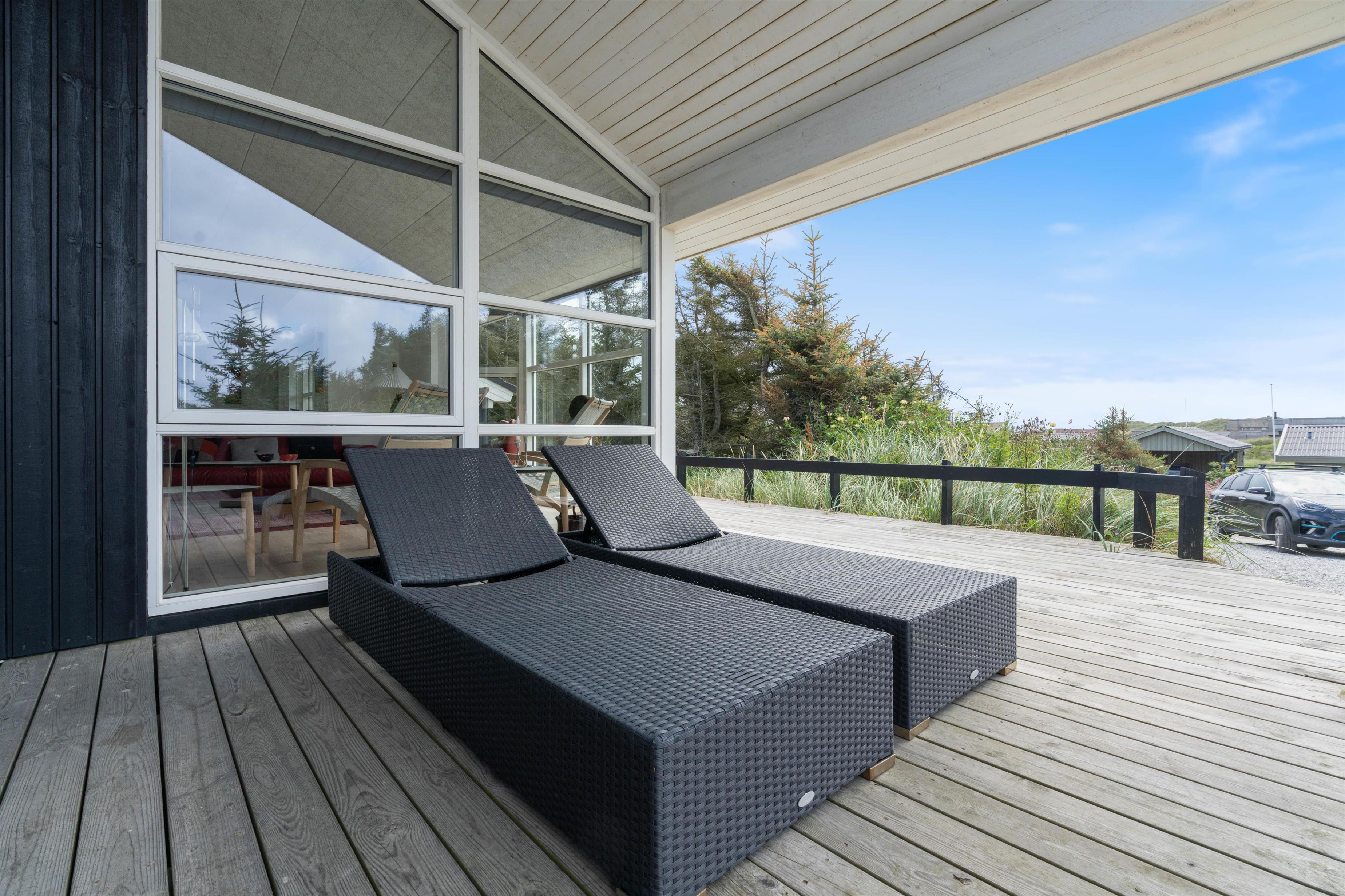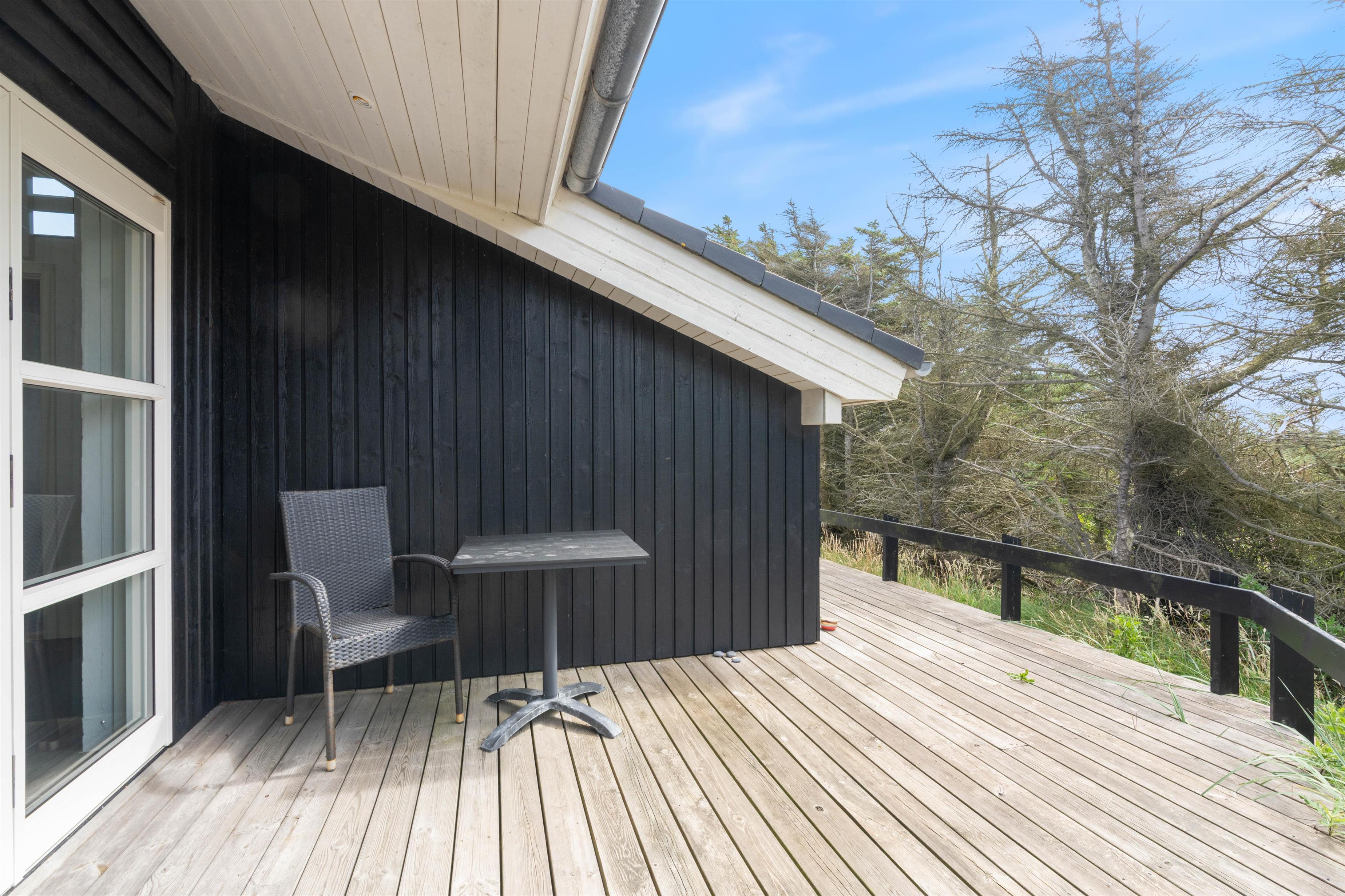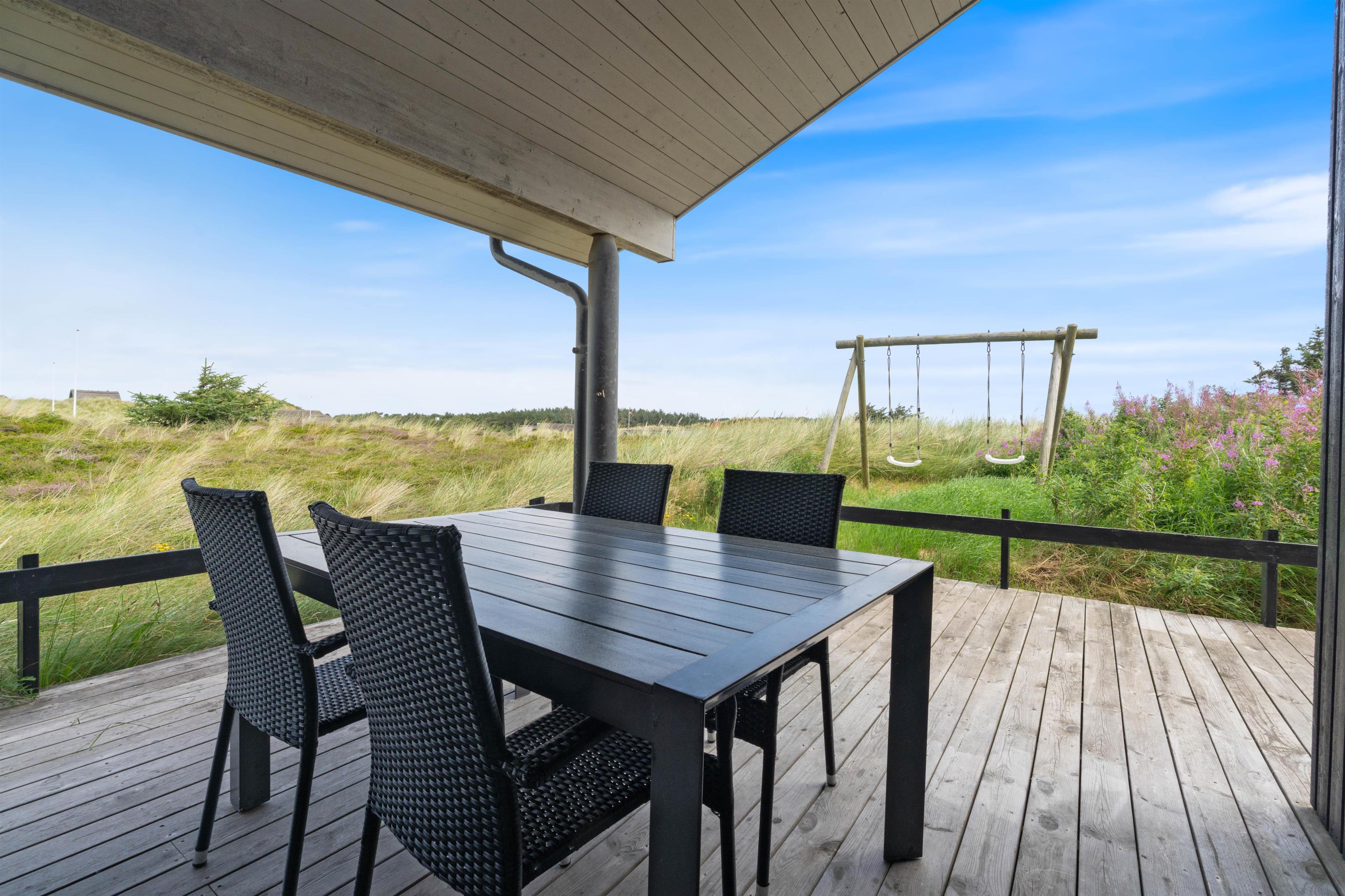 Husets flotte terrasse er virkelig noget for sig. Herfra har du mulighed for at nyde en unik udsigt over de bølgende klitter, der ligger som en dyne over det ellers flade landskab. Huset er bygget med omtanke. Rundt om hele huset er der skabt små kroge, hvor du kan nyde solens stråler. Du har også mulighed for at sidde under den overdækkede terrasse. Her kan de lange sommeraftener forlænges og nydes i selskab med gode venner eller med hele familien.