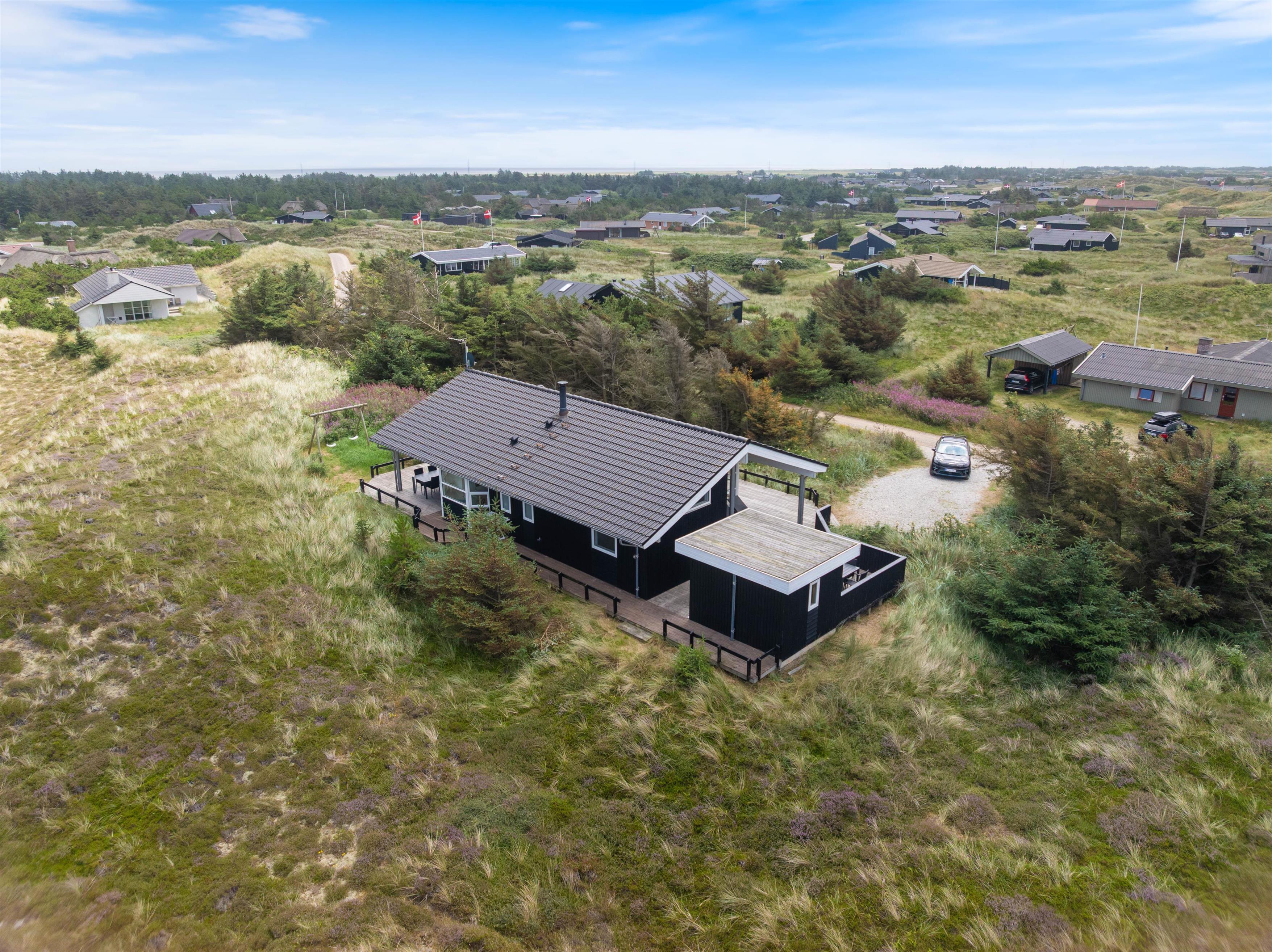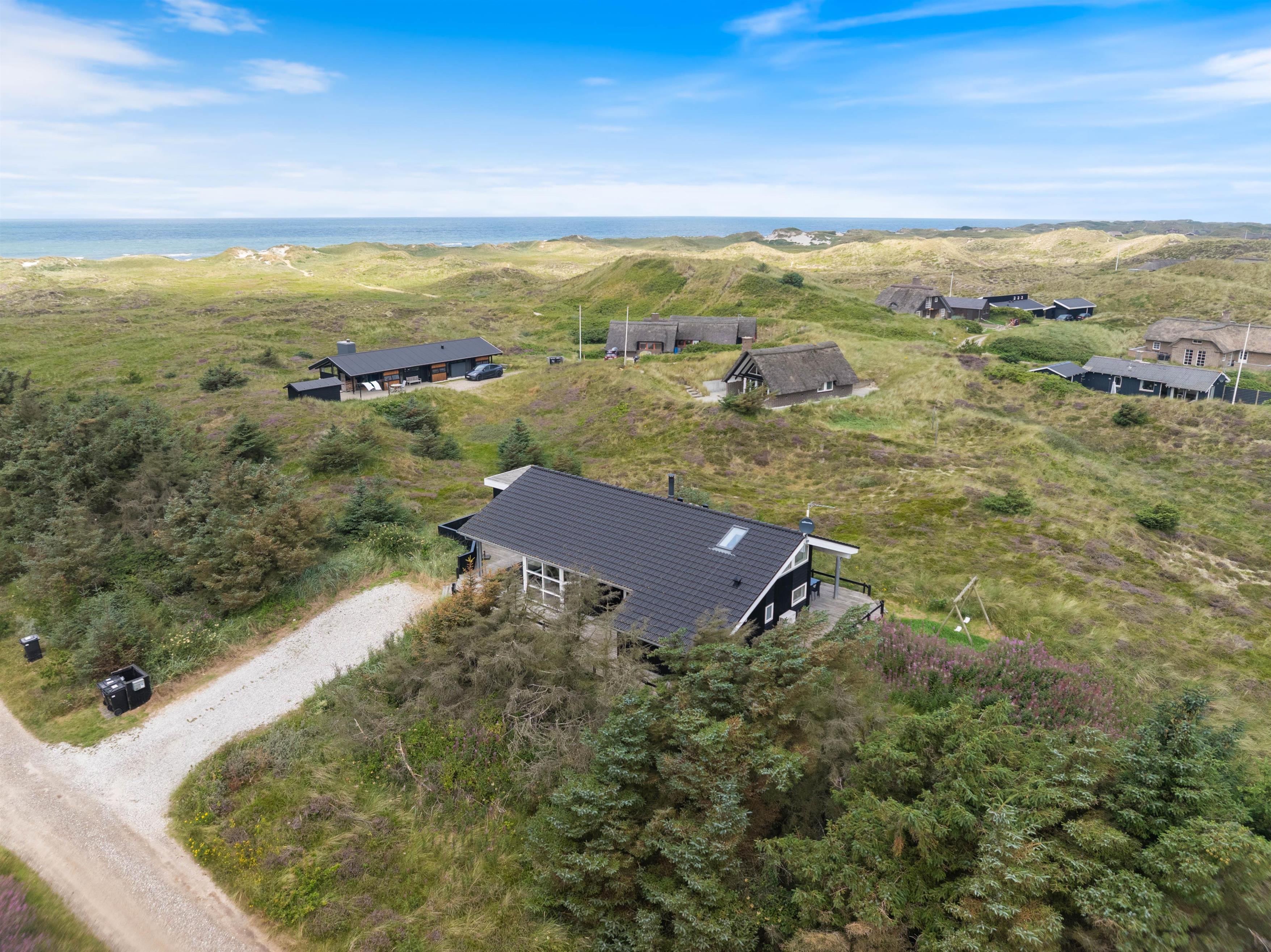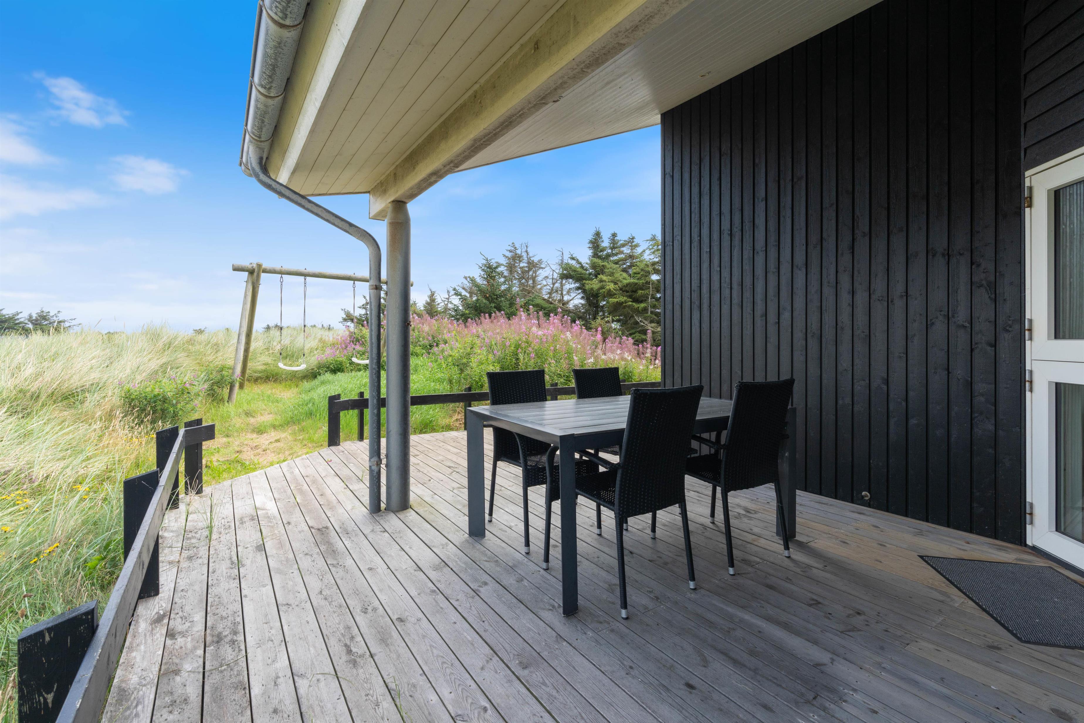 Husets flotte terrasse er virkelig noget for sig. Herfra har du mulighed for at nyde en unik udsigt over de bølgende klitter, der ligger som en dyne over det ellers flade landskab. Huset er bygget med omtanke. Rundt om hele huset er der skabt små kroge, hvor du kan nyde solens stråler. Du har også mulighed for at sidde under den overdækkede terrasse. Her kan de lange sommeraftener forlænges og nydes i selskab med gode venner eller med hele familien.
