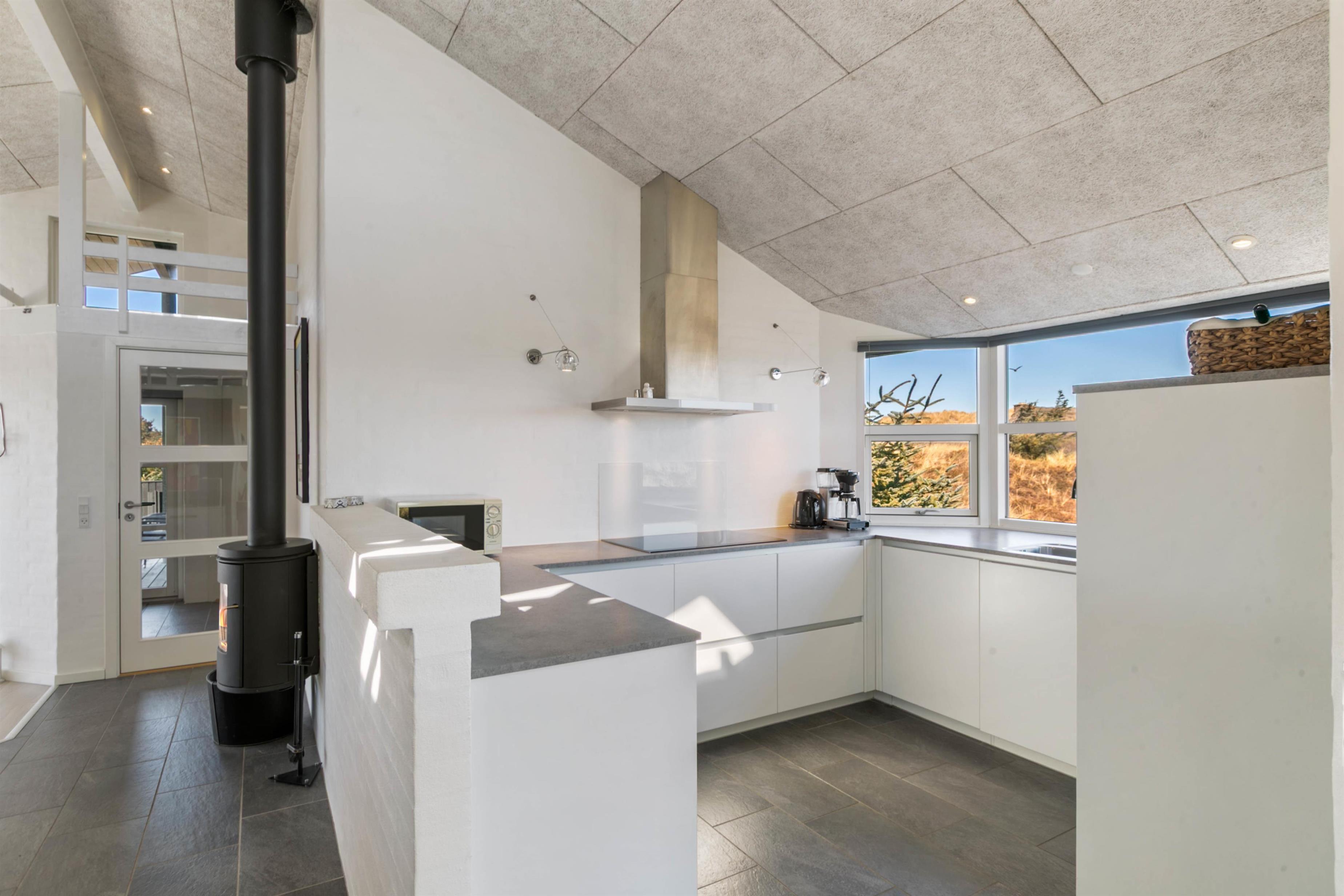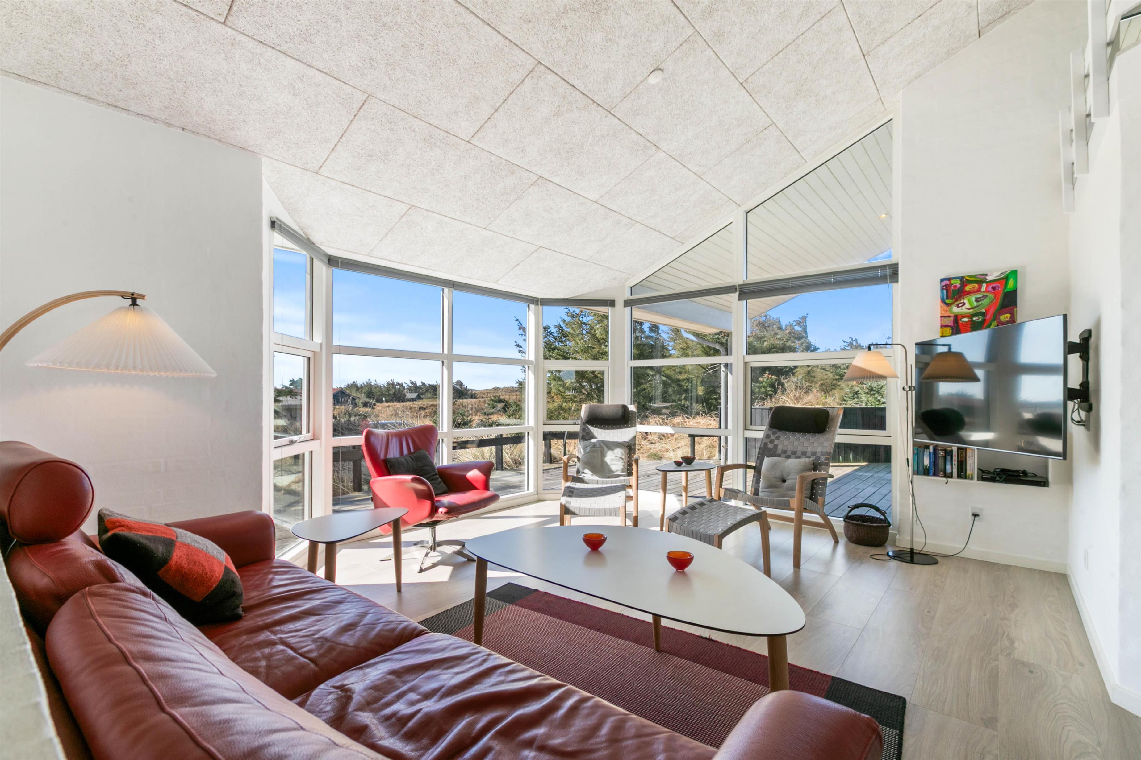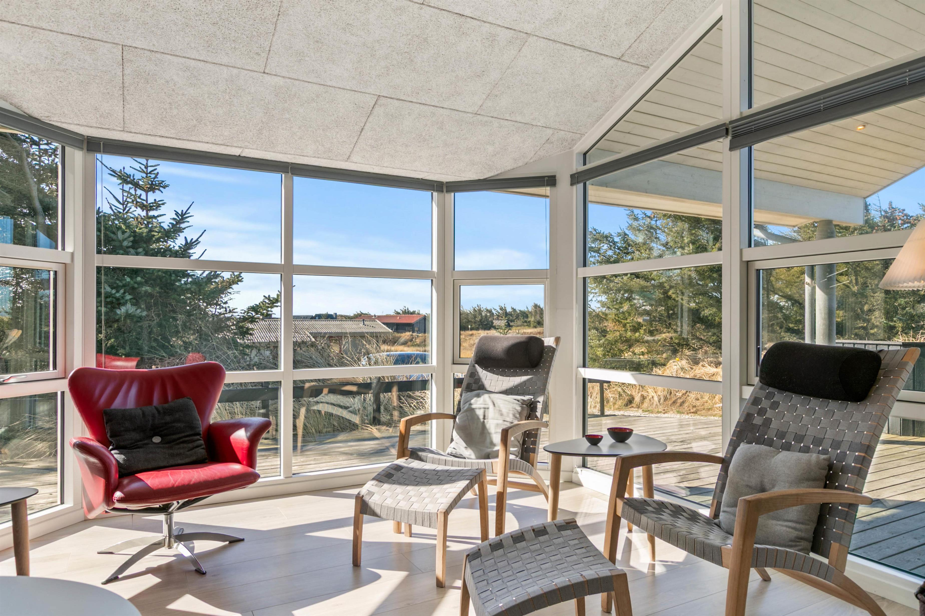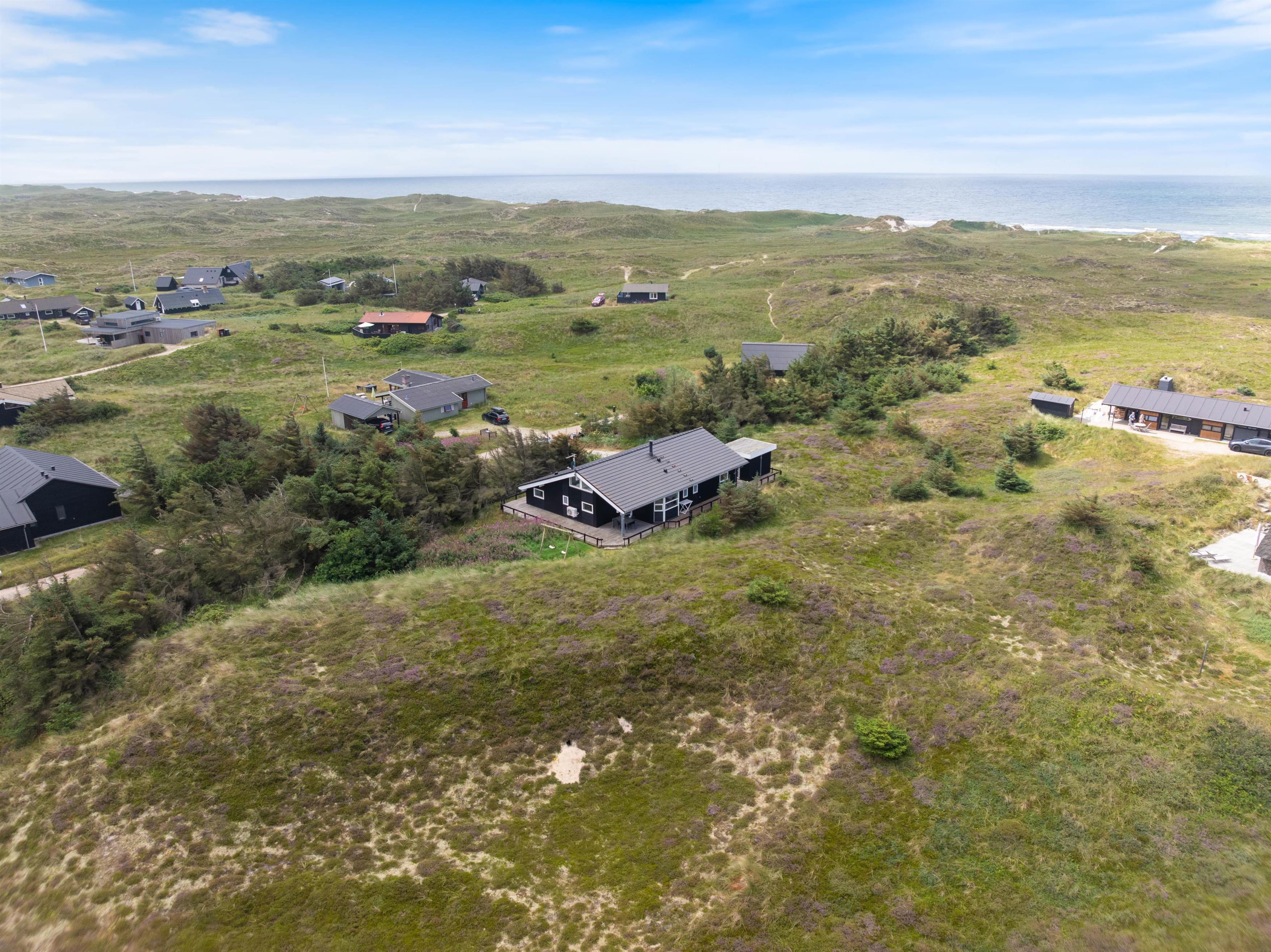Husets flotte terrasse er virkelig noget for sig. Herfra har du mulighed for at nyde en unik udsigt over de bølgende klitter, der ligger som en dyne over det ellers flade landskab. Huset er bygget med omtanke. Rundt om hele huset er der skabt små kroge, hvor du kan nyde solens stråler. Du har også mulighed for at sidde under den overdækkede terrasse. Her kan de lange sommeraftener forlænges og nydes i selskab med gode venner eller med hele familien.