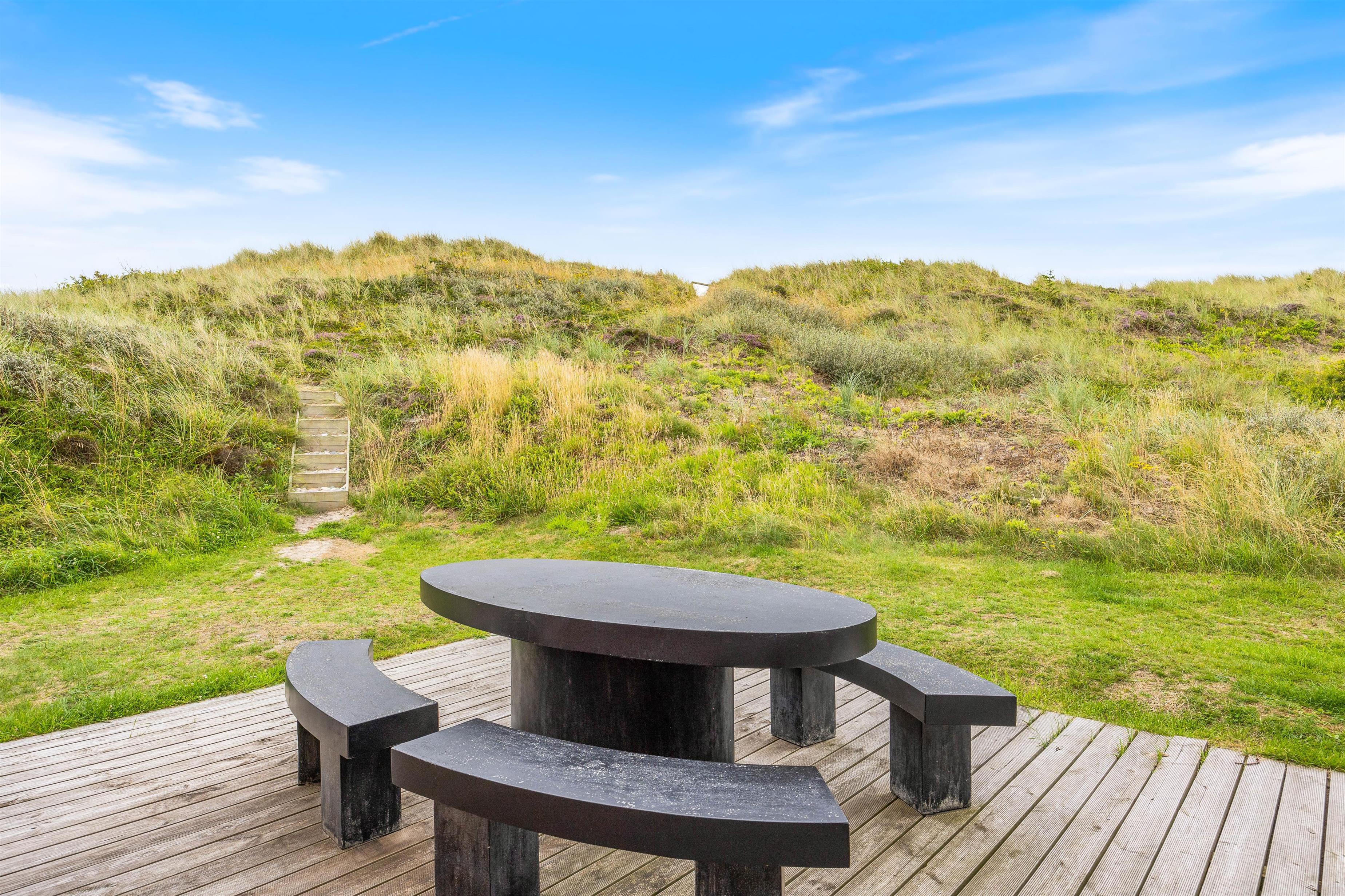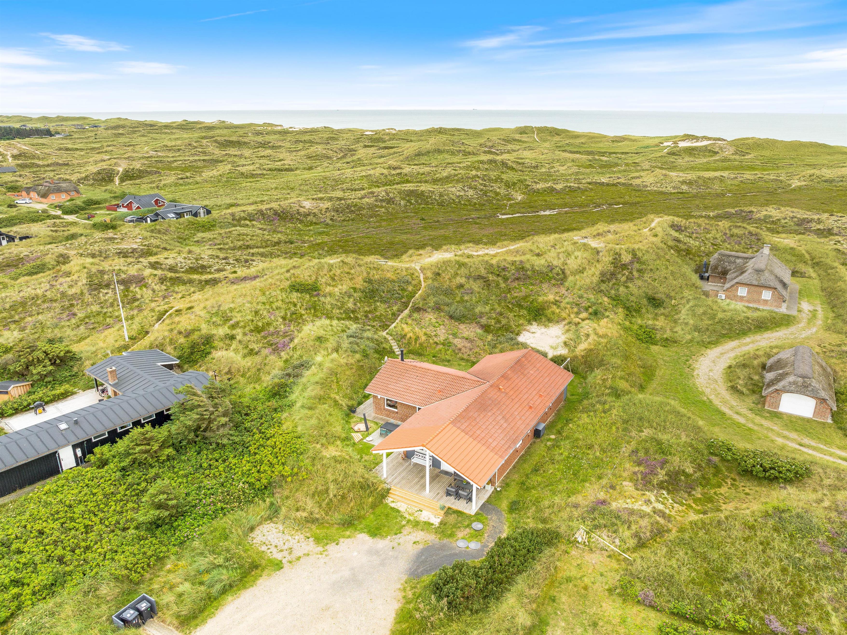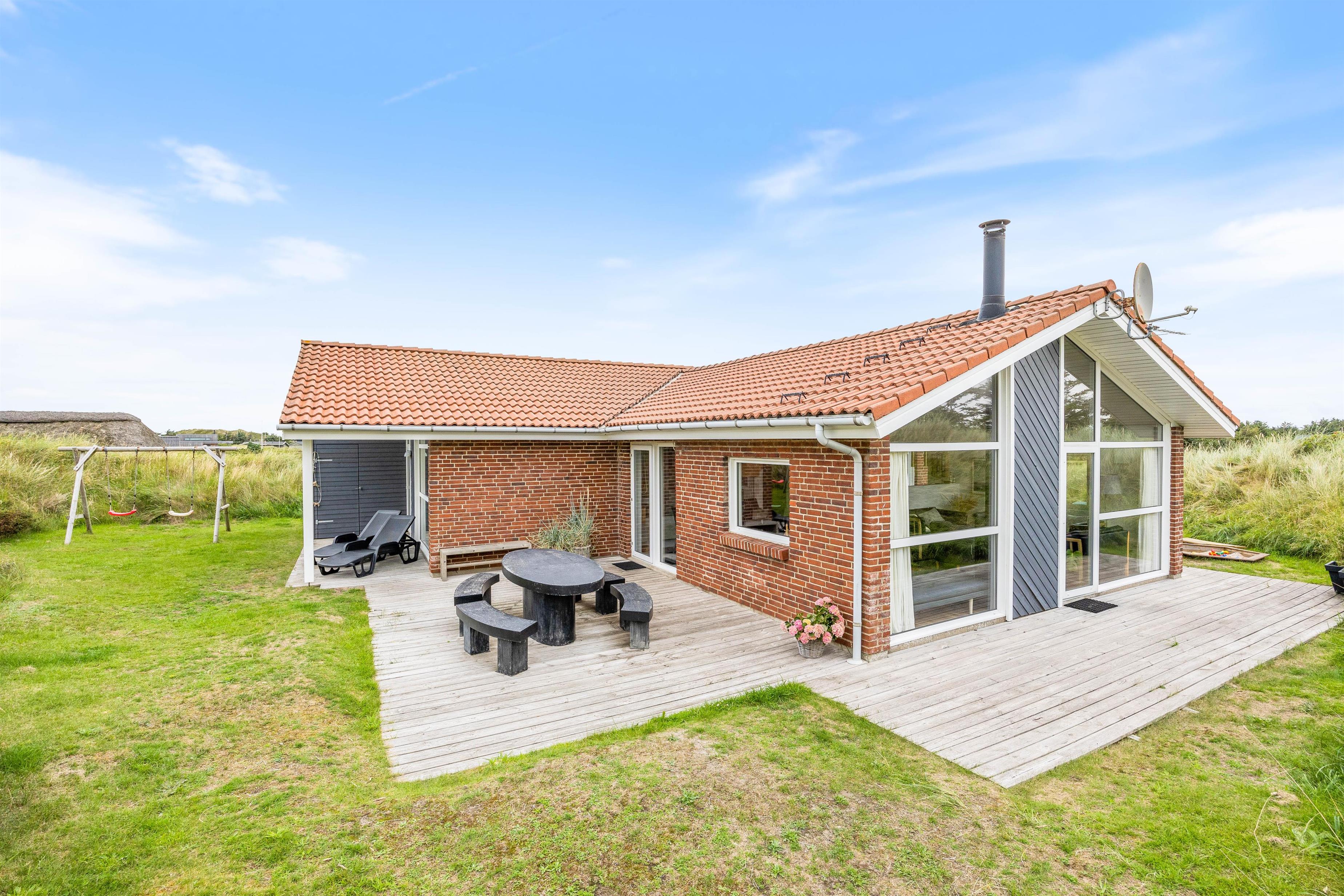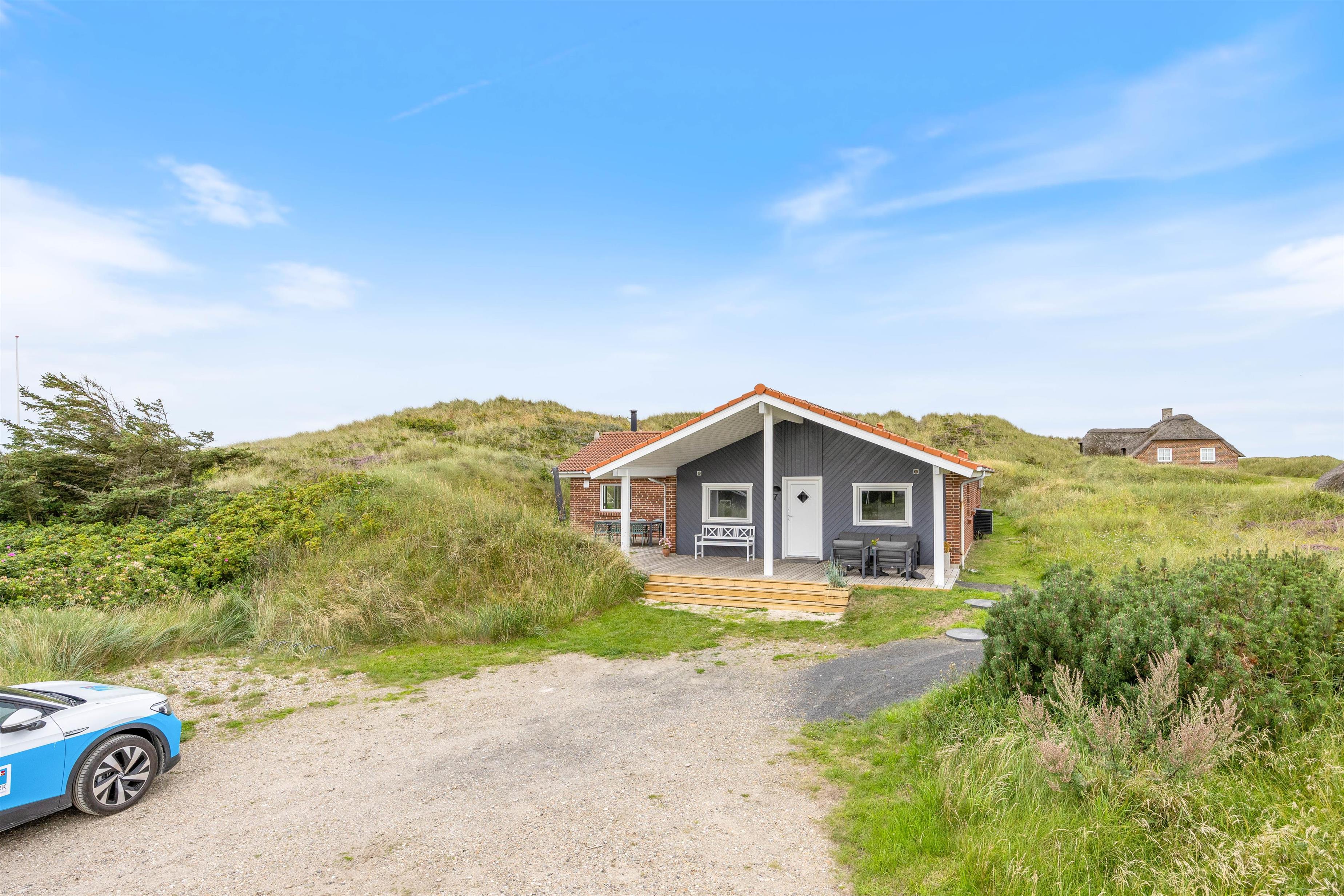 De store vinduer i husets gavl inviterer både lys og det omkringliggende vestjyske landskab indenfor. Og det er noget nær umuligt ikke at blive henført af den smukke natur udenfor, hvor det kuperede klitlandskab og de majestætisk knejsende græsser udgør scenariet. Denne udsigt kan også nydes på den store terrasse, der er som skabt til hyggelige stunder med bøffer på grillen eller solbadning.