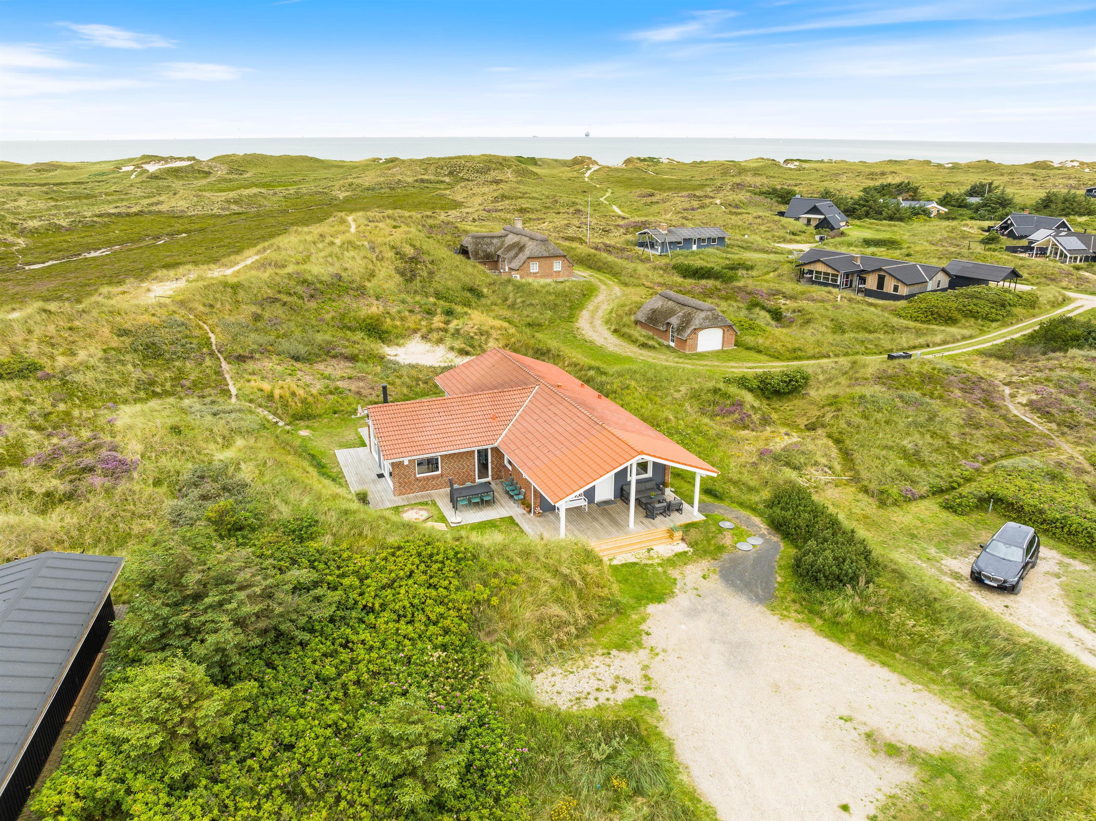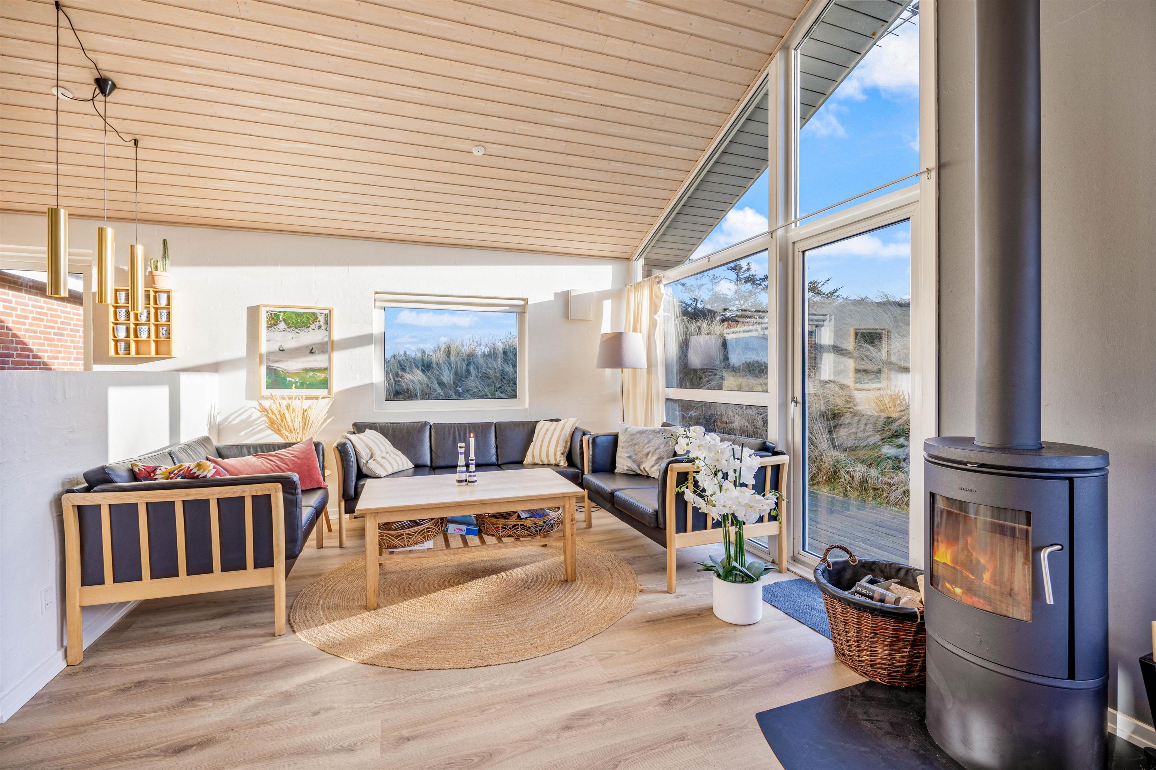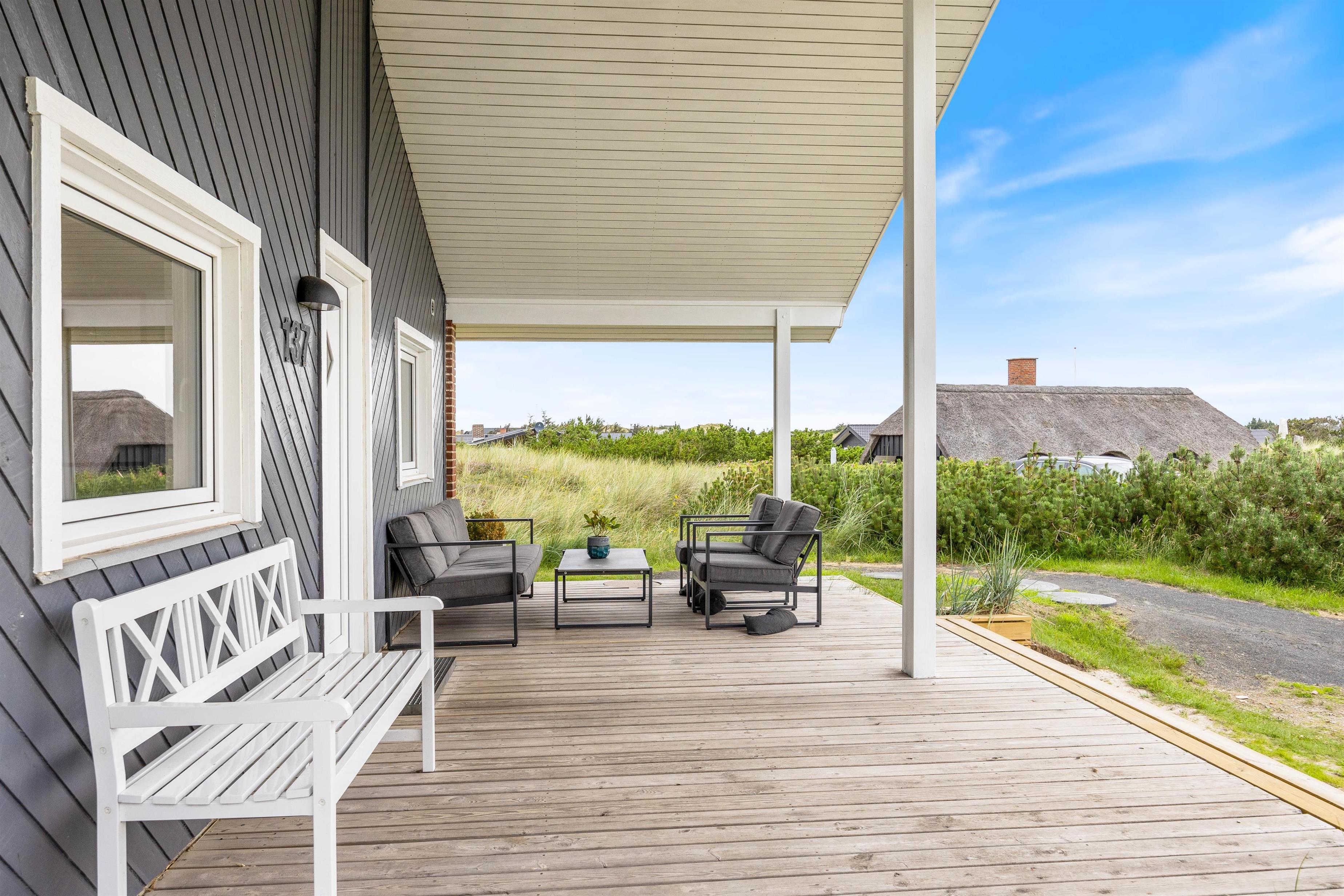 De store vinduer i husets gavl inviterer både lys og det omkringliggende vestjyske landskab indenfor. Og det er noget nær umuligt ikke at blive henført af den smukke natur udenfor, hvor det kuperede klitlandskab og de majestætisk knejsende græsser udgør scenariet. Denne udsigt kan også nydes på den store terrasse, der er som skabt til hyggelige stunder med bøffer på grillen eller solbadning.