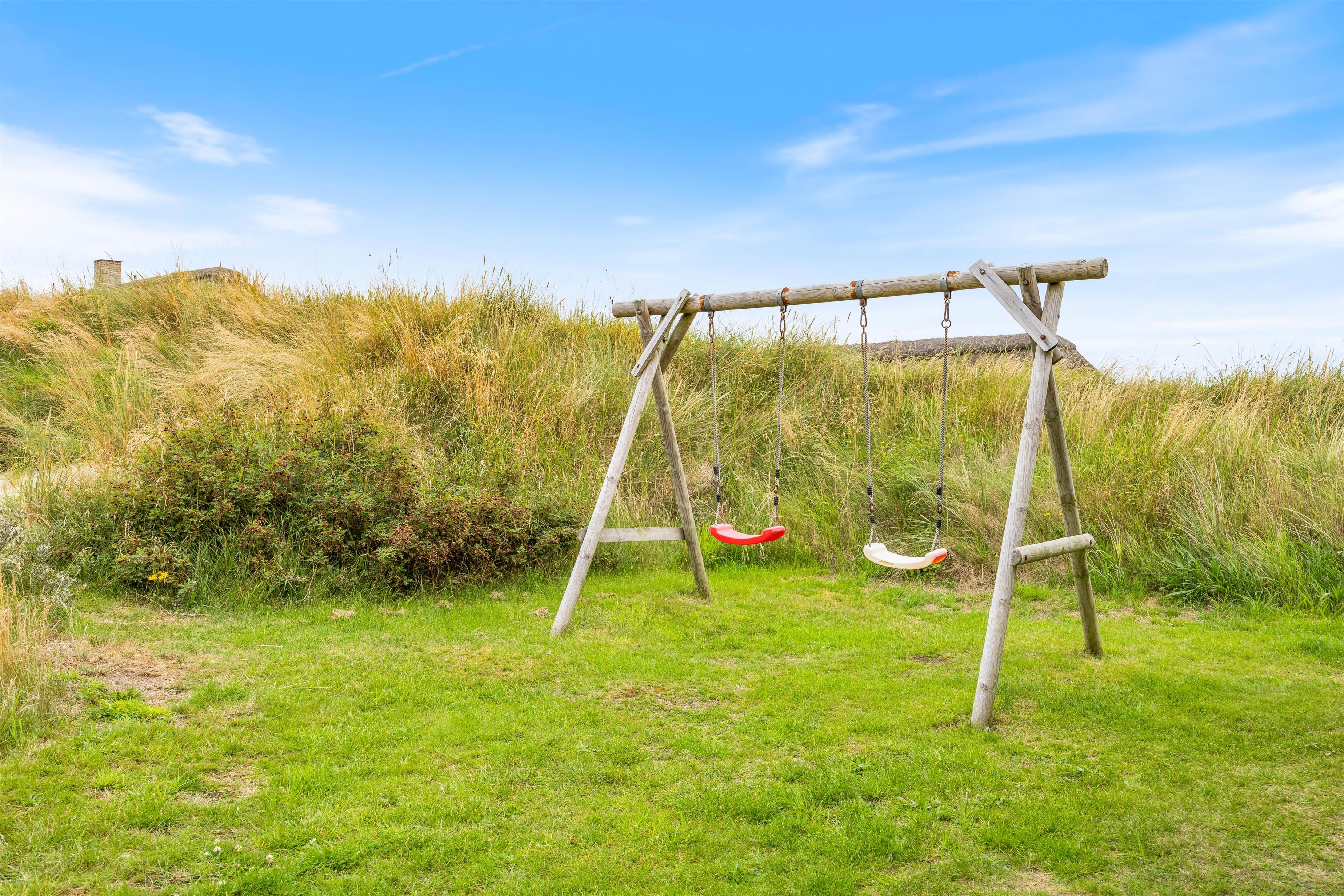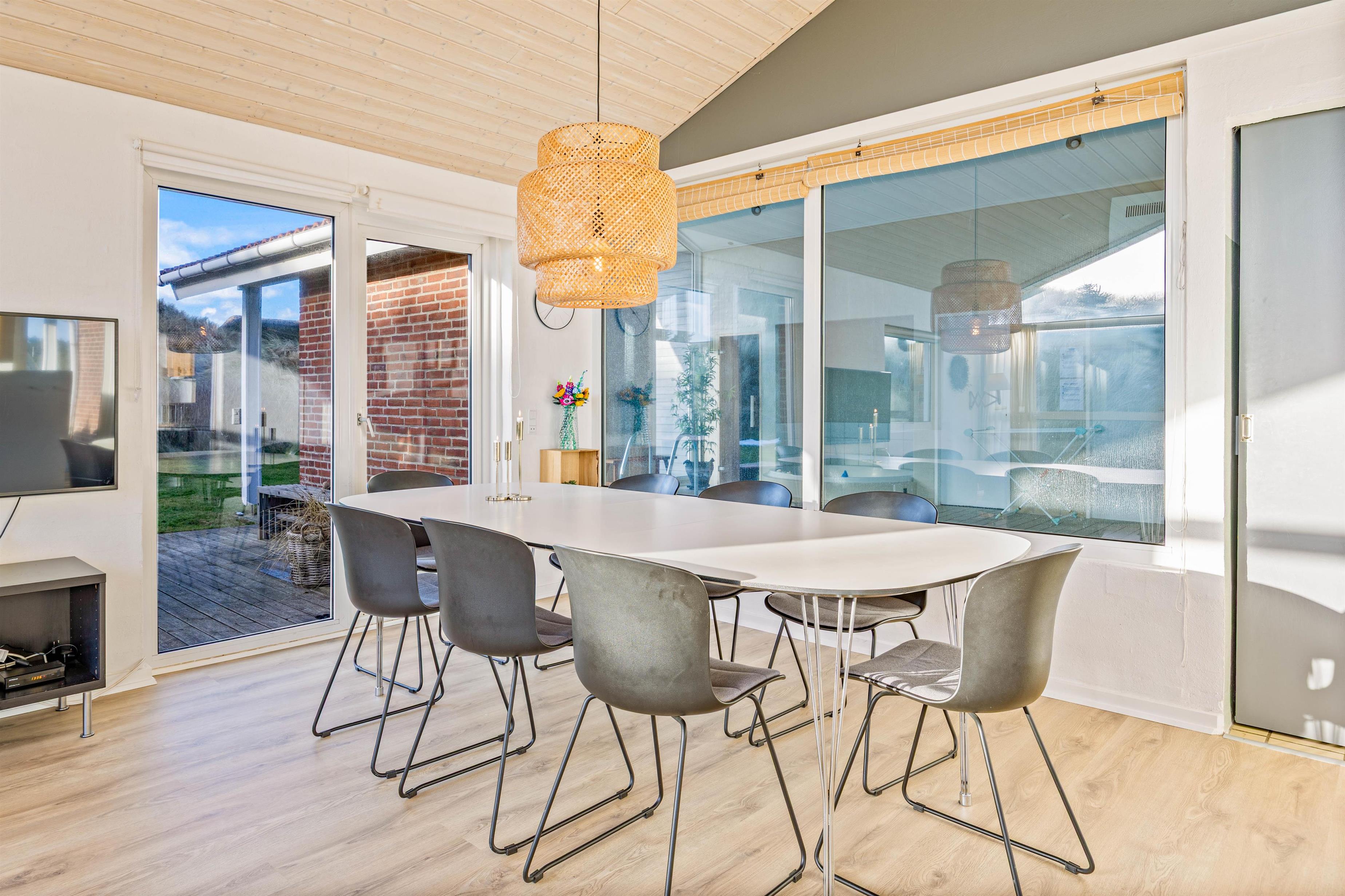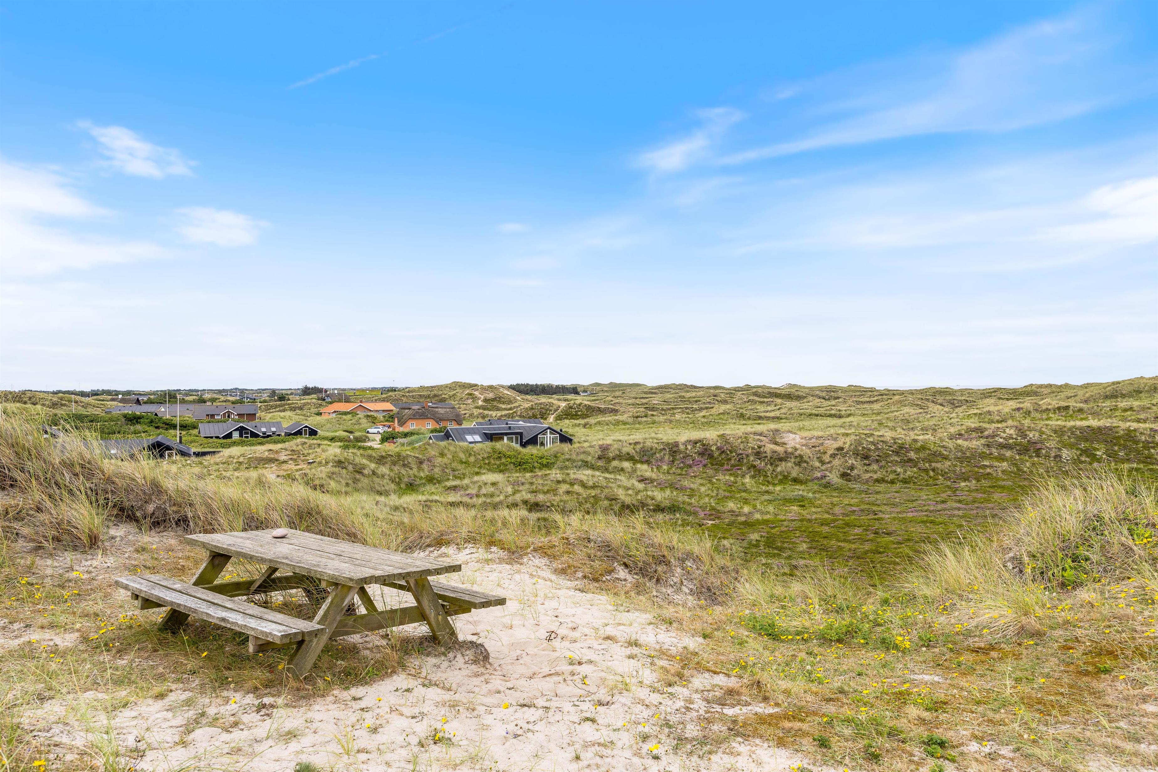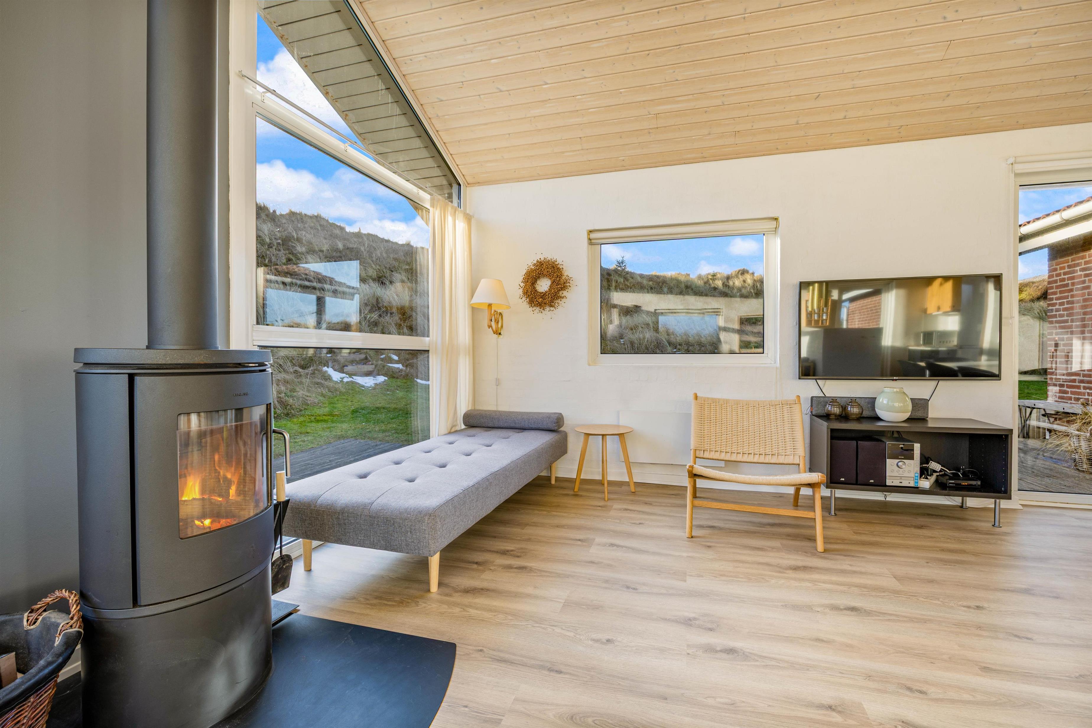 De store vinduer i husets gavl inviterer både lys og det omkringliggende vestjyske landskab indenfor. Og det er noget nær umuligt ikke at blive henført af den smukke natur udenfor, hvor det kuperede klitlandskab og de majestætisk knejsende græsser udgør scenariet. Denne udsigt kan også nydes på den store terrasse, der er som skabt til hyggelige stunder med bøffer på grillen eller solbadning.