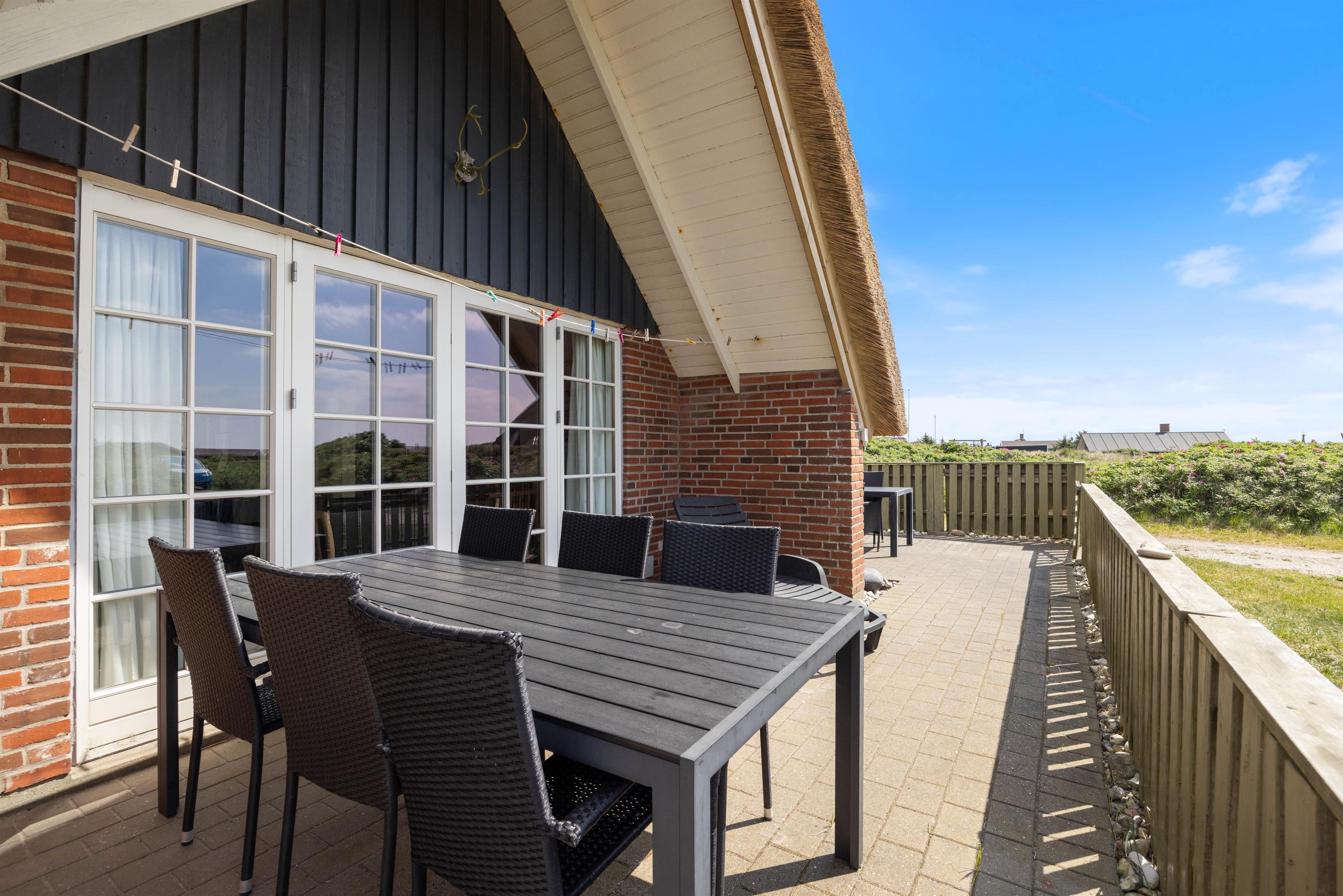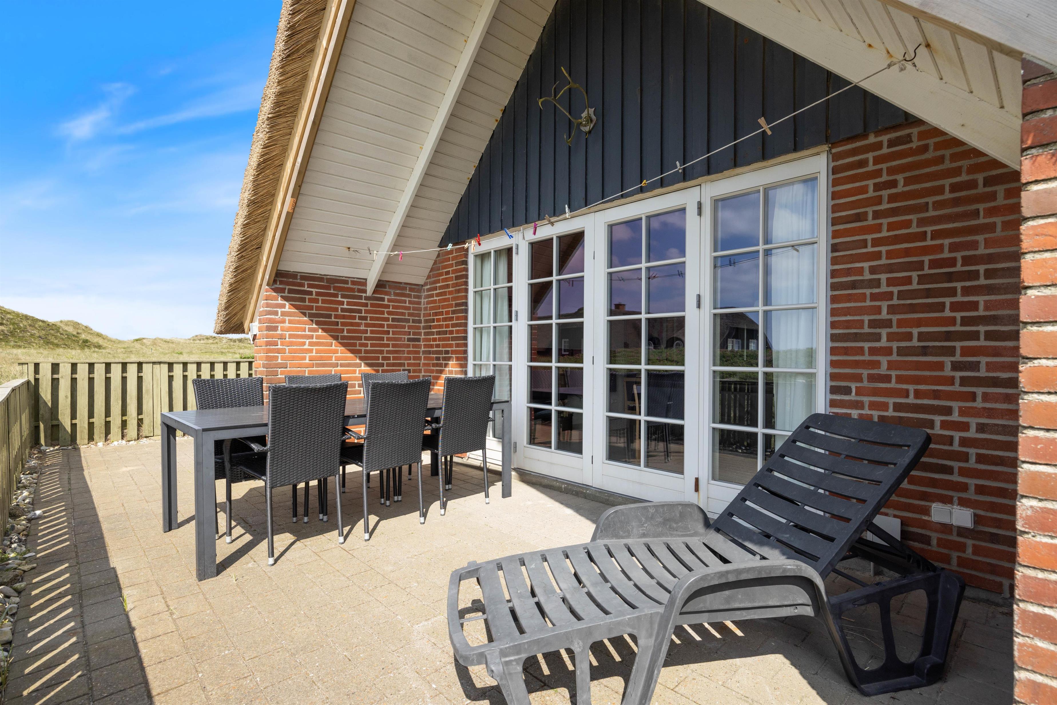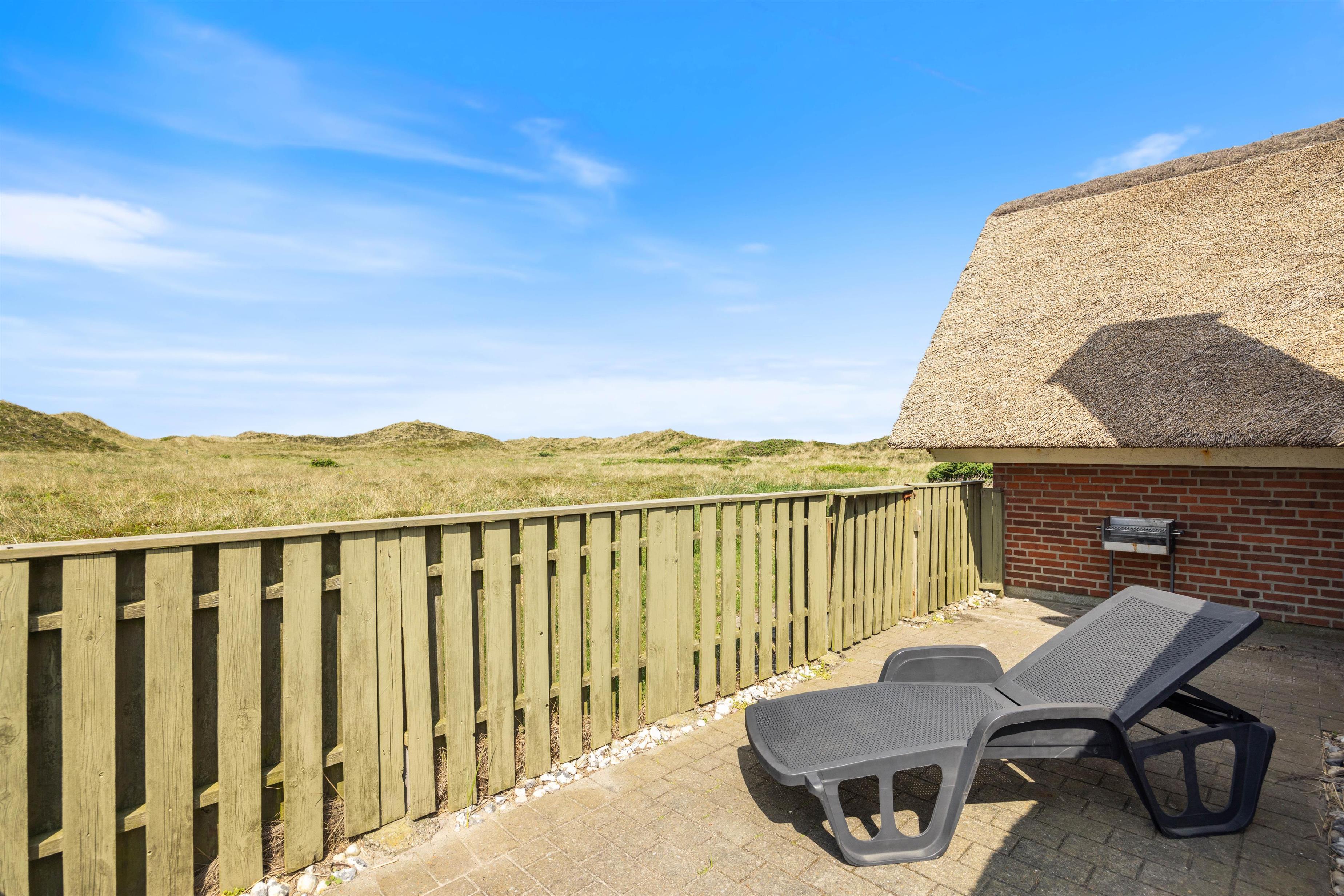 Der er en rigtig skøn og stor lukket terrasse tilhørende dette sommerhus. Den strækker sig omkring huset mod øst, mod syd og mod vest. For familier med børn og hund er den helt ideel. Udsigten er skøn, og den store klit mod nord danner læ når vinden kommer fra nordvest. Det er tilladt at medbringe 2 hunde i dette sommerhus. Og Vesterhavet ligger kun 150 m fra huset, så man kan tydeligt høre havets brusen fra terrassen. På naturgrunden er der en gynge og en sandkasse.