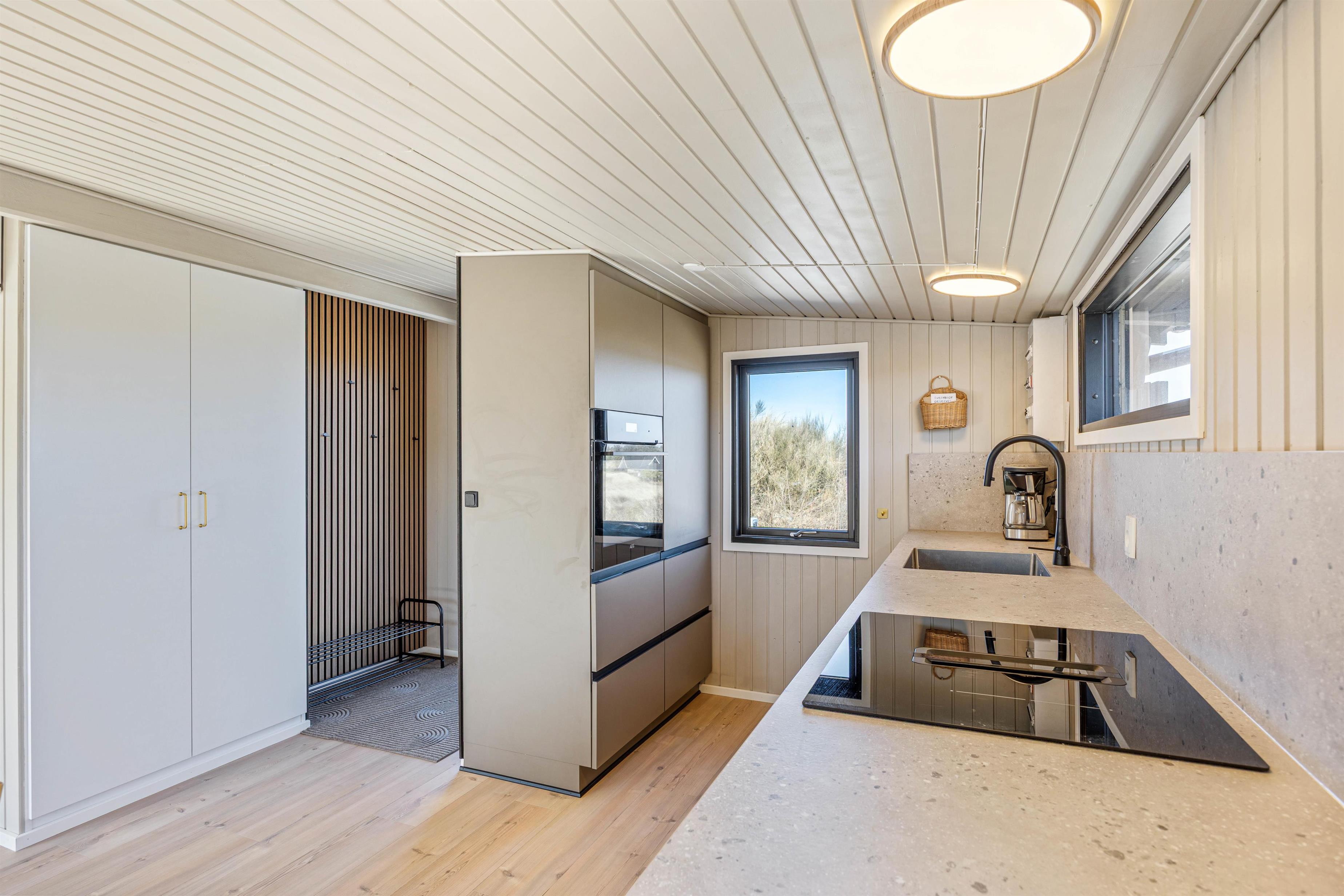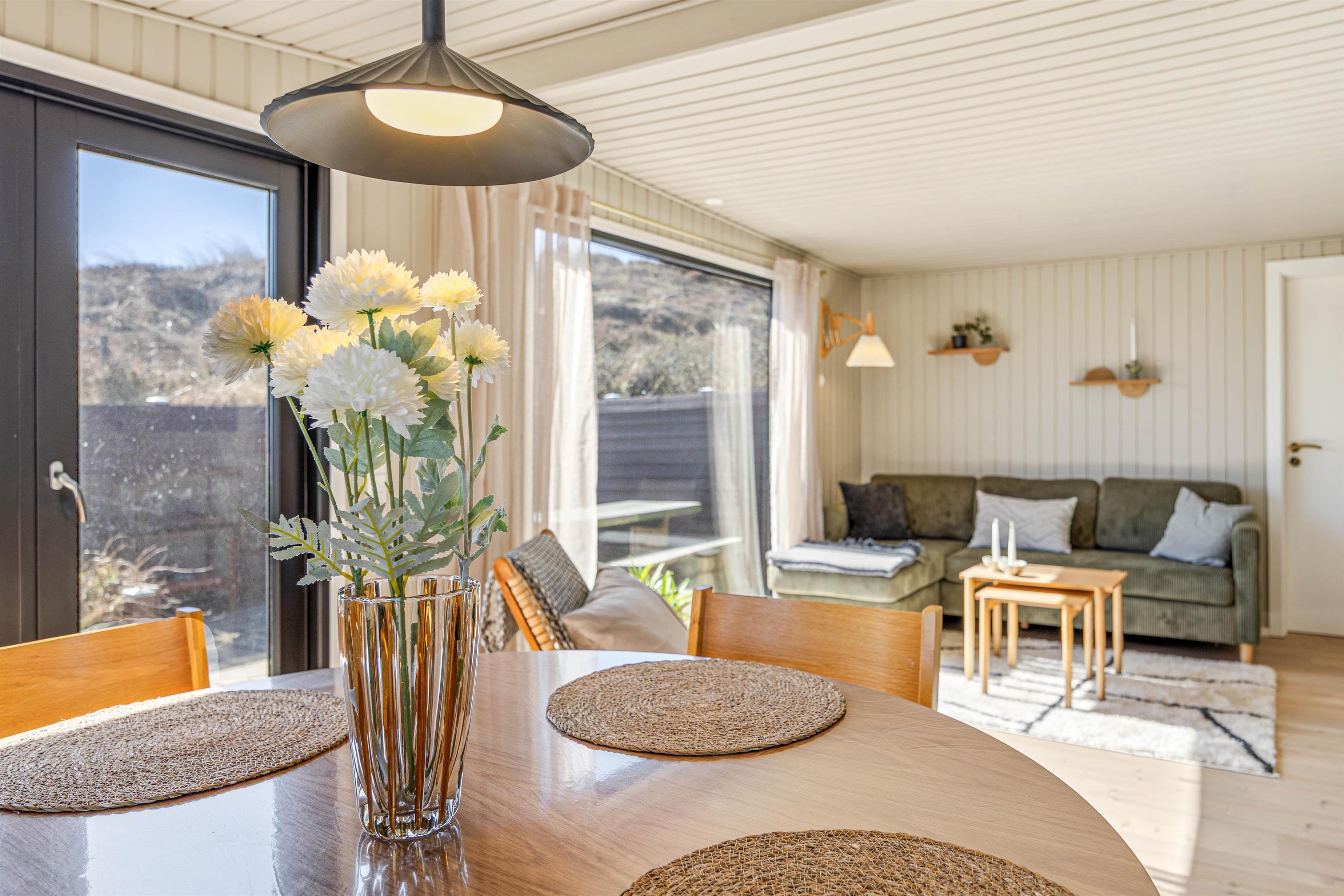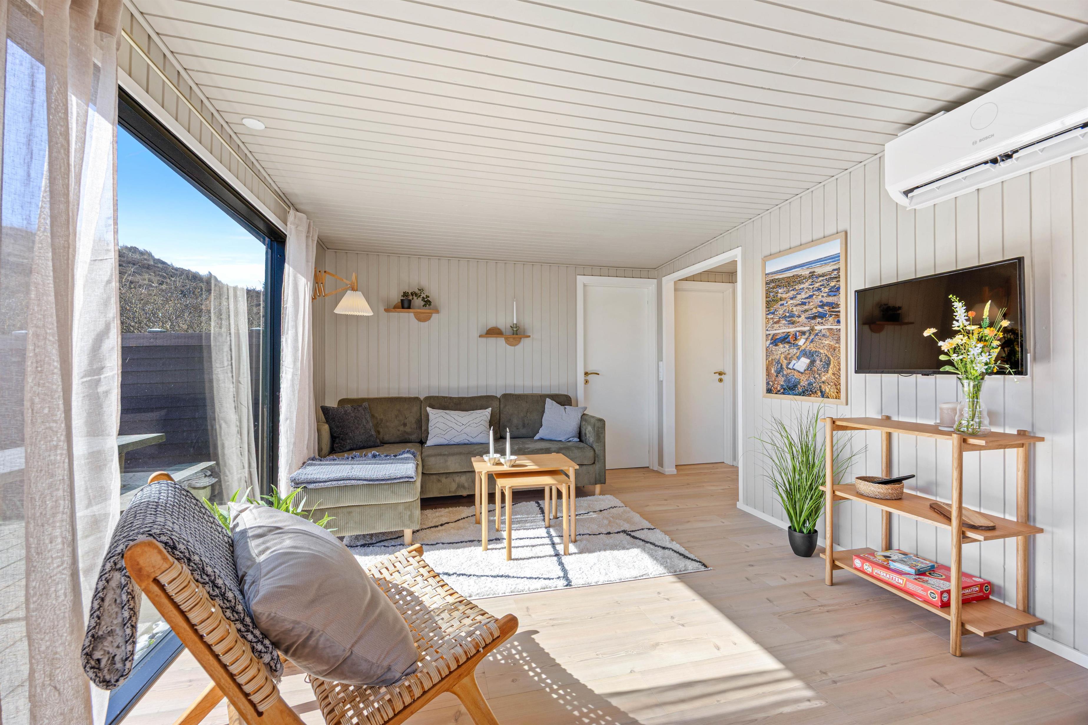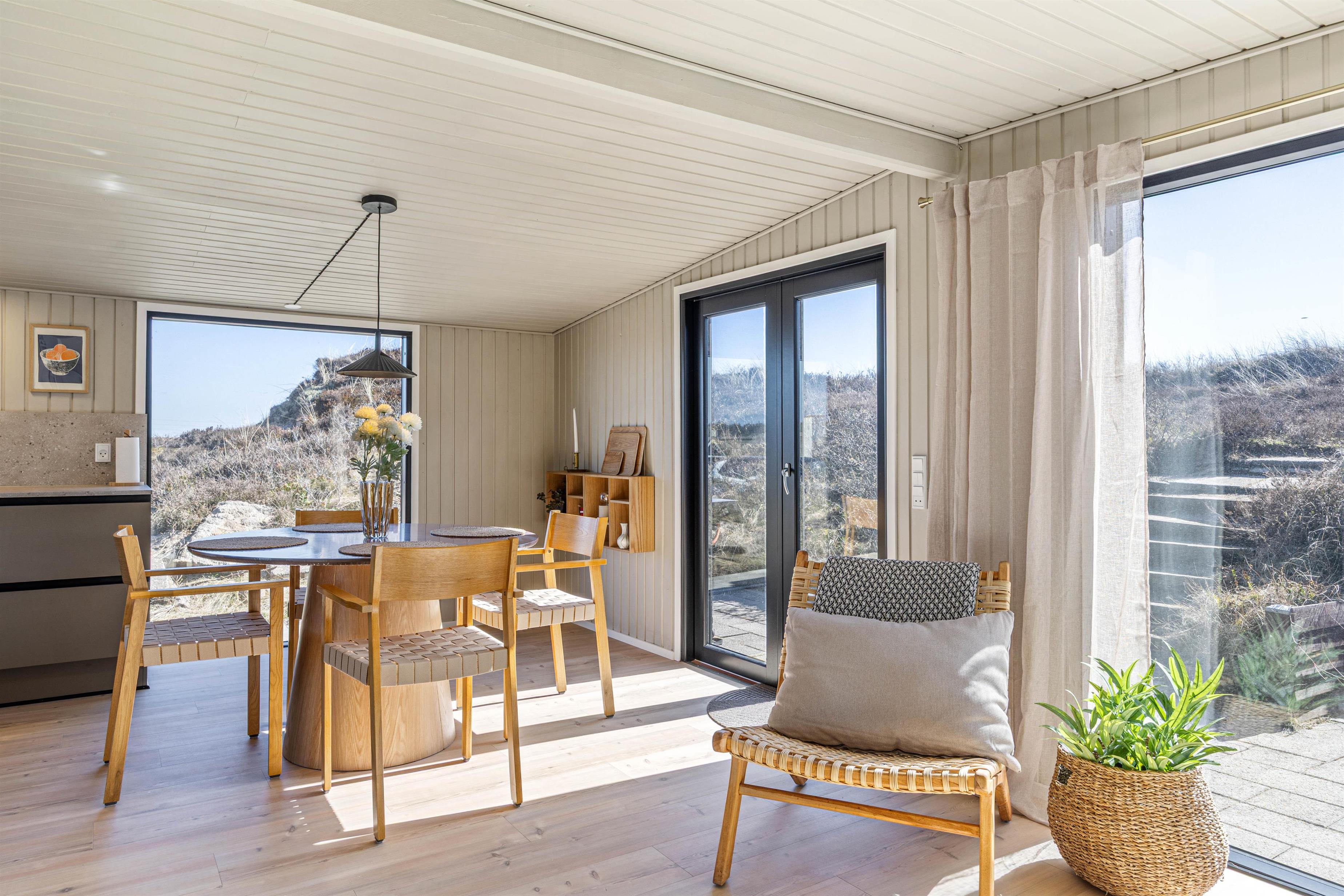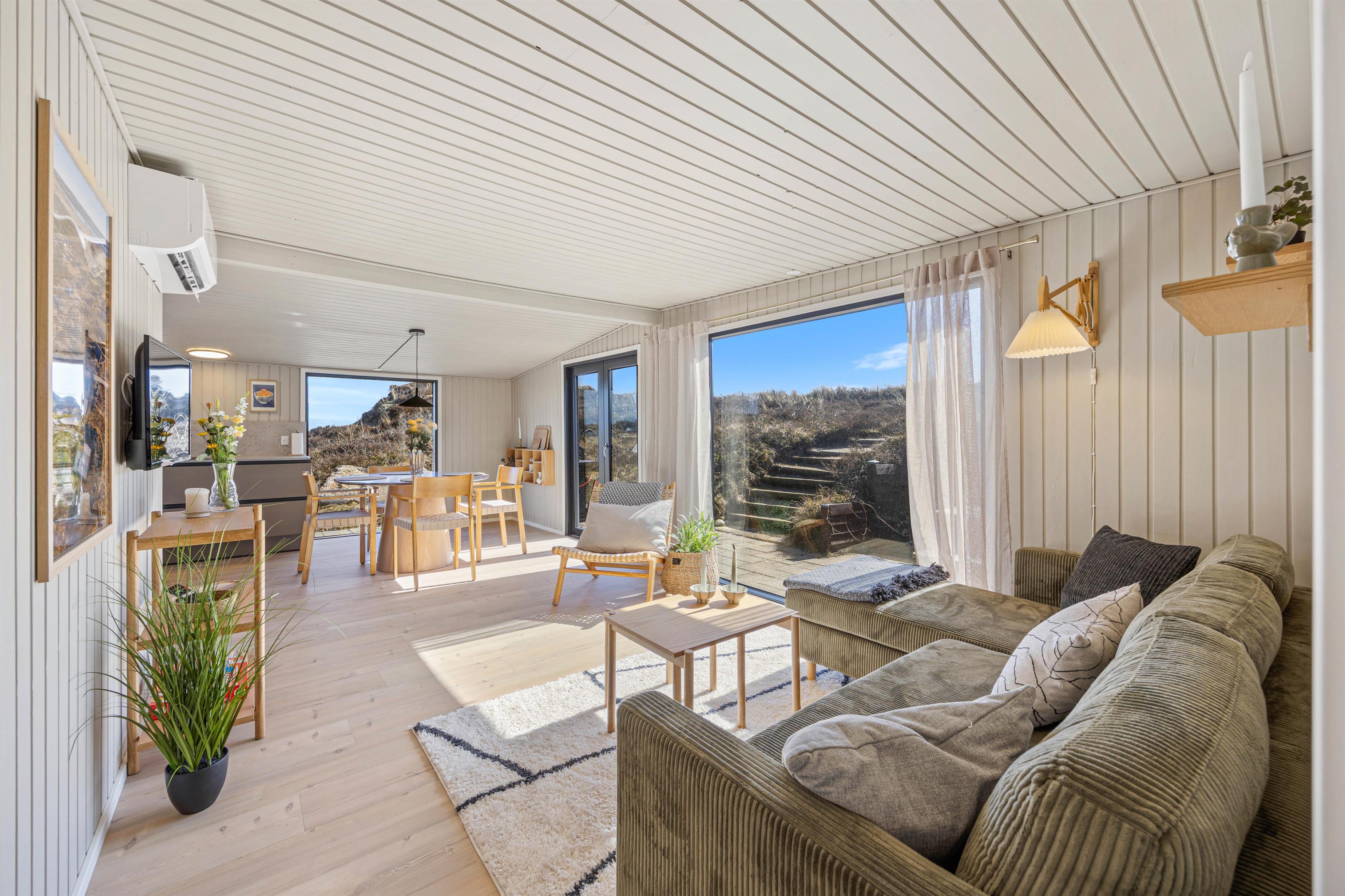 Indenfor mødes I af et lyst og hyggeligt indrettet sommerhus, hvor de rolige farver og store vinduespartier skaber en skøn atmosfære. Opholdsrummet er sommerhusets naturlige samlingspunkt, hvor køkken, spiseplads og stue ligger i åben forbindelse - her kan I nyde ferien sammen, uanset om der laves mad, spilles spil eller slappes af i sofaen.