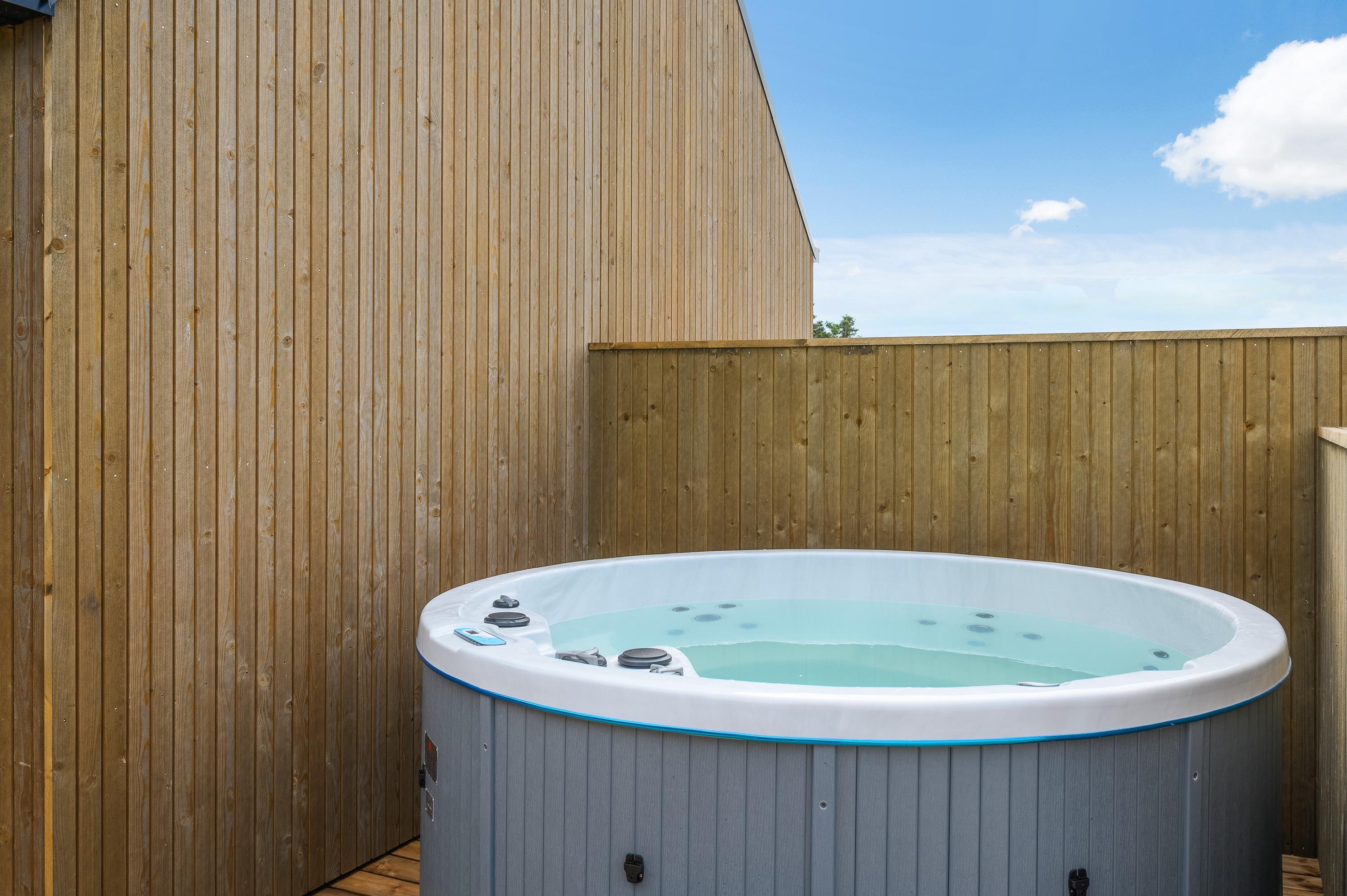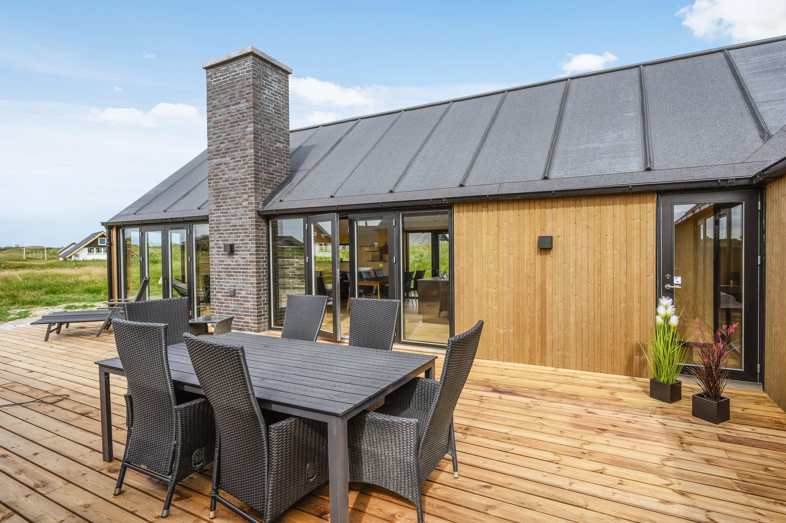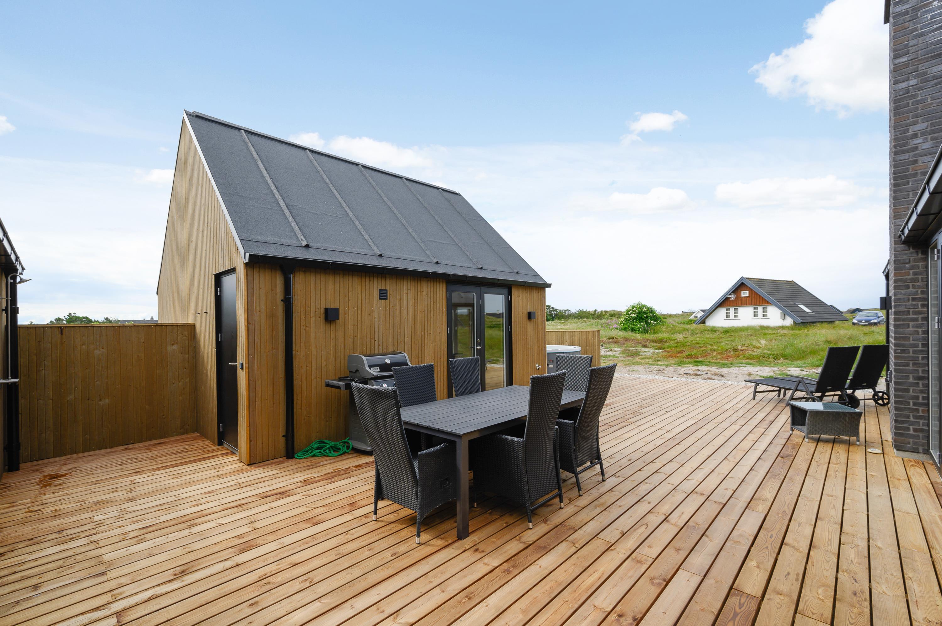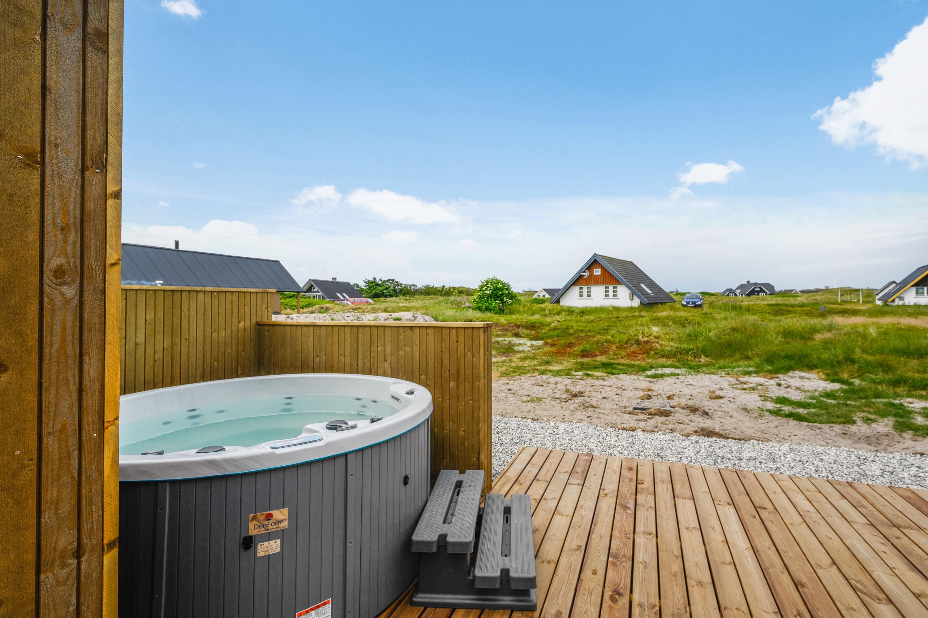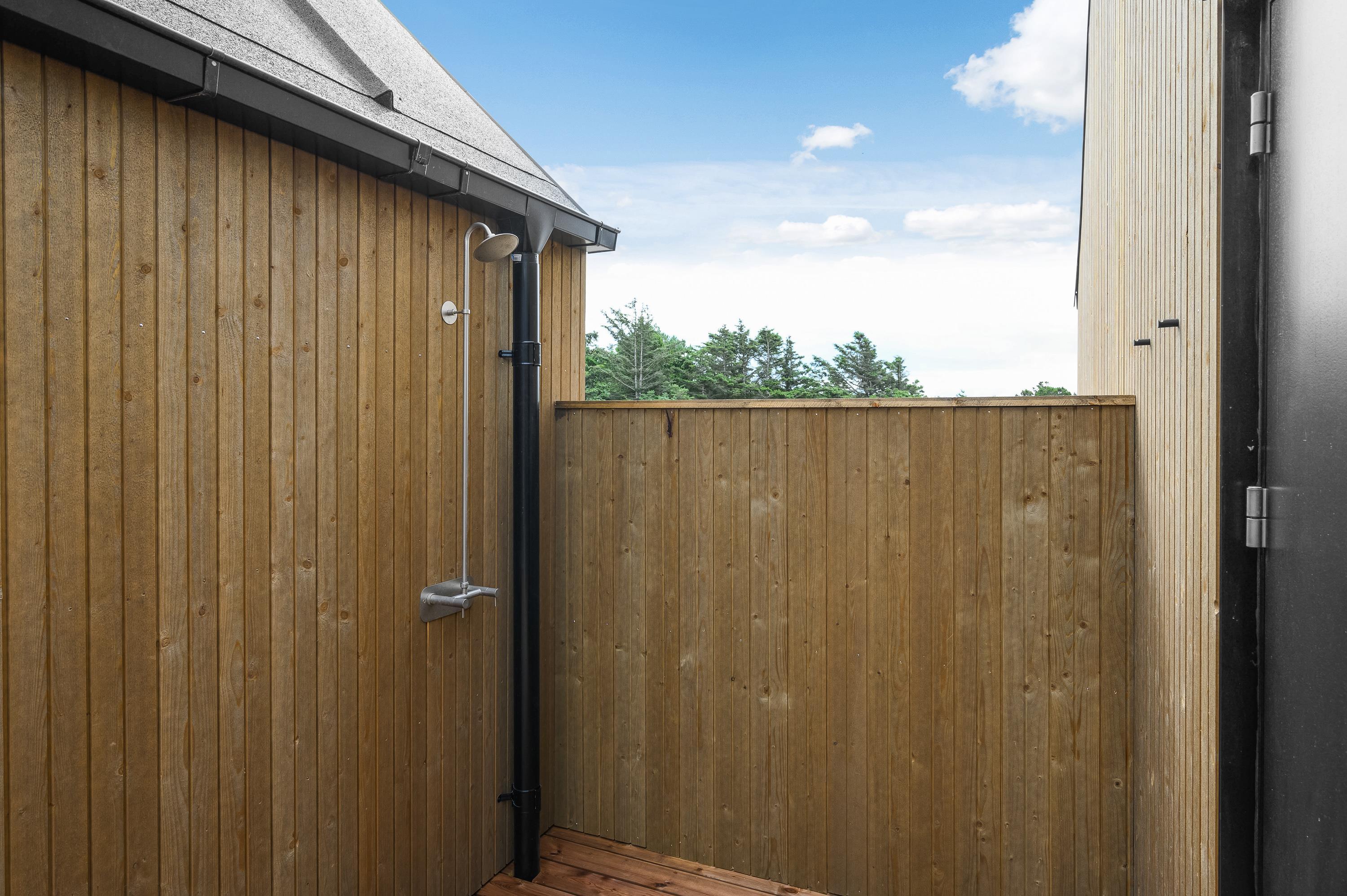 I får ikke kun et gennemført luksuriøst indre, men også et helt fantastisk udeområde med en stor, afskærmet træterrasse, som danner rammen om de udendørs aktiviteter. Her står en stor udespa klar til at give jer en afslappende wellnessoplevelse. Ved siden af spaen er der også en udebruser, så I fra april til november kan få et forfriskende skyl på vejen.