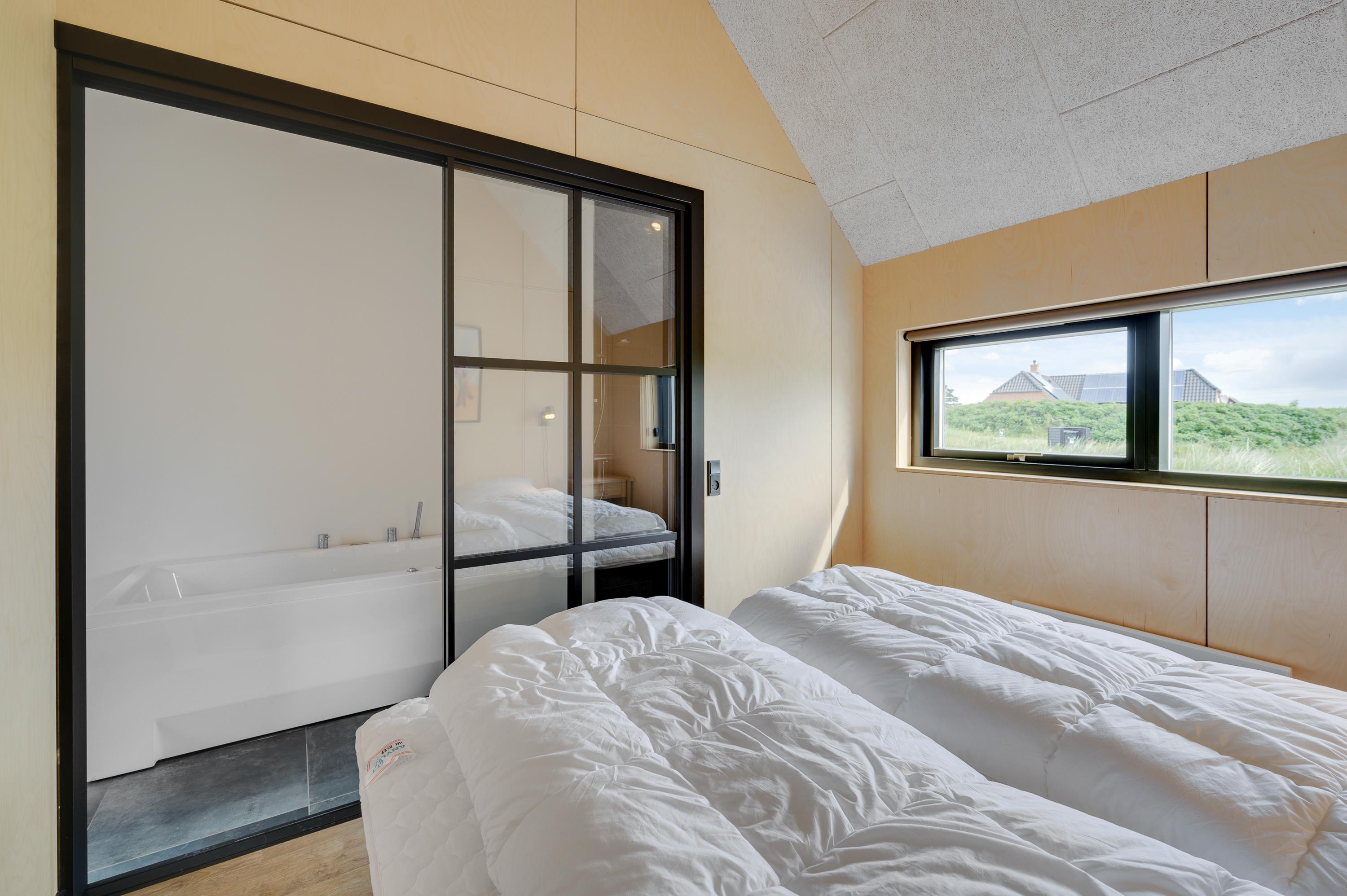 Det største af feriehusets badeværelser er udstyret med spabad, og gennem badeværelset er der både indgang til soveværelse og udgang til terrassen – ligesom alrummet og fordelingsgangen har flere udgange til uderummet.