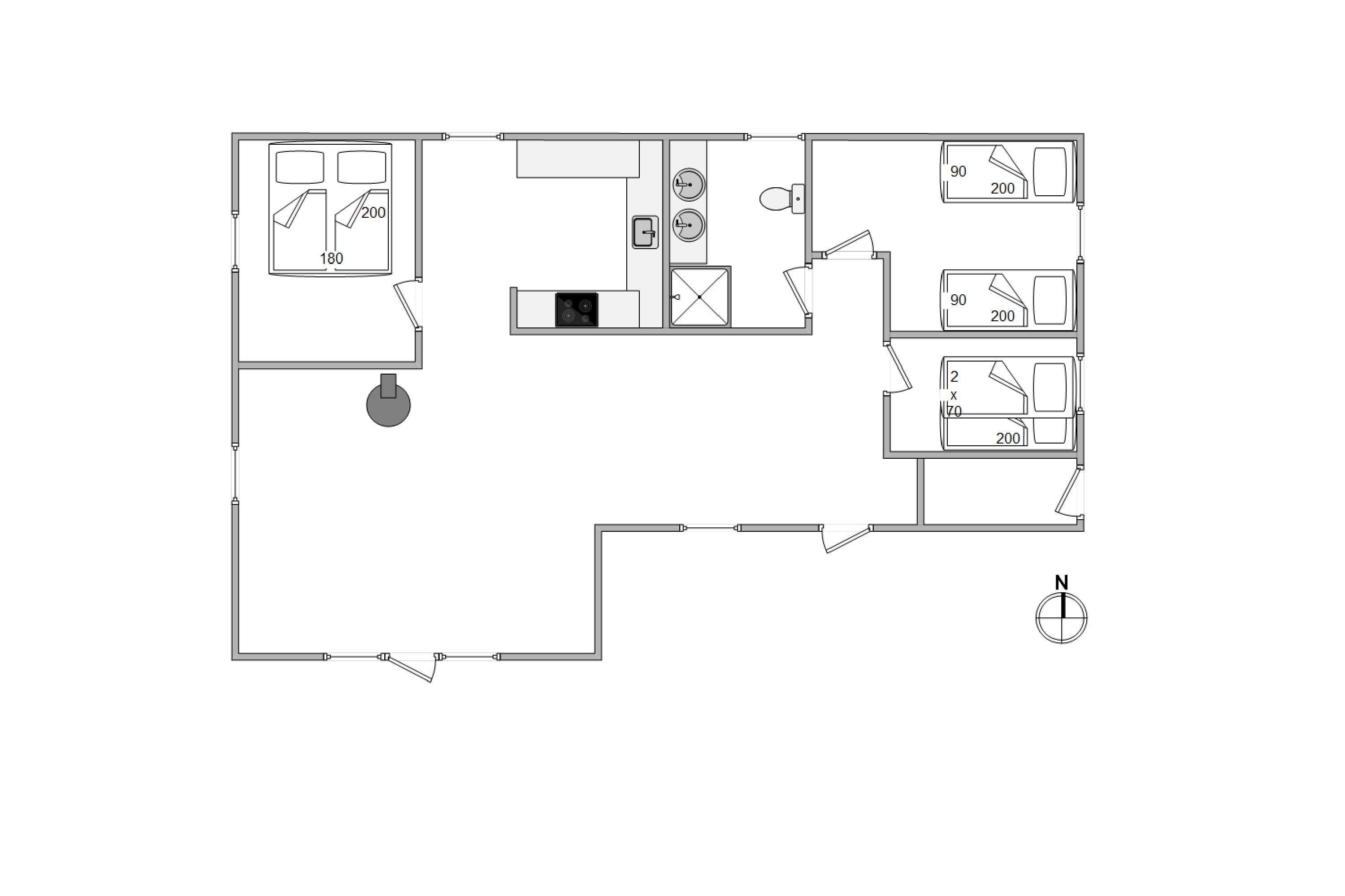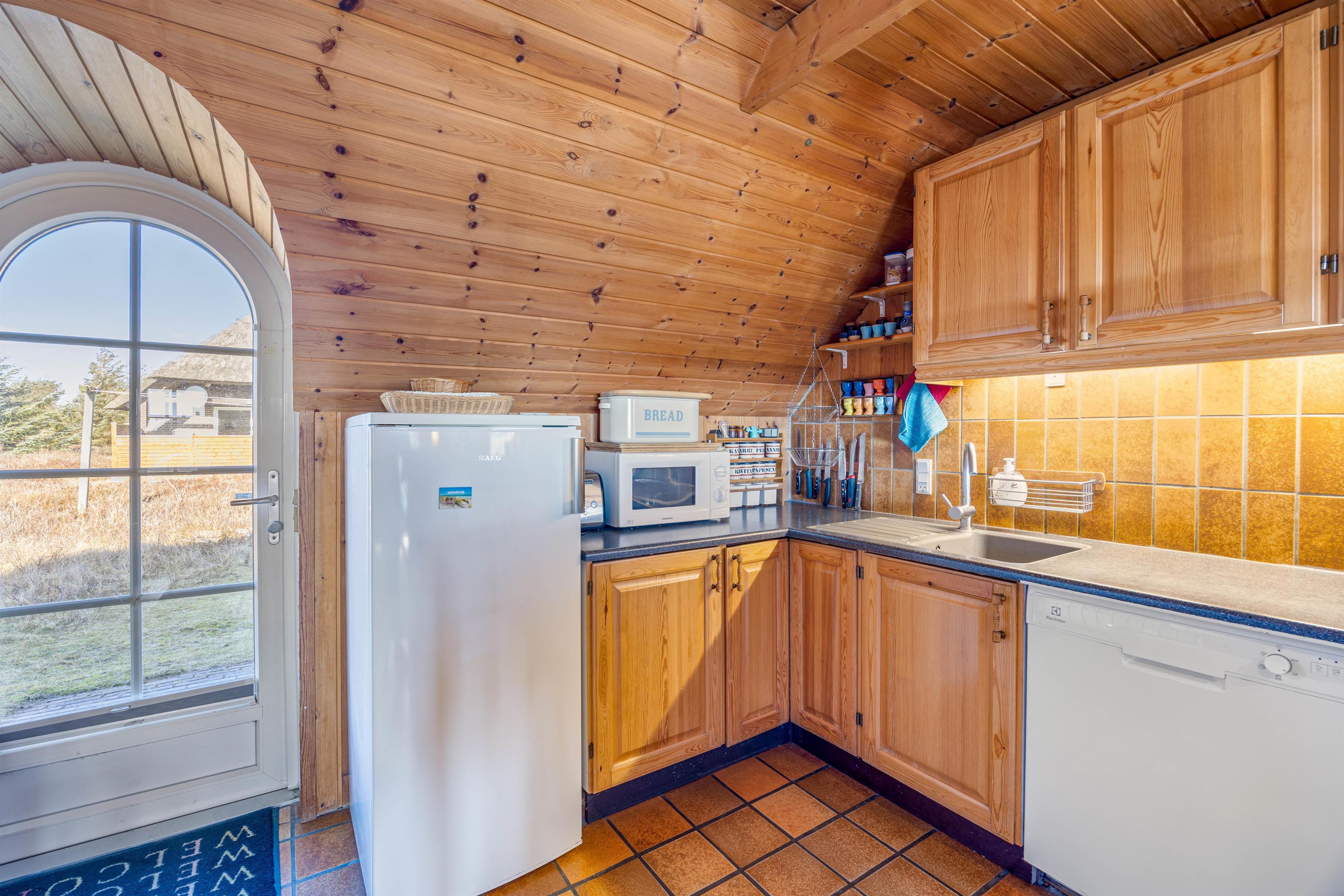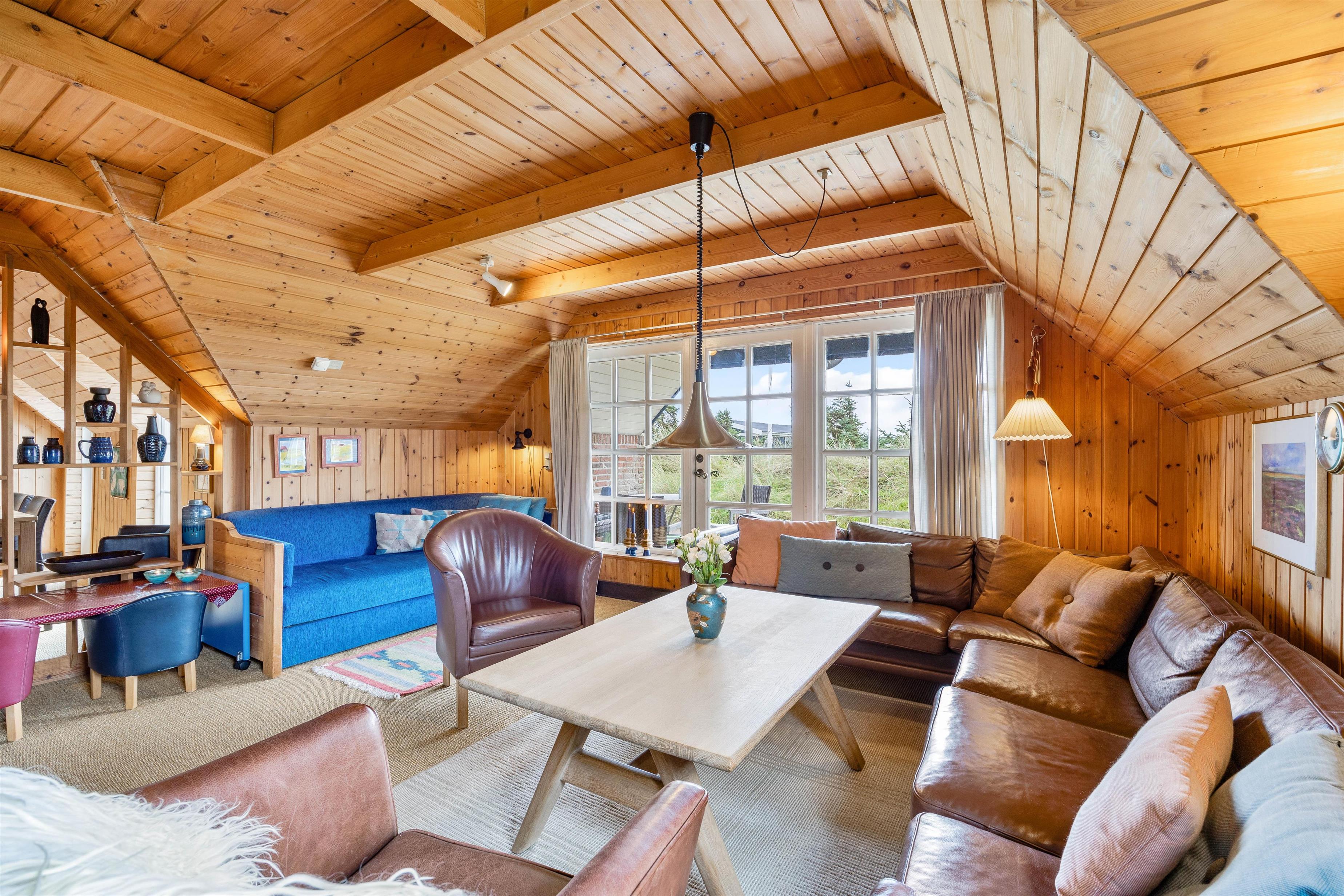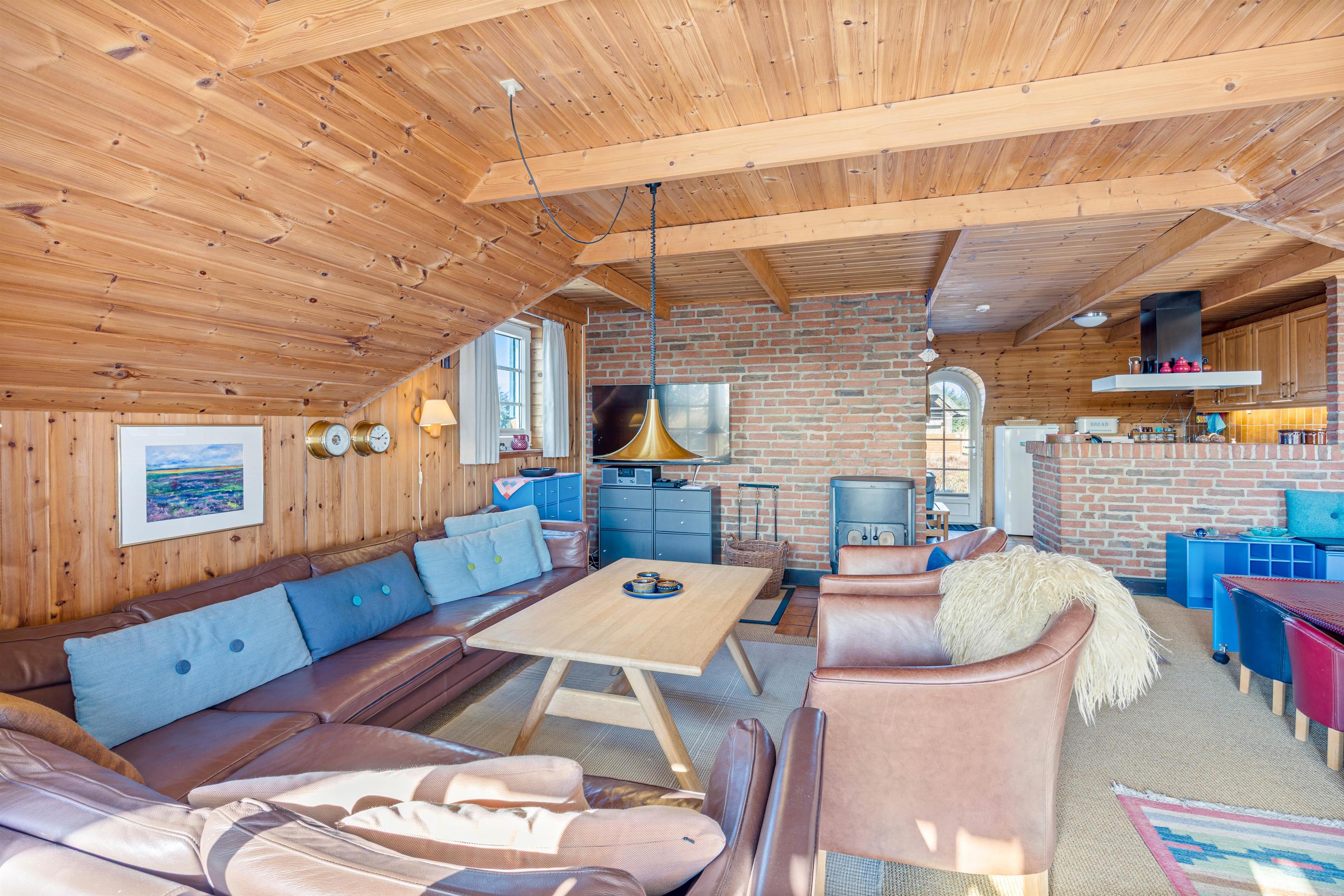 Den rustikke indretning sætter rammerne for en helt enkel og afslappende sommerhusferie langt væk fra den grå hverdag. Den charmerende spise- og opholdsstue er i åben forbindelse med det veludstyrede køkken, og her kan hele familien samles i sofahjørnet til en god film efter aftensmaden, og mens aftenen går på hæld, vil brændeovnens knitrende flammer sprede masser af varme og feriestemning, mens I nyder hinandens selskab.