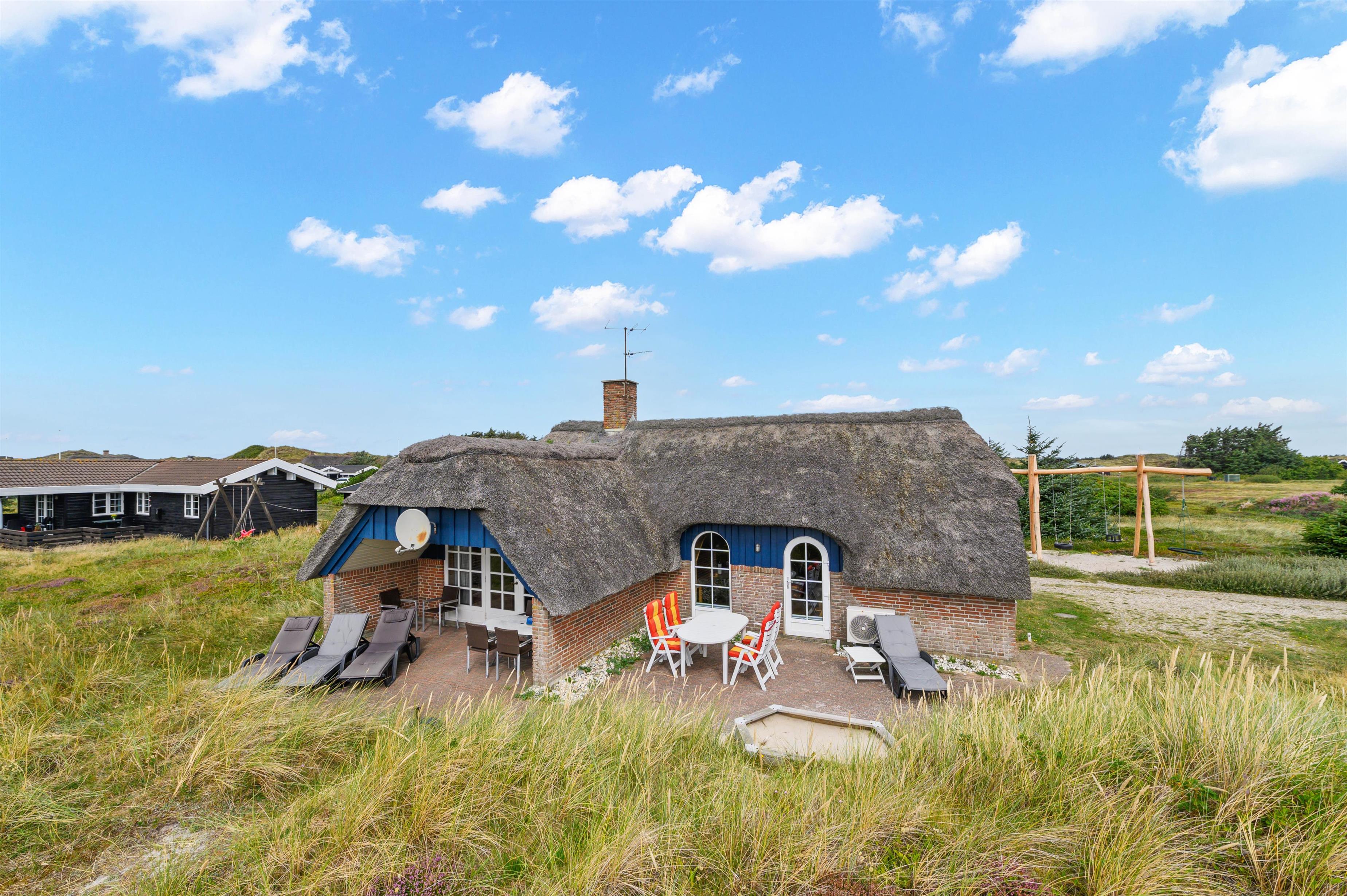 Dette rustikke stråtagshus på Fladsbjergvej 144 emmer af sommerhusferie og byder på den helt klassiske variation i hyggelige omgivelser og med kort afstand til det brusende Vesterhav. Her kan I holde en stille og rolig ferie midt i det smukke vestjyske klitlandskab med hele familien.