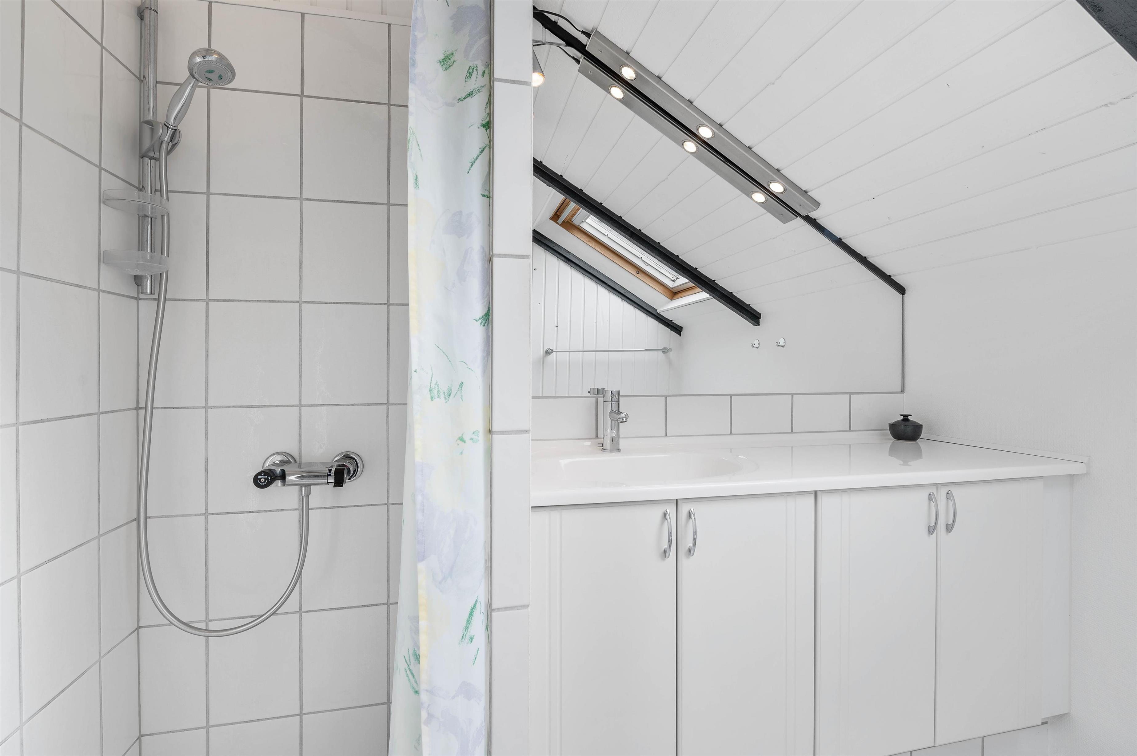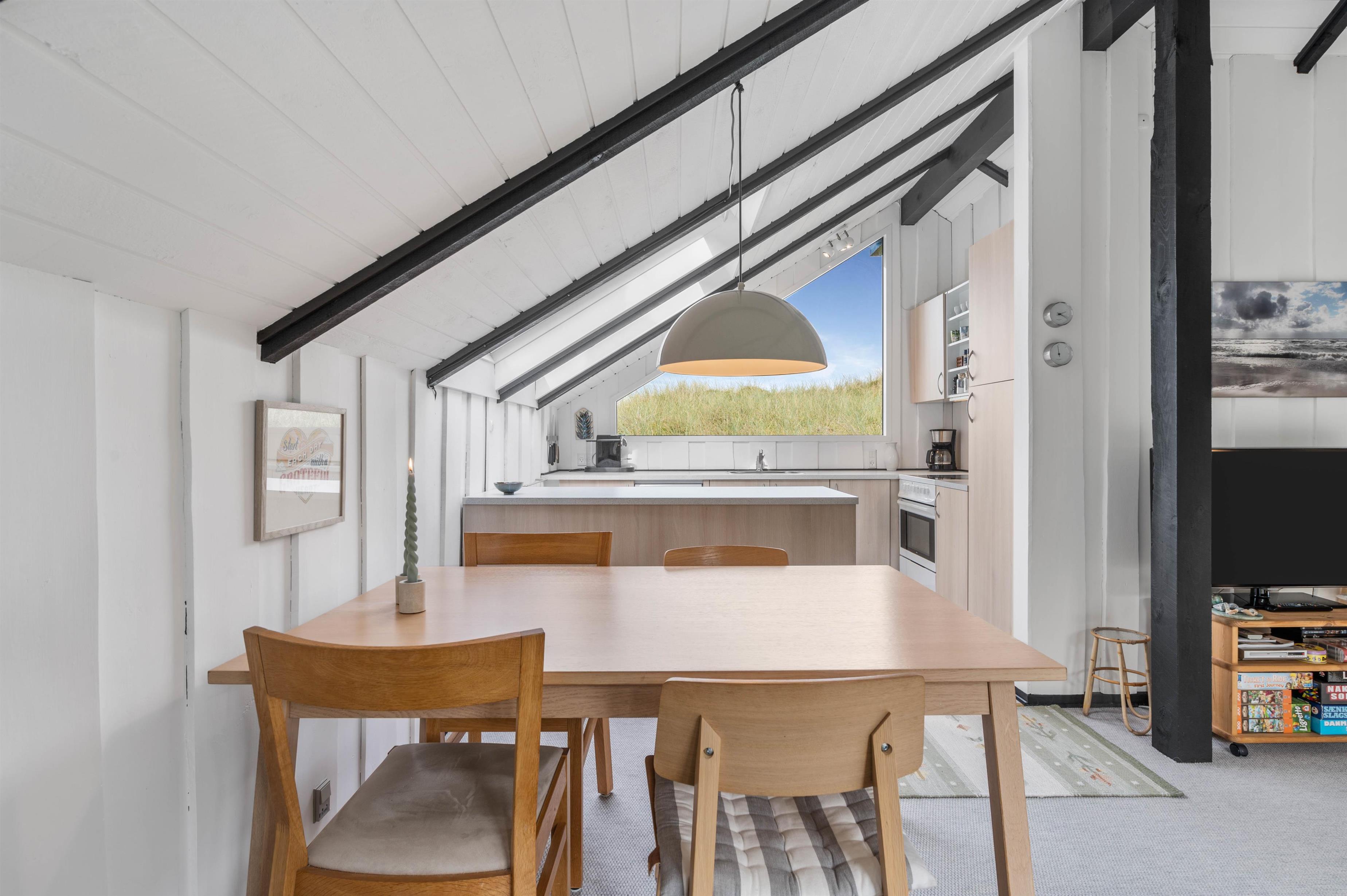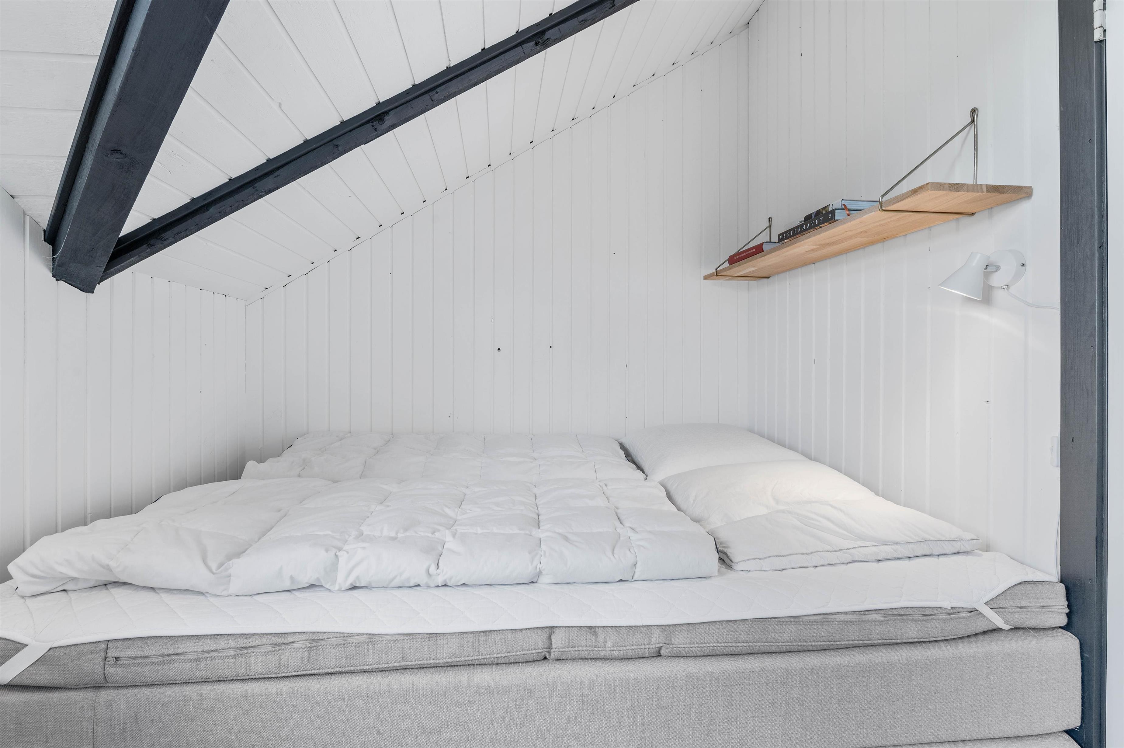 Sommerhuset på Fladsbjergvej 30 er indrettet med hvide træpaneler der går op til sorte bjælker i kip og danner et integreret hele, hvor køkken og stue går ud i et. Sommerhuset har en lys og venlig indretning og her vil I hurtigt føle jer godt tilrette.