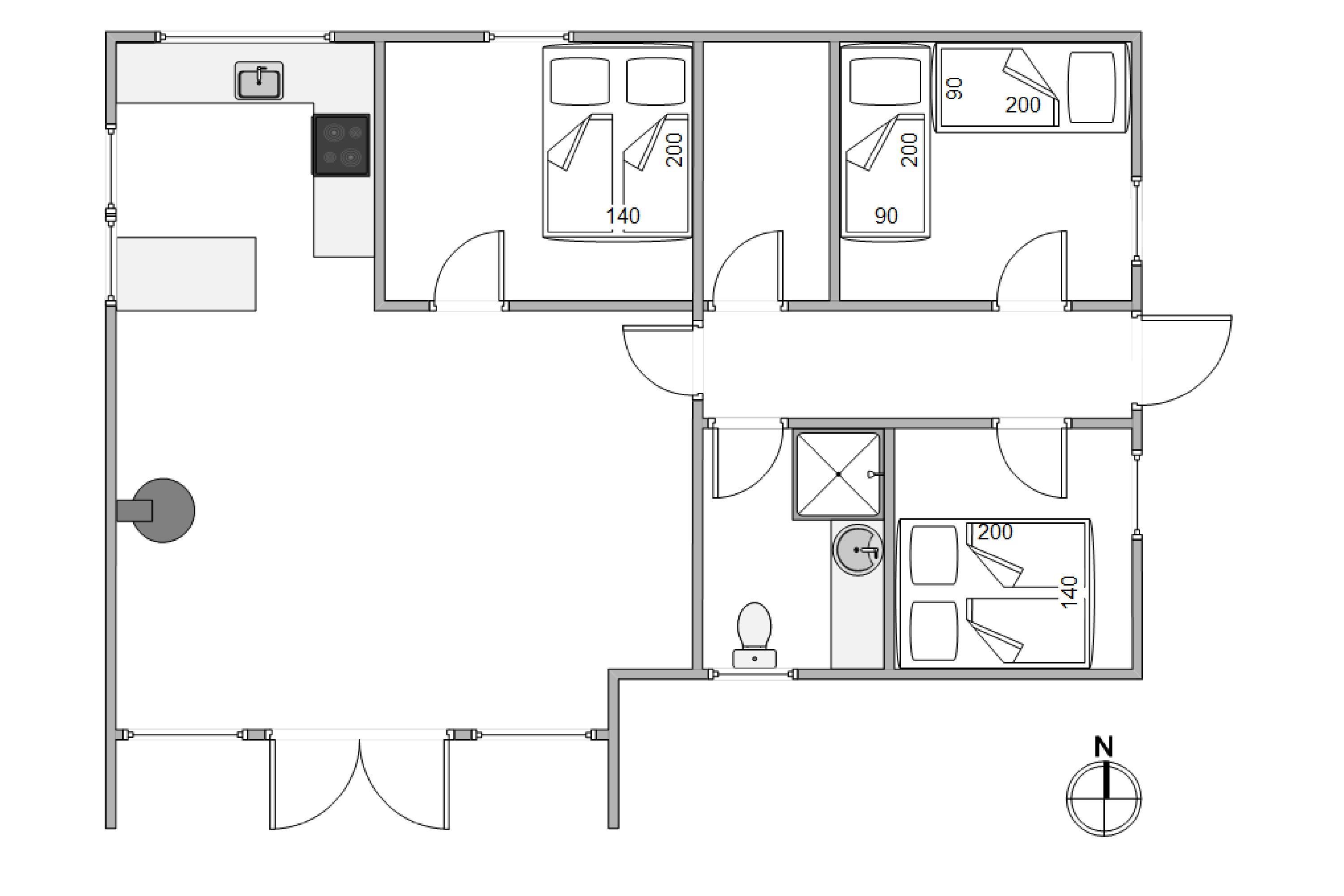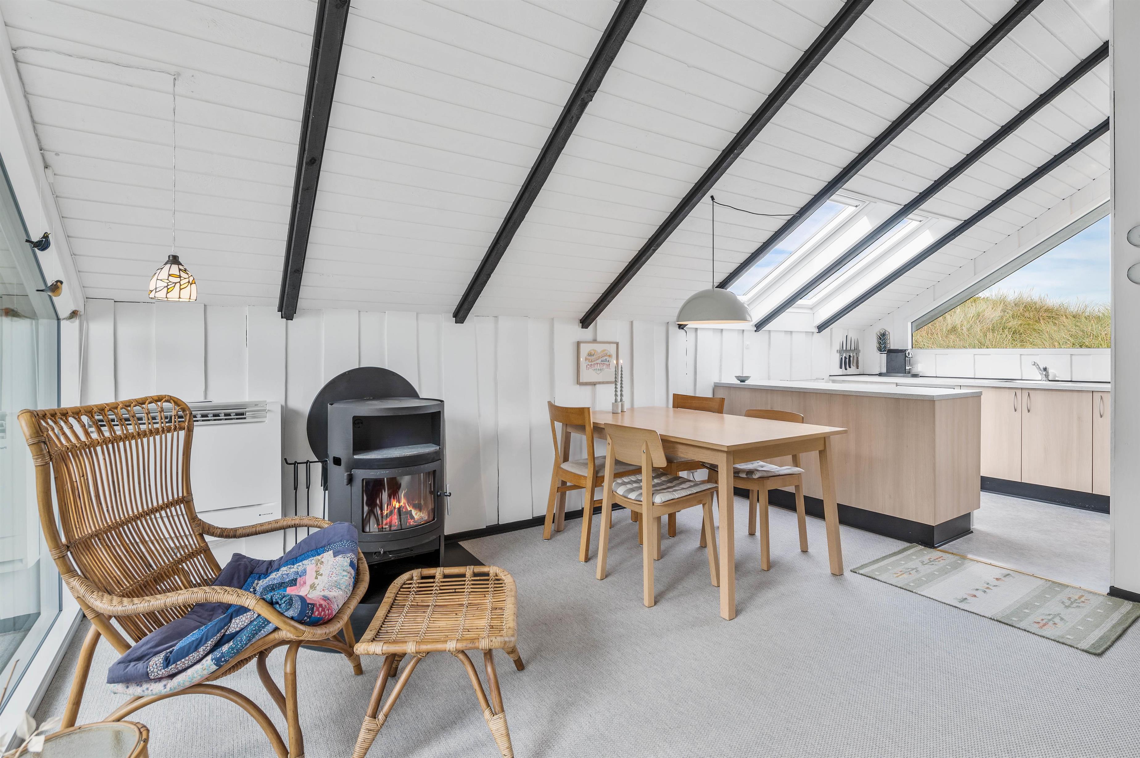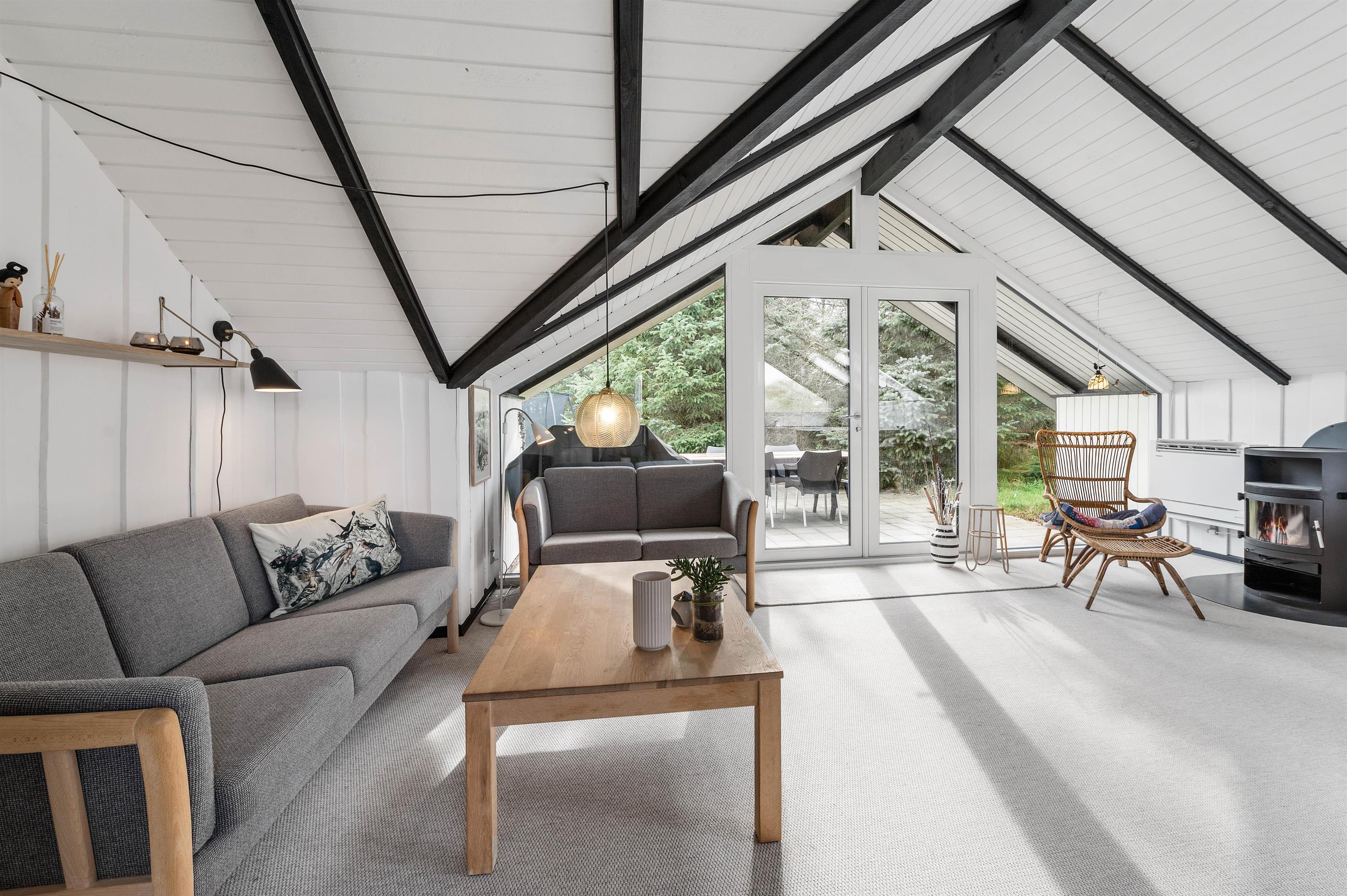 Brændeovnen i stuen sørger for den ægte sommerhusstemning. Her kan I sidde i sofaen, mens I kigger på de knitrende flammer og planlægger feriens aktiviteter, mens madlavningen foregår. Sommerhuset er fordelt på 3 soverum, hvoraf de 2 rum har dobbeltsenge. Fra stuen er der direkte adgang ud til den dejlige, store terrasse udenfor.