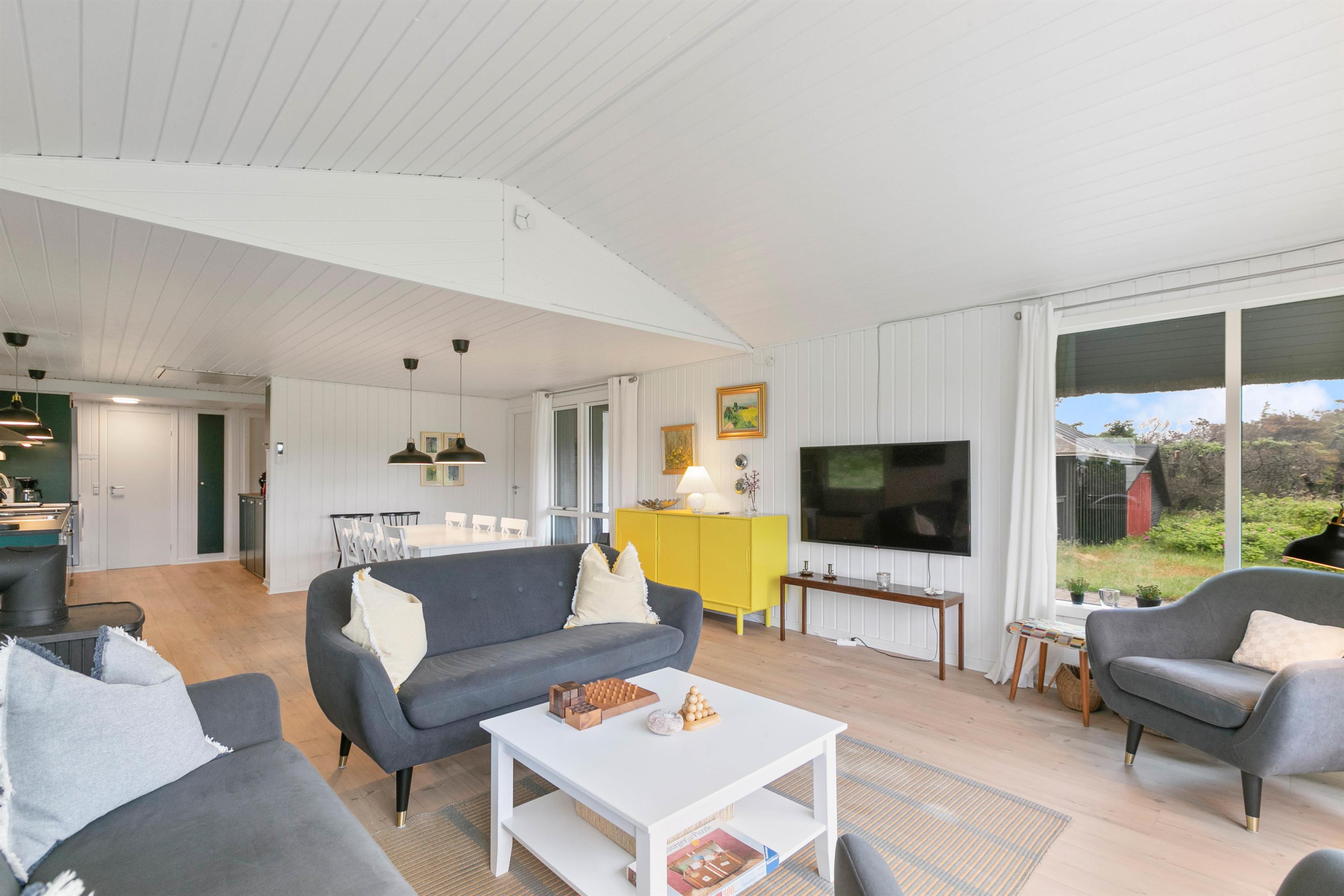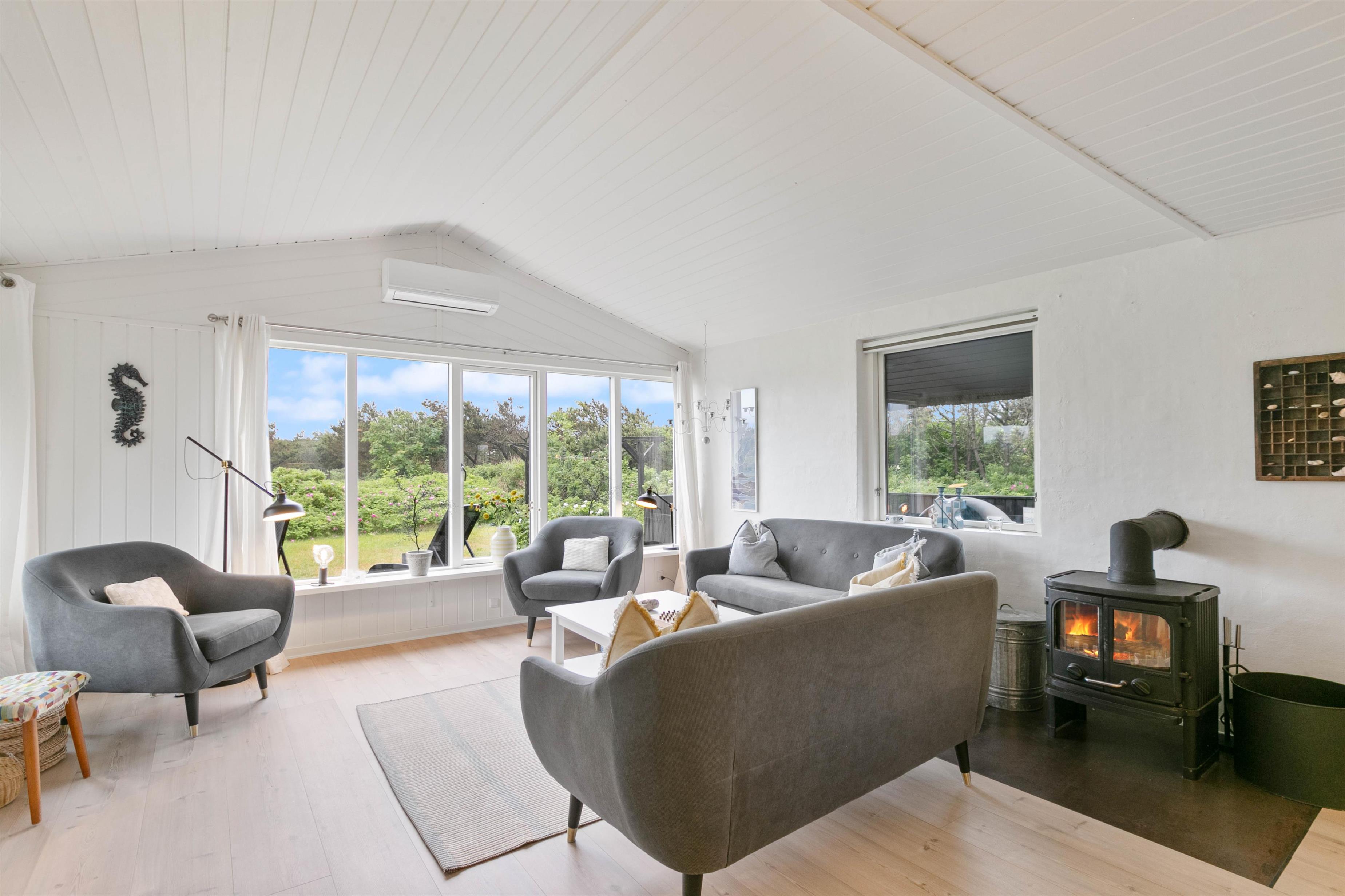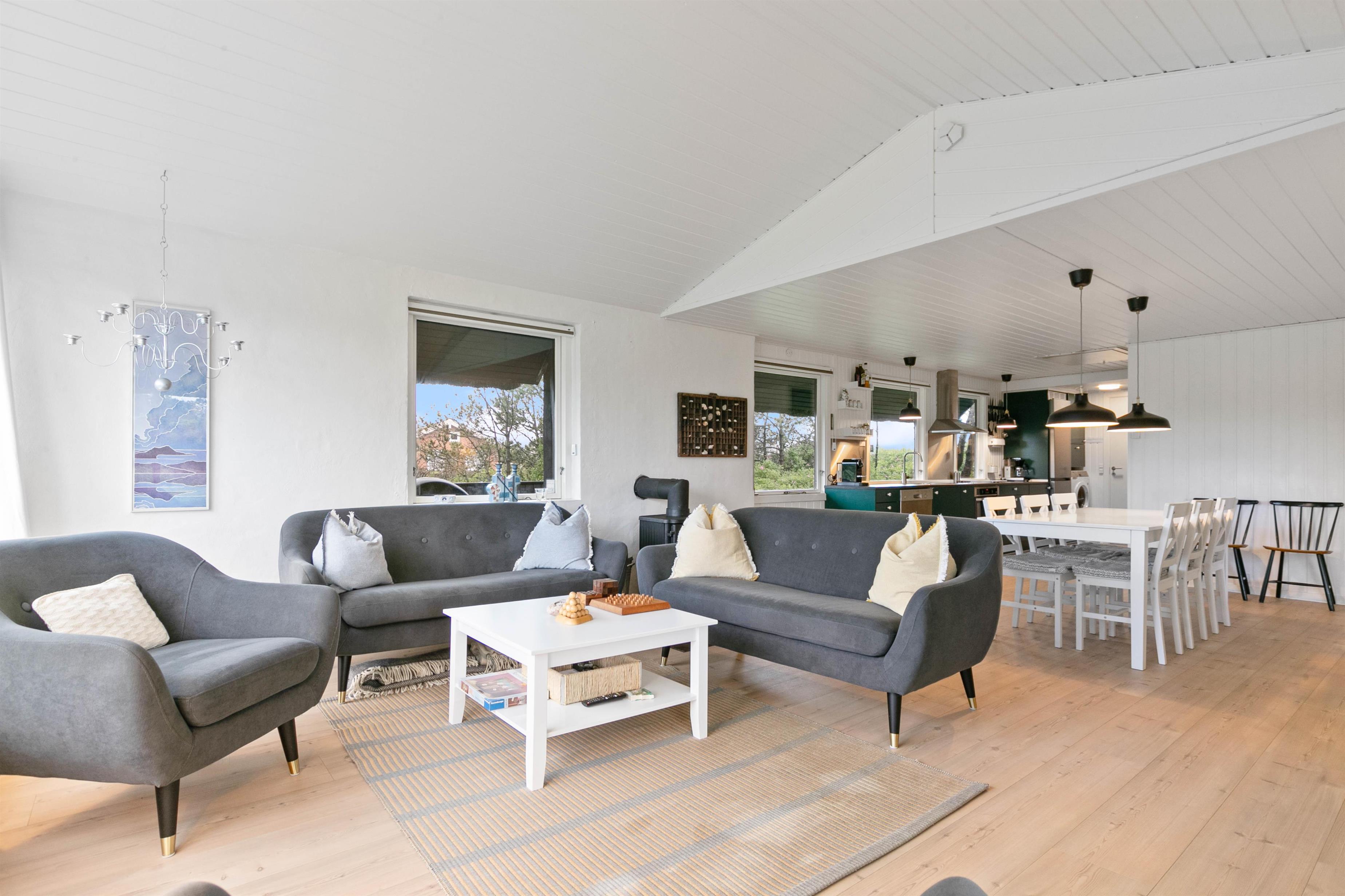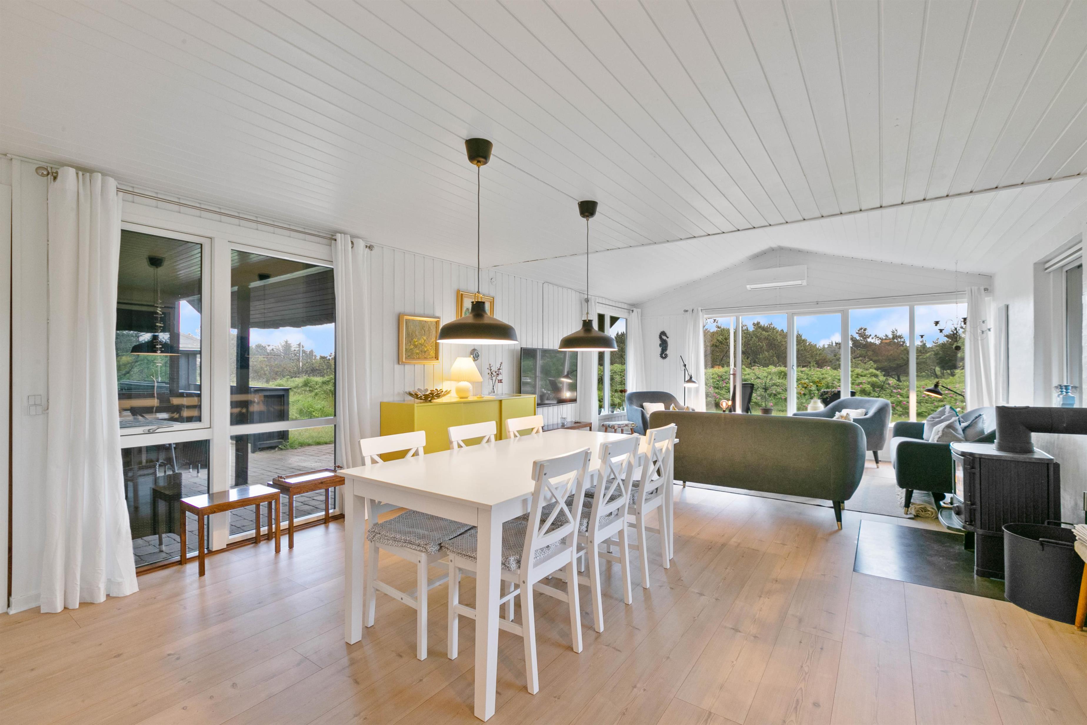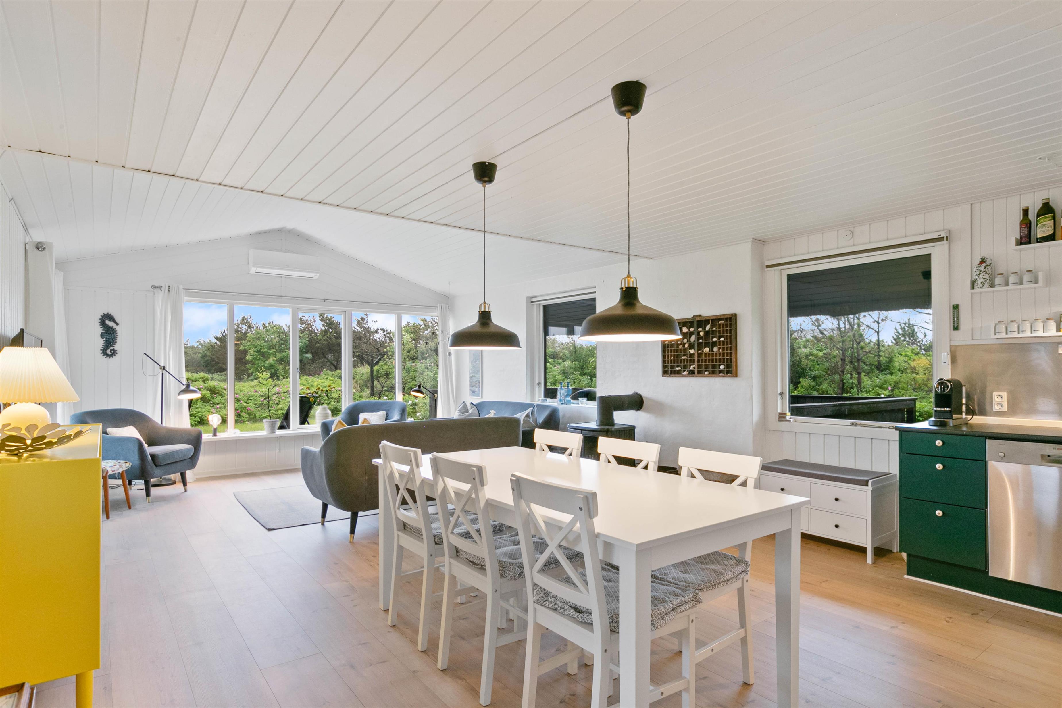 I vil straks falde til i den lyse og venlige indretning med hvide trælofter og nye trægulve. Samtidig lader de store vinduespartier en masse sollys slippe ind i feriehuset.