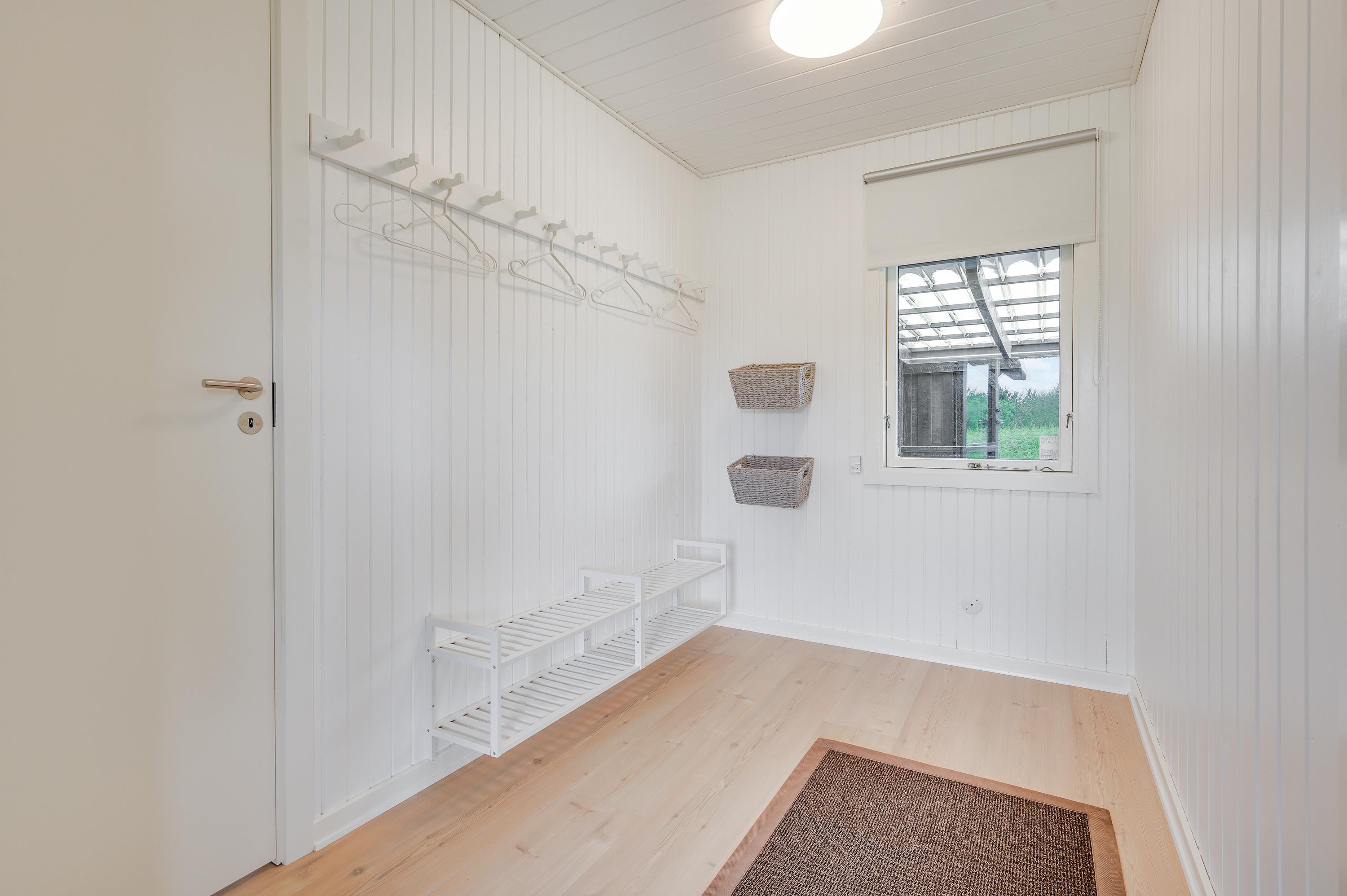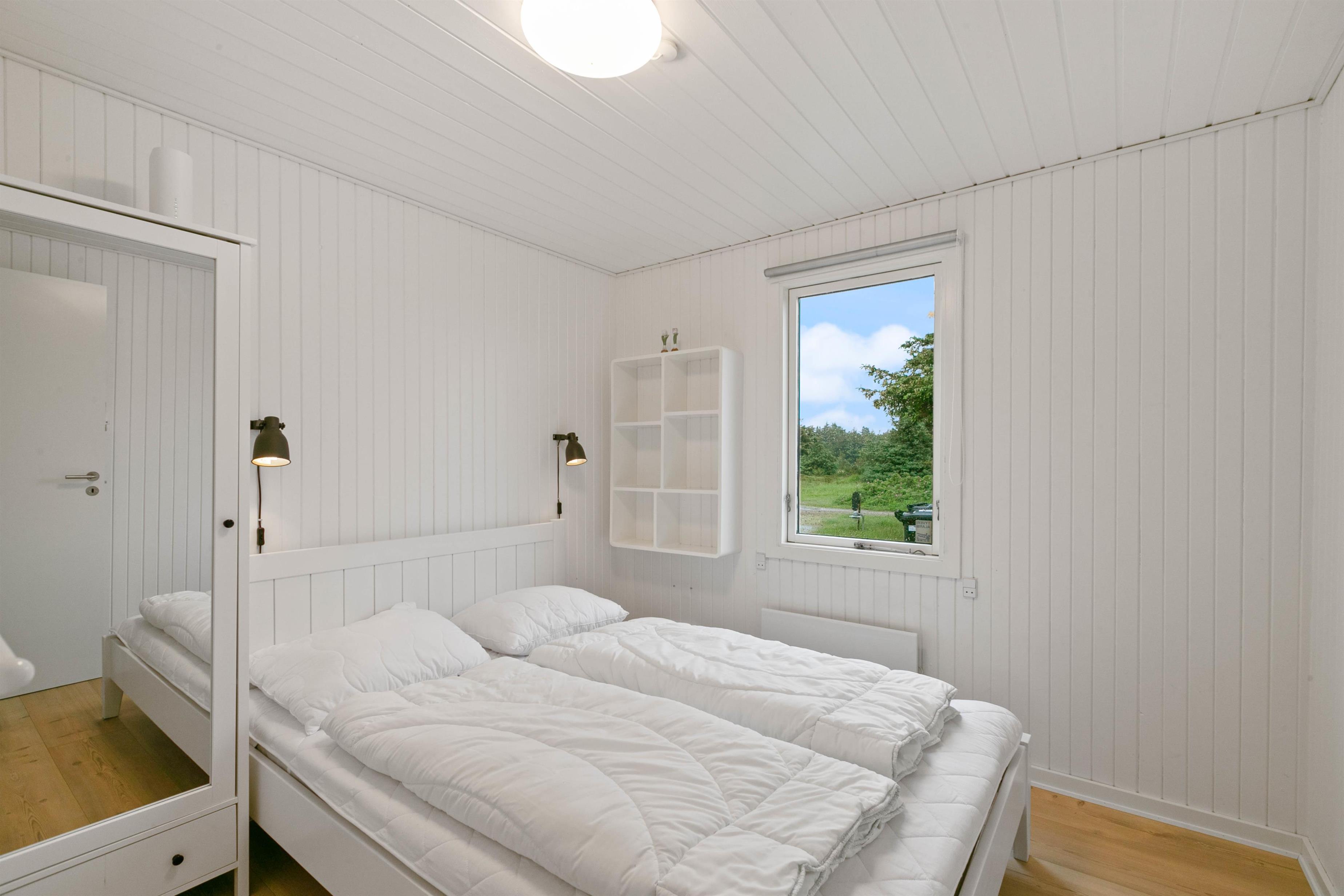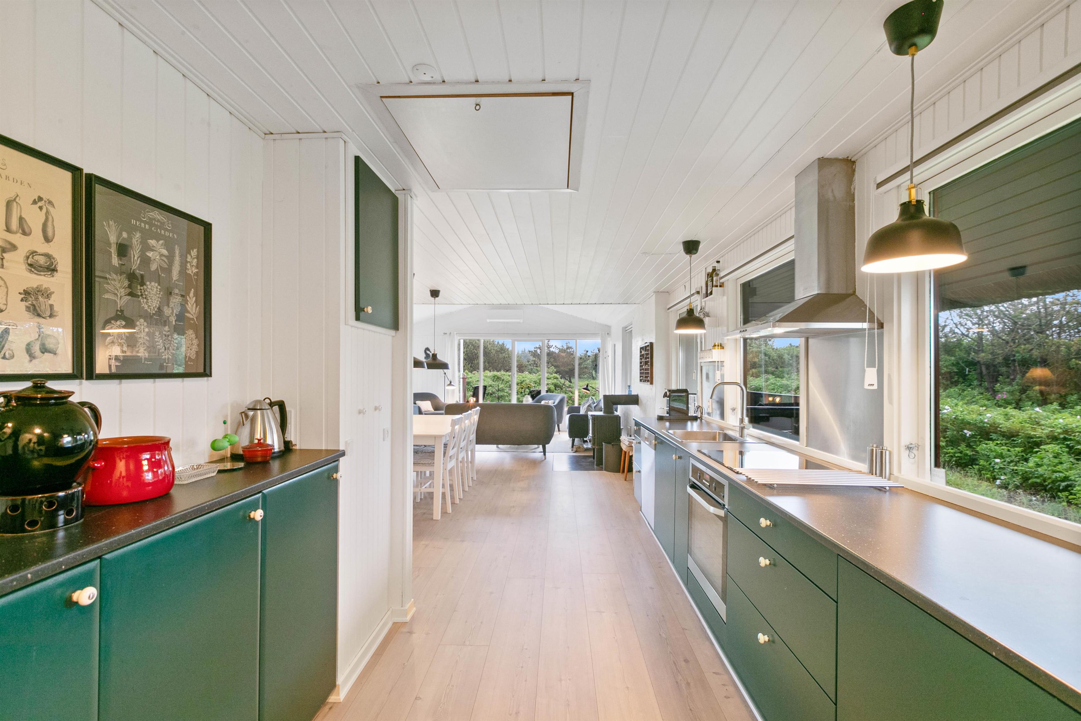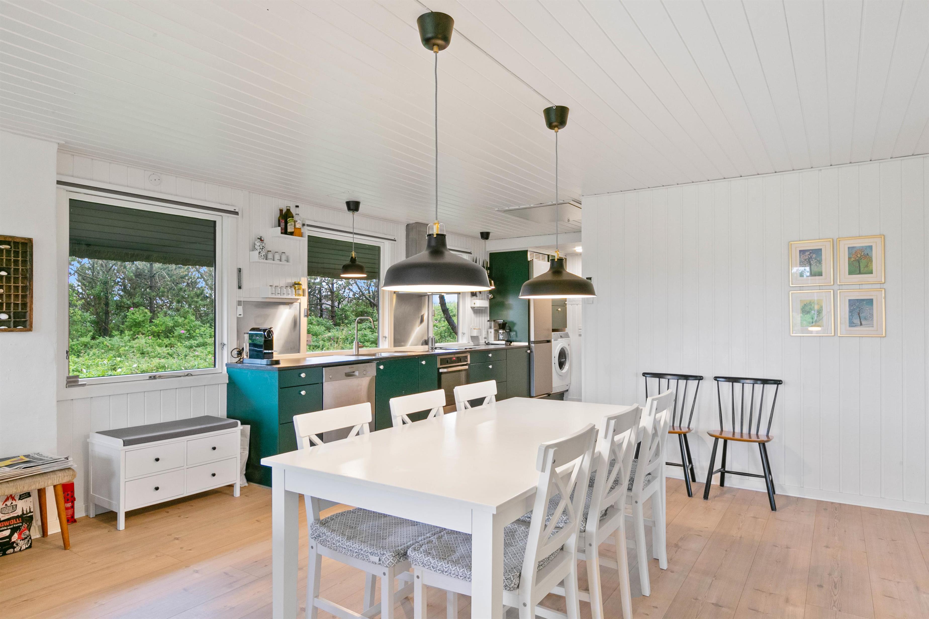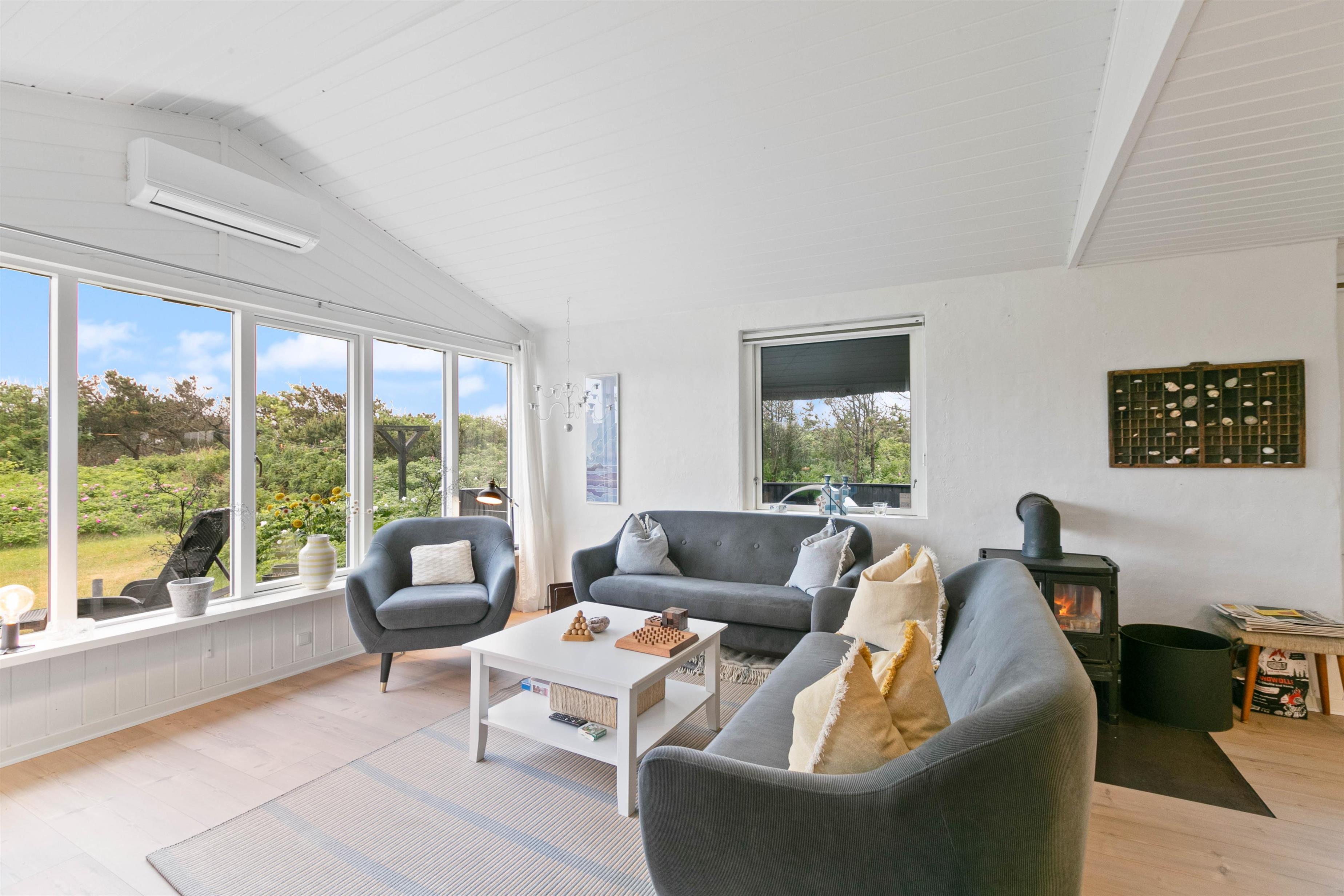 I vil straks falde til i den lyse og venlige indretning med hvide trælofter og nye trægulve. Samtidig lader de store vinduespartier en masse sollys slippe ind i feriehuset.