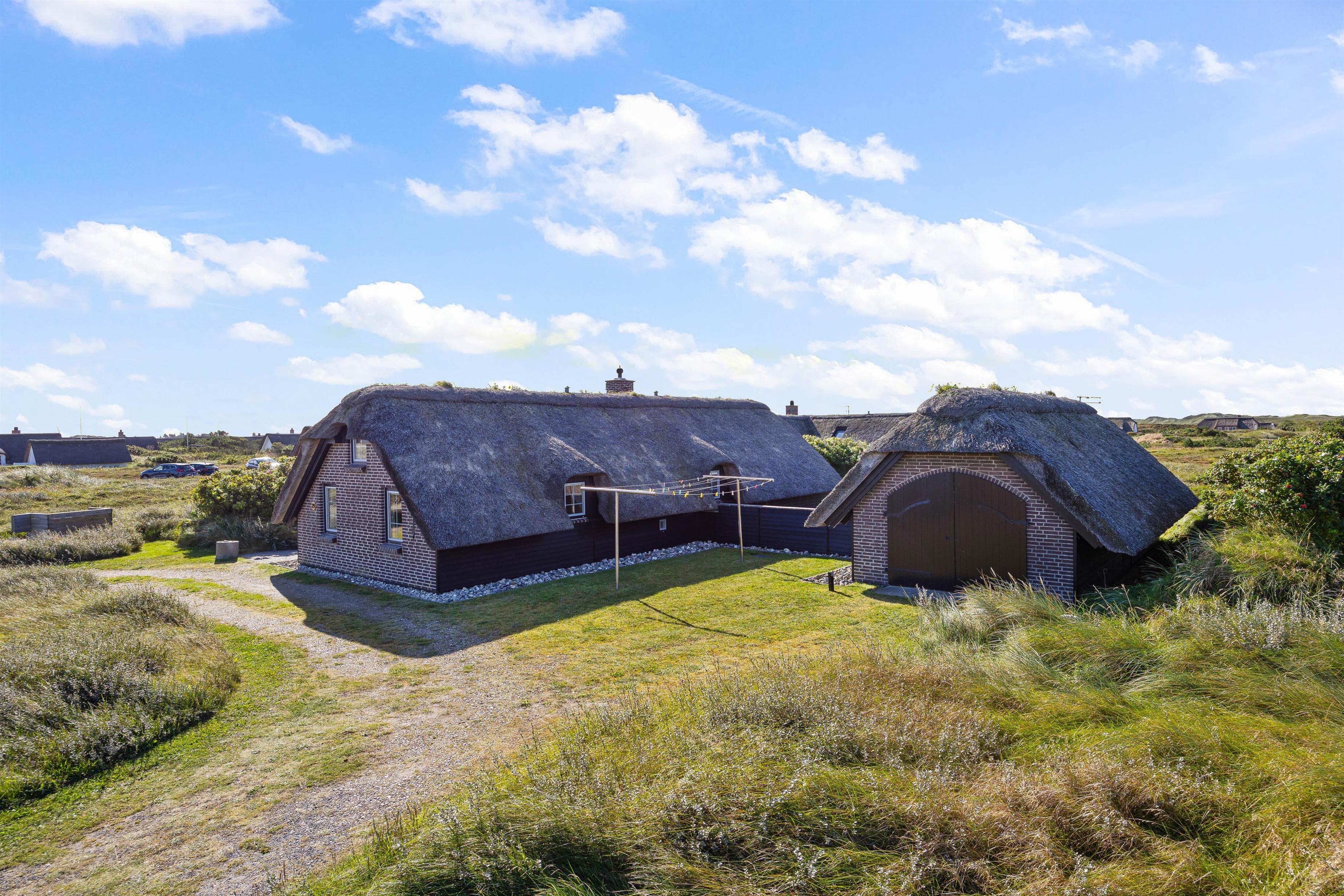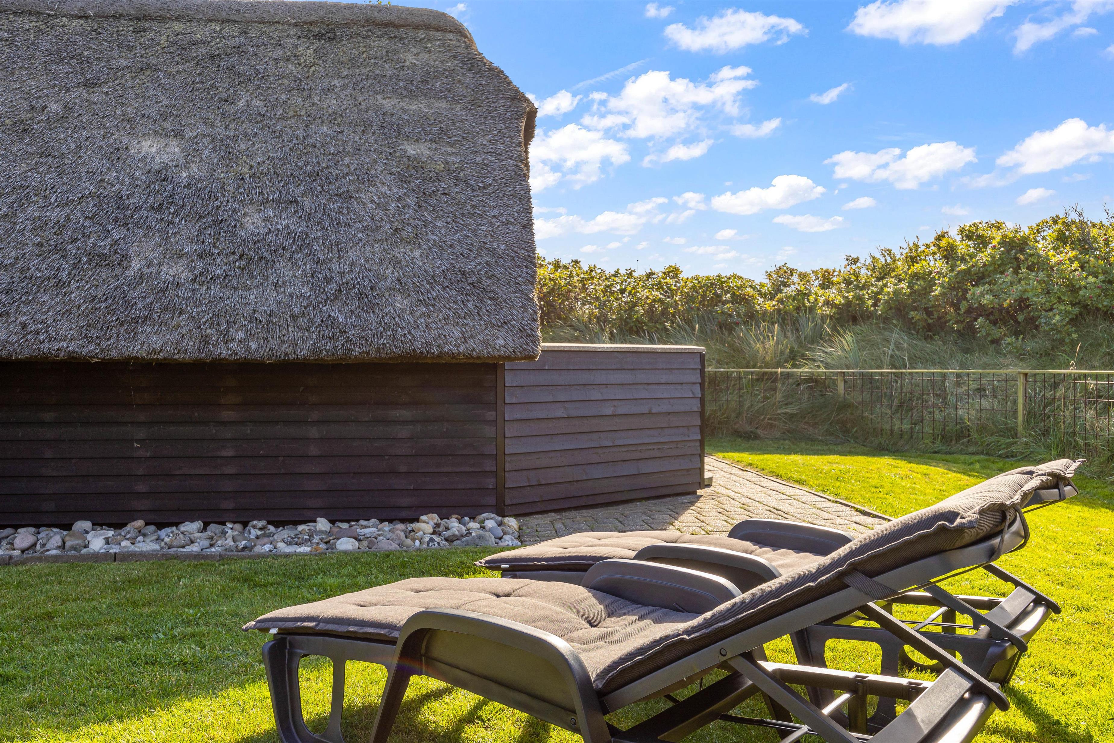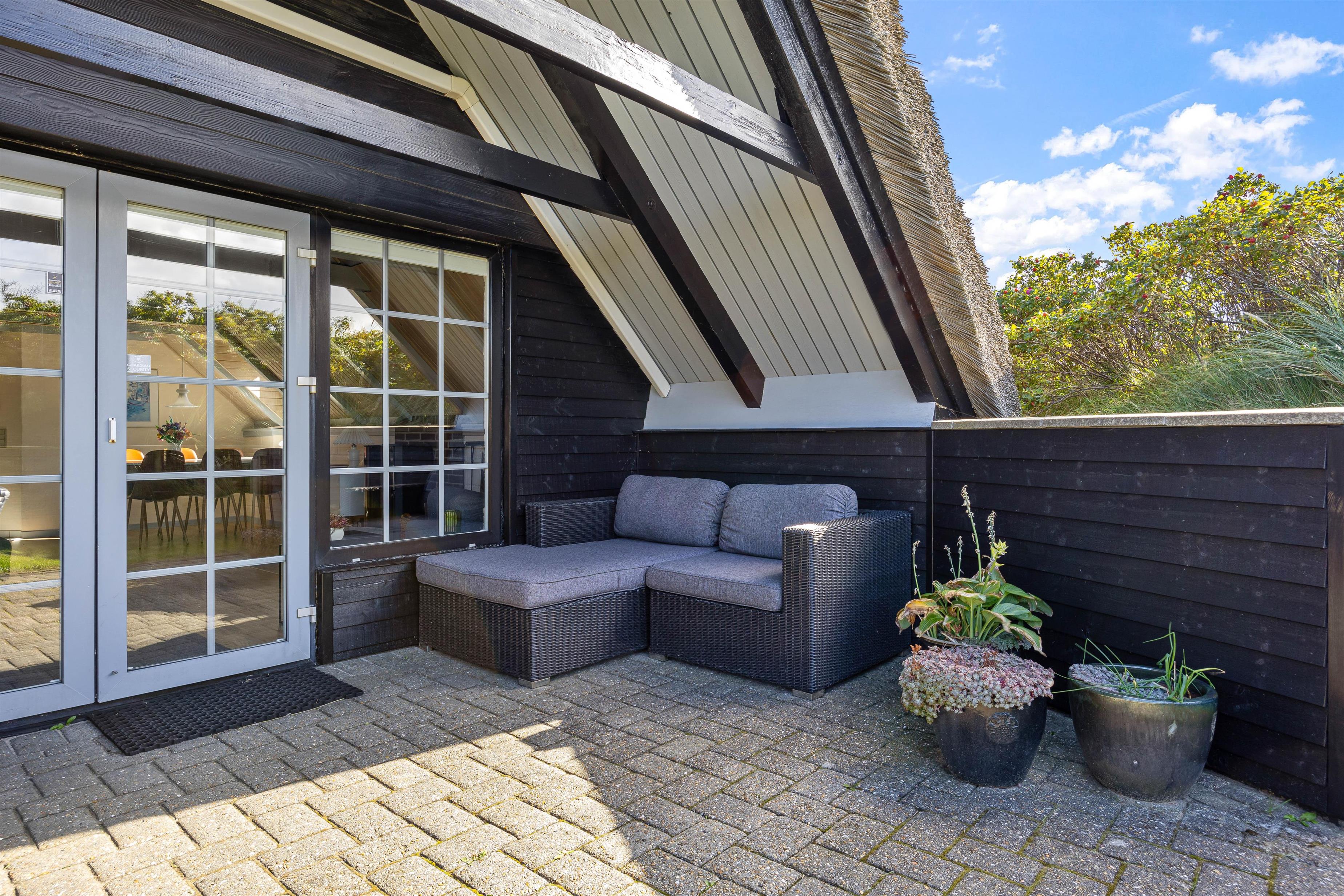 Til sommerhuset hører desuden en dejlig, delvist overdækket terrasse, som inviterer til afslapning og hygge i solen. Til terrassen hører naturligvis gode havemøbler, liggestole og grill - perfekt til hyggelige grillaftener med gode venner og familie. Den overdækkede terrasse sørger samtidig for at I kan holde på varmen, så I kan sidde ude længere på lune sommeraftener og nyde den dejlige vesterhavsluft.