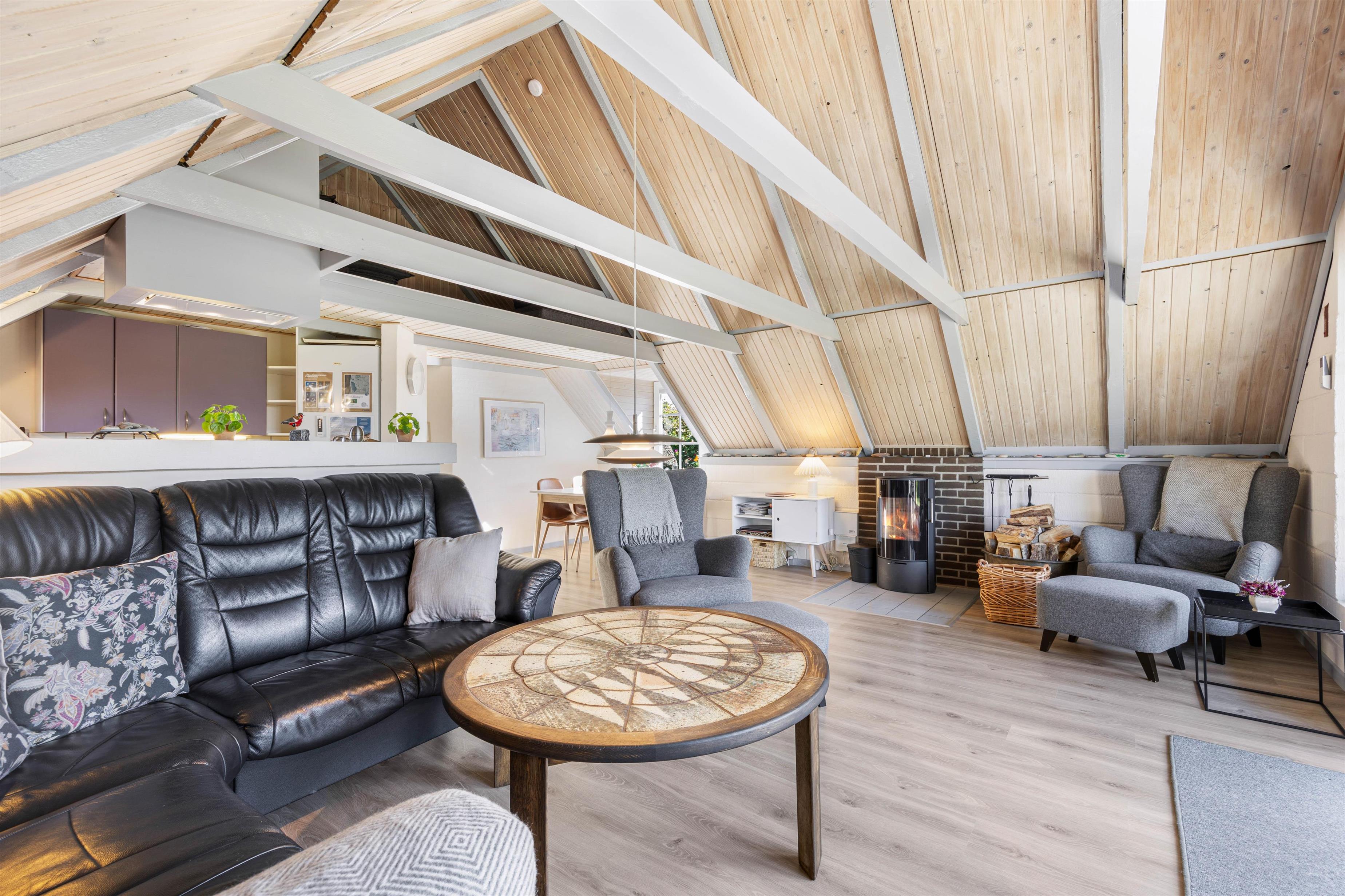 På de kolde dage kan I tænde op i brændeovnen, som skaber en hyggelig atmosfære. Udover brændeovnen er der også en varmepumpe, så I altid har en dejlig temperatur indenfor.