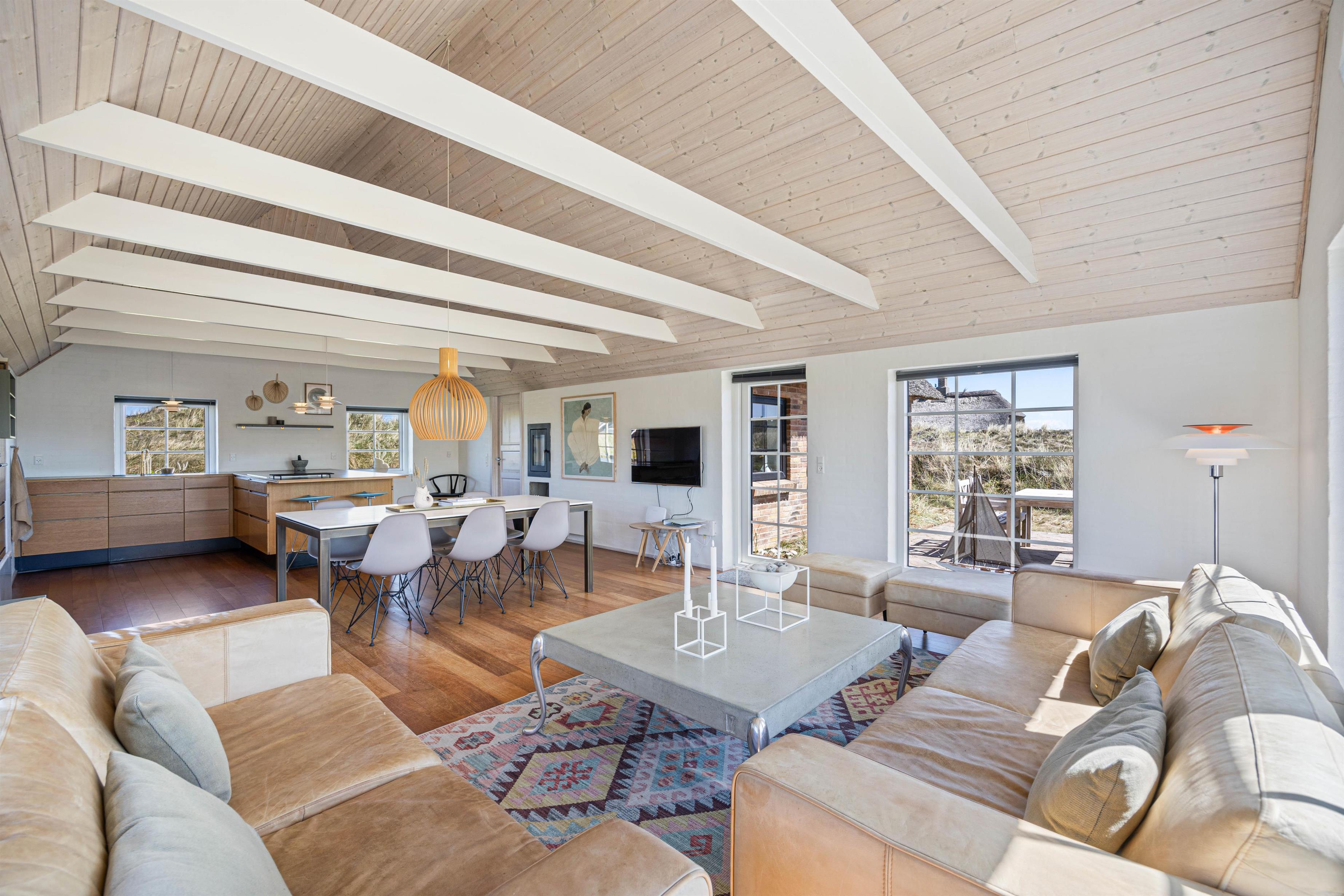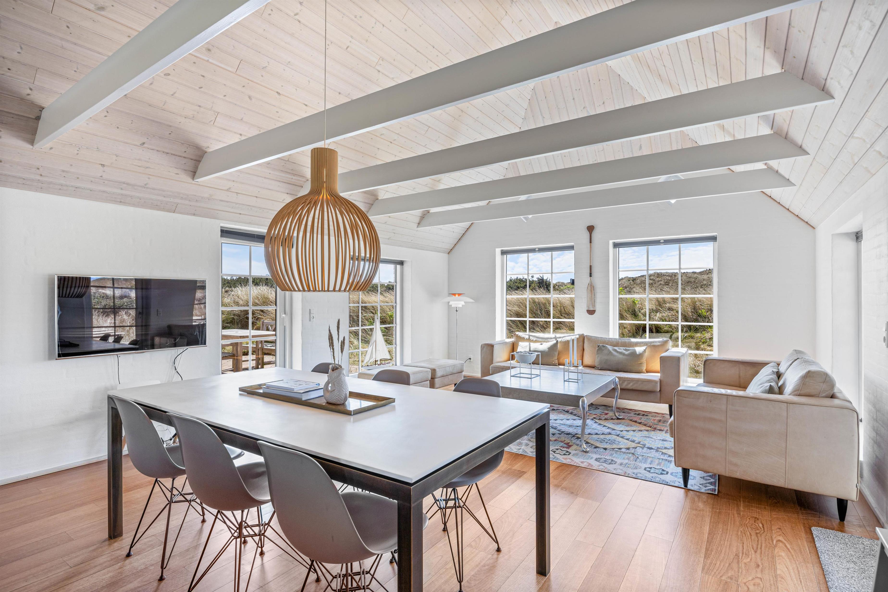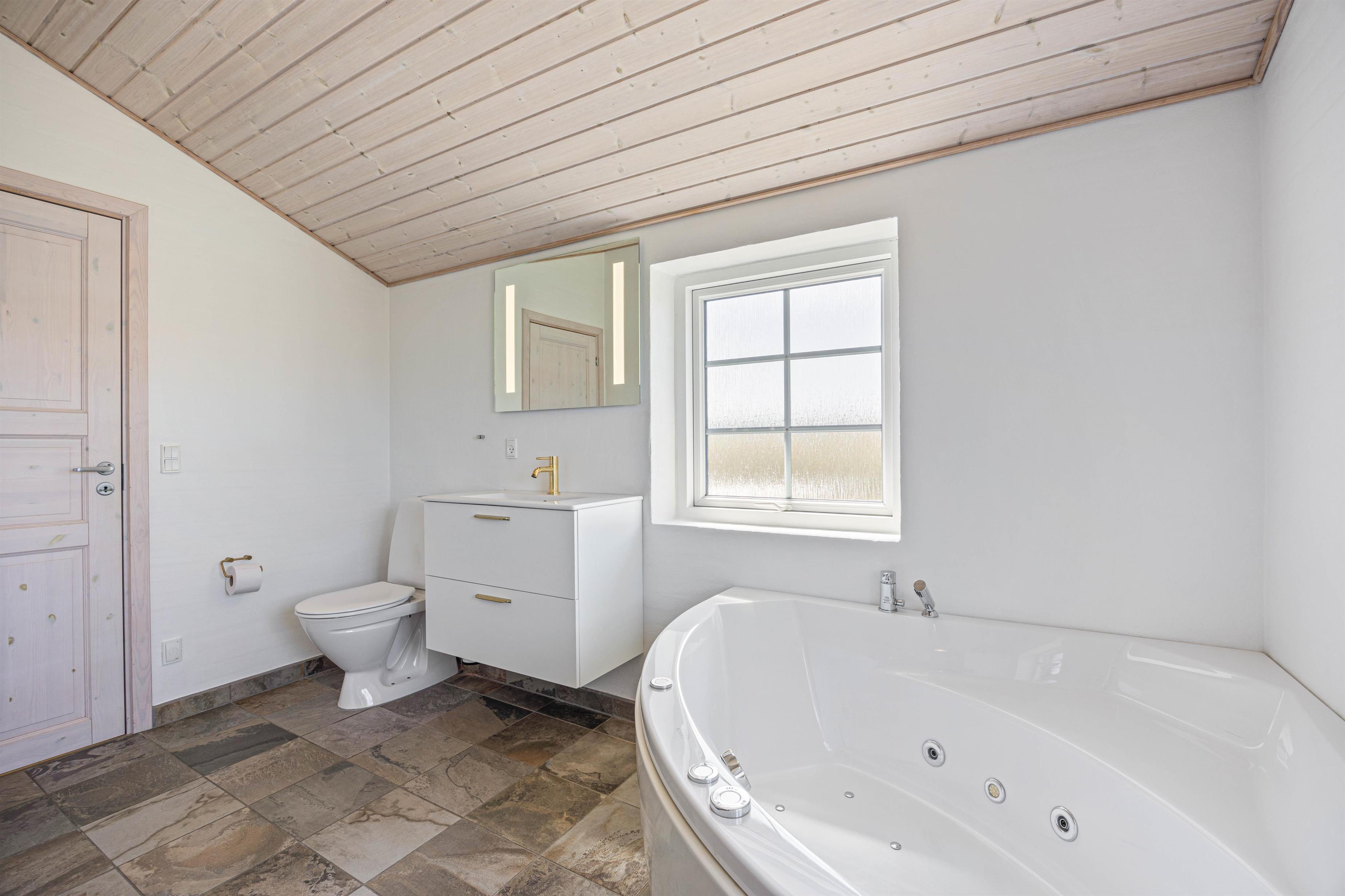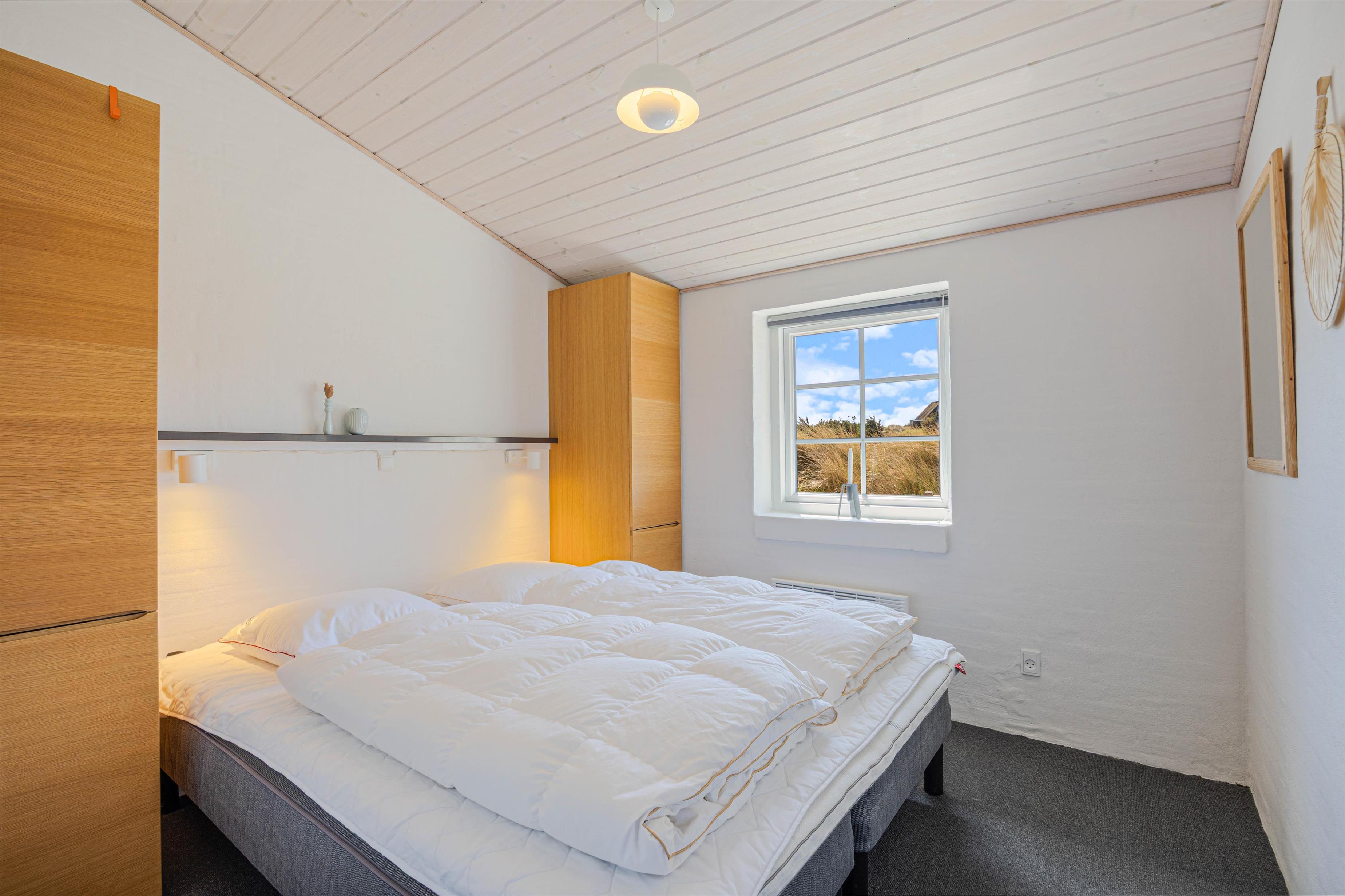 Efter en lang dag i naturen, kan du nyde den skønne indretning i dit luksussommerhus. Her er plads til 6 personer i 3 gode soveværelser. Her er 2 værelser med dobbeltsenge og skabsplads, samt 1 værelse med 2 enkeltsenge og skabe. Alle soveværelser har desuden gulvtæpper. 2 lækre badeværelser med gulvvarme og bruser, det største af badeværelserne har et herligt boblebad og en pæn stor sauna. Køkkenet er meget veludstyret og her er naturligvis opvaskemaskine og et køle- fryseskab. Den indmurede brændeovn sørger for hygge og varme i det flotte opholdsrum. Her er lyst og rummeligt, åbnet til kip og masser af lysindfald og smuk udsigt gennem de store vinduespartier. Du kan slappe af i sofaen efter en lang dag, se en film eller høre radio på fladskærms-TV'et eller opretholde forbindelse til vennerne via den gratis trådløse internetforbindelse.