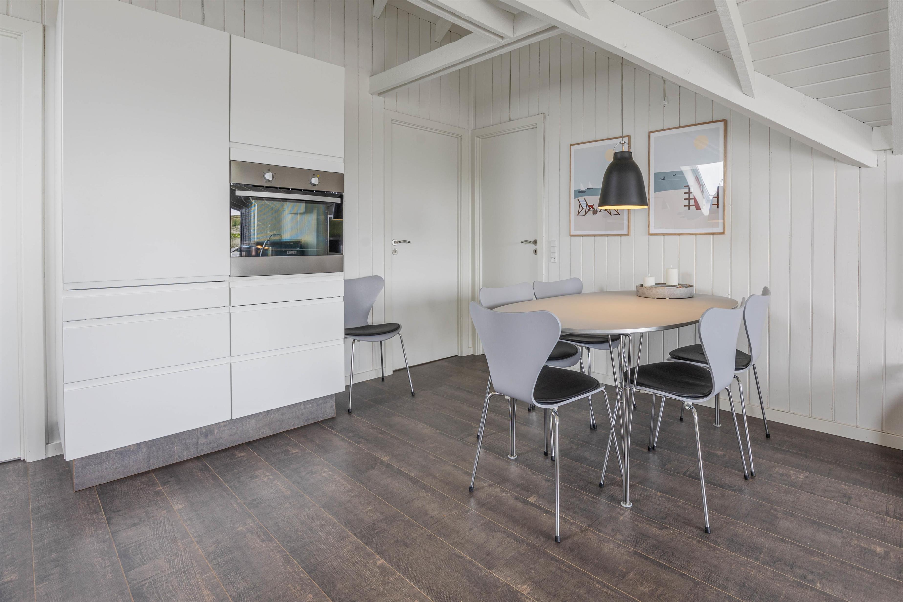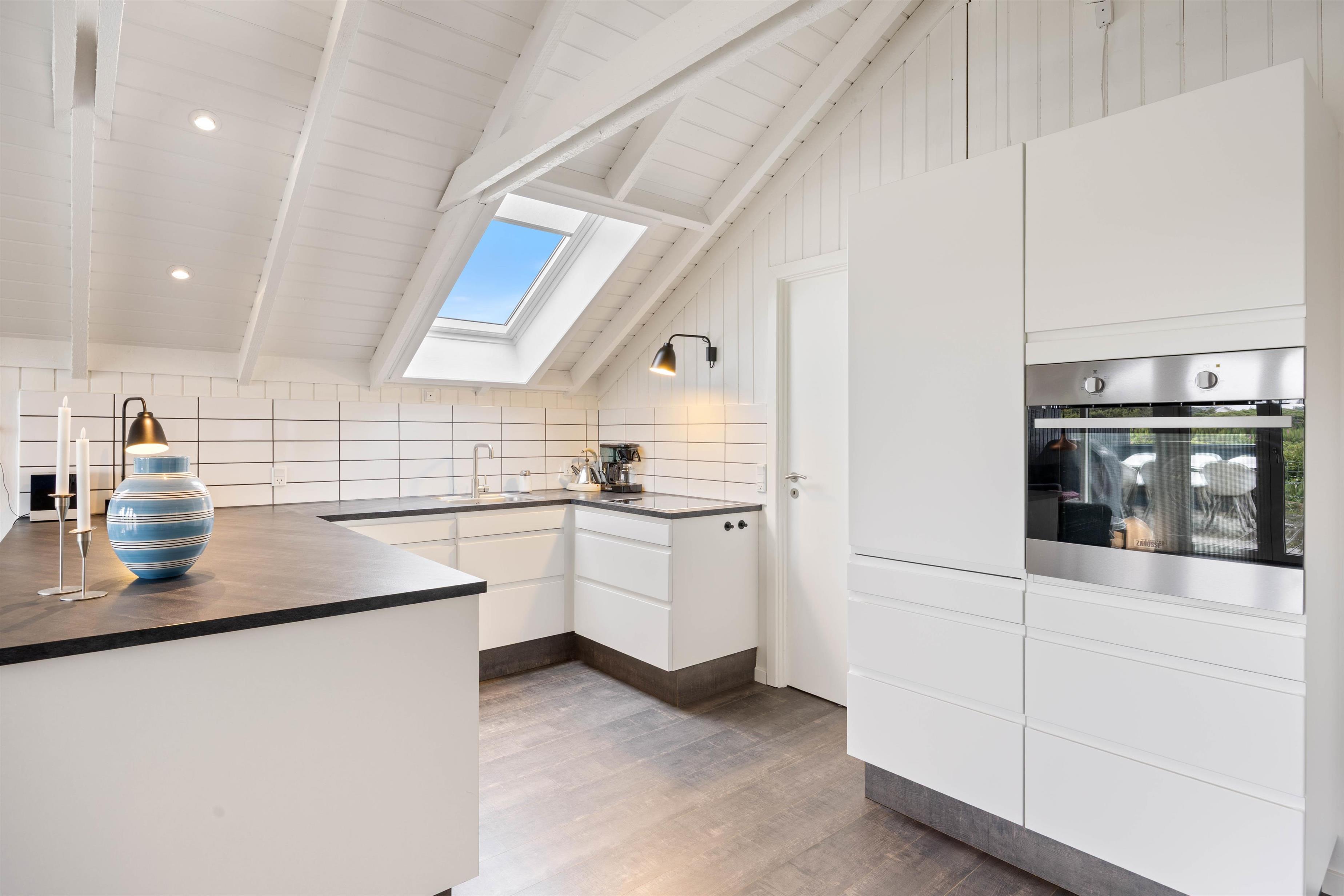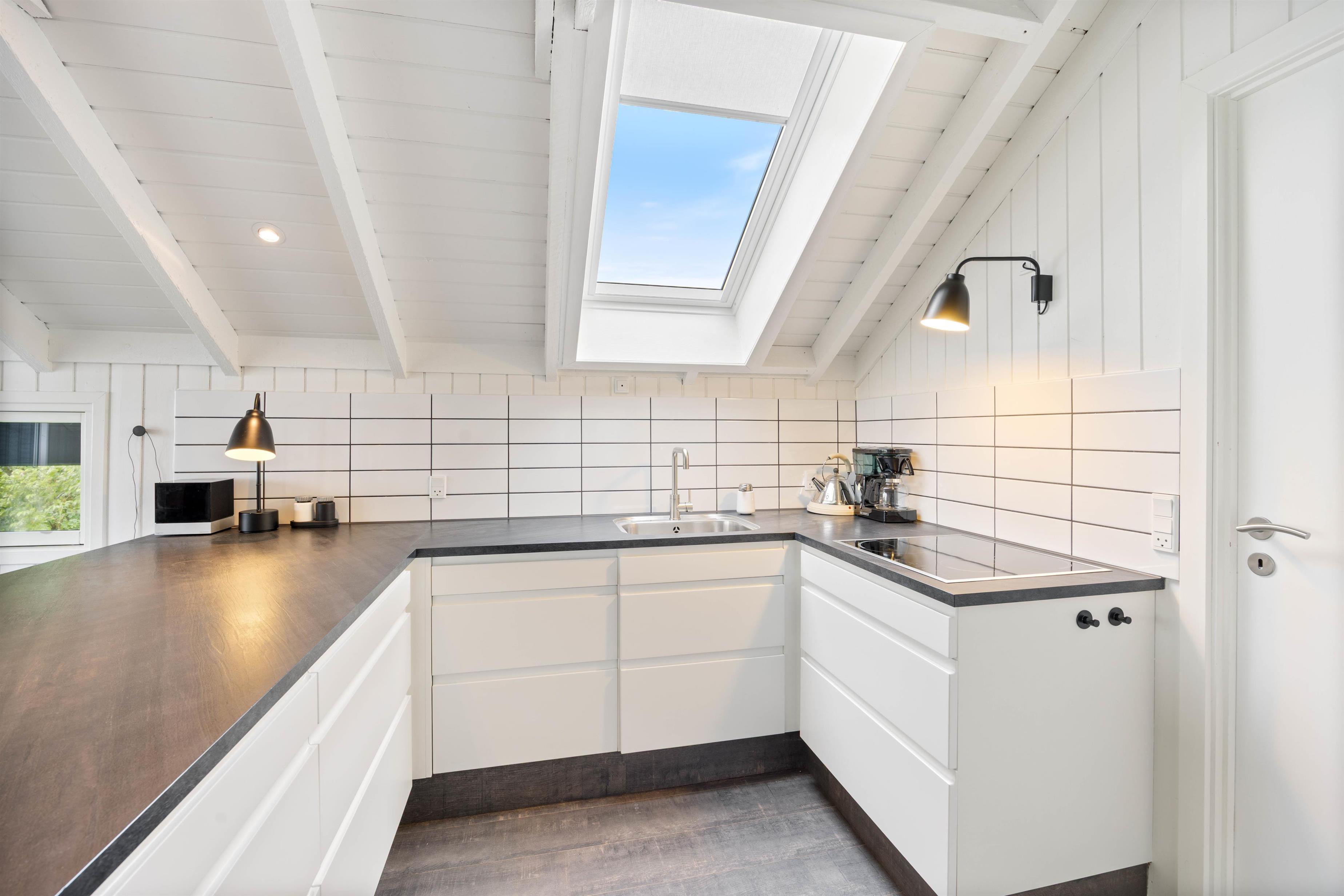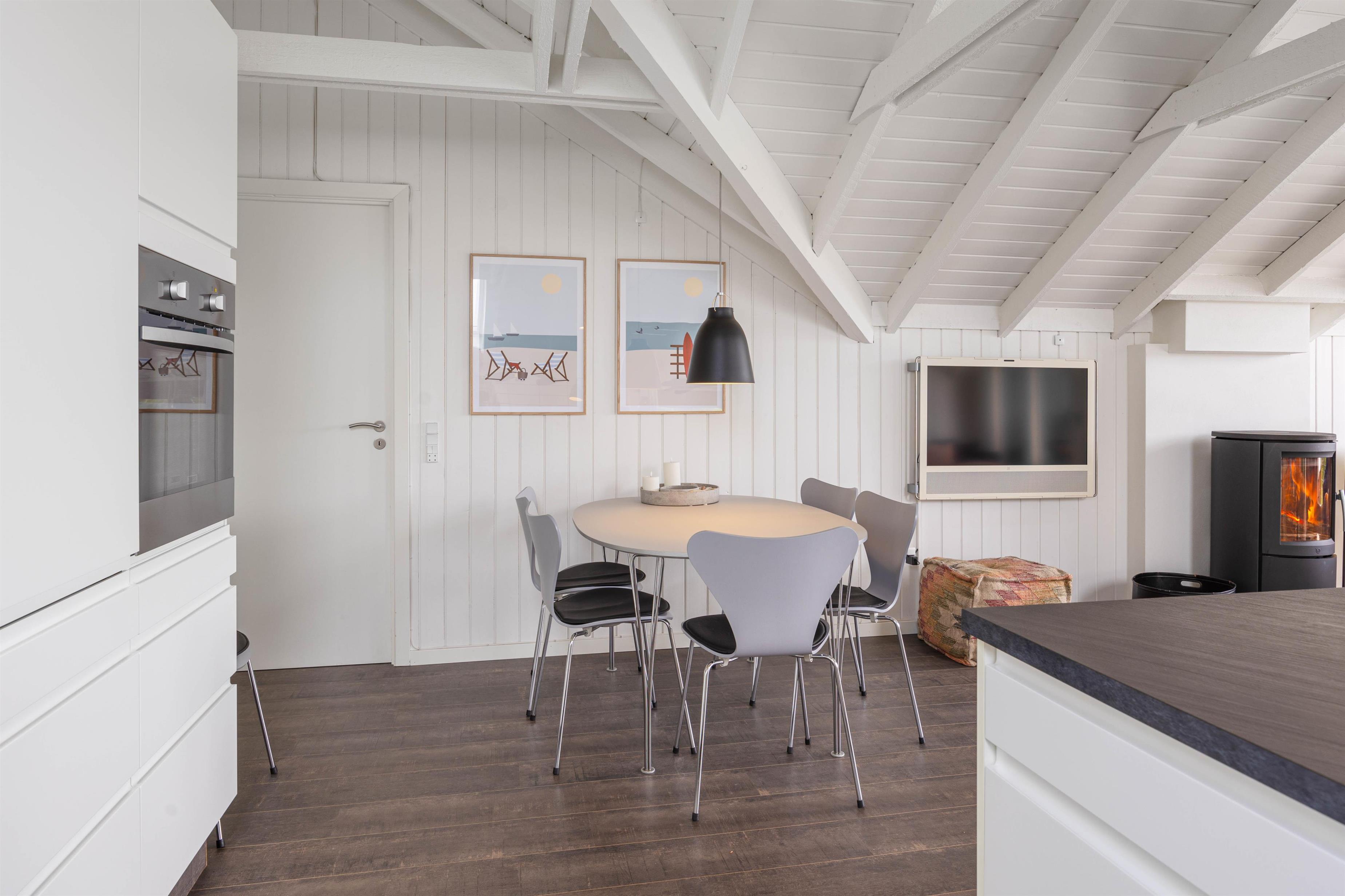 I sommerhusets hjerte, køkken/alrummet, finder I den åbne stue med brændeovn, som spreder varme og skaber en dejlig atmosfære på kølige aftener. Sammen med varmepumpen sikrer det en behagelig temperatur indenfor året rundt. Køkkenet er veludstyret med alt, hvad I behøver – inklusive opvaskemaskine, så I slipper for opvasken i ferien.
