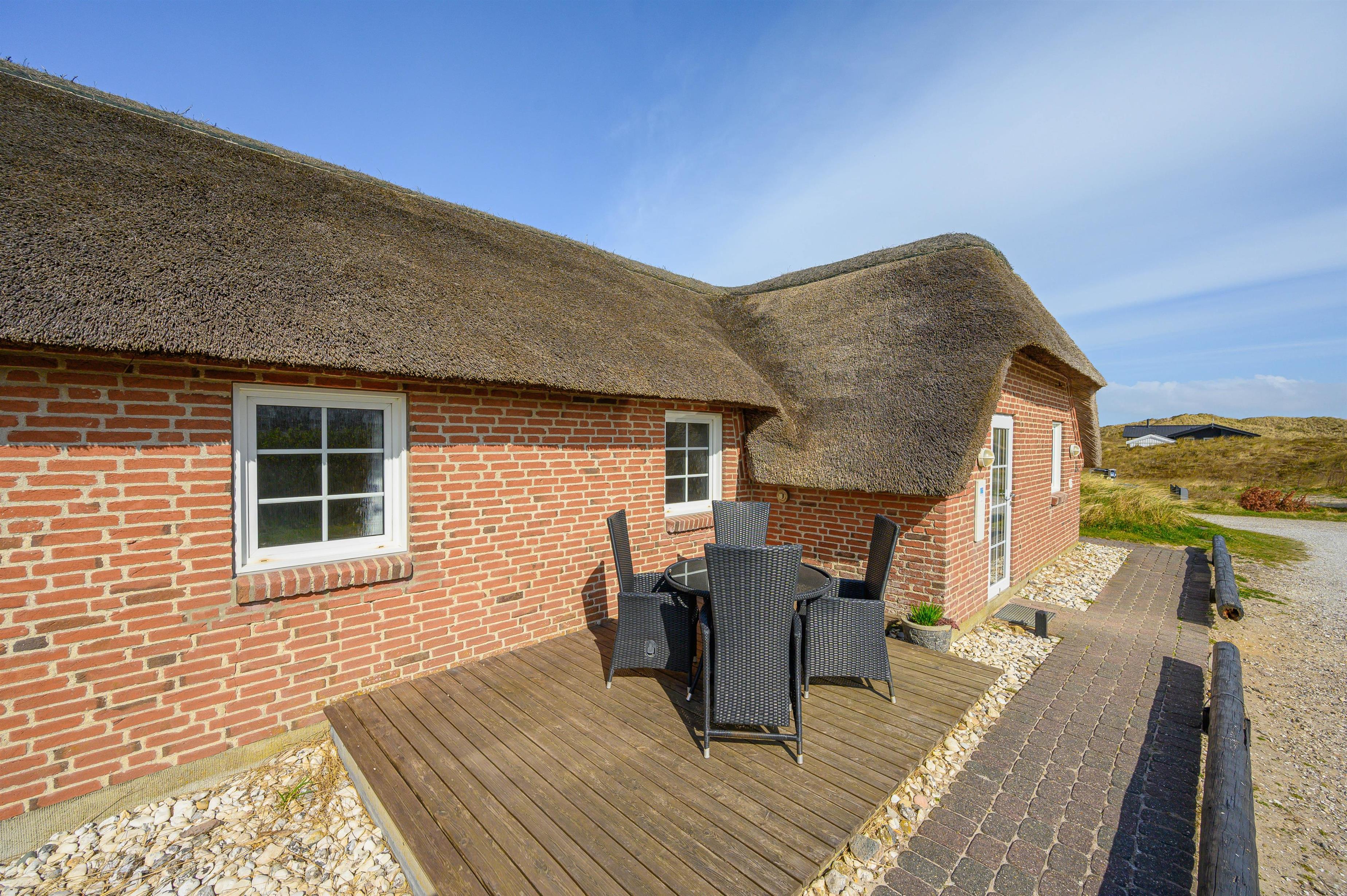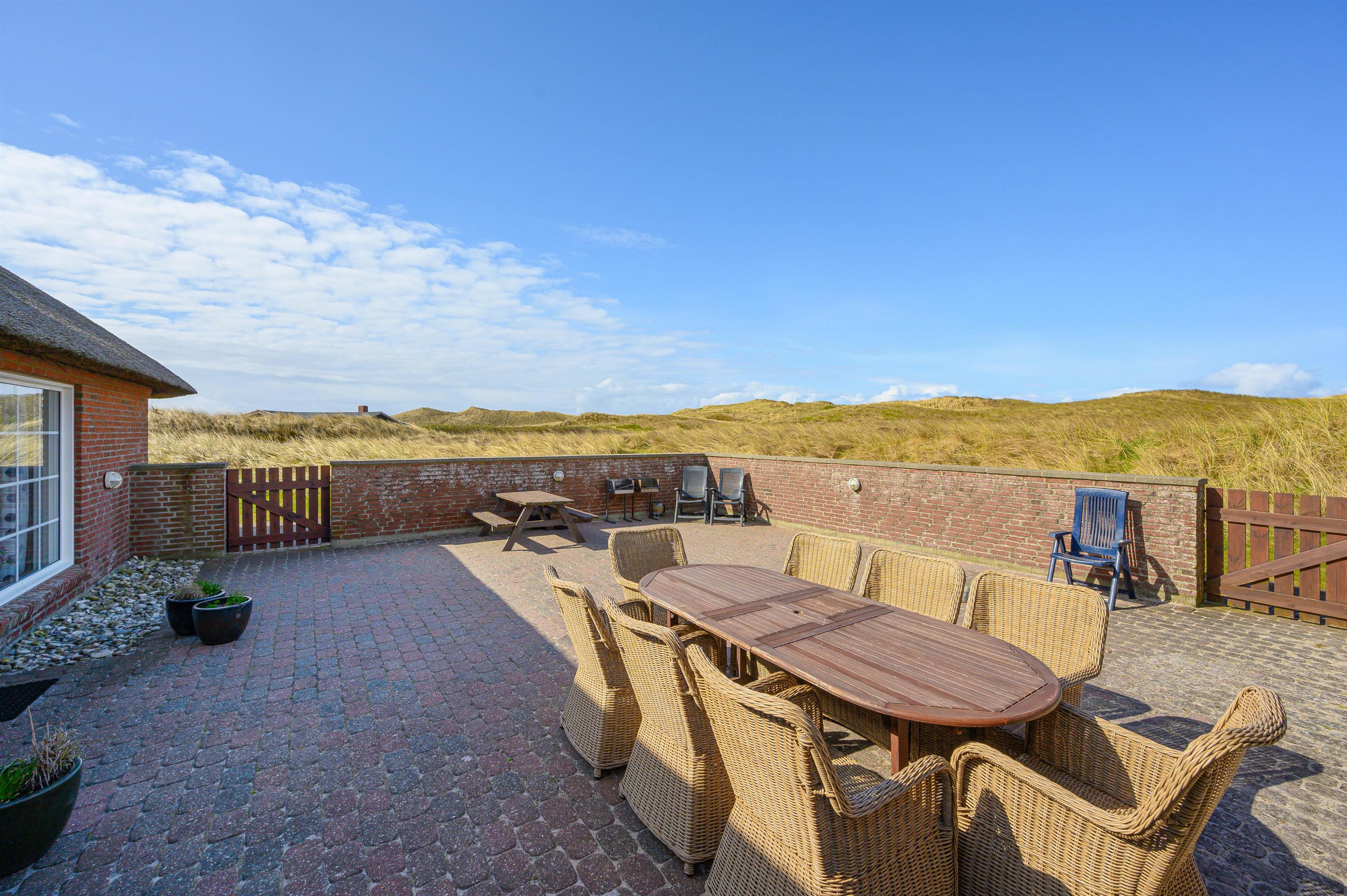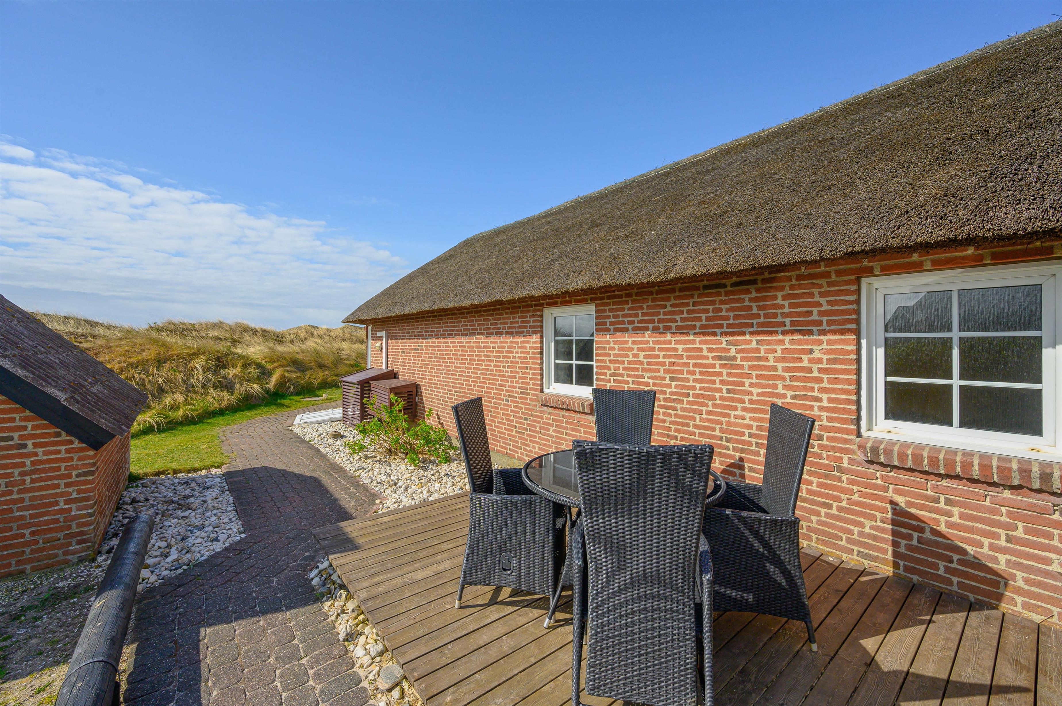 Der er mange grunde til at holde ferie i netop dette feriehus. Det ligger uforstyrret i 1. klitrække, så du har de smukke klitter og Vesterhavet lige ved siden af. Sydvest for feriehuset er der en stor lukket terrasse, hvor du kan sidde og nyde de gode solskinsdage og grillhygge med familien.