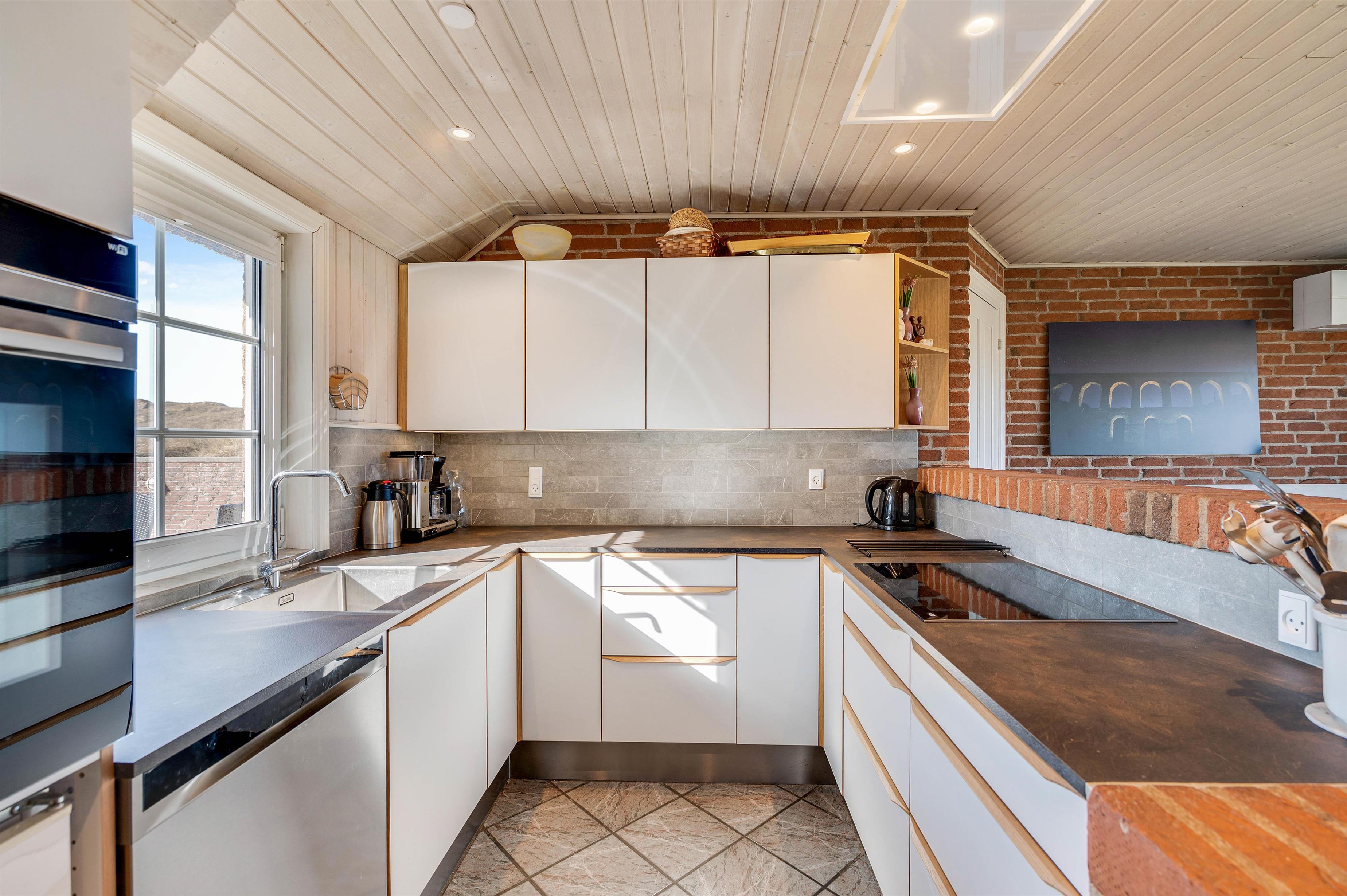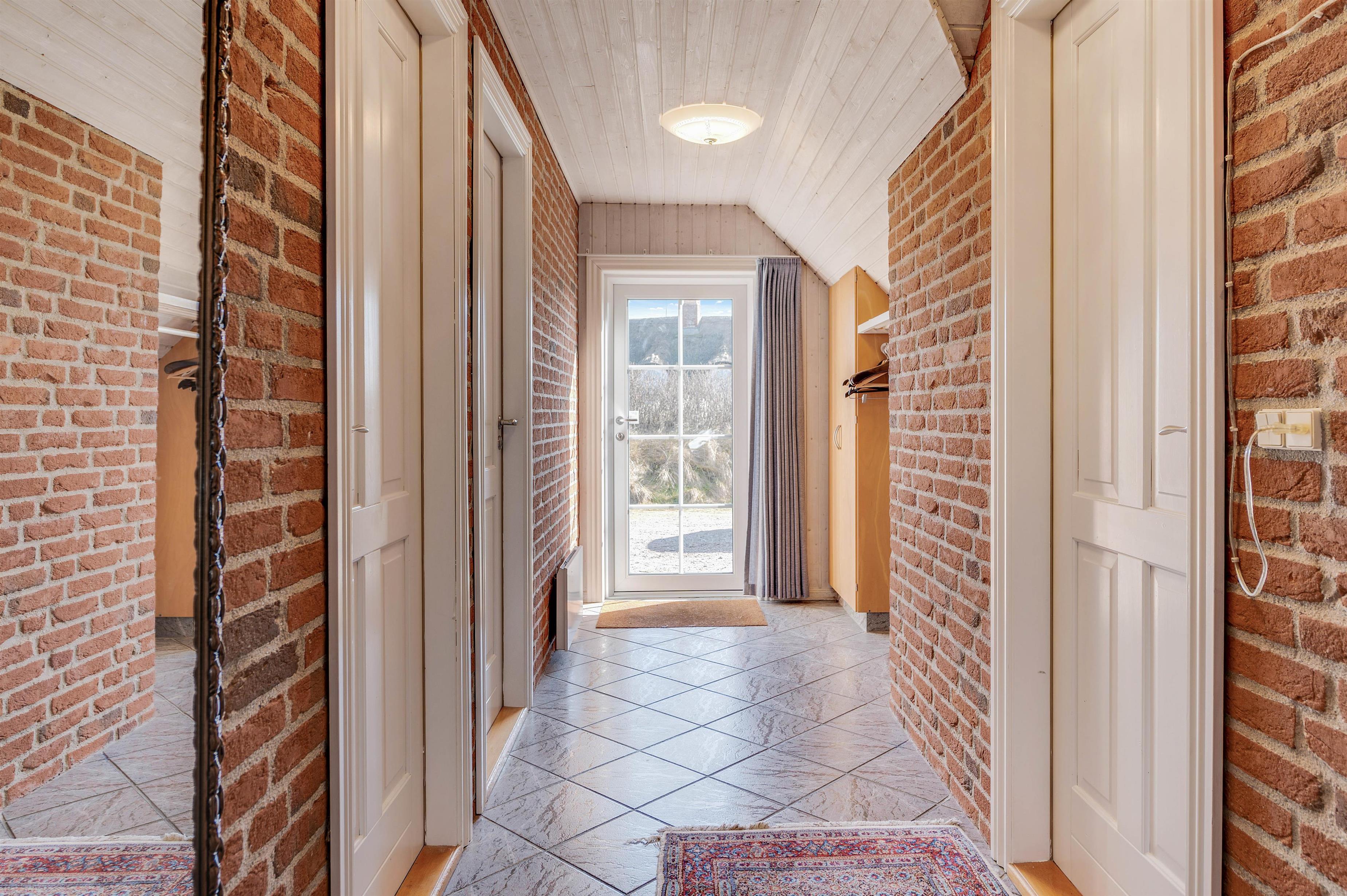 Feriehuset ligger for enden af en lille sidevej, helt ude ved klitterne. Så her kan du holde en afslappende ferie uden større forstyrrelser, og det er sikkert noget, du især vil nyde, når du opholder dig på den store terrasse. Og da terrassen er lukket, skal du ikke tænke på, om småbørn og hund tager på udflugt alene. I stedet kan du læse en god bog eller tænde op i grillen og forkæle smagsløgene med en saftig bøf og et godt glas rødvin. Med husets gode opbevaring, i form af et depotrum med fryser og køl, er der nemlig rig plads til råvarer, som blandt andet kan smides på husets grill.