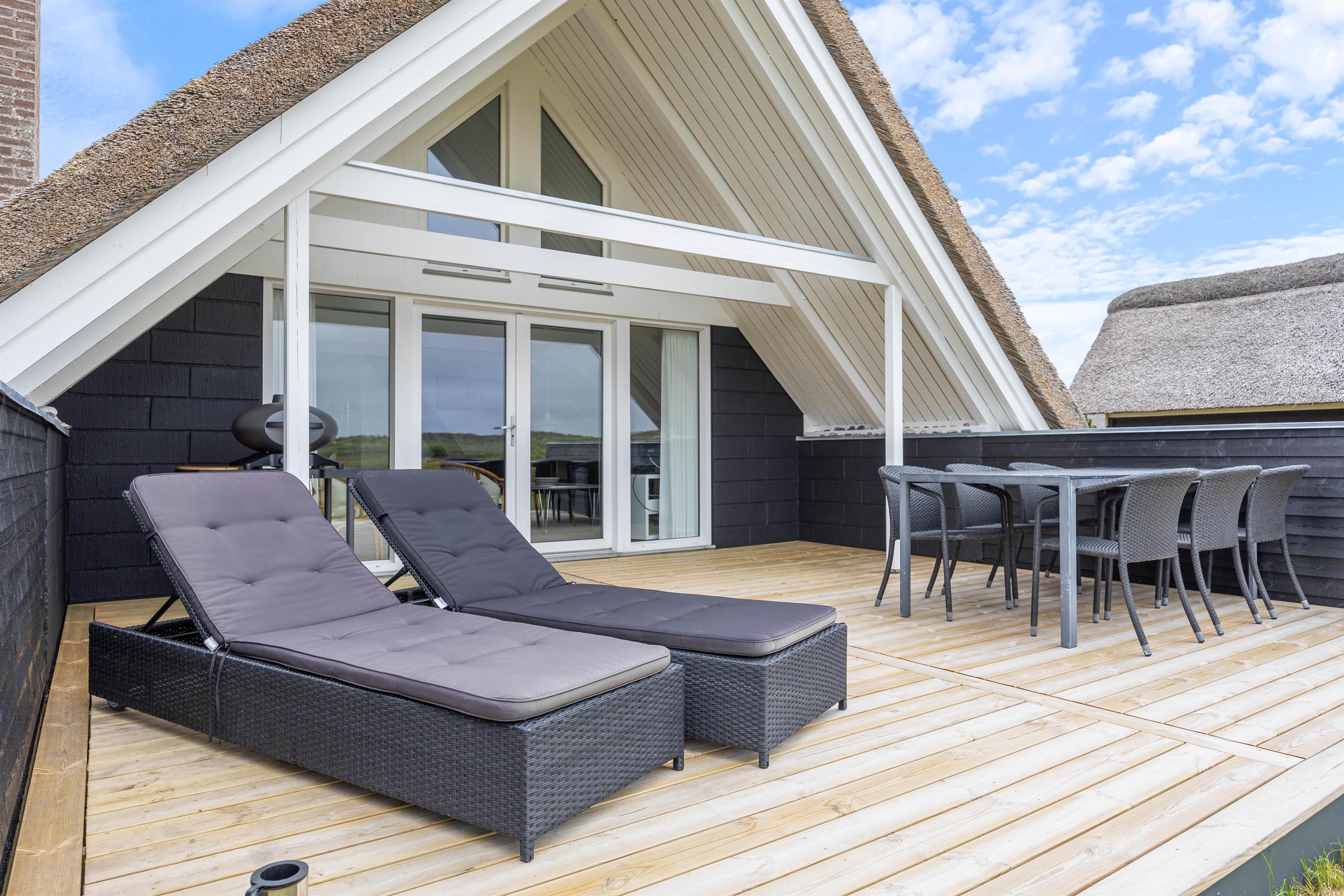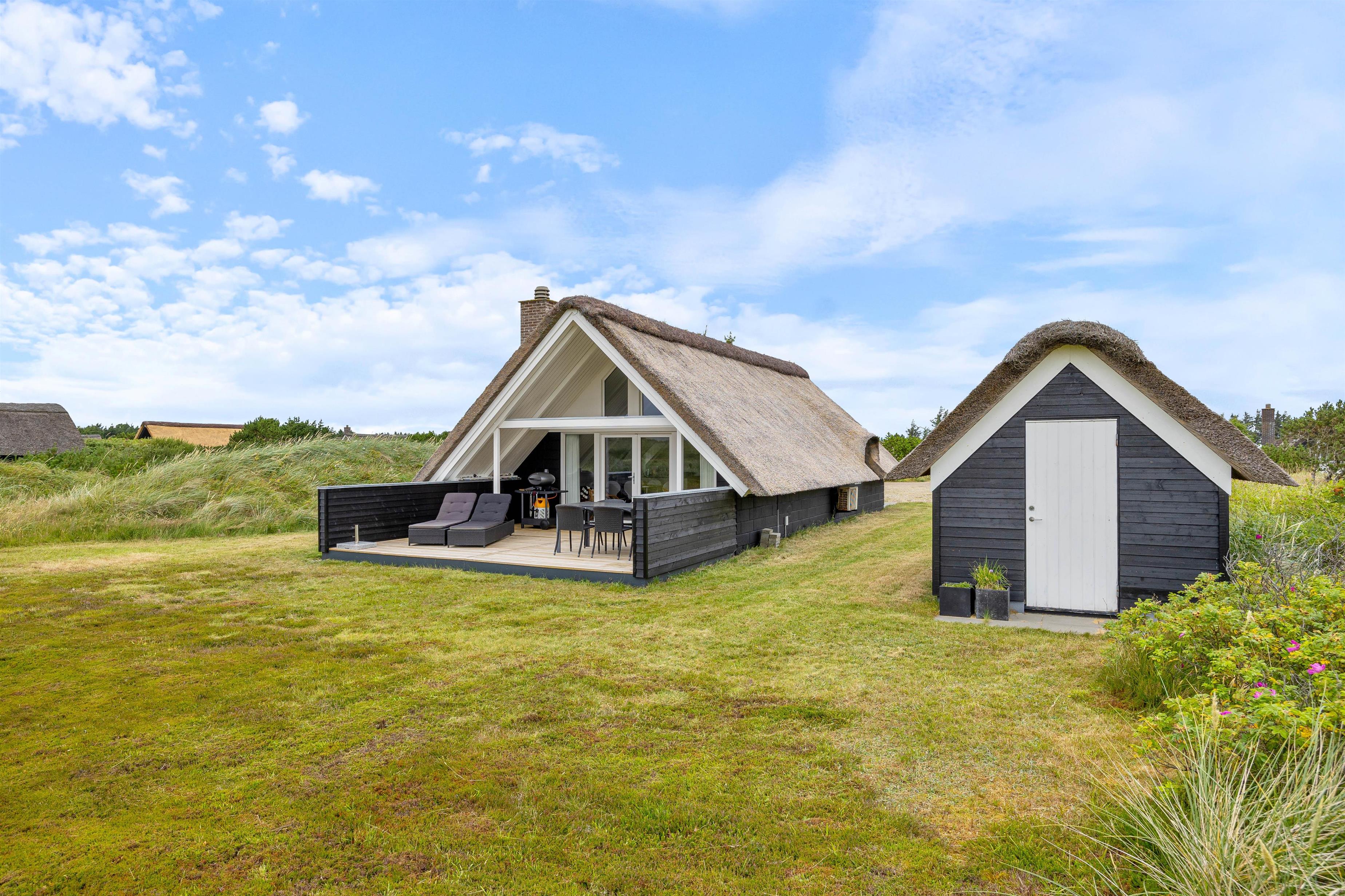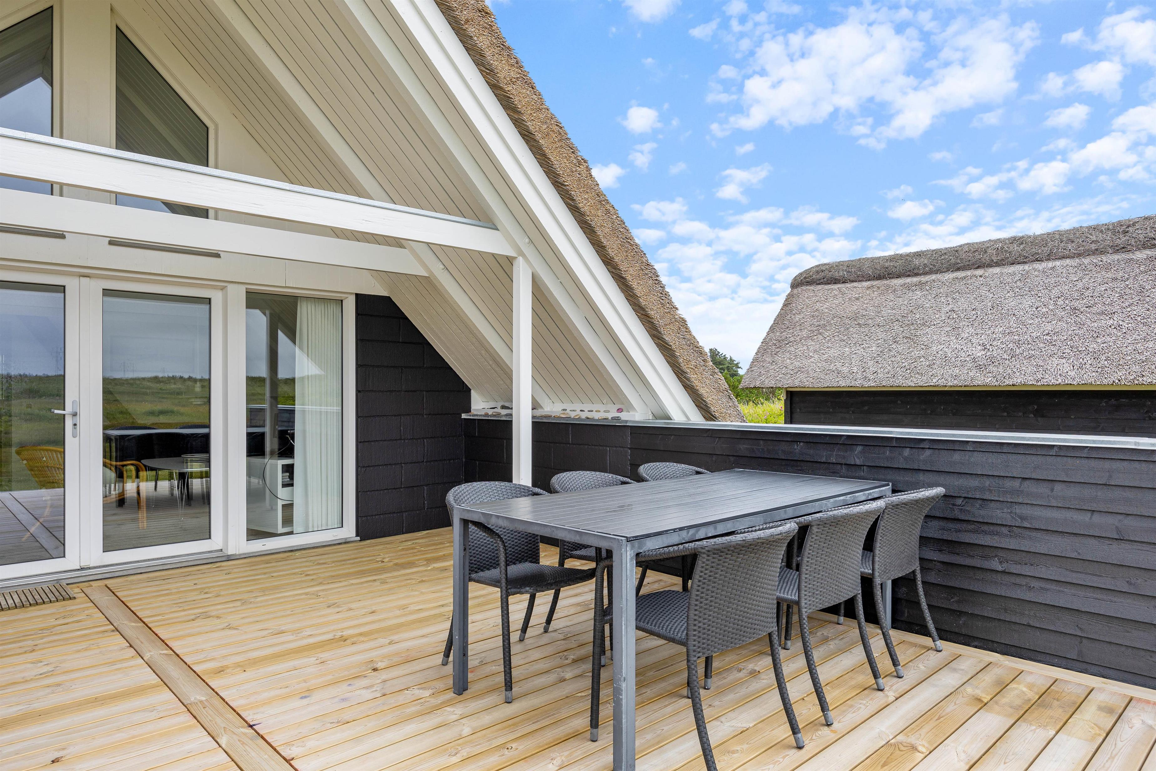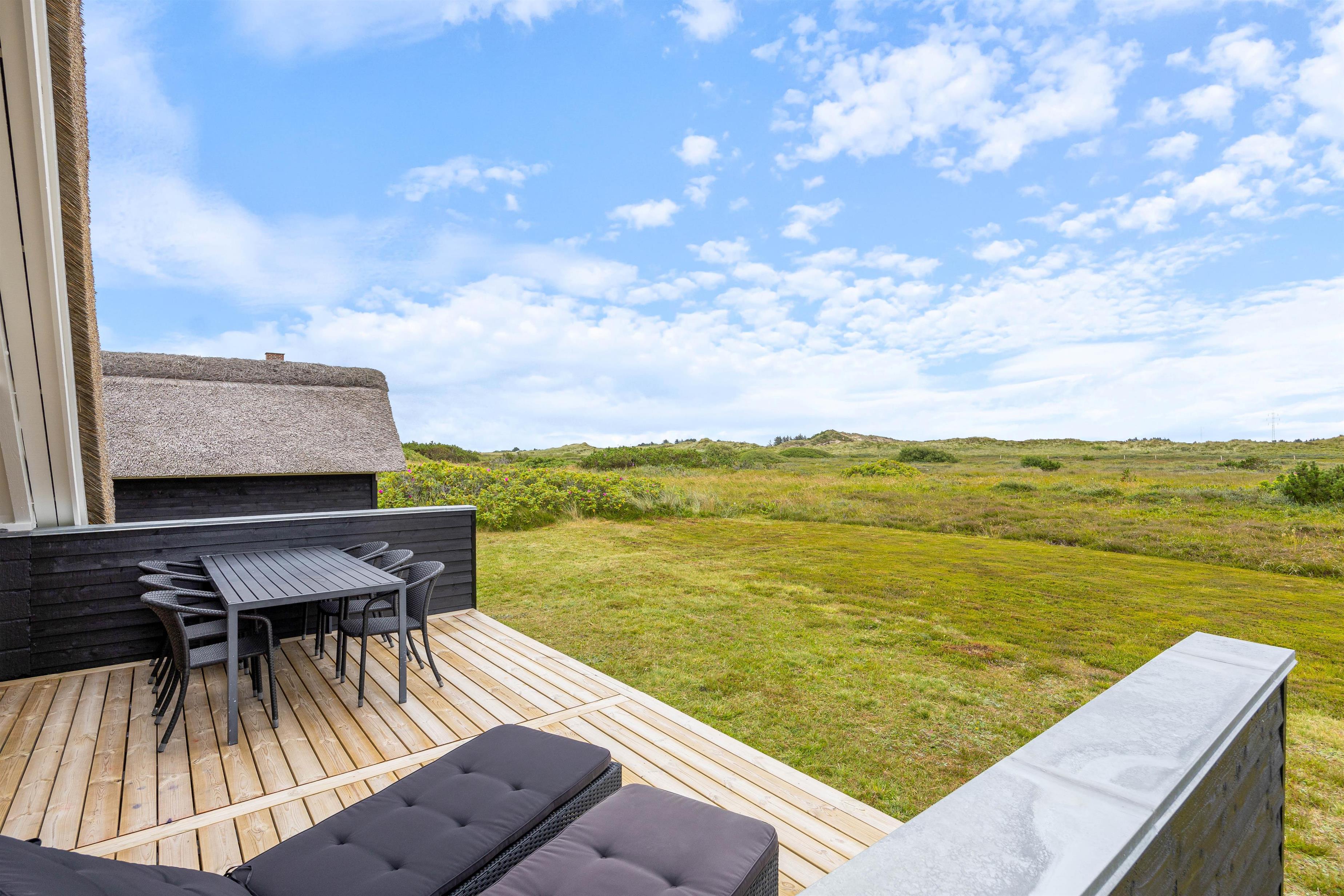 Fra stuen kommer I ud på feriehusets sydvendte terrasse. Her er der altid ly, læ og skygge at finde, eftersom en del af terrassen er både afskærmet og overdækket. Foretrækker I fuld solskin, kan I læne jer tilbage i liggestolene på den åbne del af terrassen. Der er også et bord- og bænkesæt på grunden, hvor I kan holde en hyggelig picnic i solen. Fra terrassen har I en smuk udsigt til det uspolerede hedelandskab mod syd.
