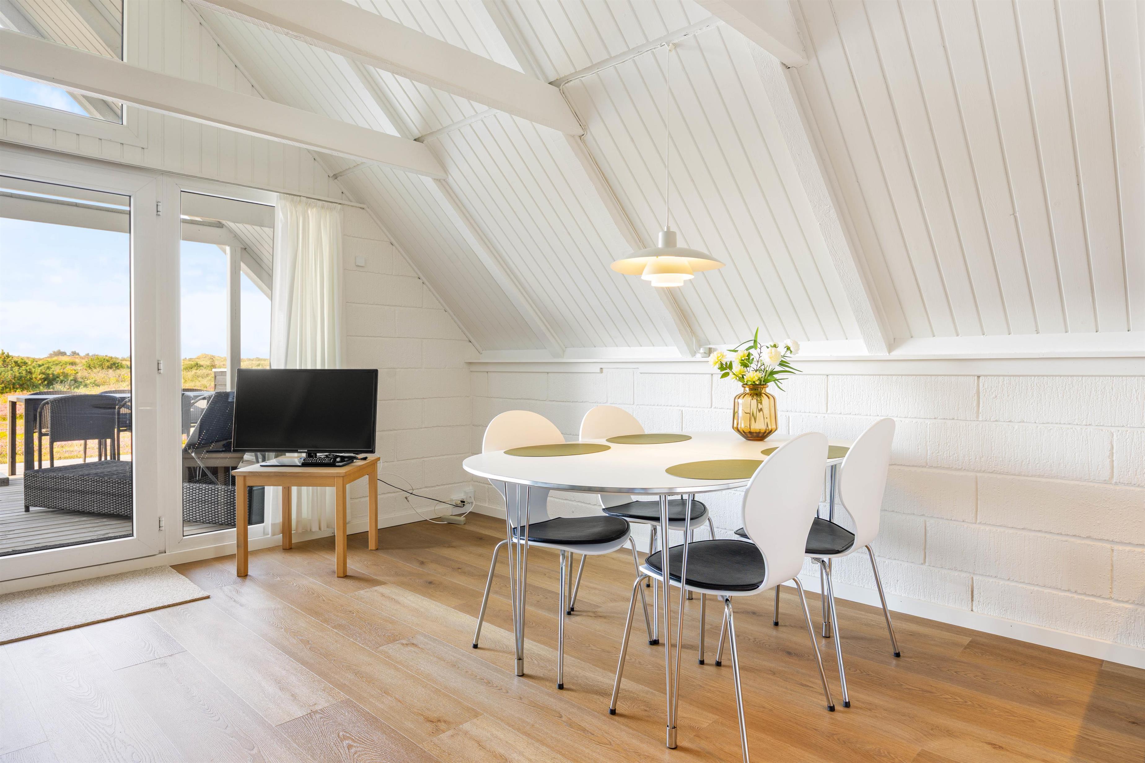 De 4 sovepladser fordeler sig på 2 soveværelser med skabsplads, så I hurtigt kan få pakket kufferterne ud. Der er også en ekstra hems med en skøn udsigt til Nr. Lyngvig Fyr, som måske kan blive til en hyggelig hule til børnene?