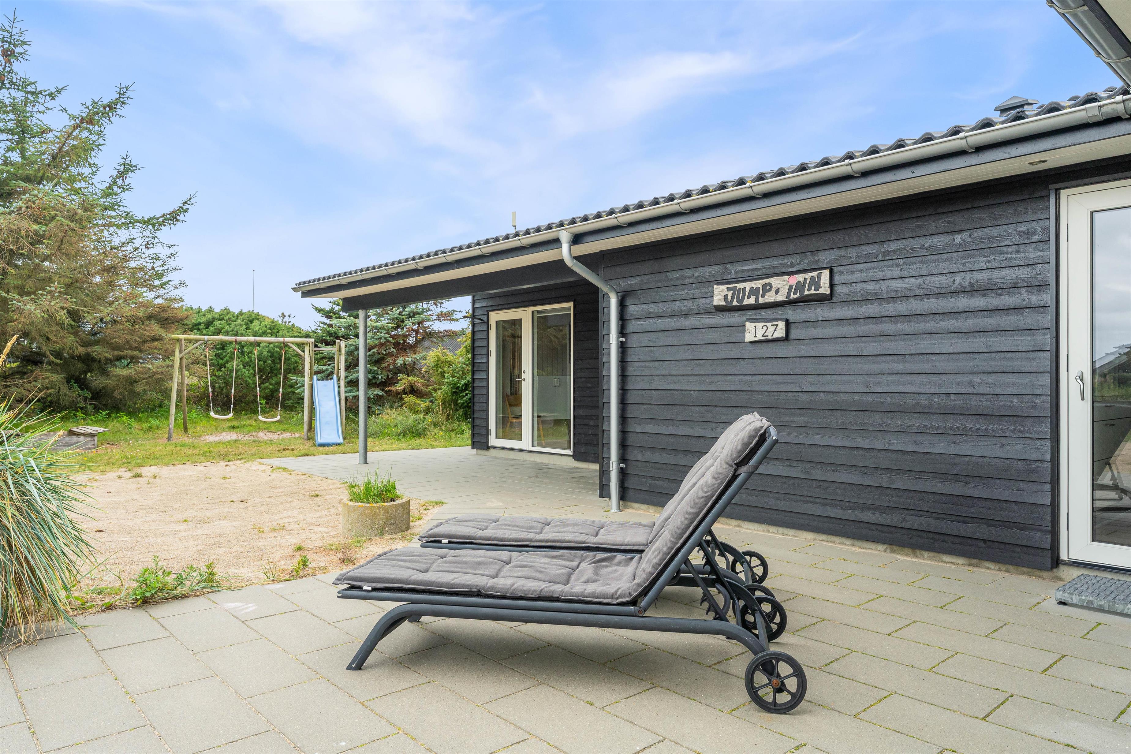 Udenfor finder I en god terrasse med flere mulige siddekroge og en overdækket del. Der er sørget for både havemøbler, liggestole og grill til de varme sommerdage, og til de yngste feriegæster er der lavet en sandkasse og et gyngestativ.