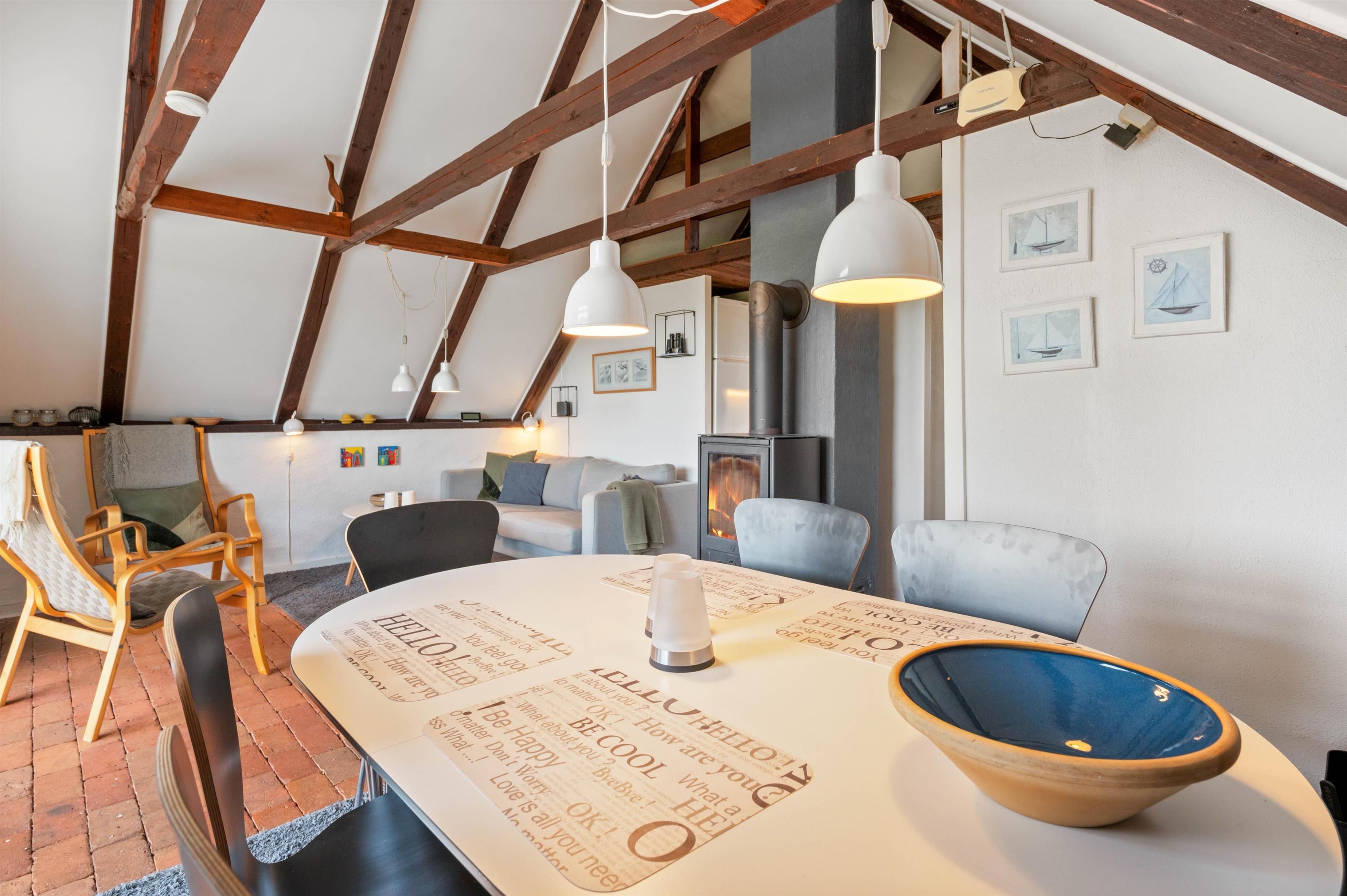Feriehuset hjerte er opholds- og spiseområdet det er åbent og let tilgængeligt fra køkkenområdet. Her er et råt stengulv og komfortable møbler i rolige nuancer. Her er plads til afslapning og hygge med familien. Her kan I spille brætspil eller slappe af med en god bog på sofaen, imens brændeovnen hyggeligt knitrer i baggrunden.