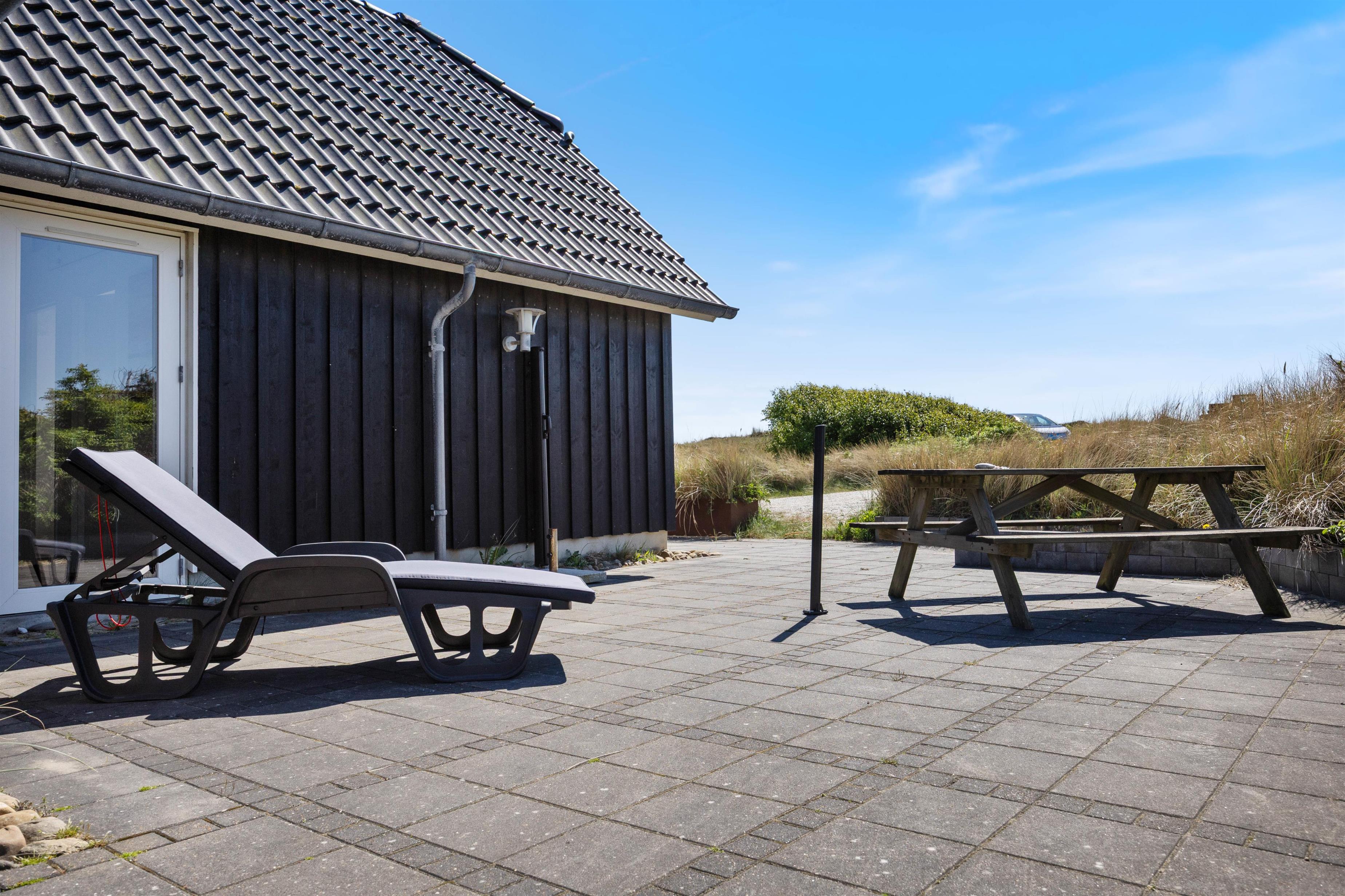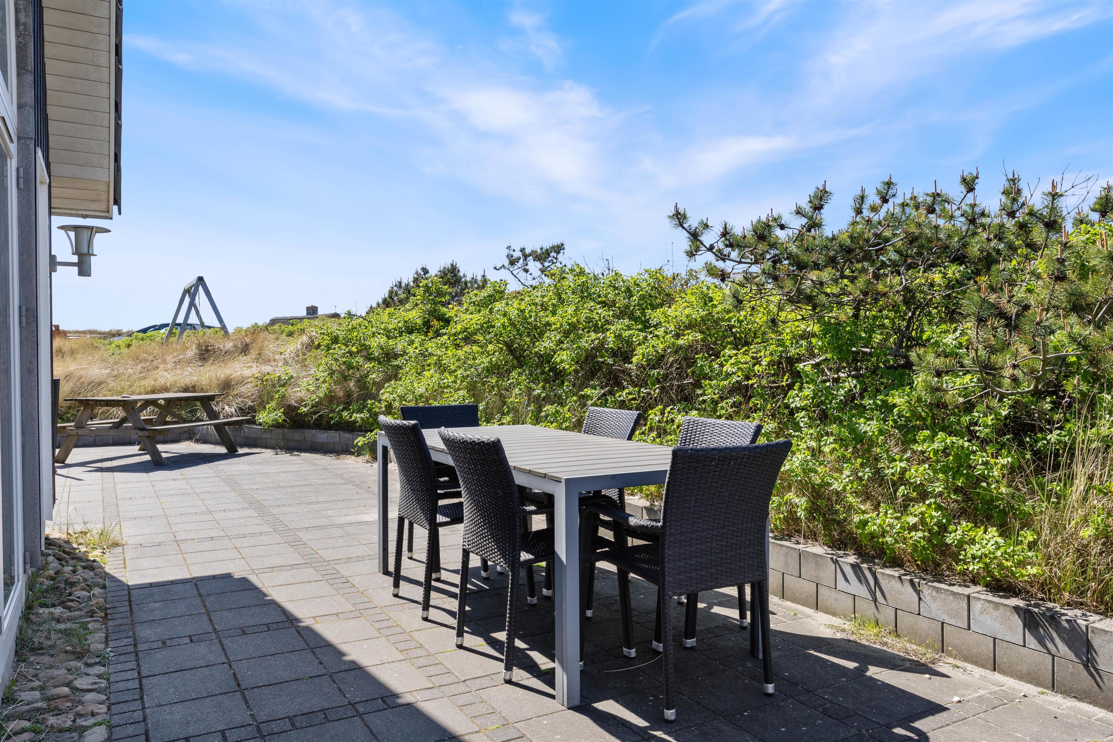 På den åbne terrasse står havemøblerne klar, så I kan nyde vejret og de dejlige, vestjyske omgivelser, og skal I ud og udforske området, er stranden det oplagte udflugtsmål.